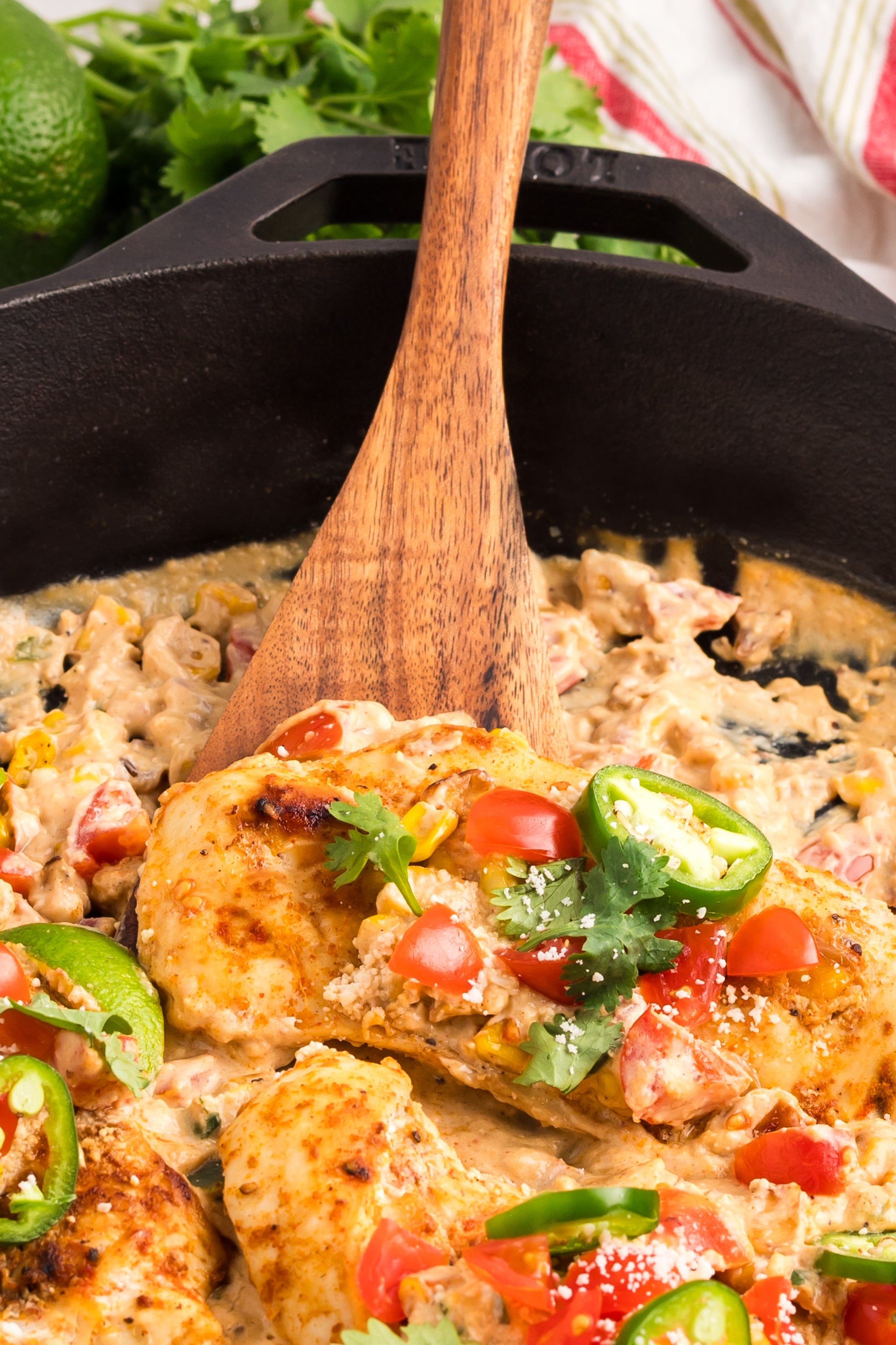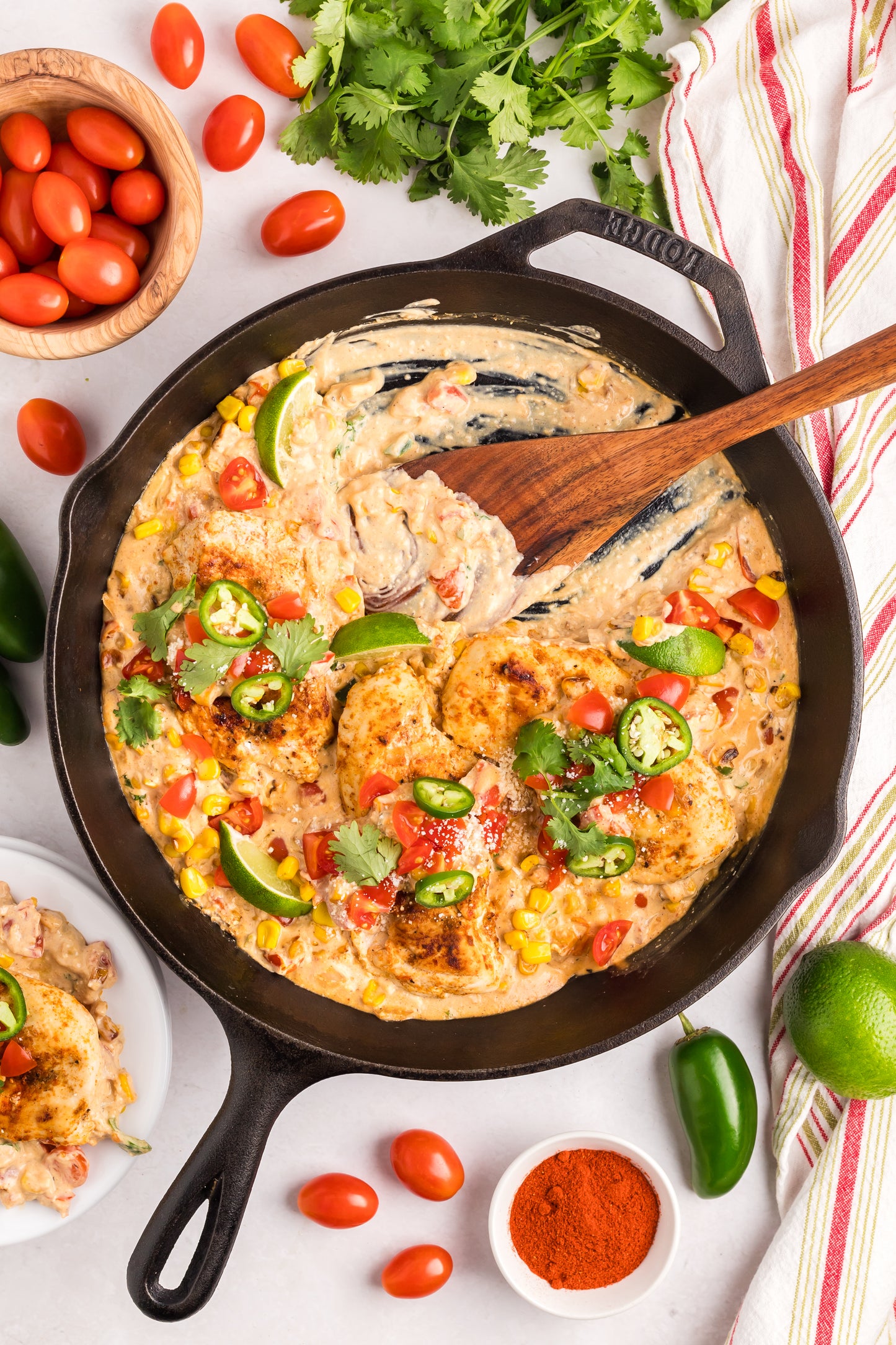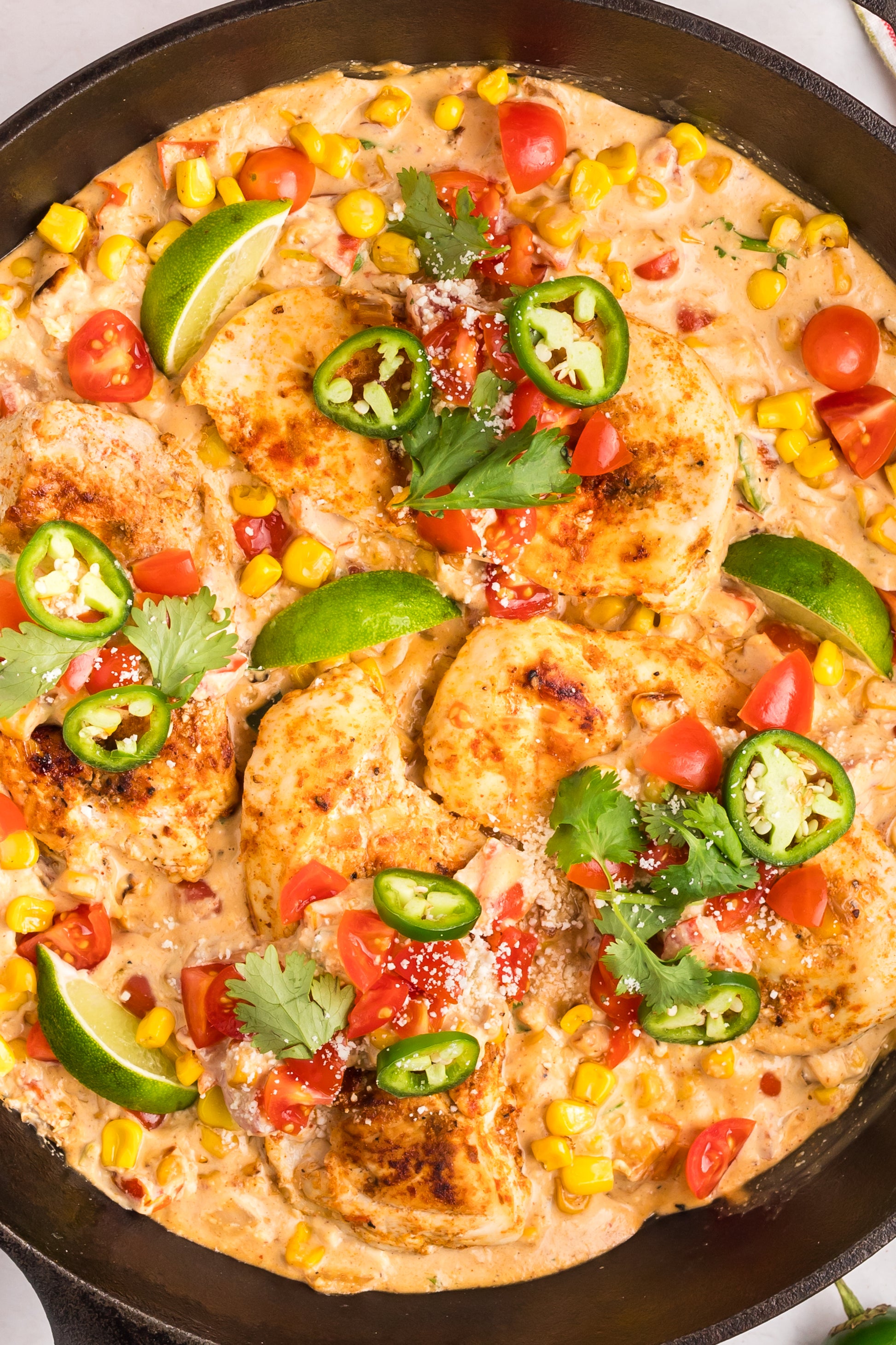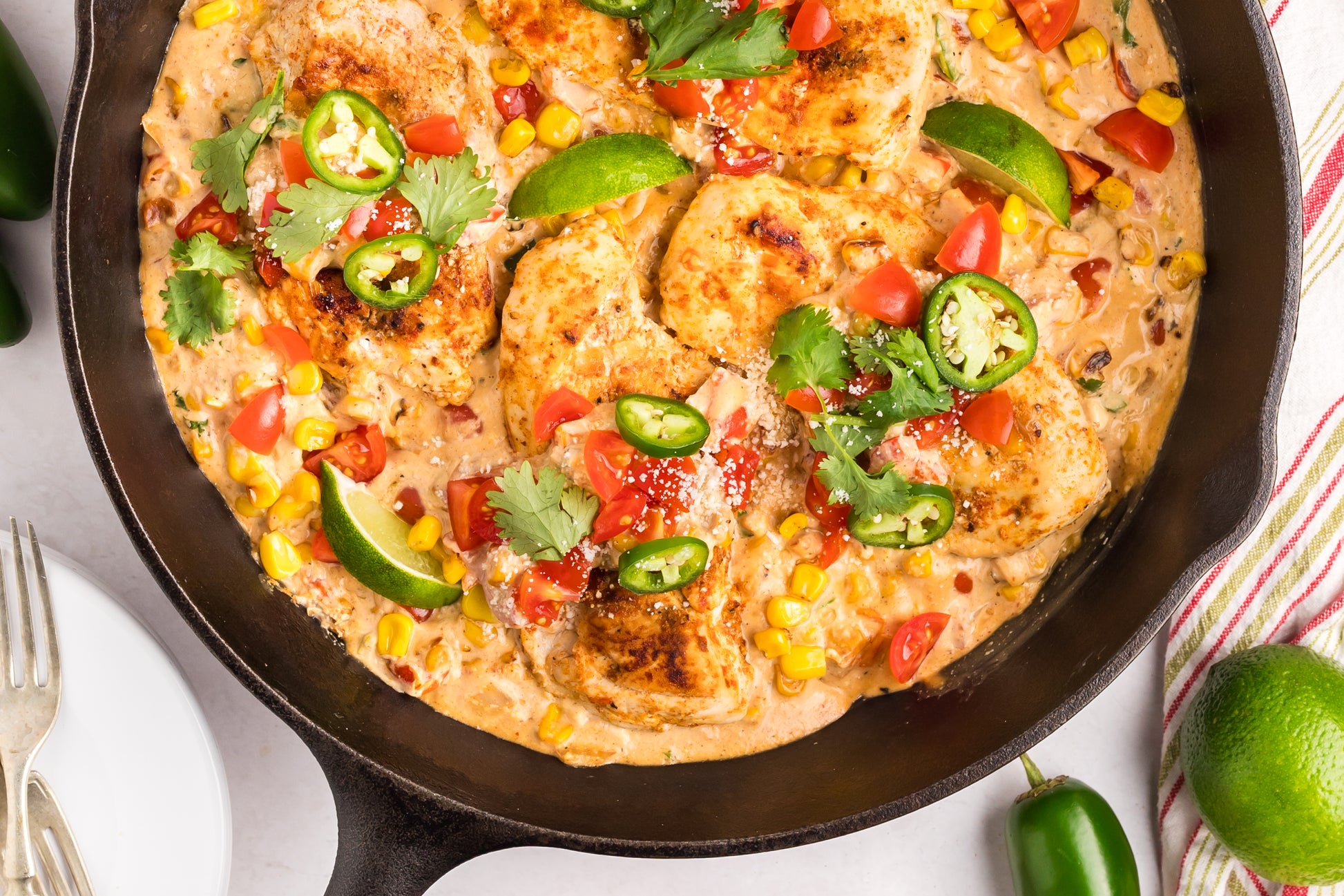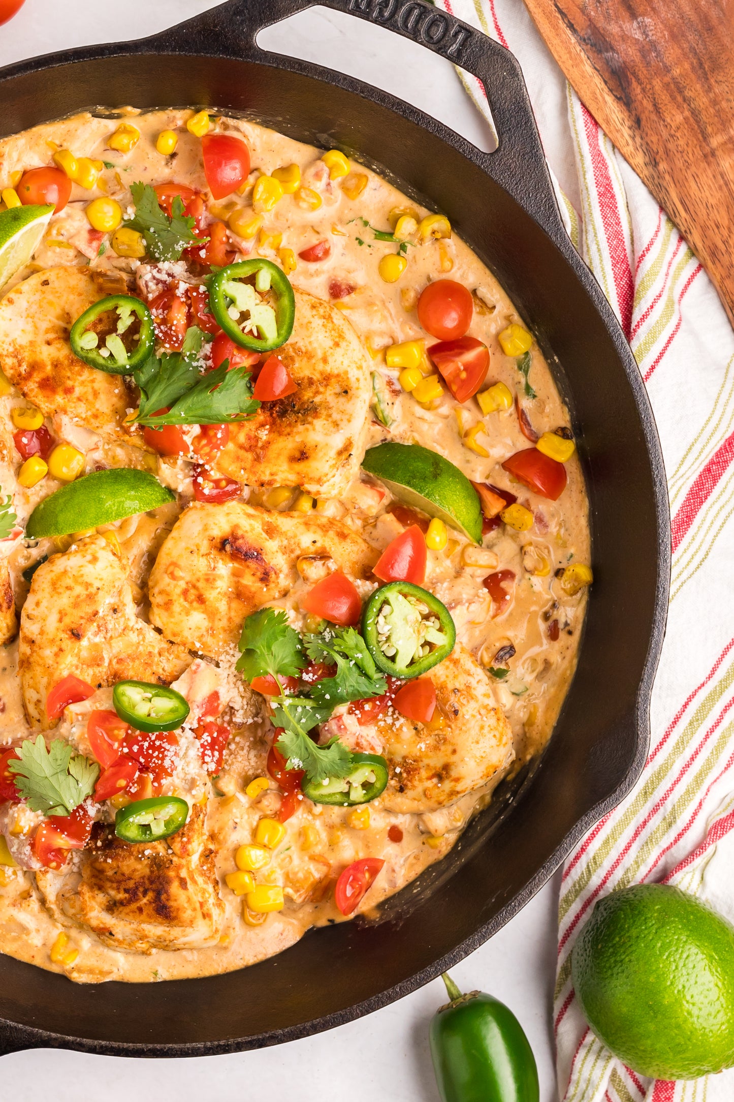 This street corn chicken skillet offers a vibrant burst of flavors with zesty lime juice, sweet roasted corn, fragrant minced garlic, fresh cilantro, and rich cotija cheese. The seasoned chicken absorbs all the delicious nuances of the creamy corn sauce, creating a dish that's both family-friendly and impressive enough to entertain guests.