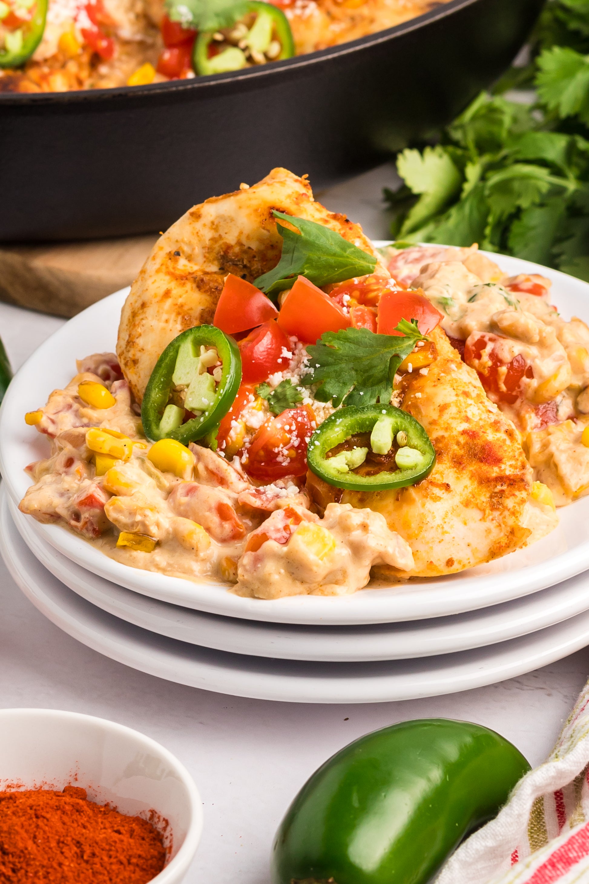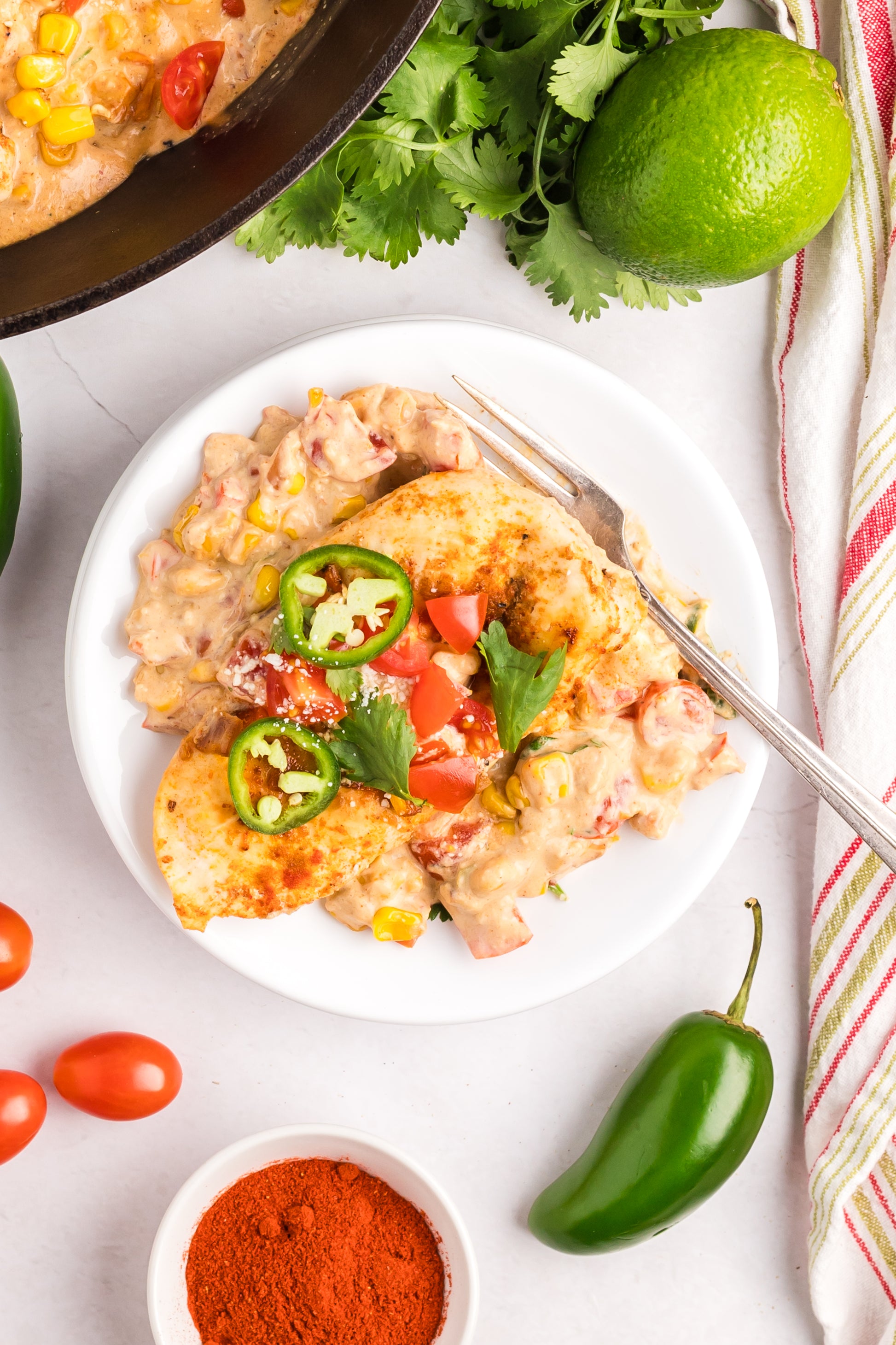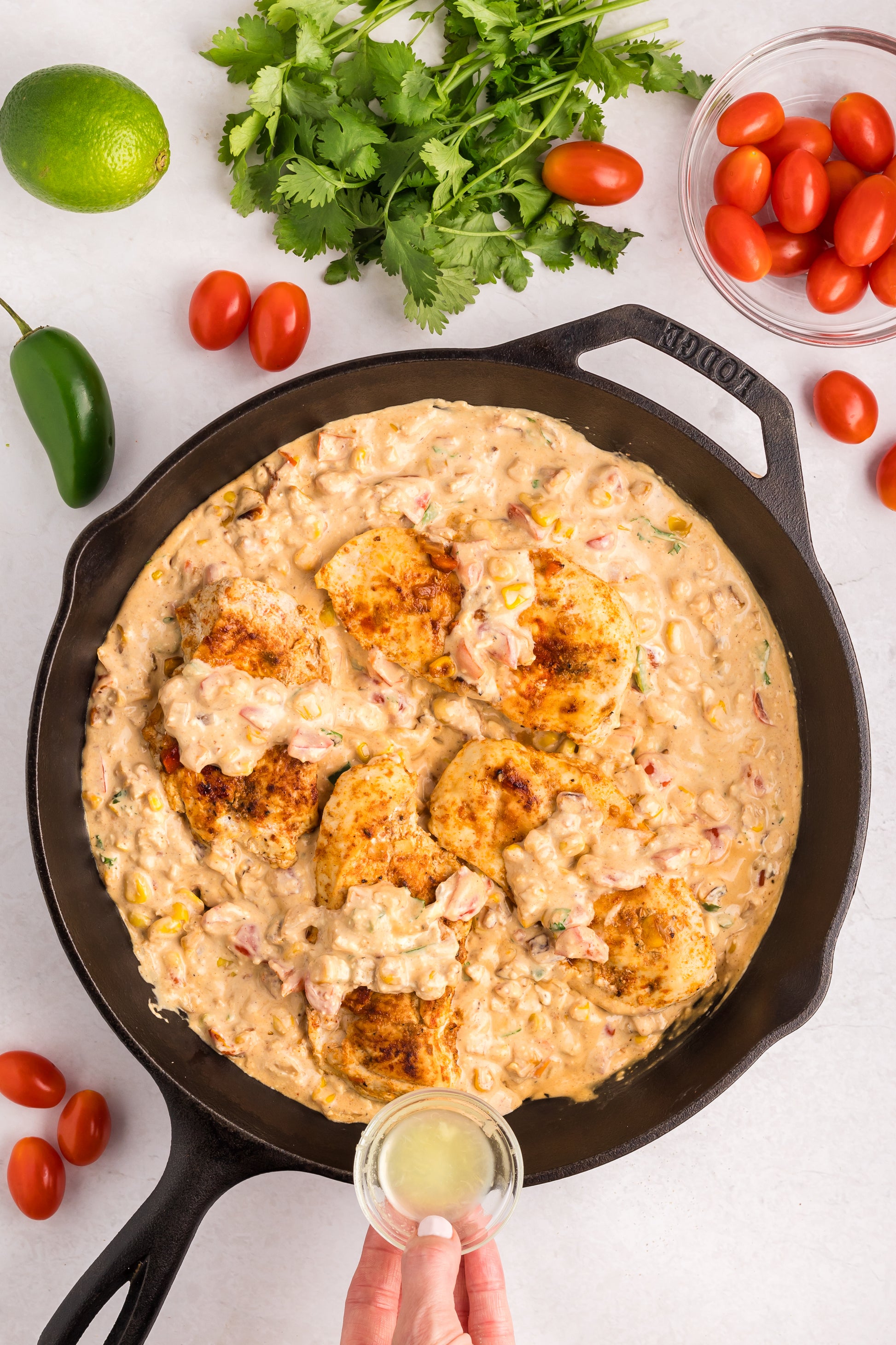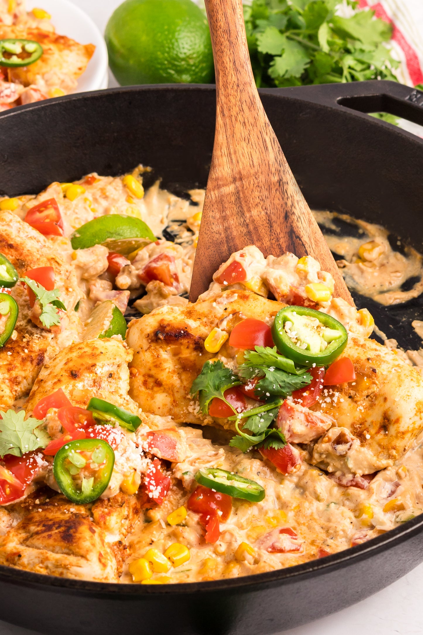 This street corn chicken skillet offers a vibrant burst of flavors with zesty lime juice, sweet roasted corn, fragrant minced garlic, fresh cilantro, and rich cotija cheese. The seasoned chicken absorbs all the delicious nuances of the creamy corn sauce, creating a dish that's both family-friendly and impressive enough to entertain guests.