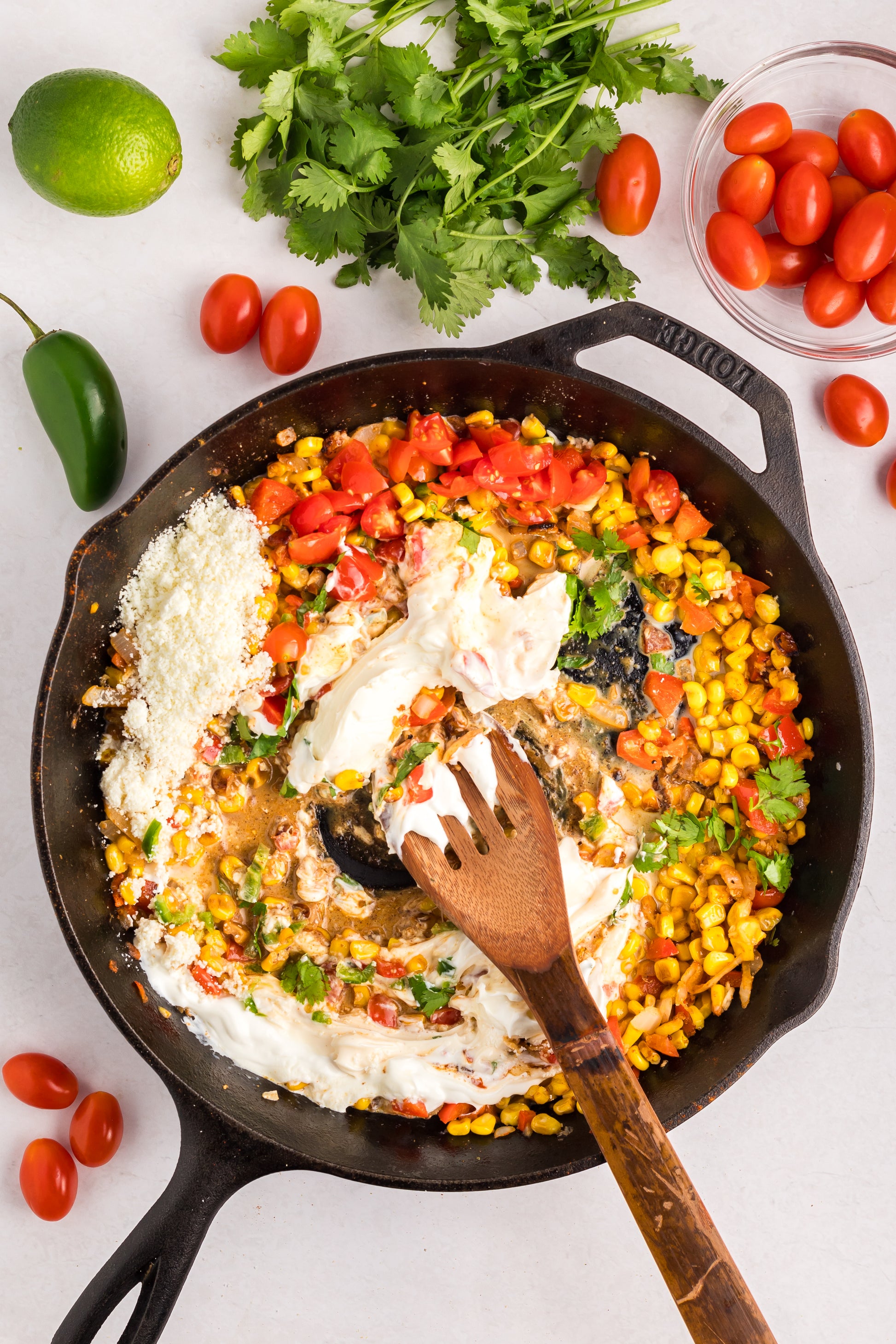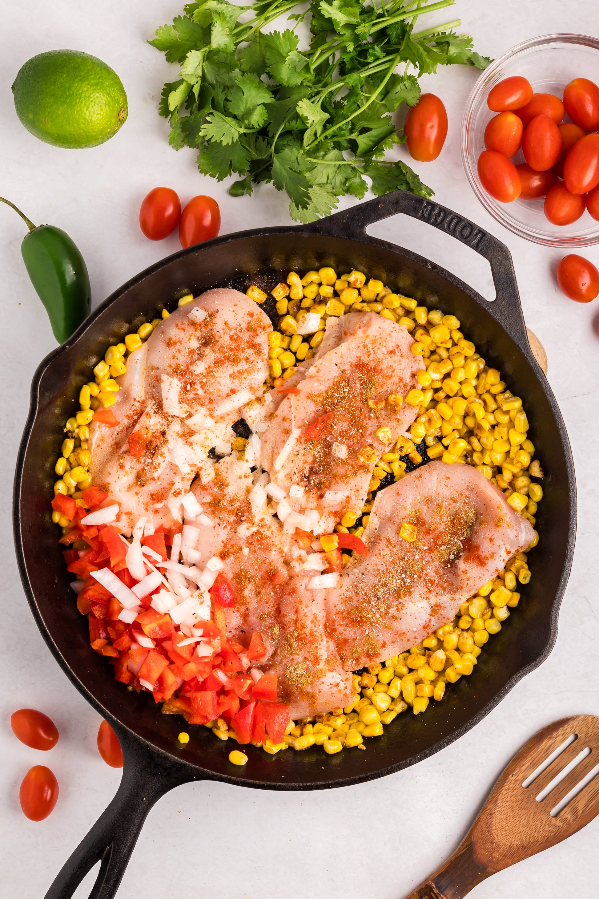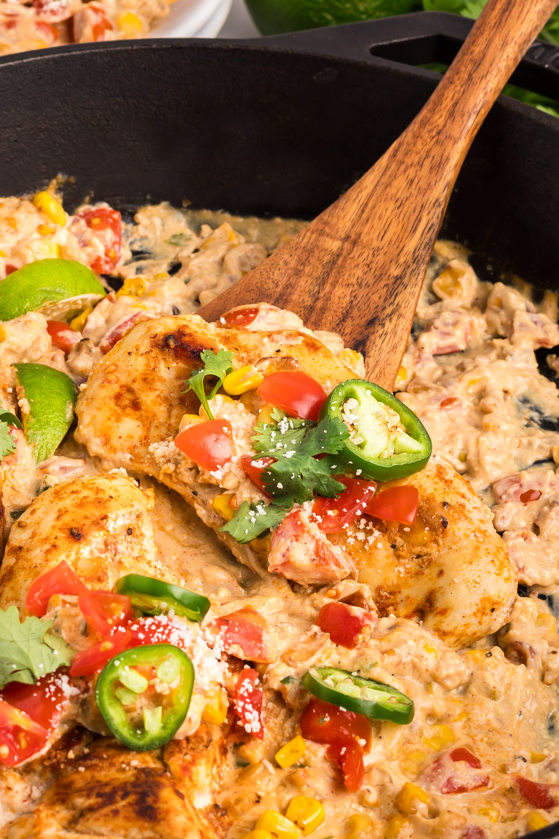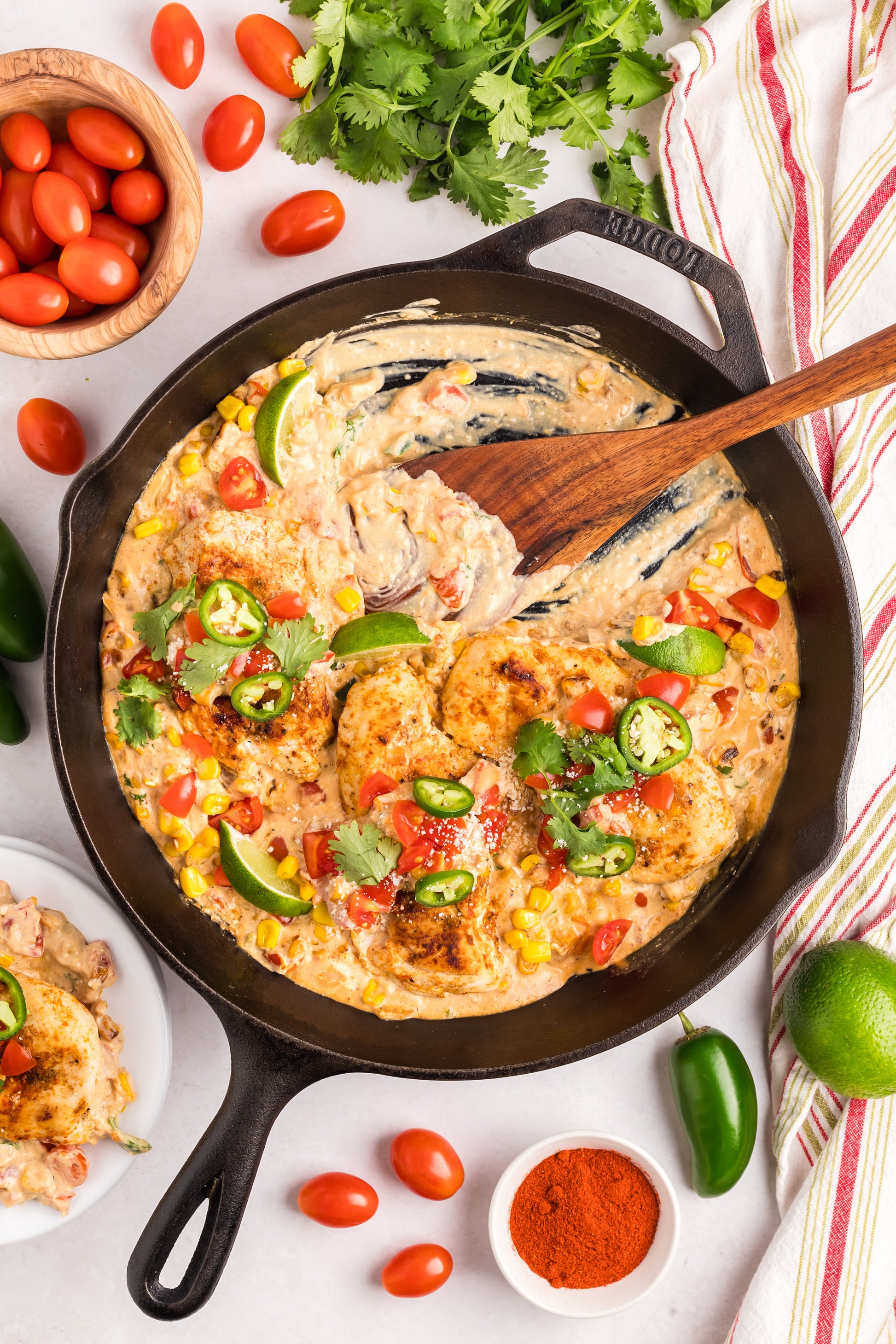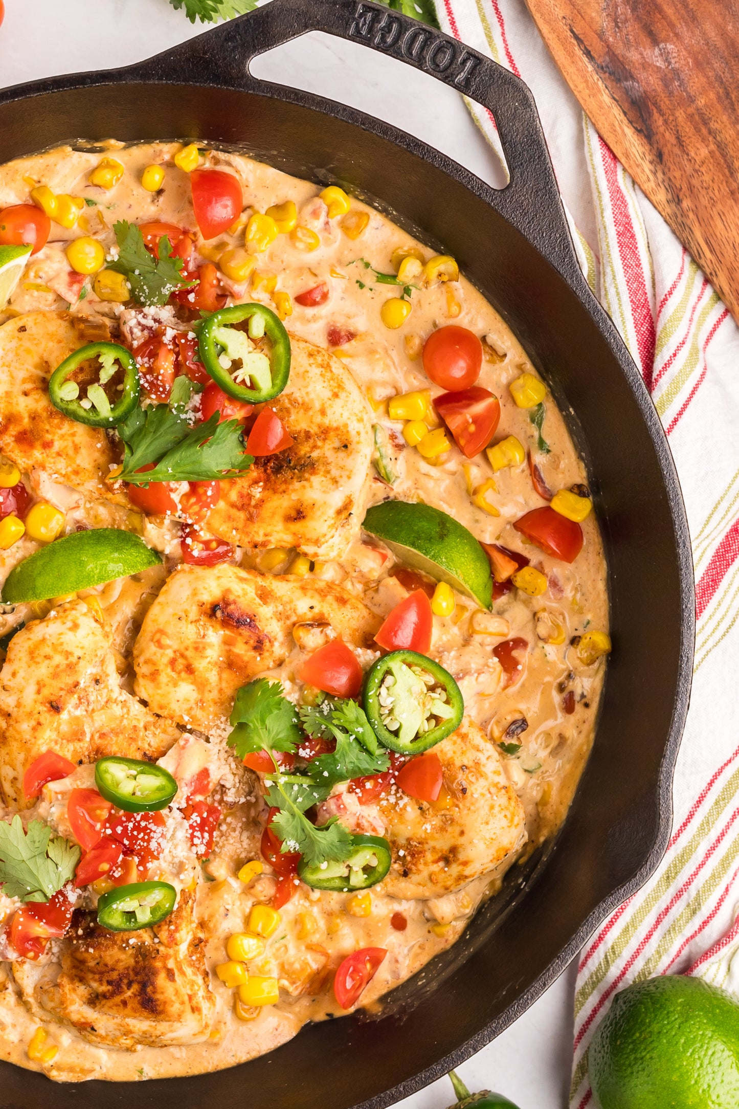 - Featured Ingredients; unsalted butter, corn, chicken breasts, yellow onion, red bell pepper, seasonings, garlic cloves, cotija cheese, milk, sour cream, cream cheese, mayonnaise, jalapeno, tomatoes, cilantro, and lime juice.