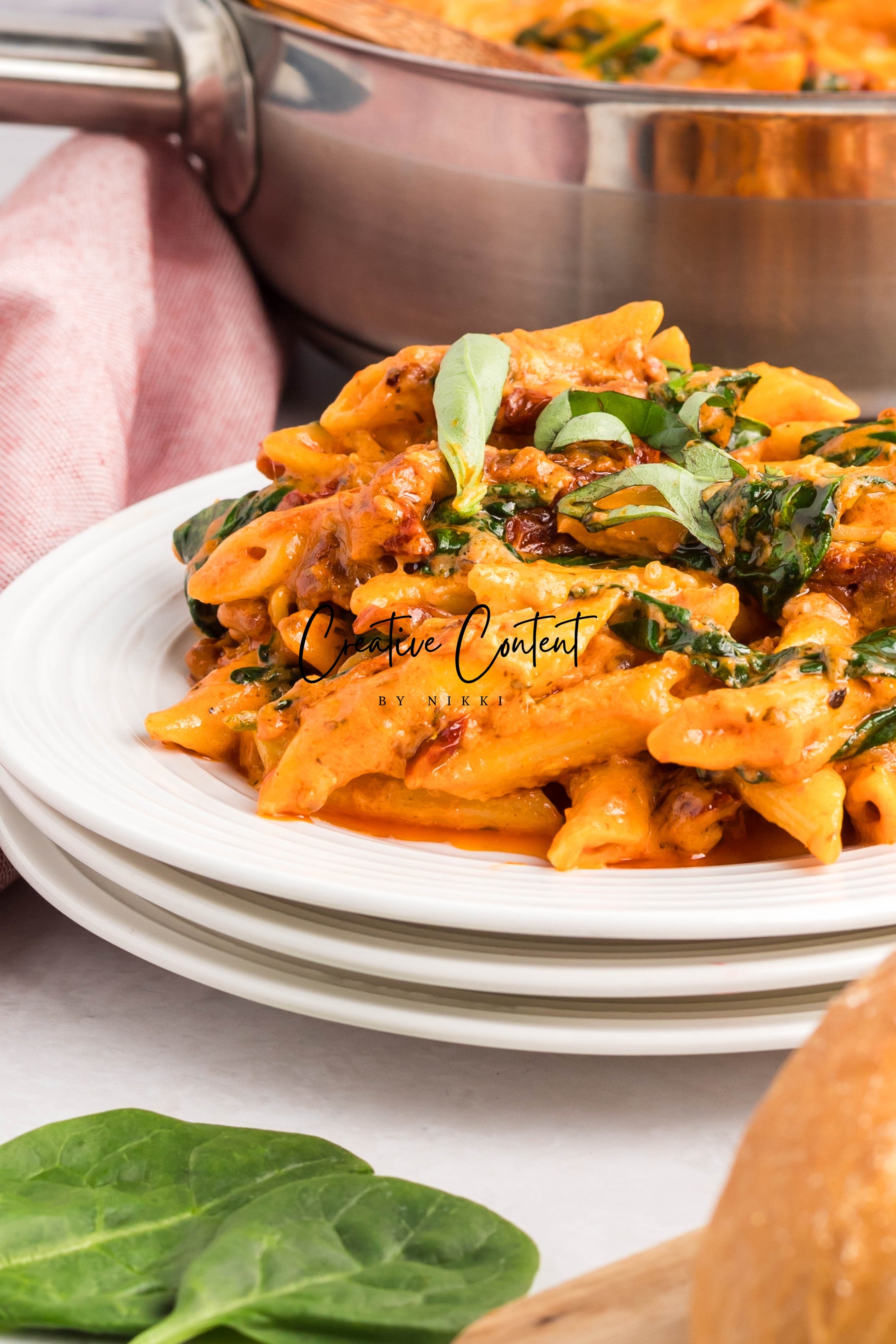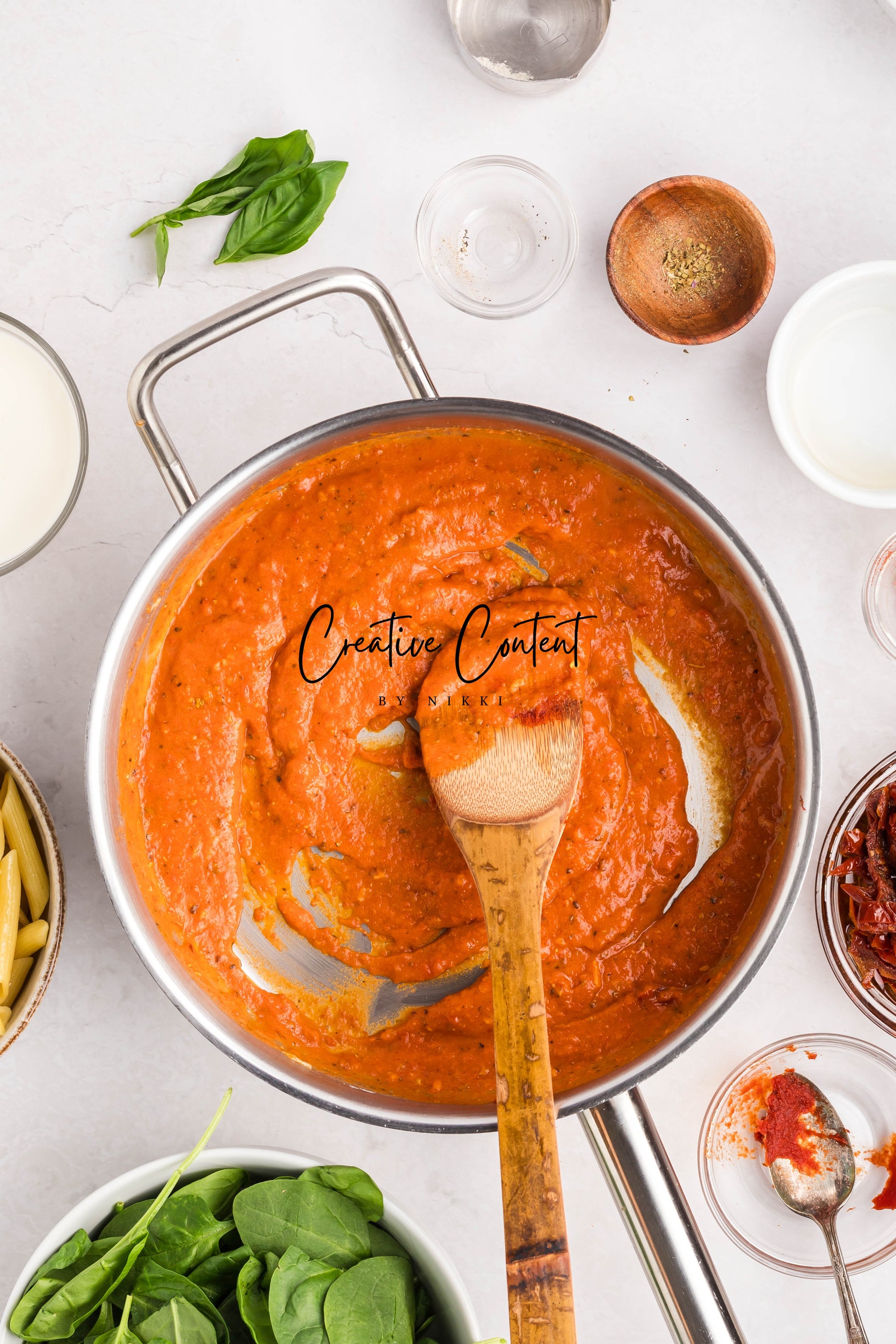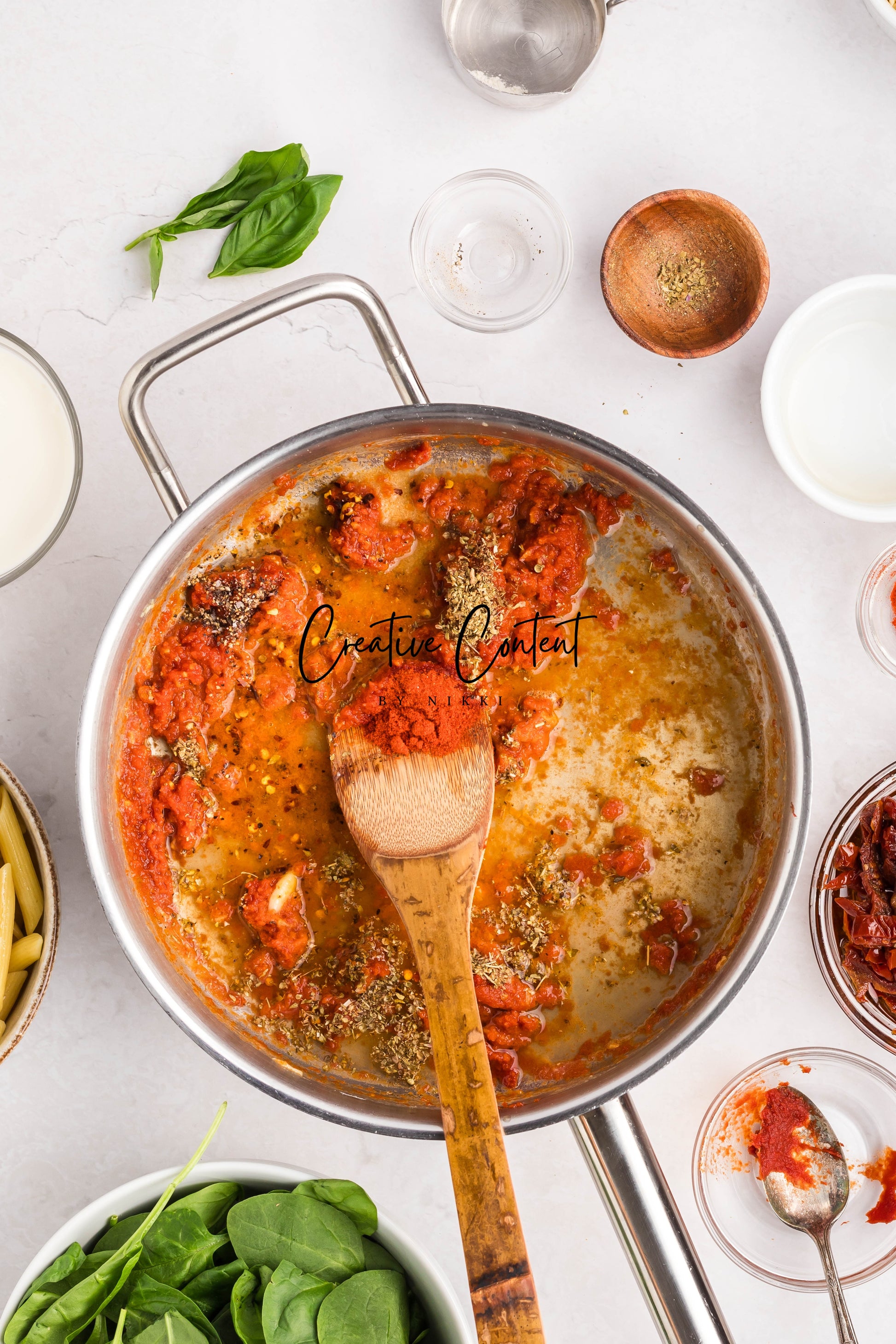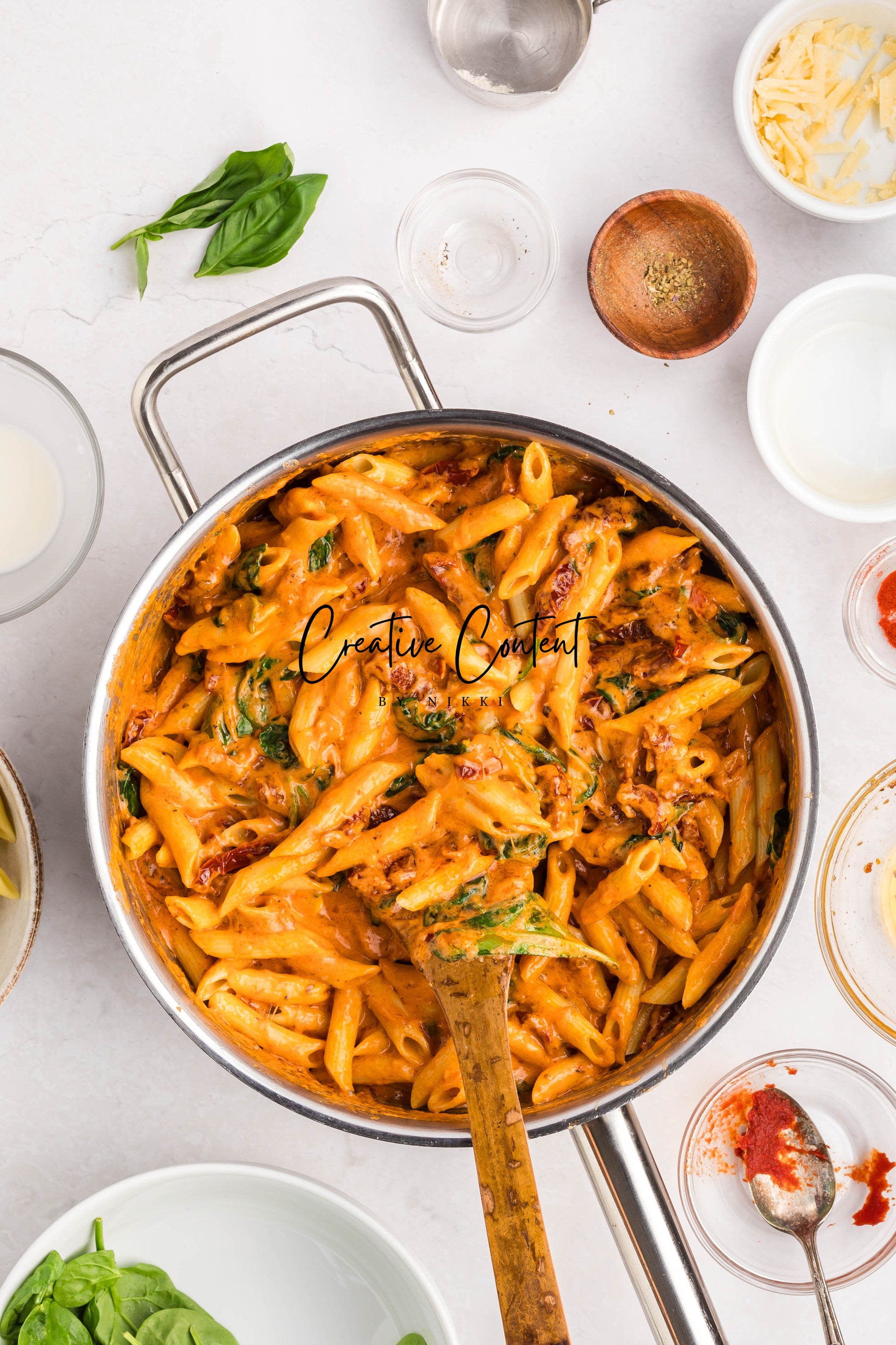- Featured Ingredients: pasta, unsalted butter, sun-dried tomatoes in oil, garlic cloves, all-purpose flour, tomato paste, vegetable broth, seasonings, heavy cream, parmesan cheese, baby spinach, and basil