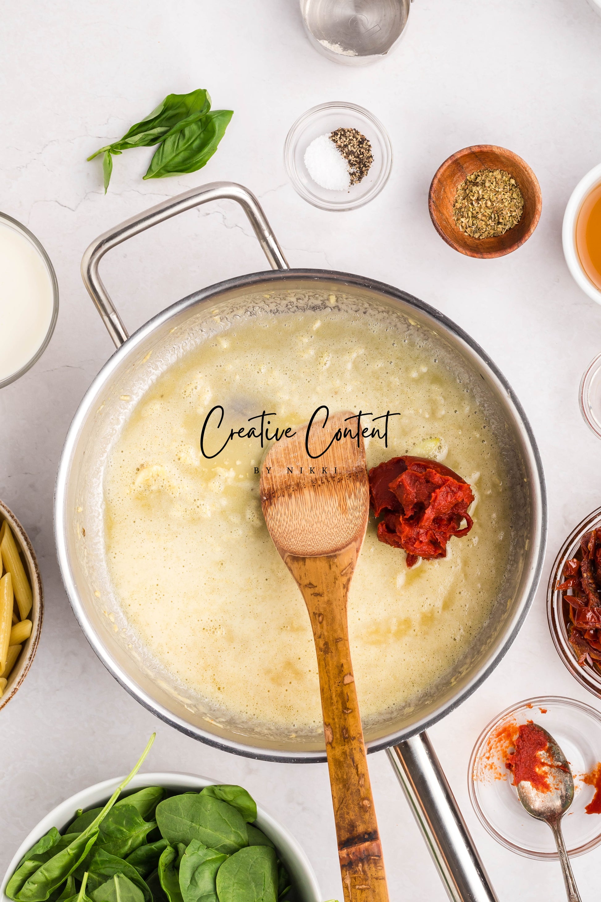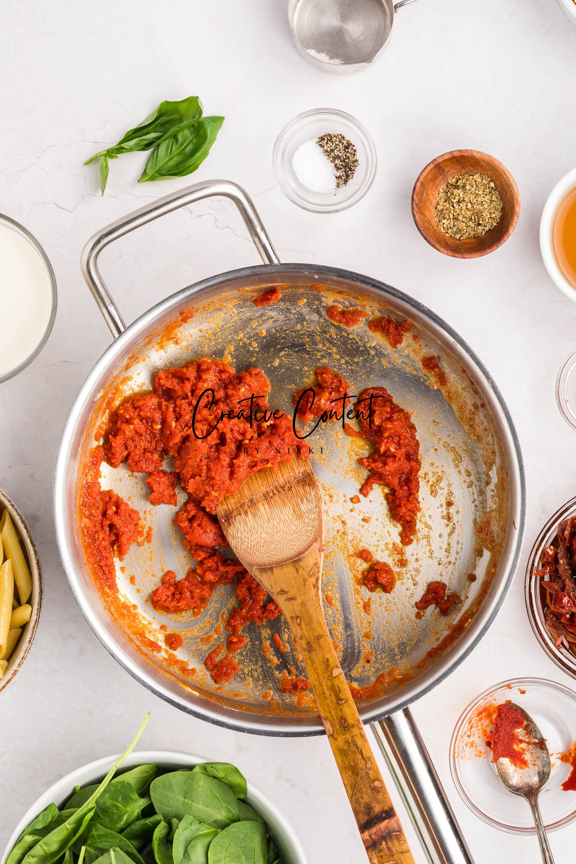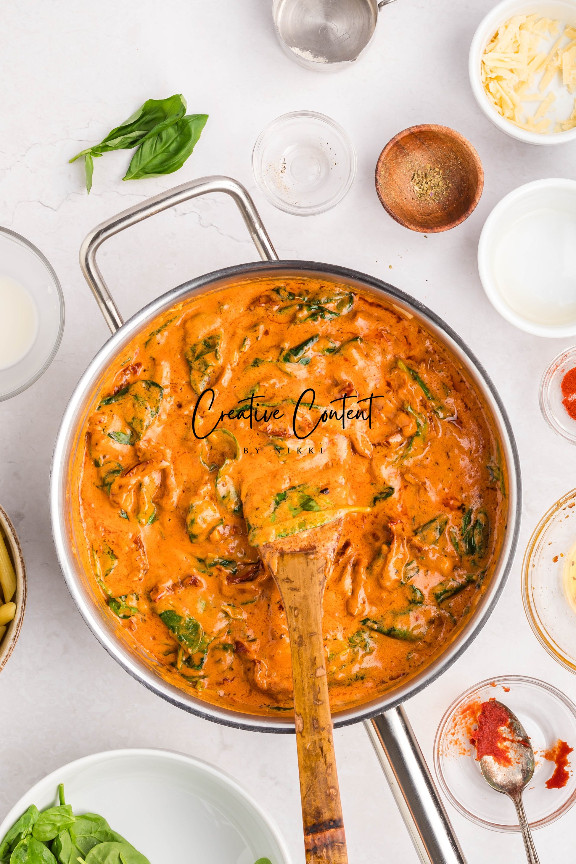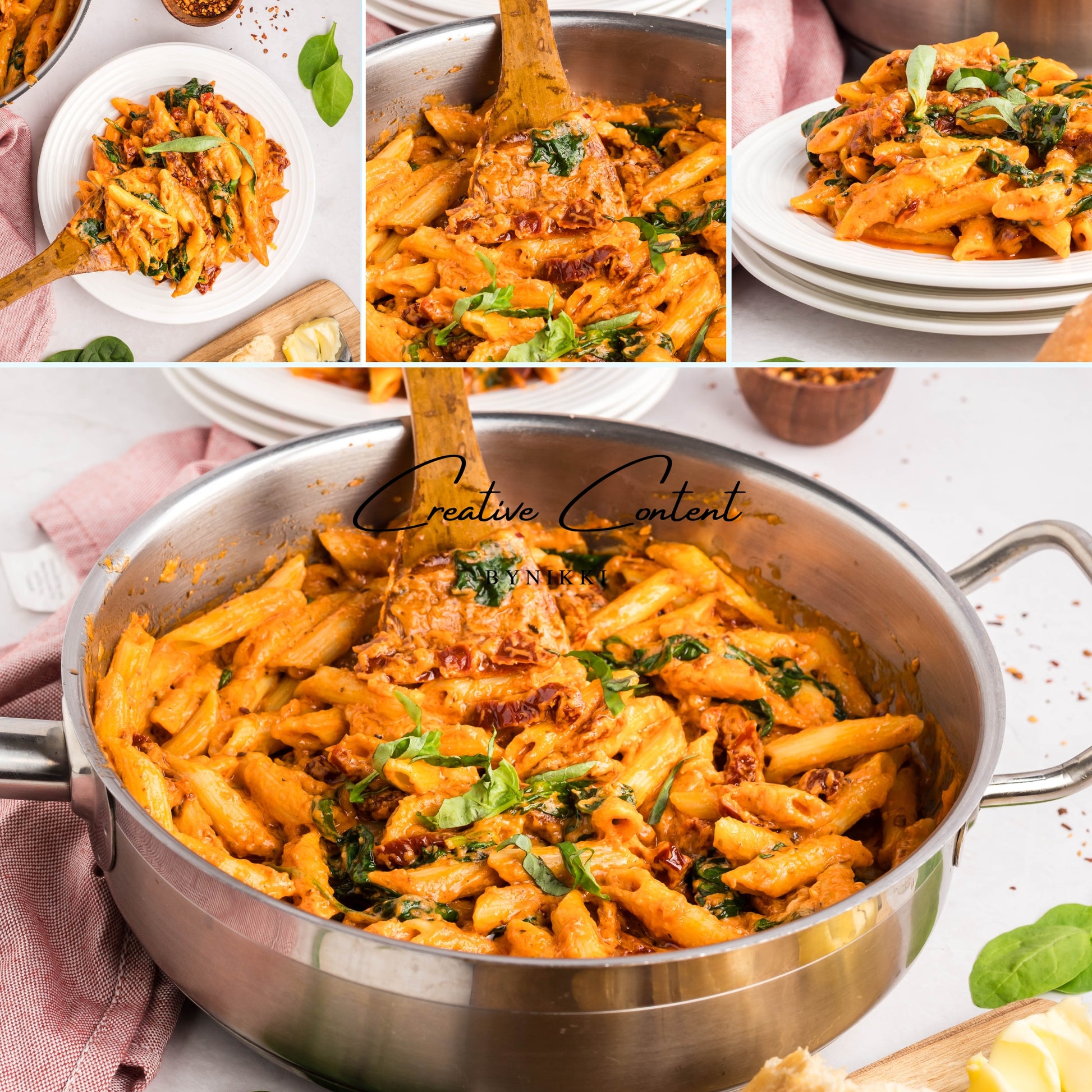 - Featured Ingredients: pasta, unsalted butter, sun-dried tomatoes in oil, garlic cloves, all-purpose flour, tomato paste, vegetable broth, seasonings, heavy cream, parmesan cheese, baby spinach, and basil