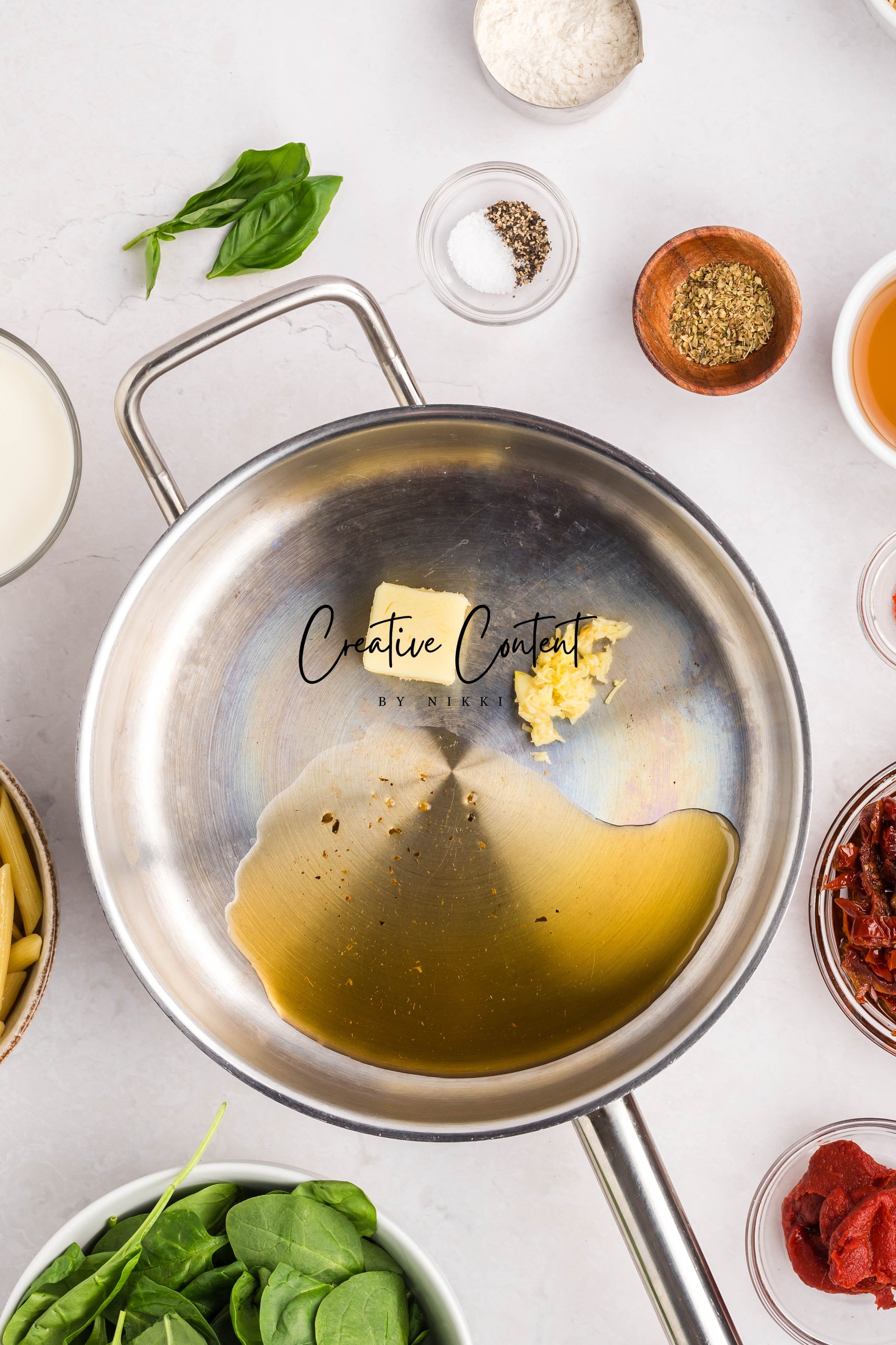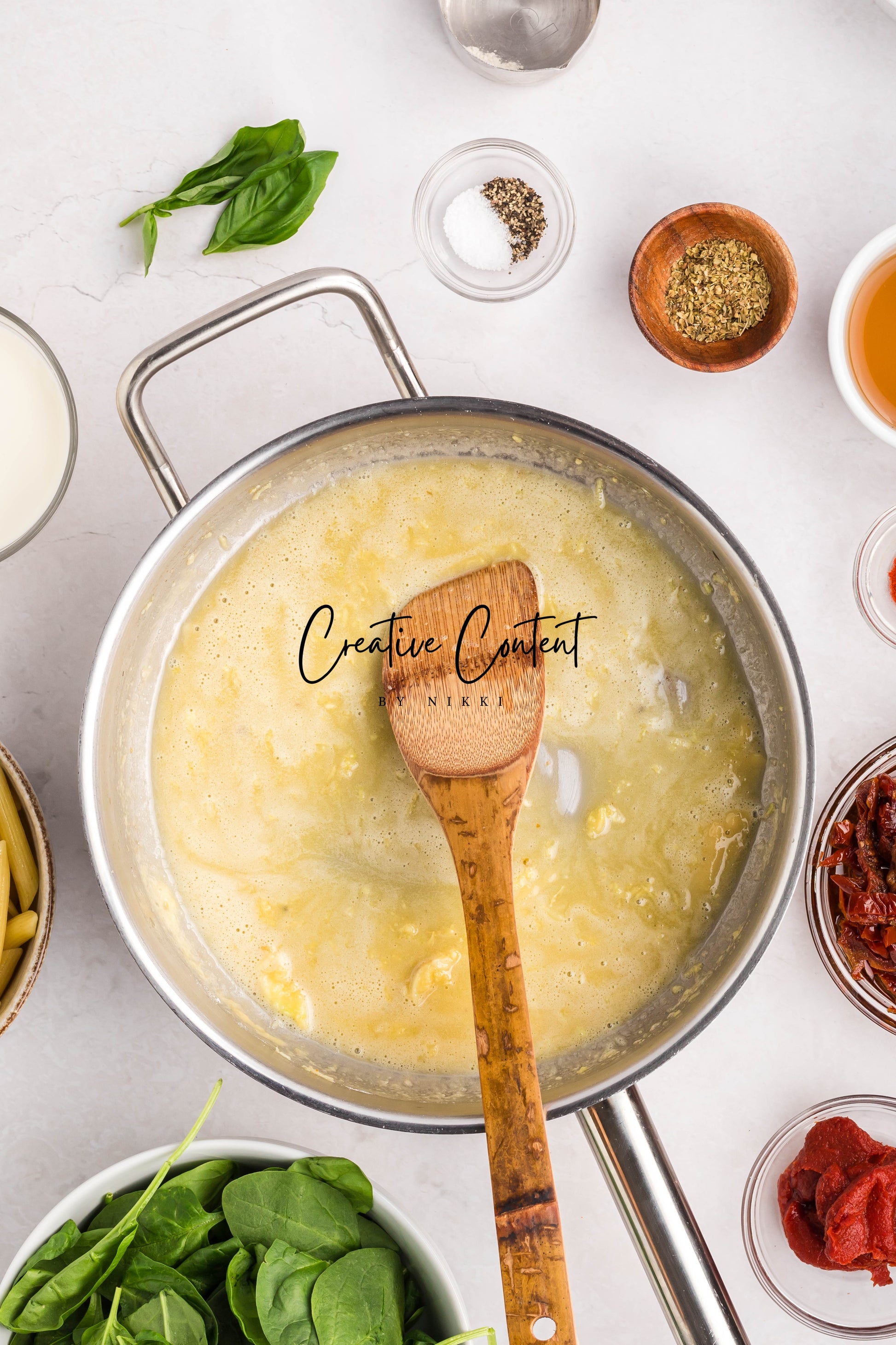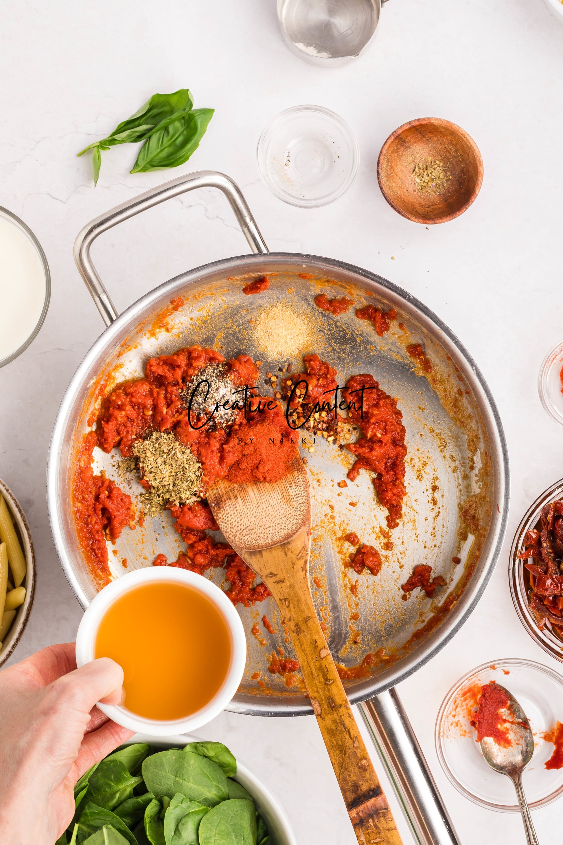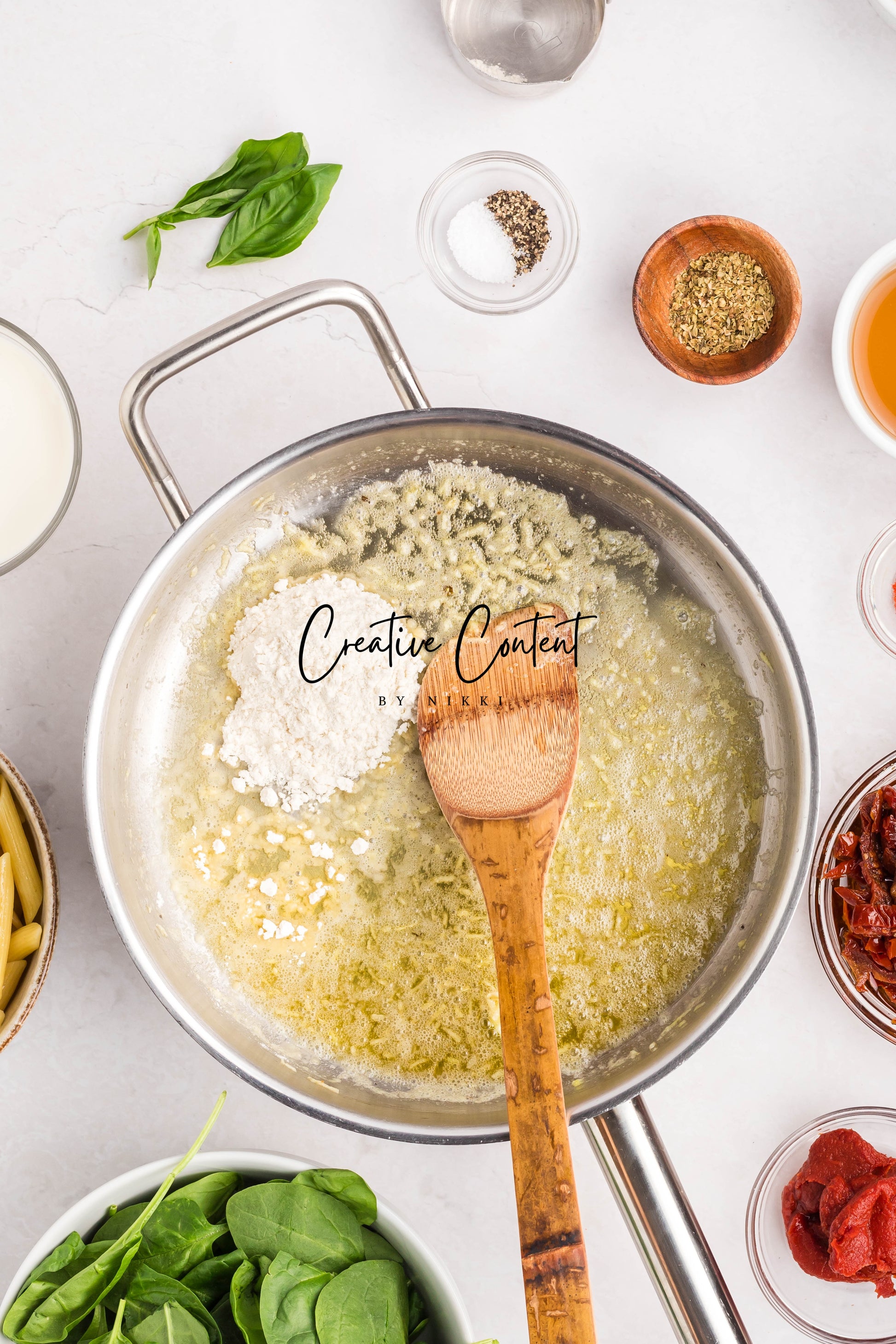 - Featured Ingredients: pasta, unsalted butter, sun-dried tomatoes in oil, garlic cloves, all-purpose flour, tomato paste, vegetable broth, seasonings, heavy cream, parmesan cheese, baby spinach, and basil