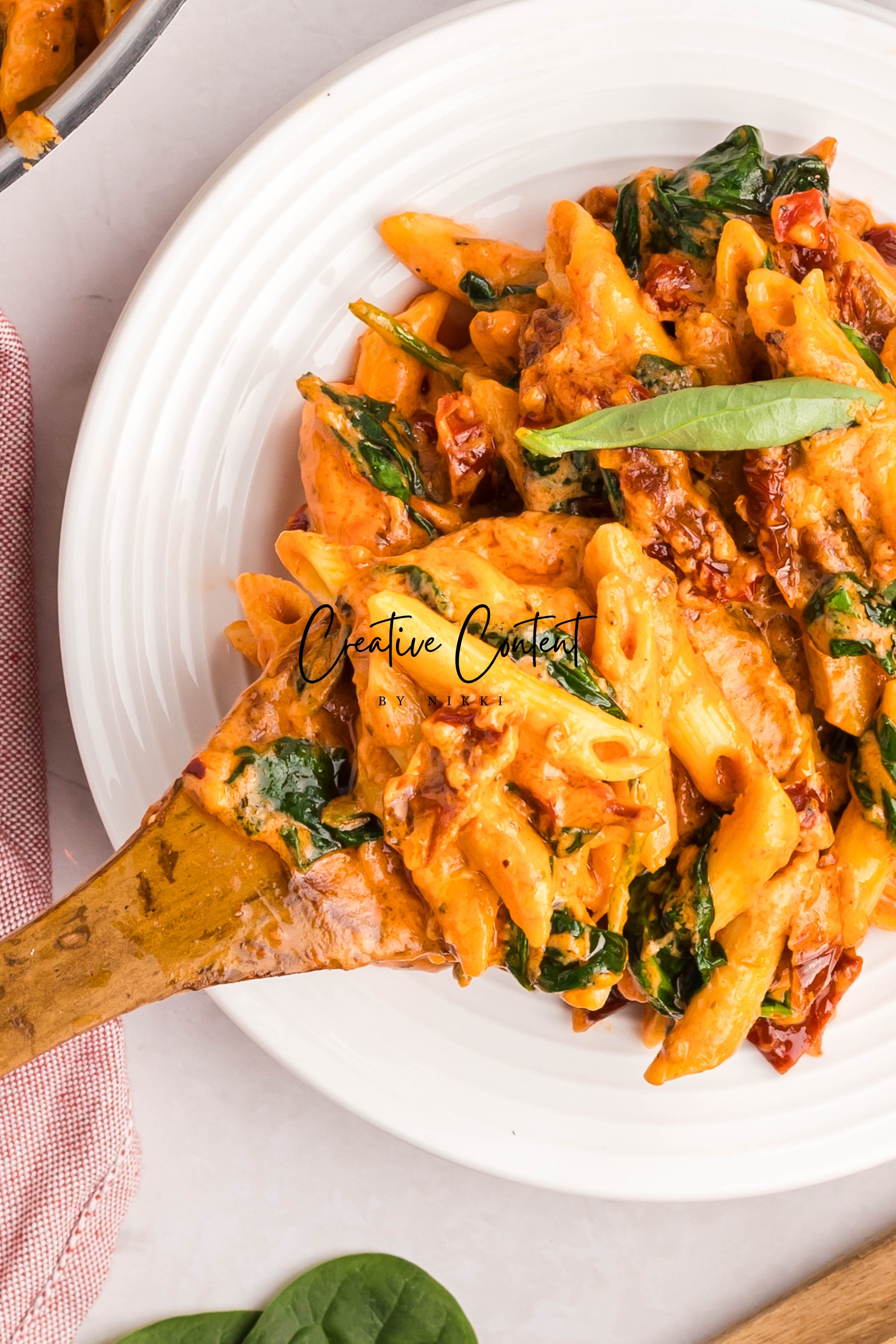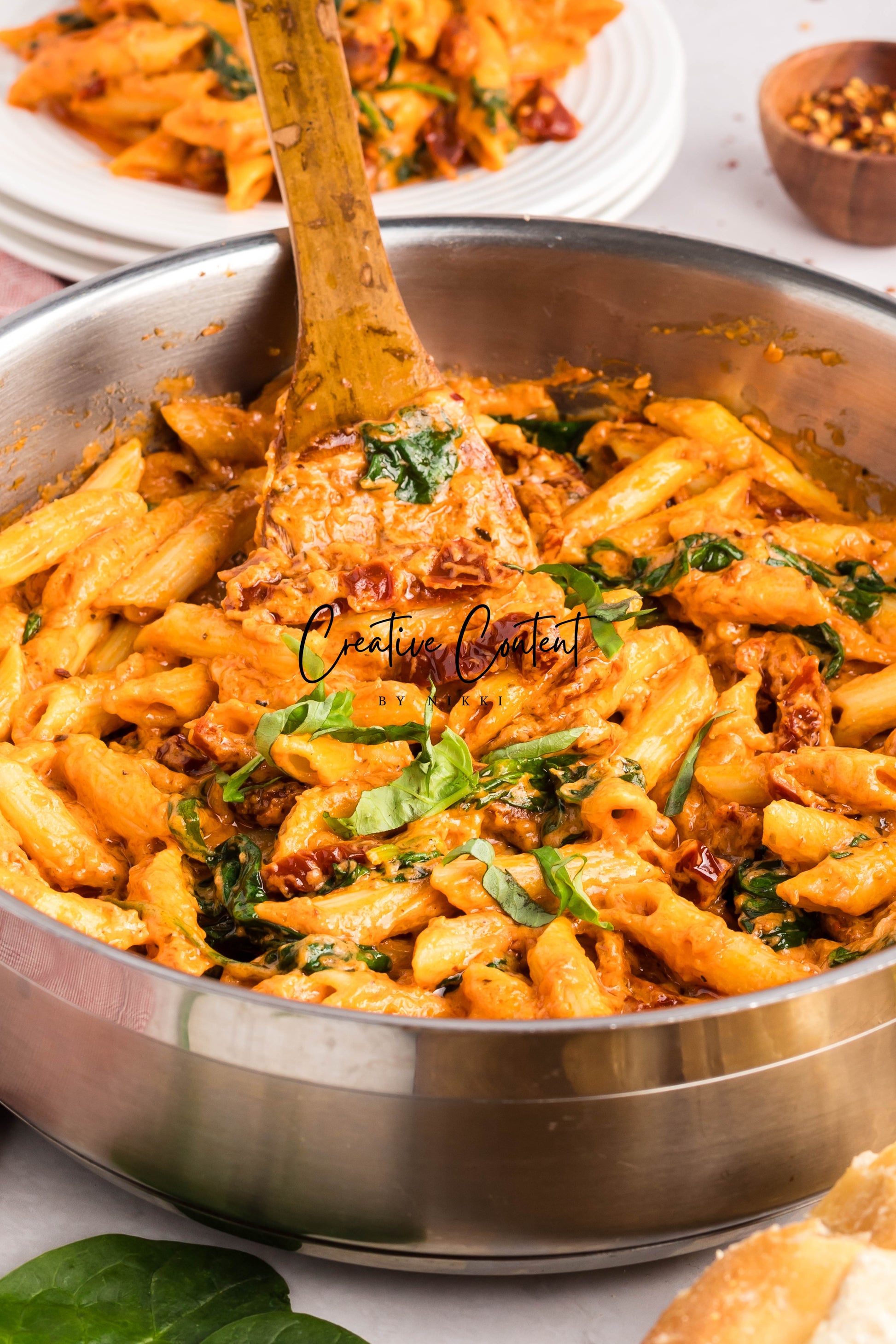 This sundried tomato pasta is rich with sun-dried tomatoes, fresh garlic, and a blend of flavorful seasonings, all brought together with a creamy heavy sauce. The sun-dried tomatoes add a burst of tangy sweetness that complements the savory garlic.