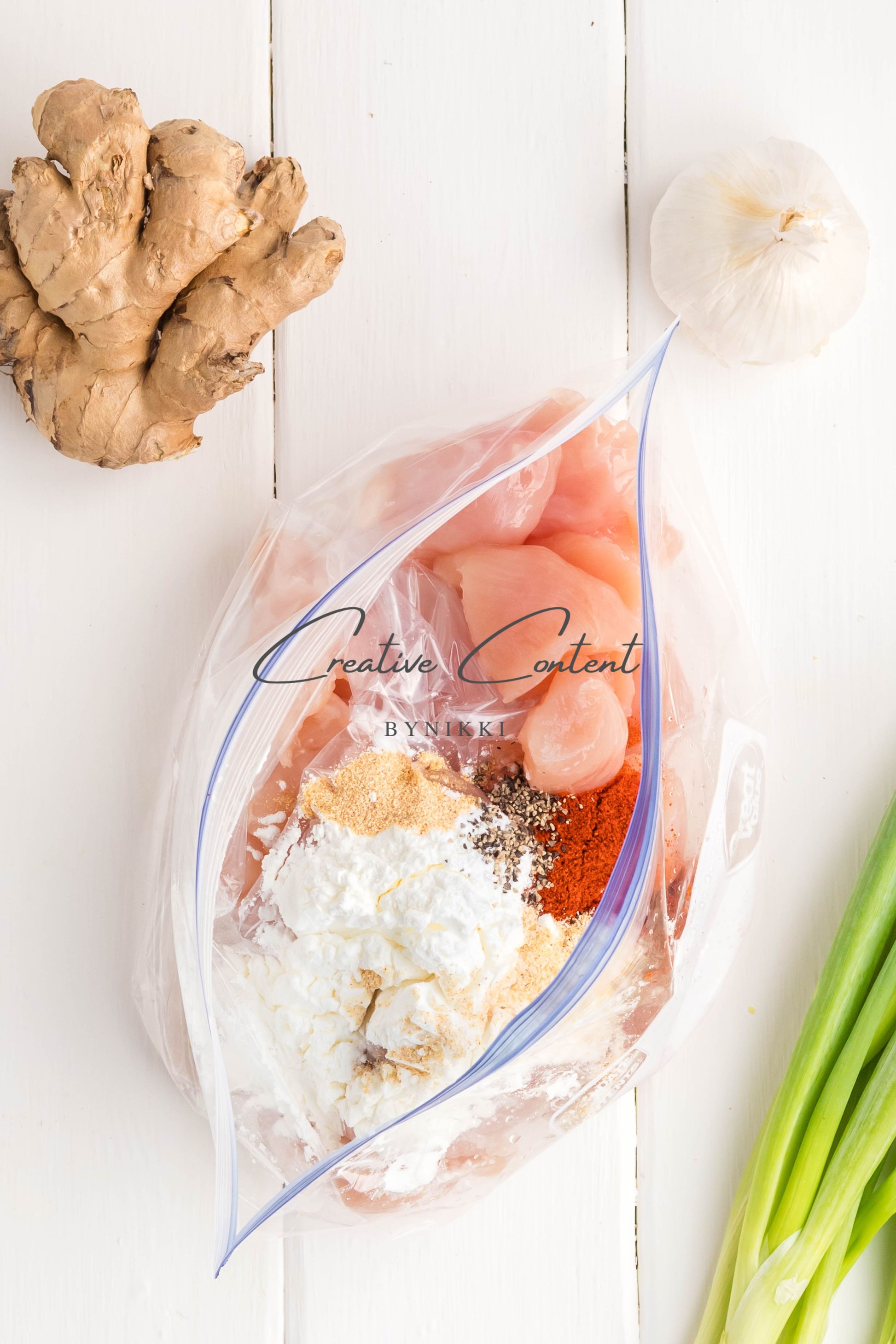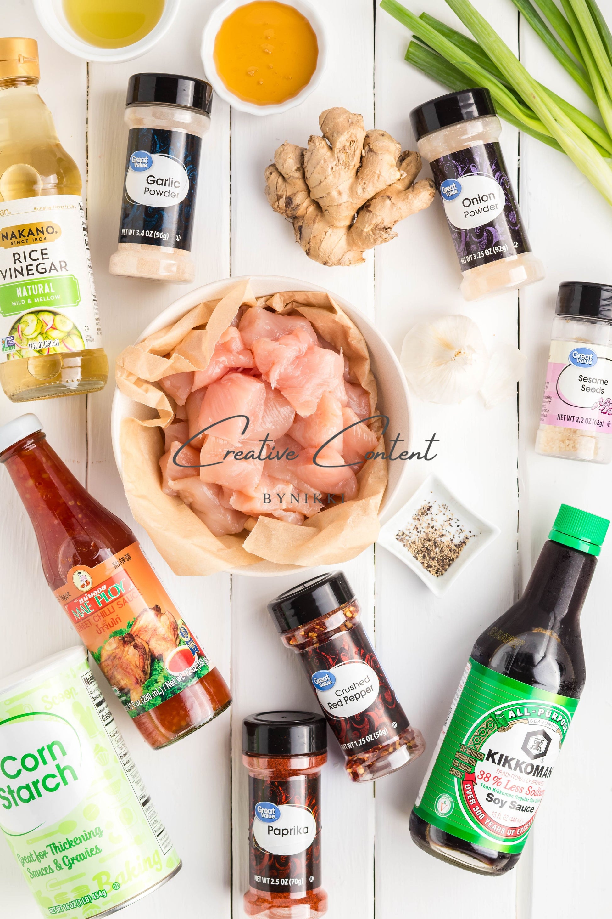 - Ingredients: Chicken, cornstarch, paprika, pepper, garlic powder, onion powder, avocado oil, sweet chili sauce, soy sauce, rice vinegar, red pepper flakes, garlic, ginger, paprika honey