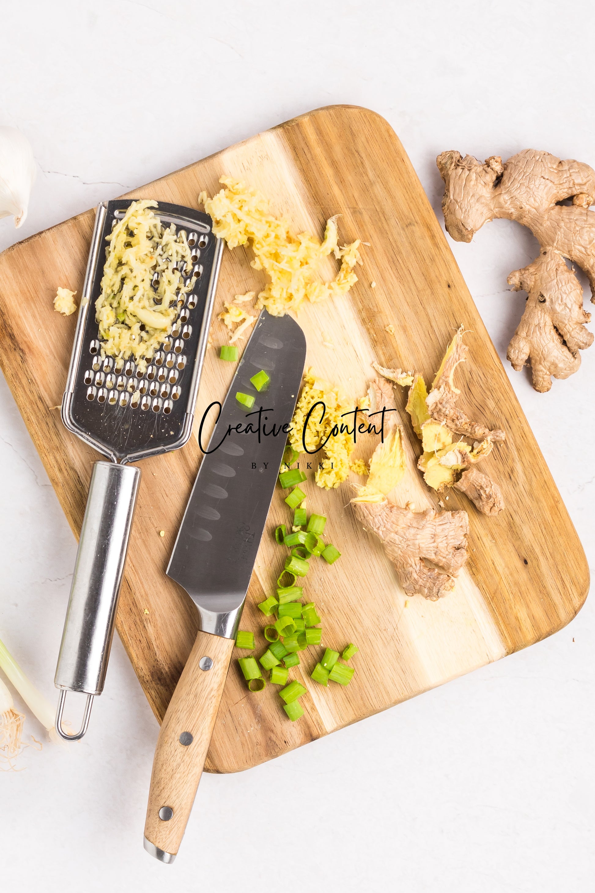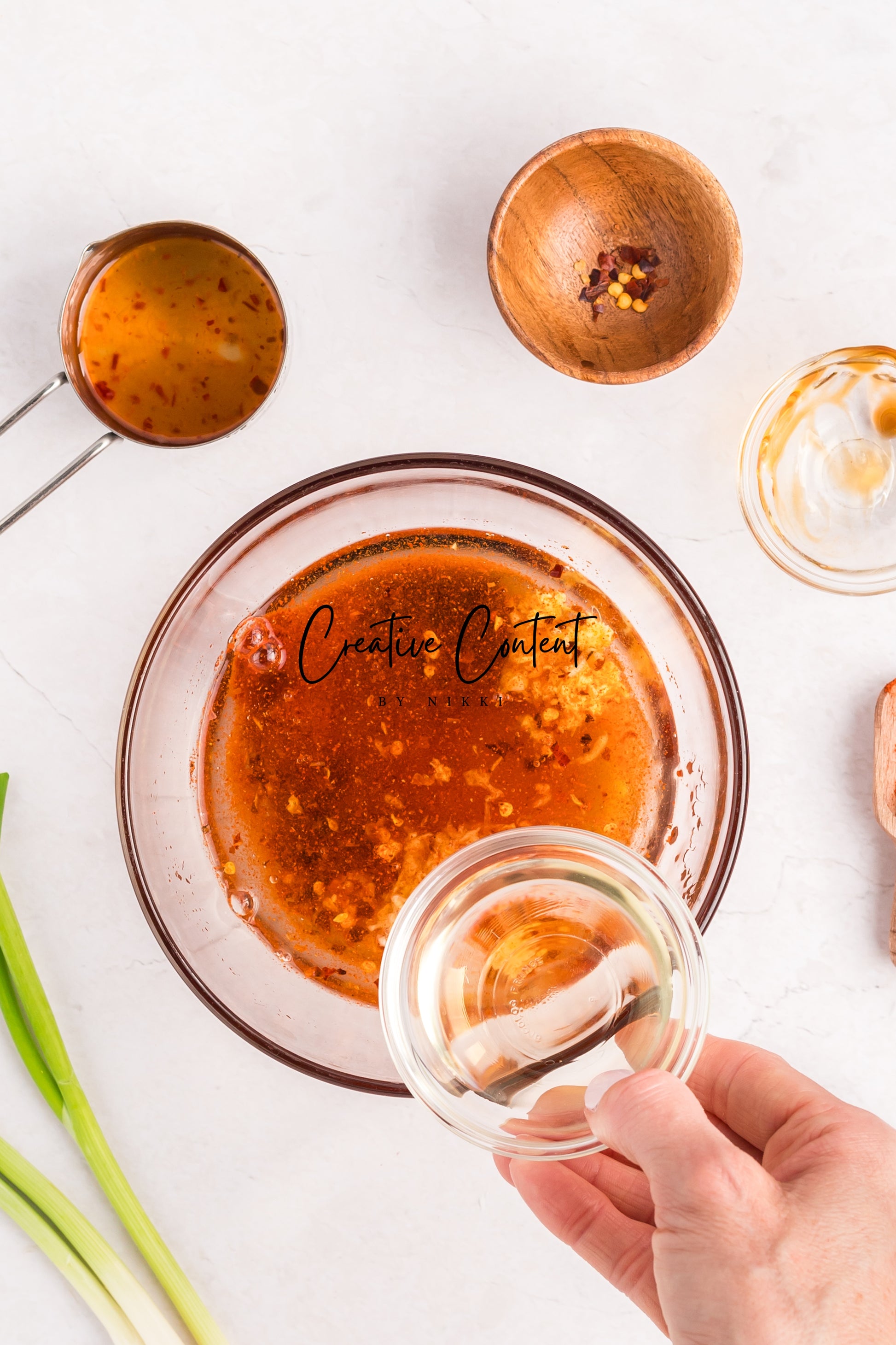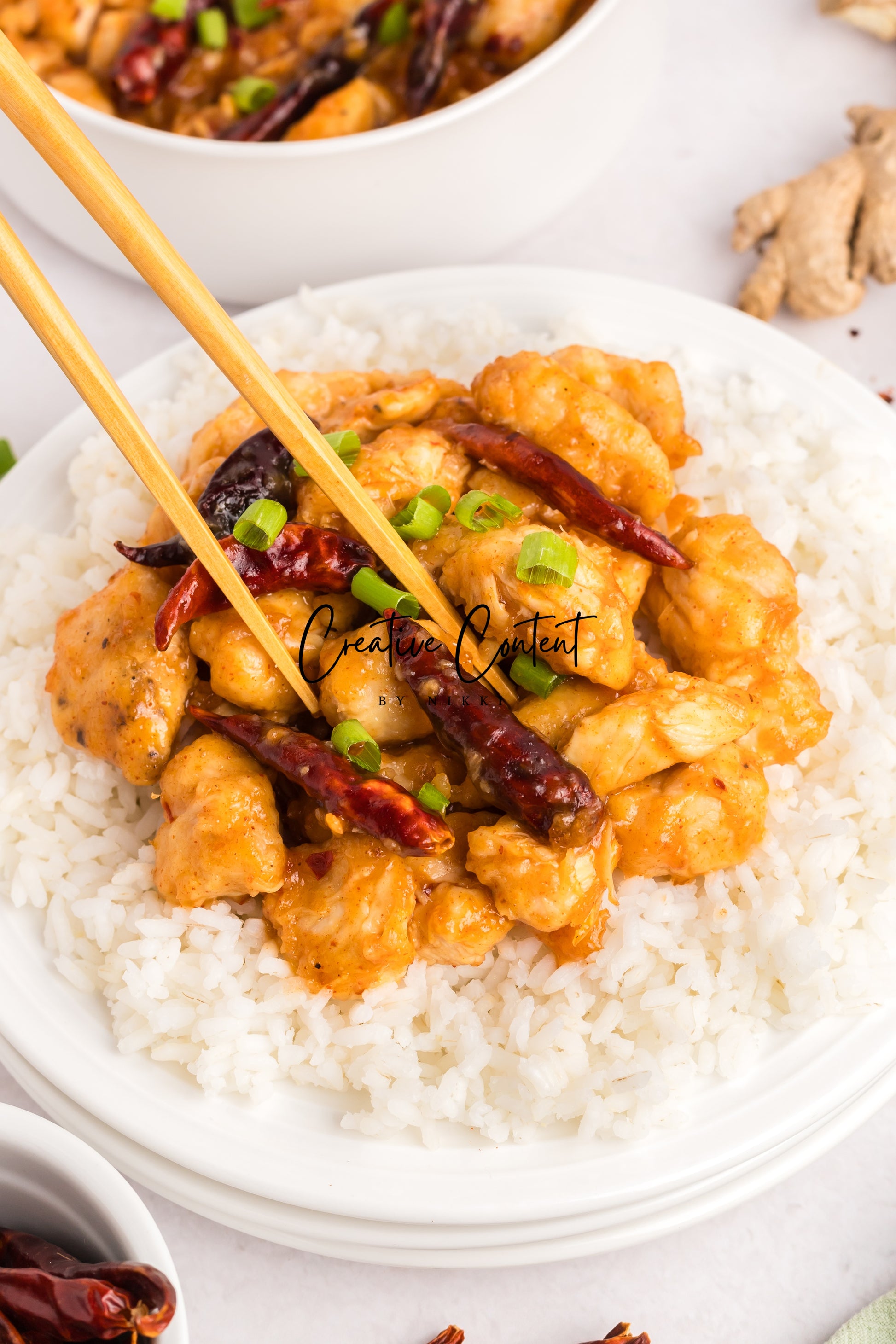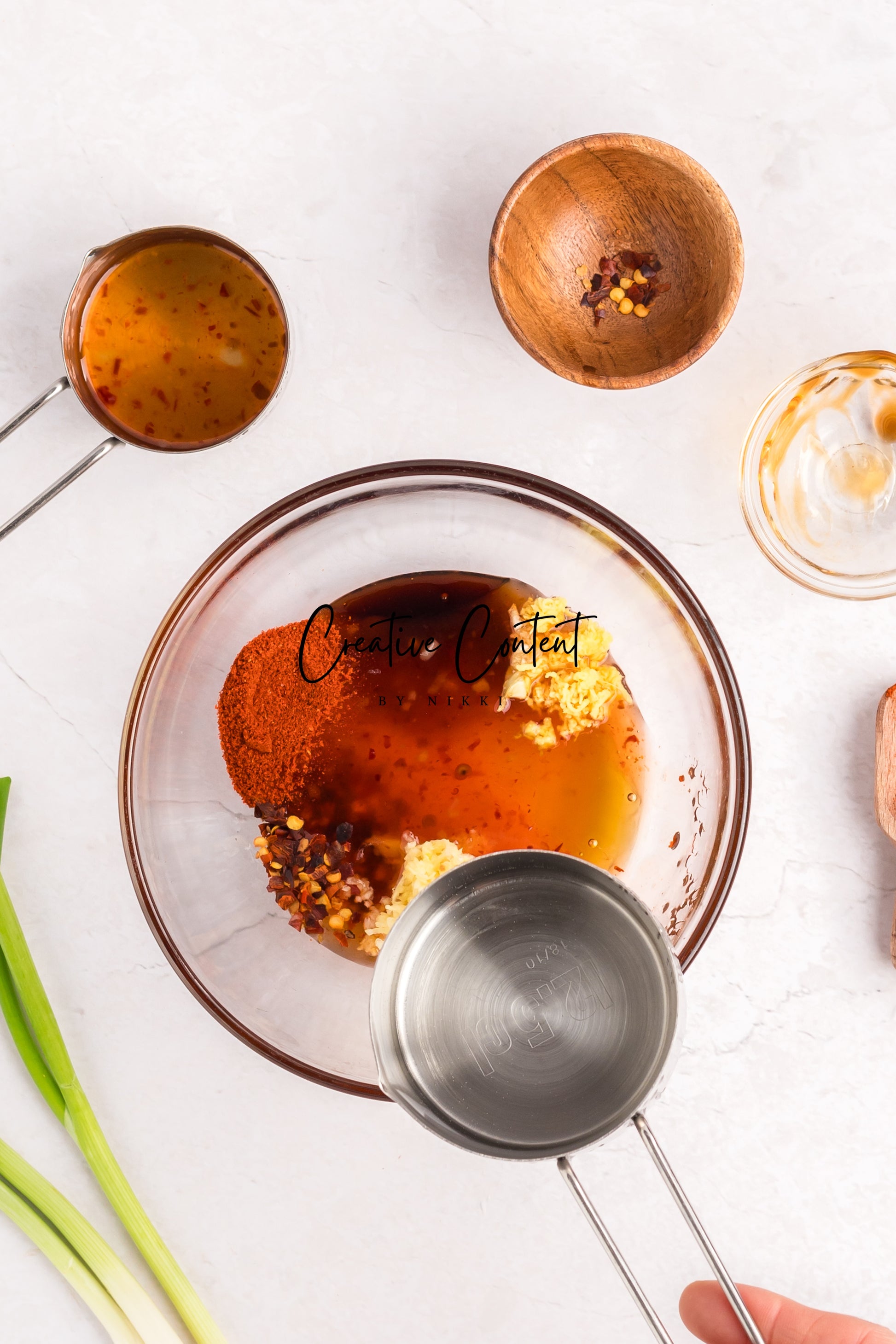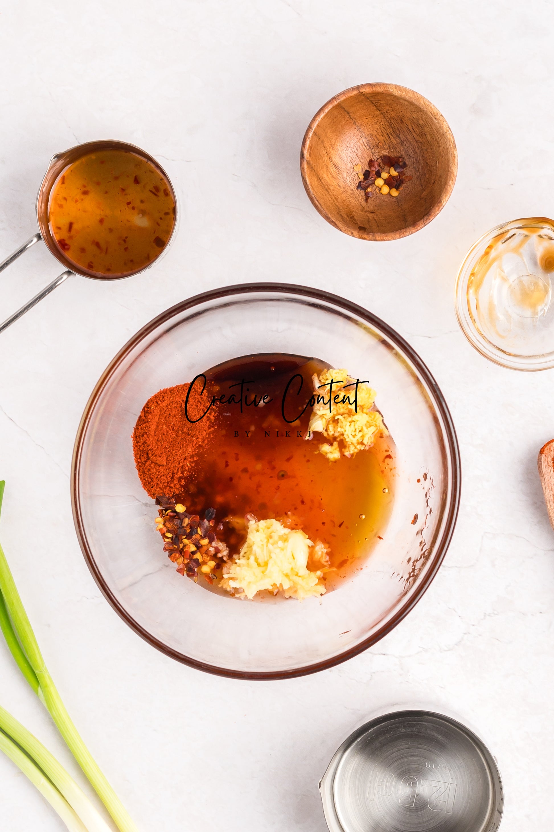 - Featured Ingredients; boneless skinless chicken, cornstarch, coarse kosher salt, black pepper, garlic powder, onion powder, avocado oil, honey, rice wine vinegar, garlic cloves, soy sauce, ginger, red chili flakes, oyster sauce, green onions, and red chiles.