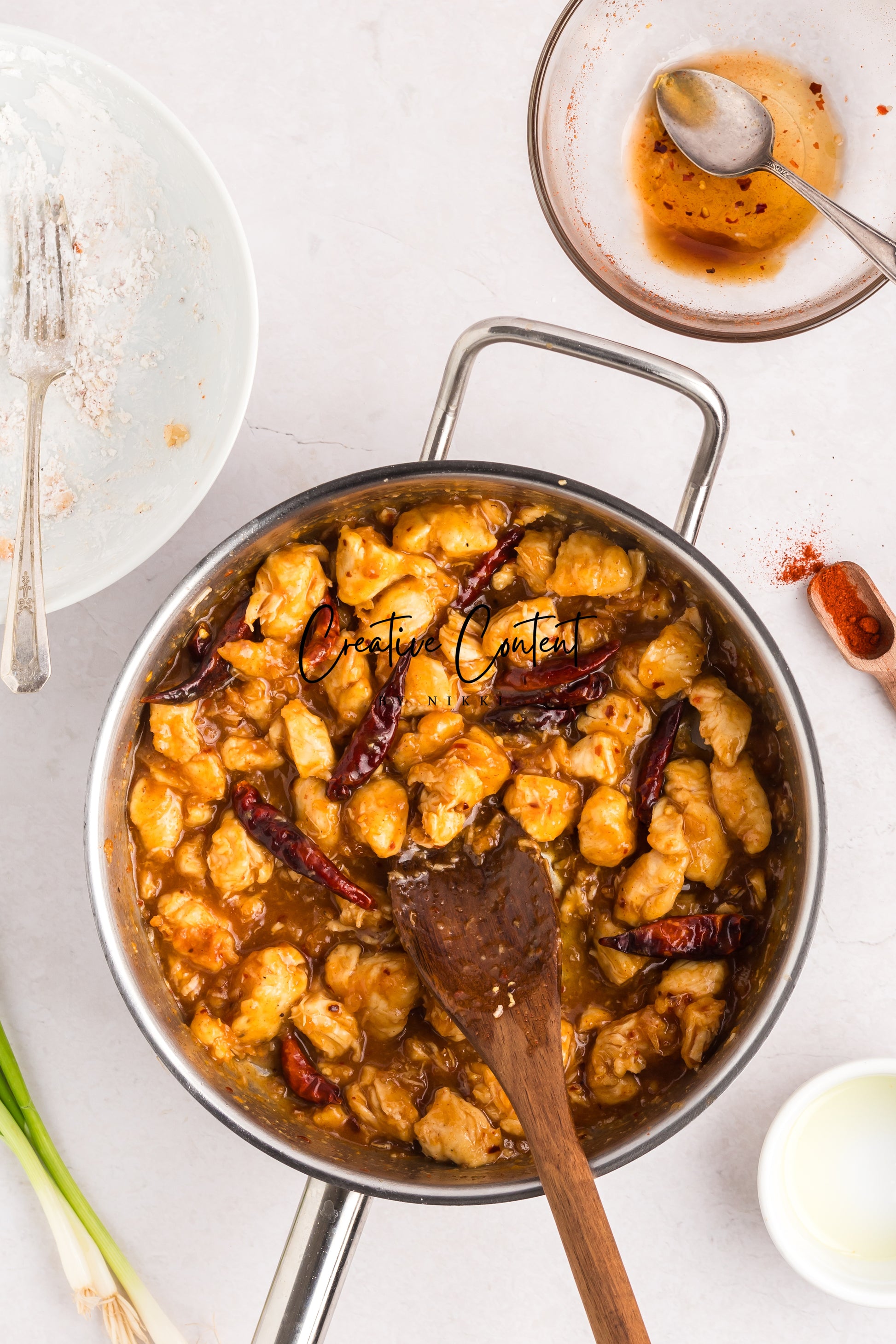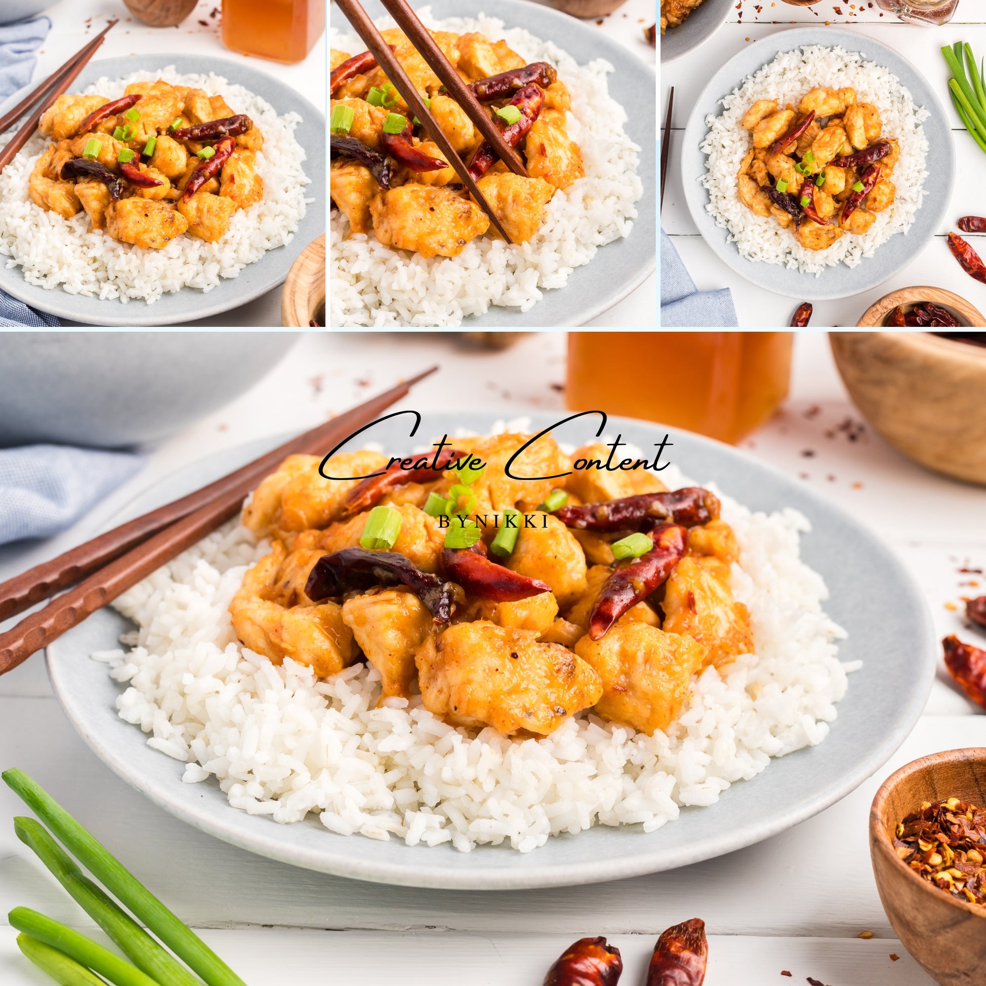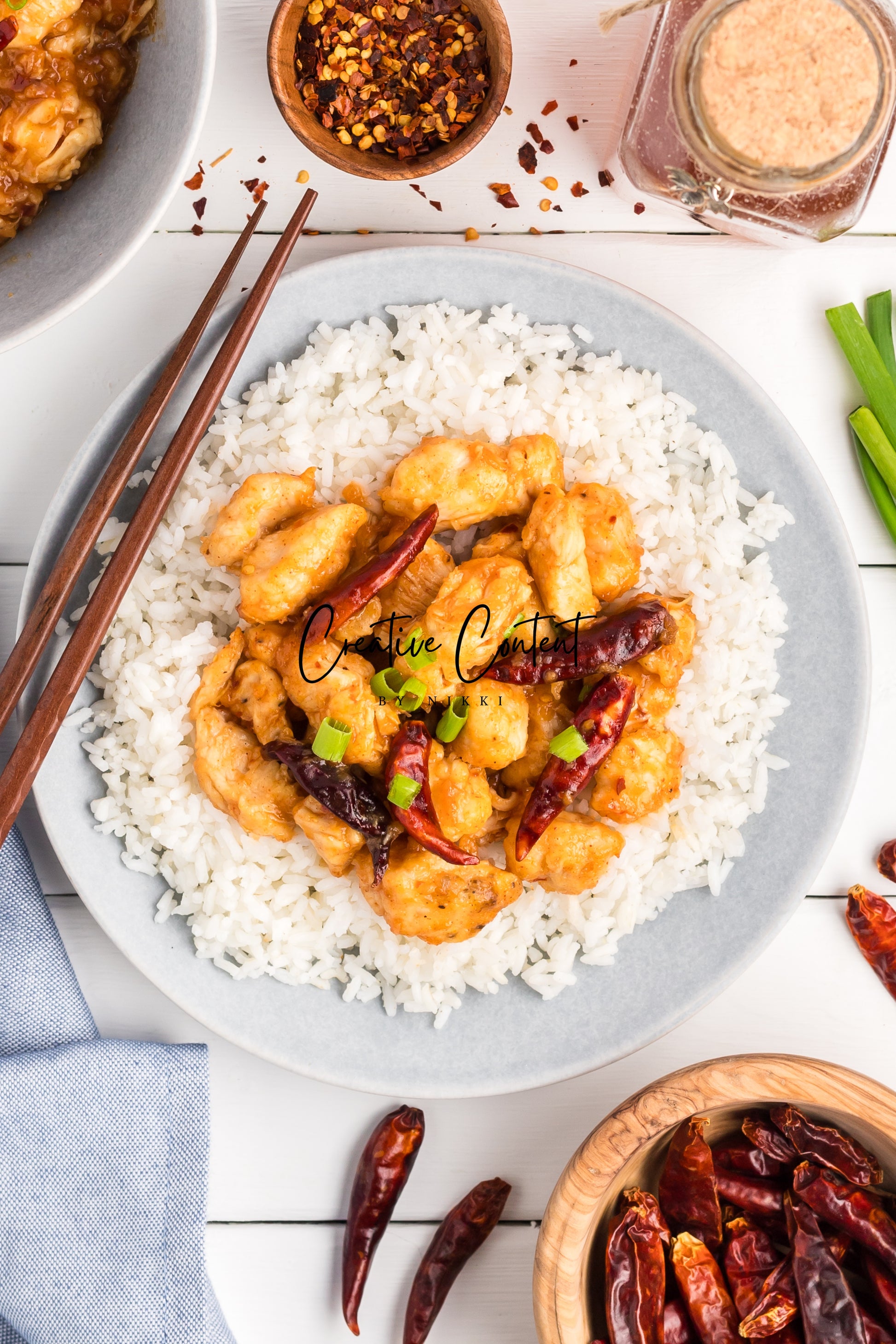 - Featured Ingredients; boneless skinless chicken, cornstarch, coarse kosher salt, black pepper, garlic powder, onion powder, avocado oil, honey, rice wine vinegar, garlic cloves, soy sauce, ginger, red chili flakes, oyster sauce, green onions, and red chiles.