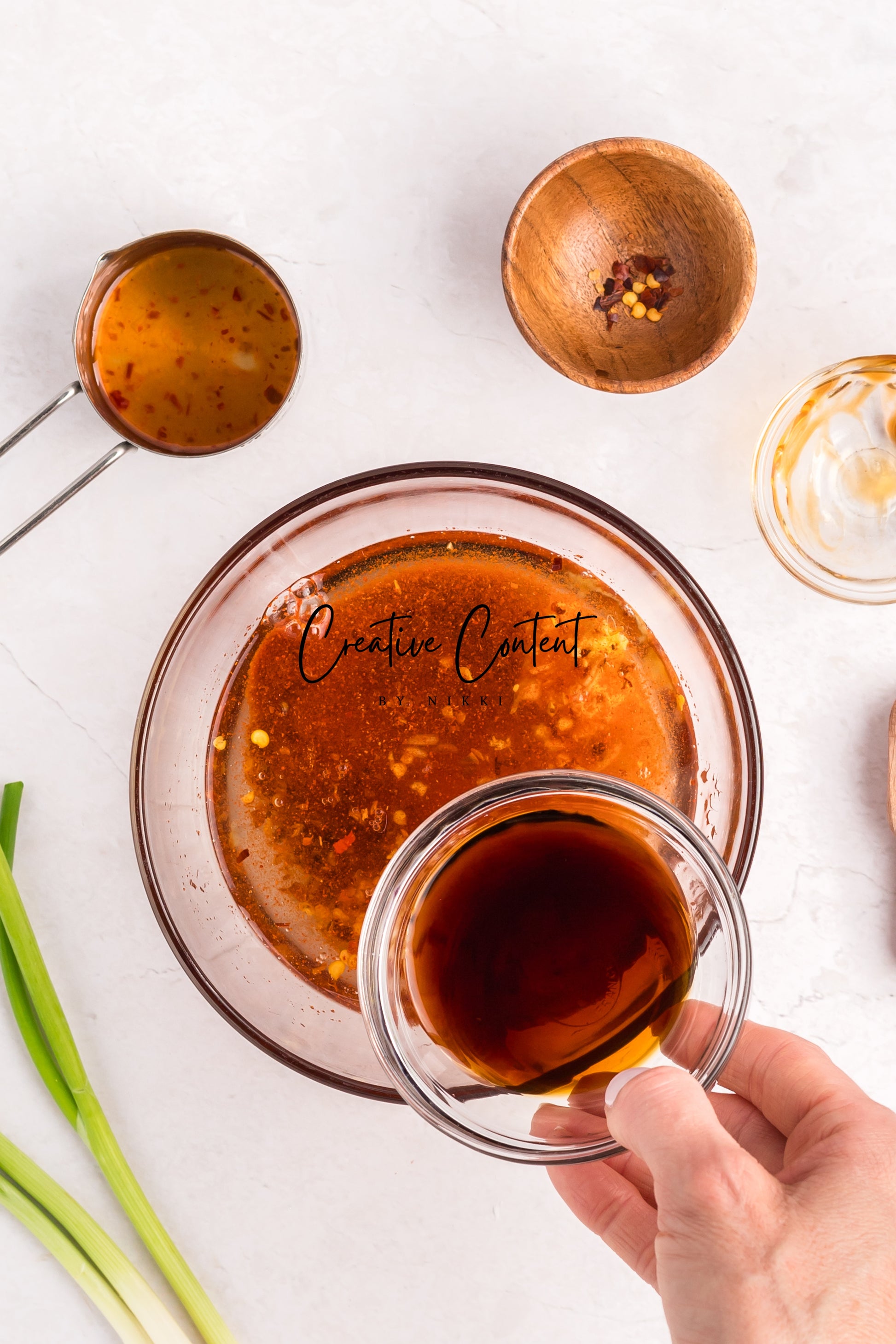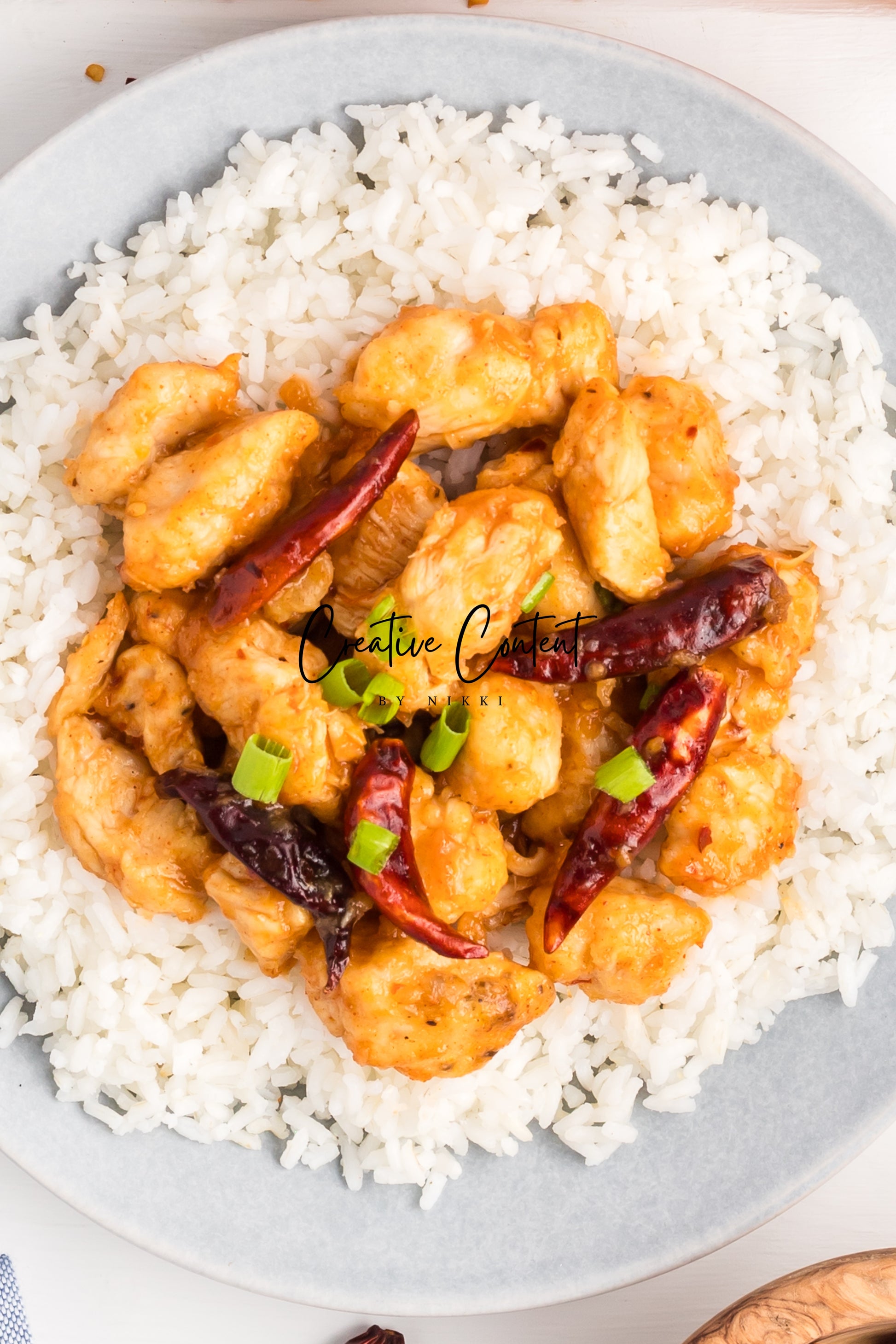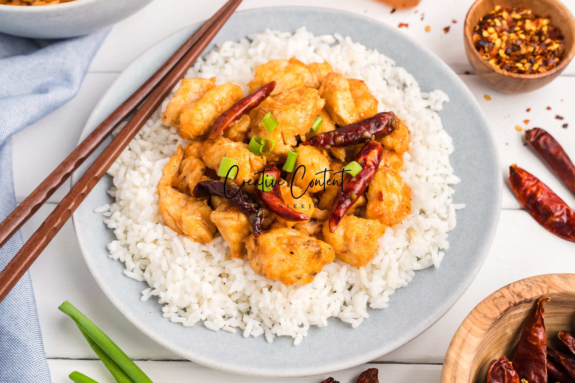 - Featured Ingredients; boneless skinless chicken, cornstarch, coarse kosher salt, black pepper, garlic powder, onion powder, avocado oil, honey, rice wine vinegar, garlic cloves, soy sauce, ginger, red chili flakes, oyster sauce, green onions, and red chiles.