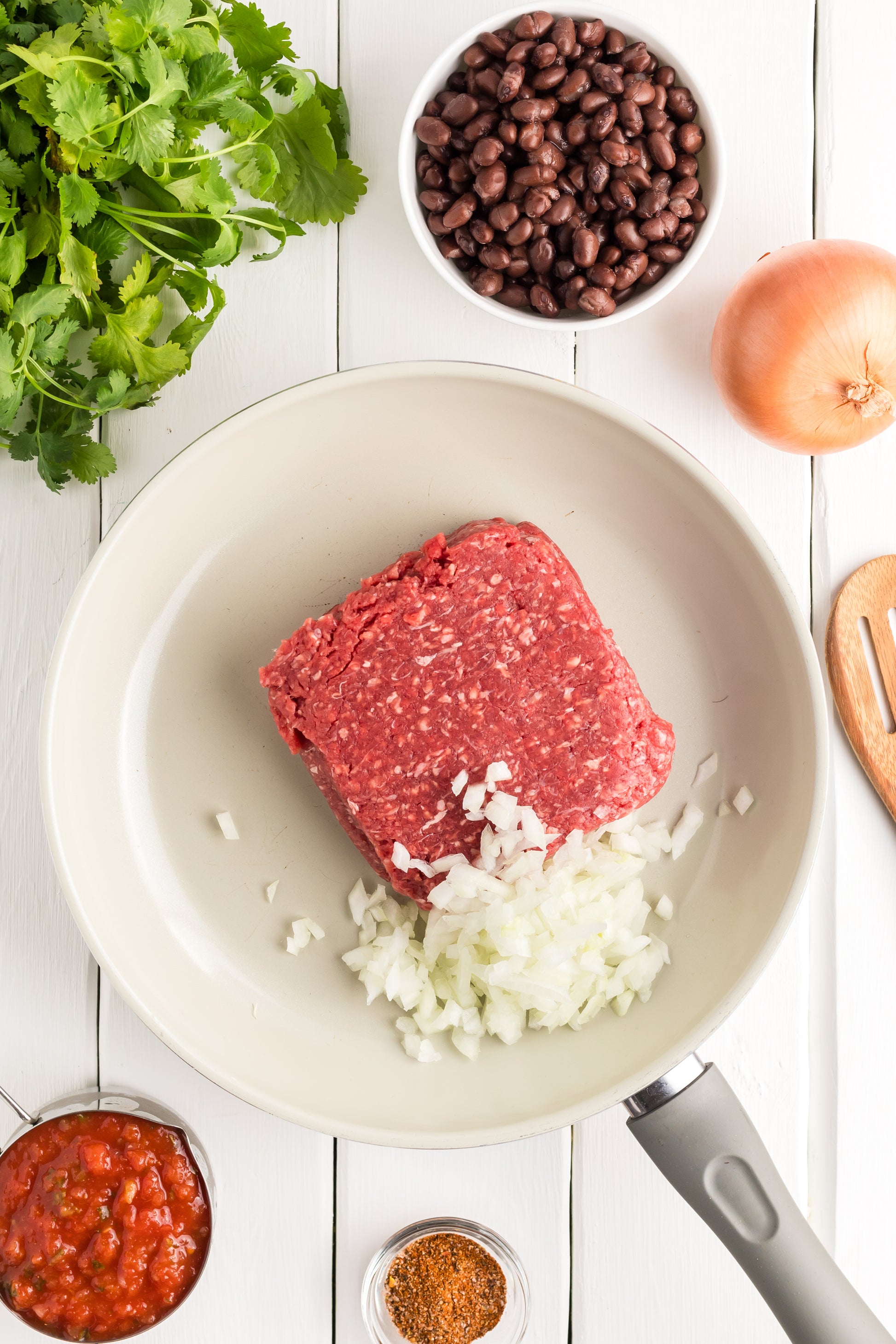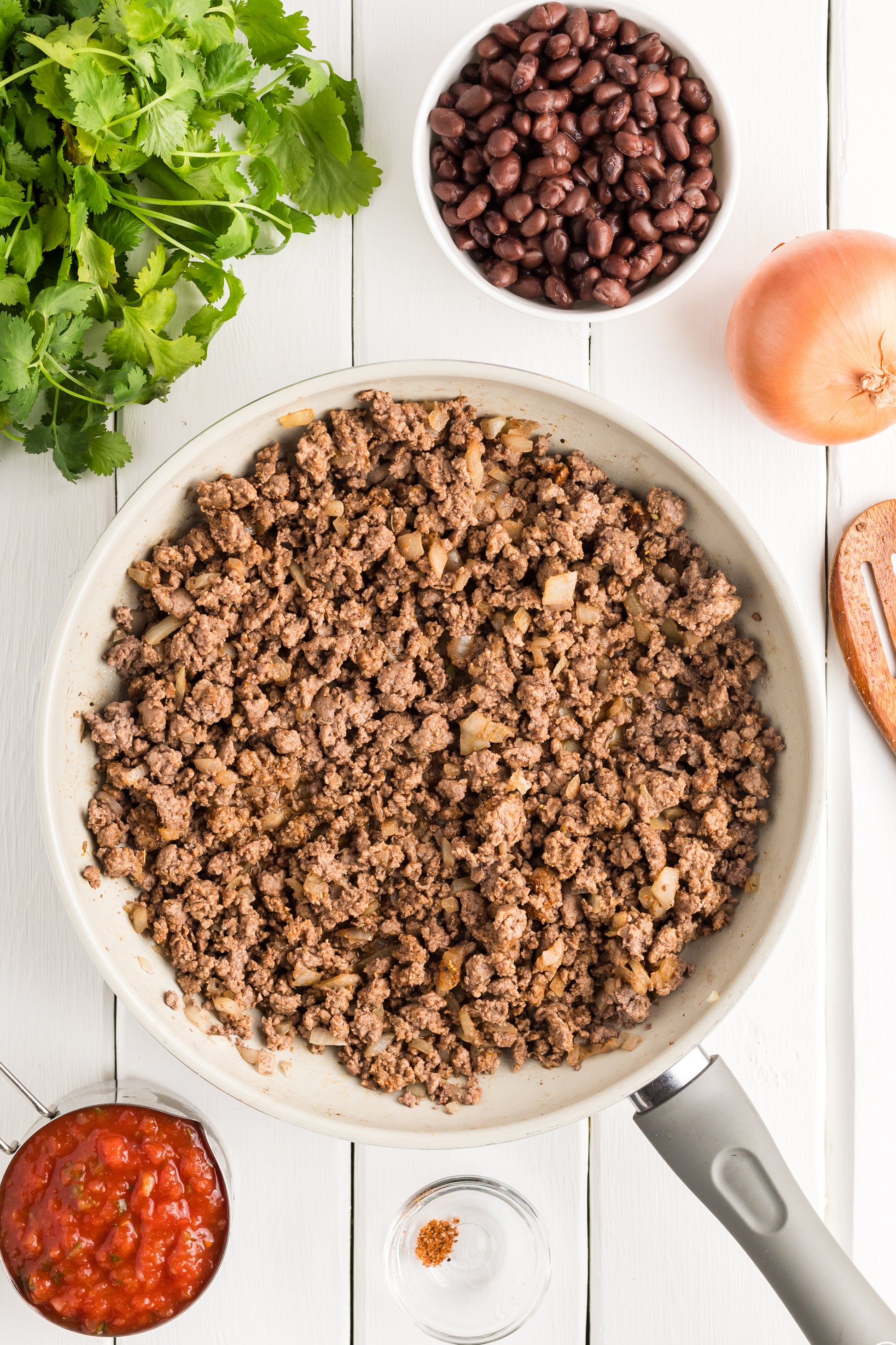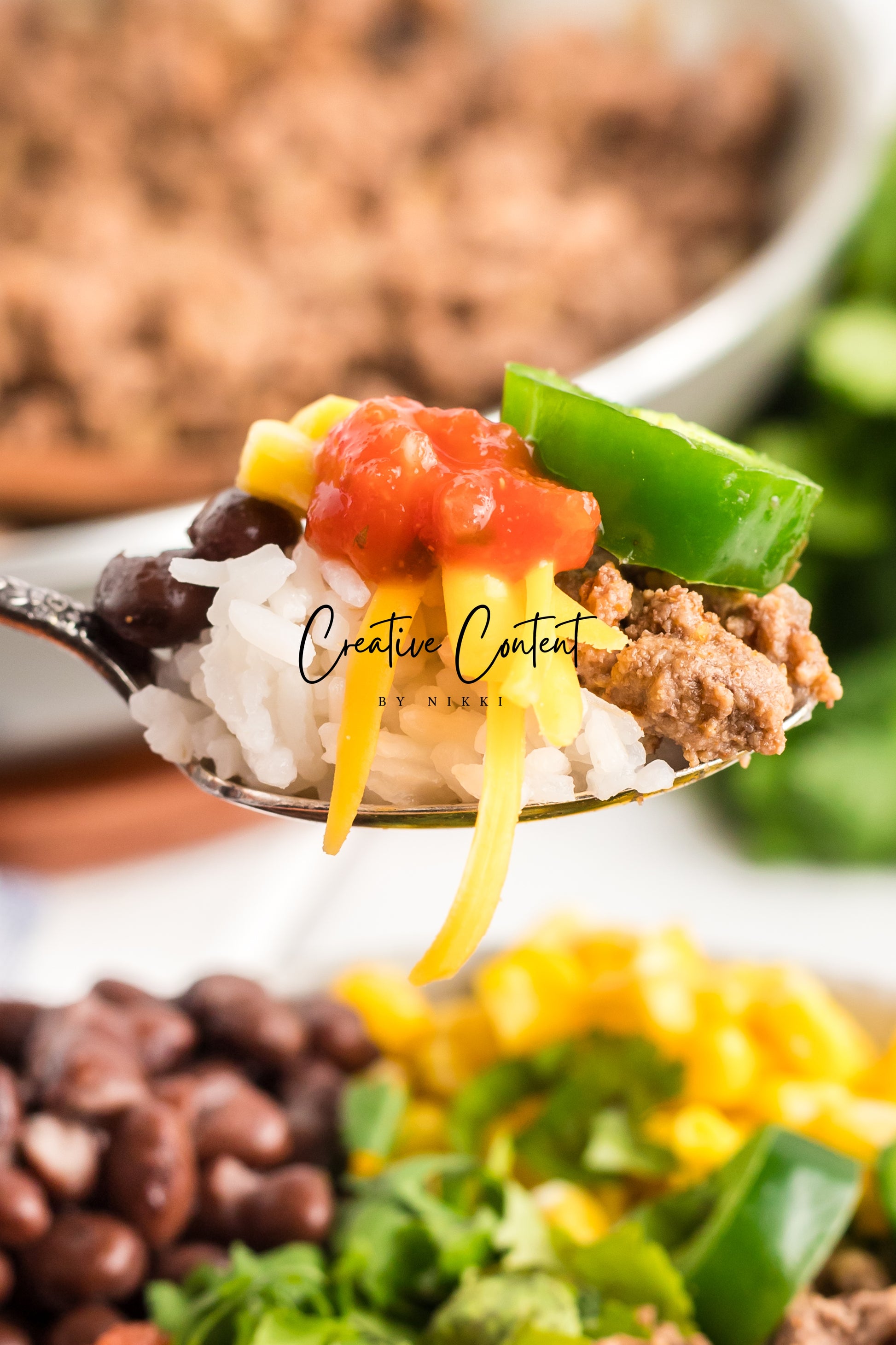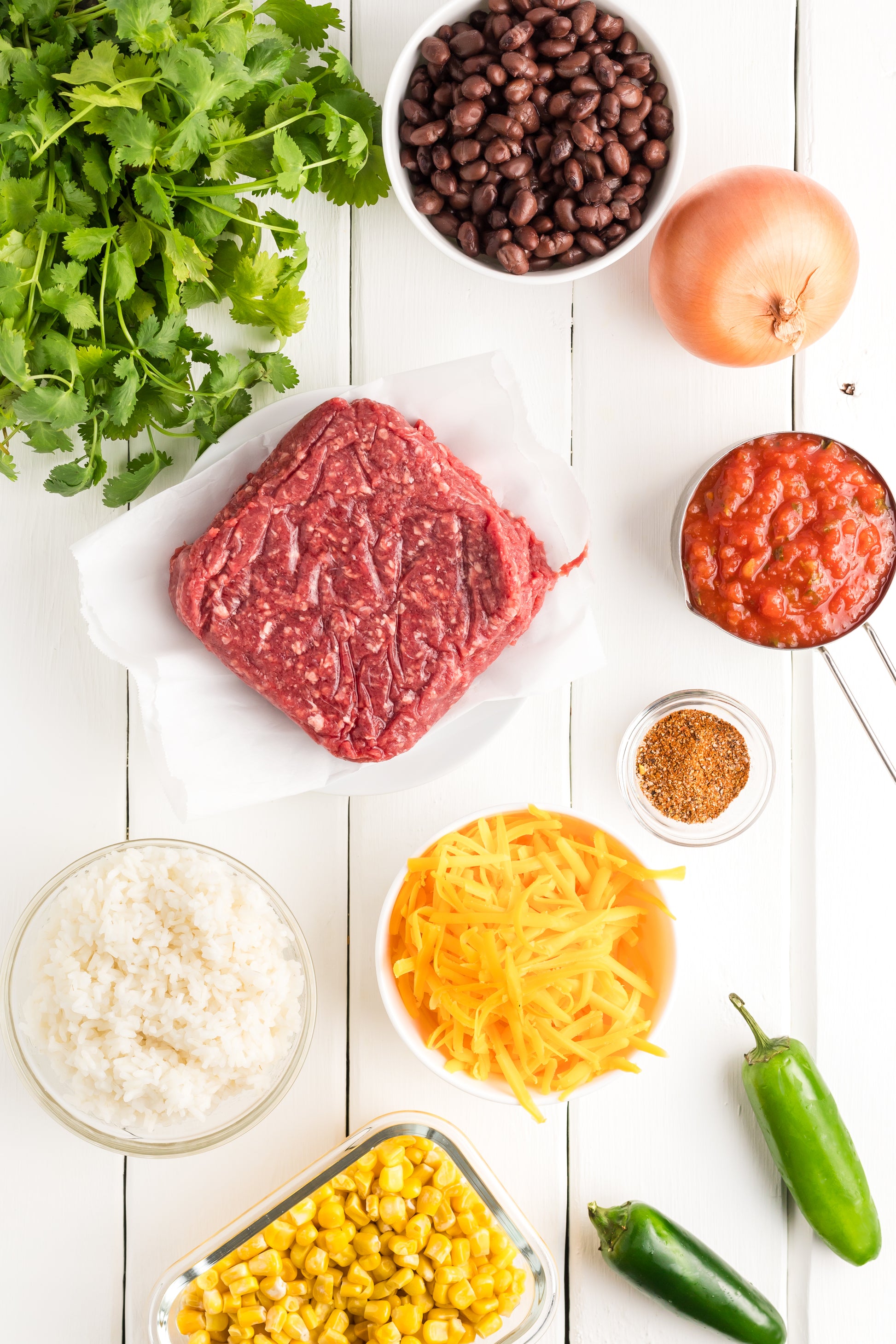 - Featured Ingredients; ground beef, yellow onion, taco seasoning, white rice, black beans, corn, cheddar cheese, pico de gallo, jalapeno, and cilantro.