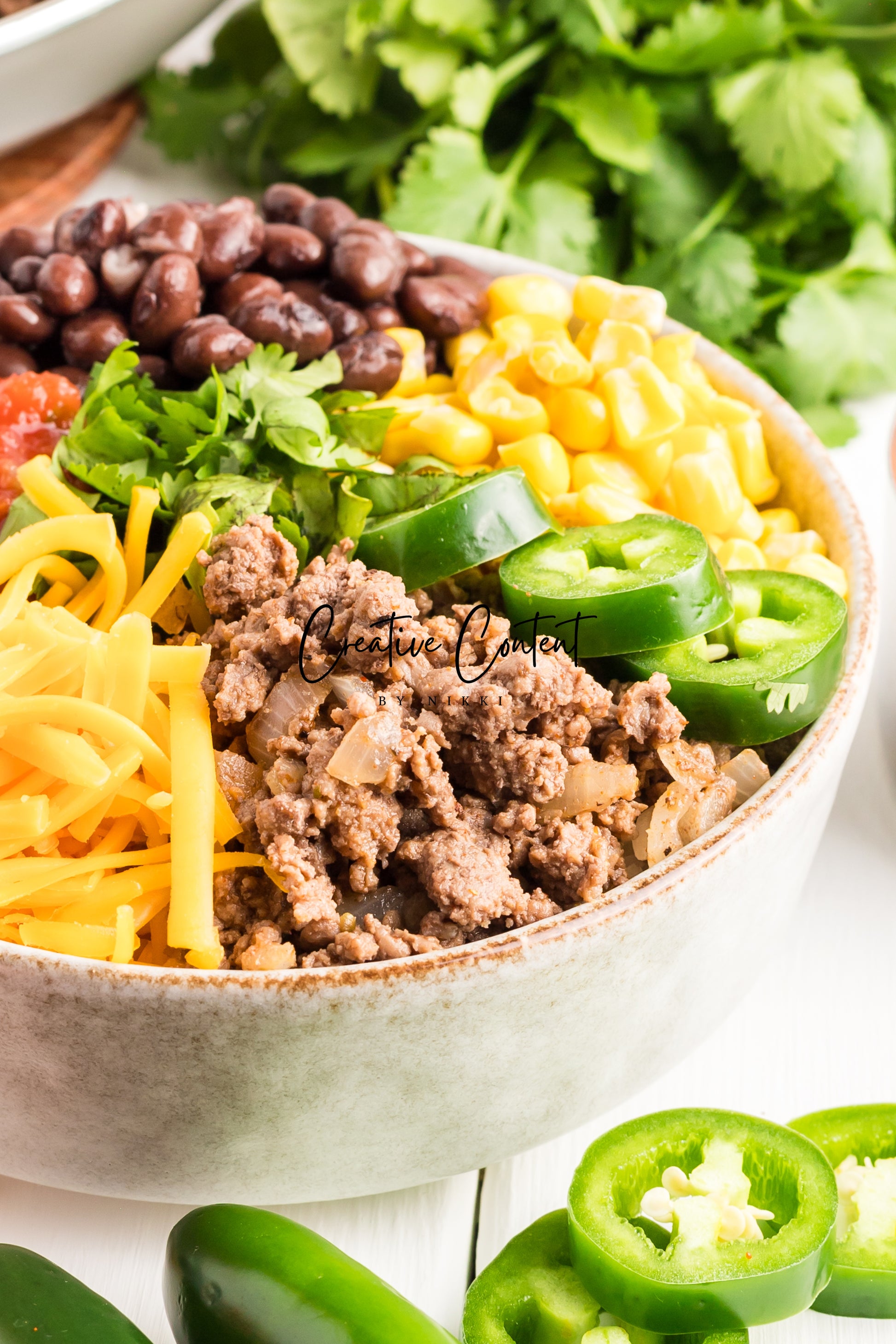 This taco bowl is a nice twist for Taco Tuesday. Everything goes in the bowl to make for all the flavors to come together. The white rice is layered with black beans, cheddar cheese, jalapeno, and cilantro.