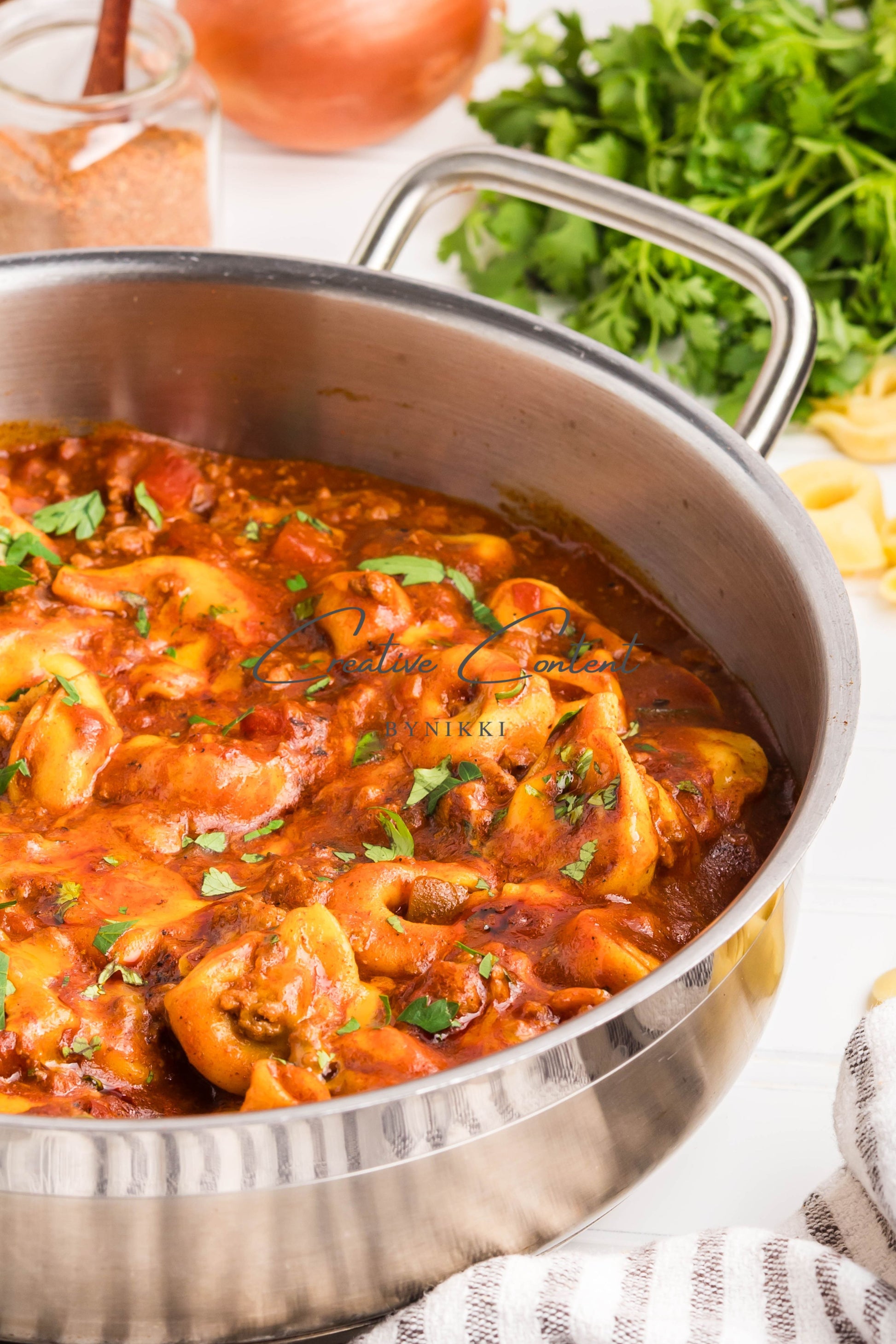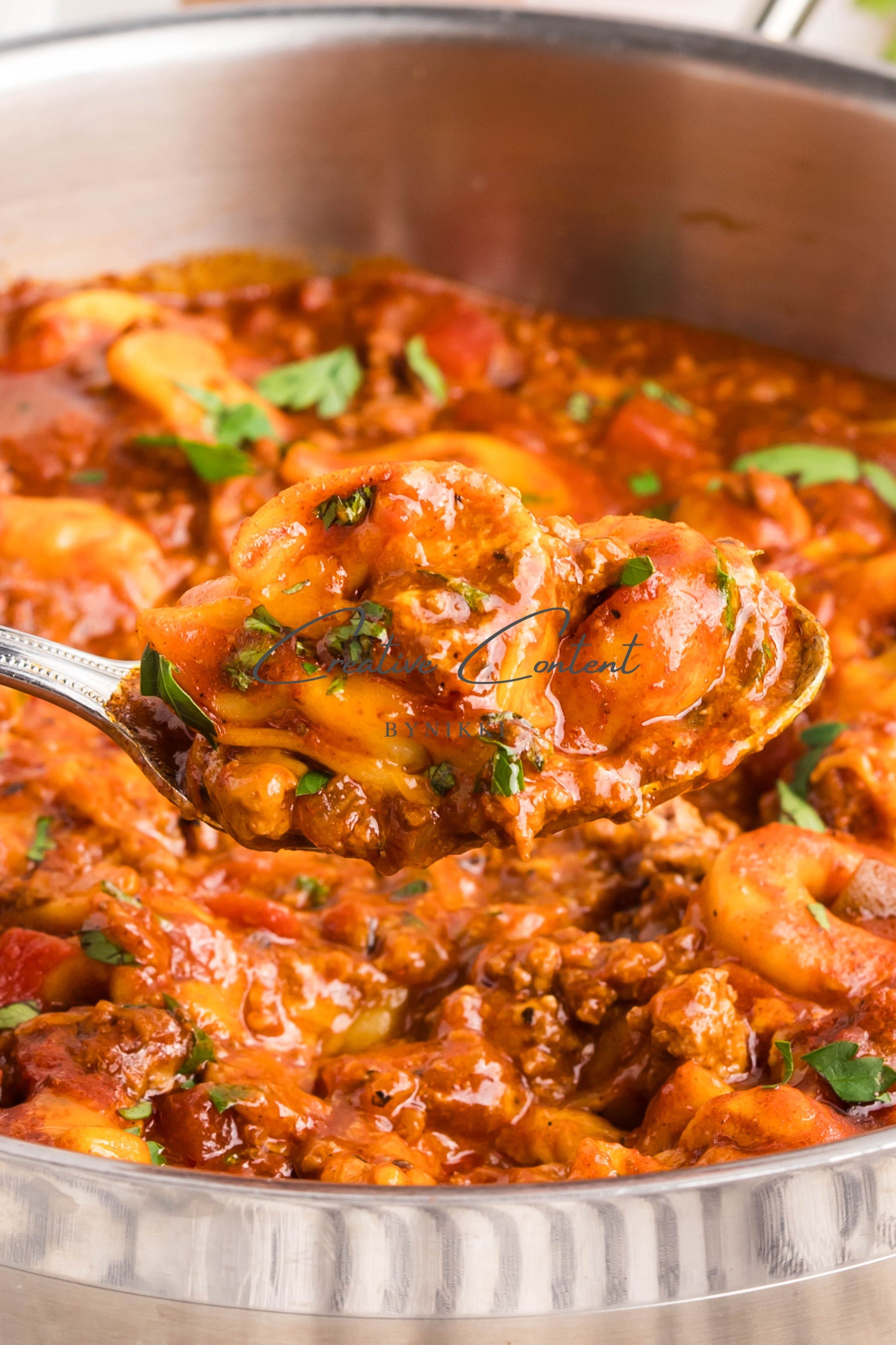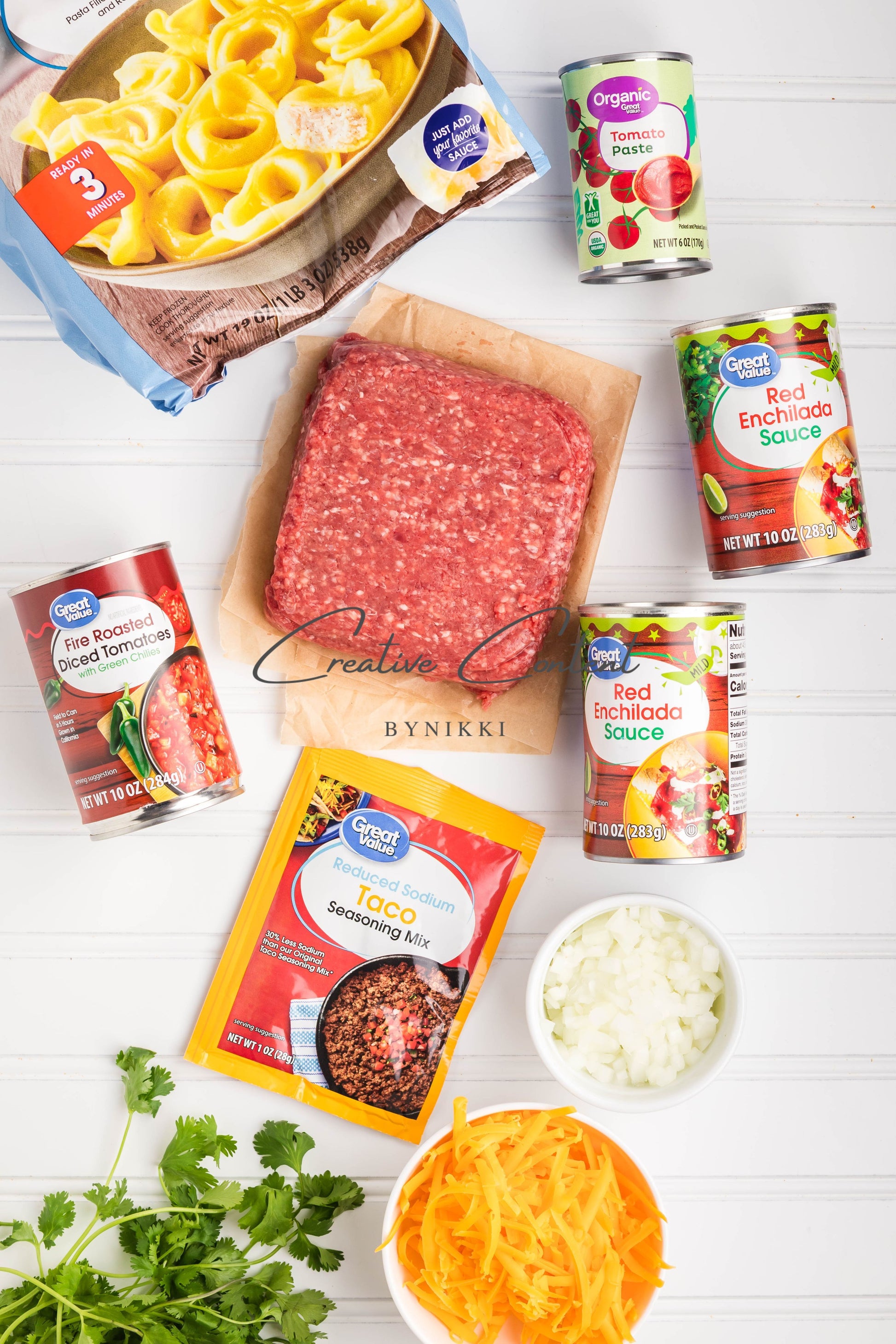 - Ingredients: Ground beef, yellow onion, tomato paste, low-sodium taco seasoning, red enchilada sauce, fire-roasted tomatoes, frozen cheese tortellini, shredded cheddar cheese, chopped cilantro