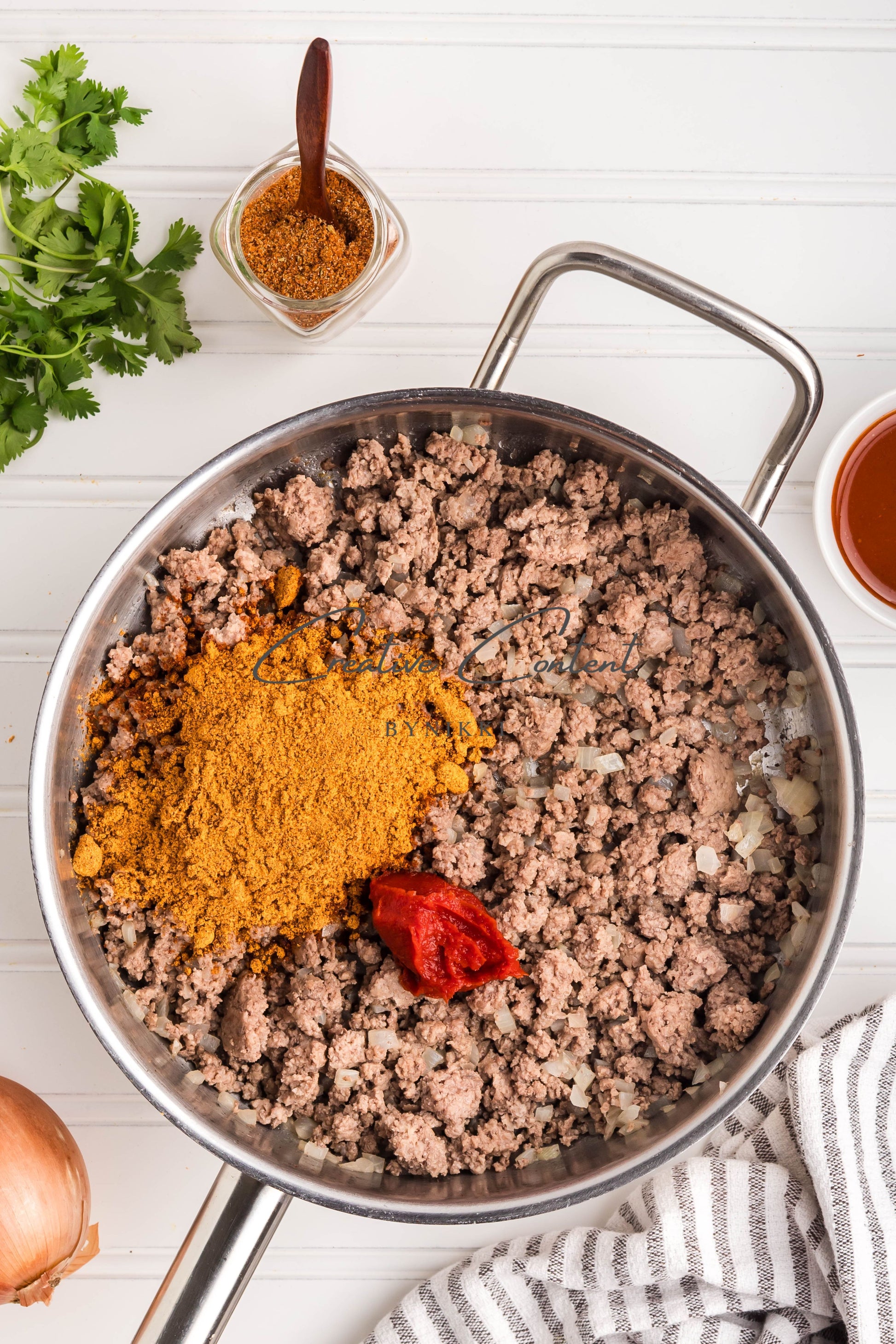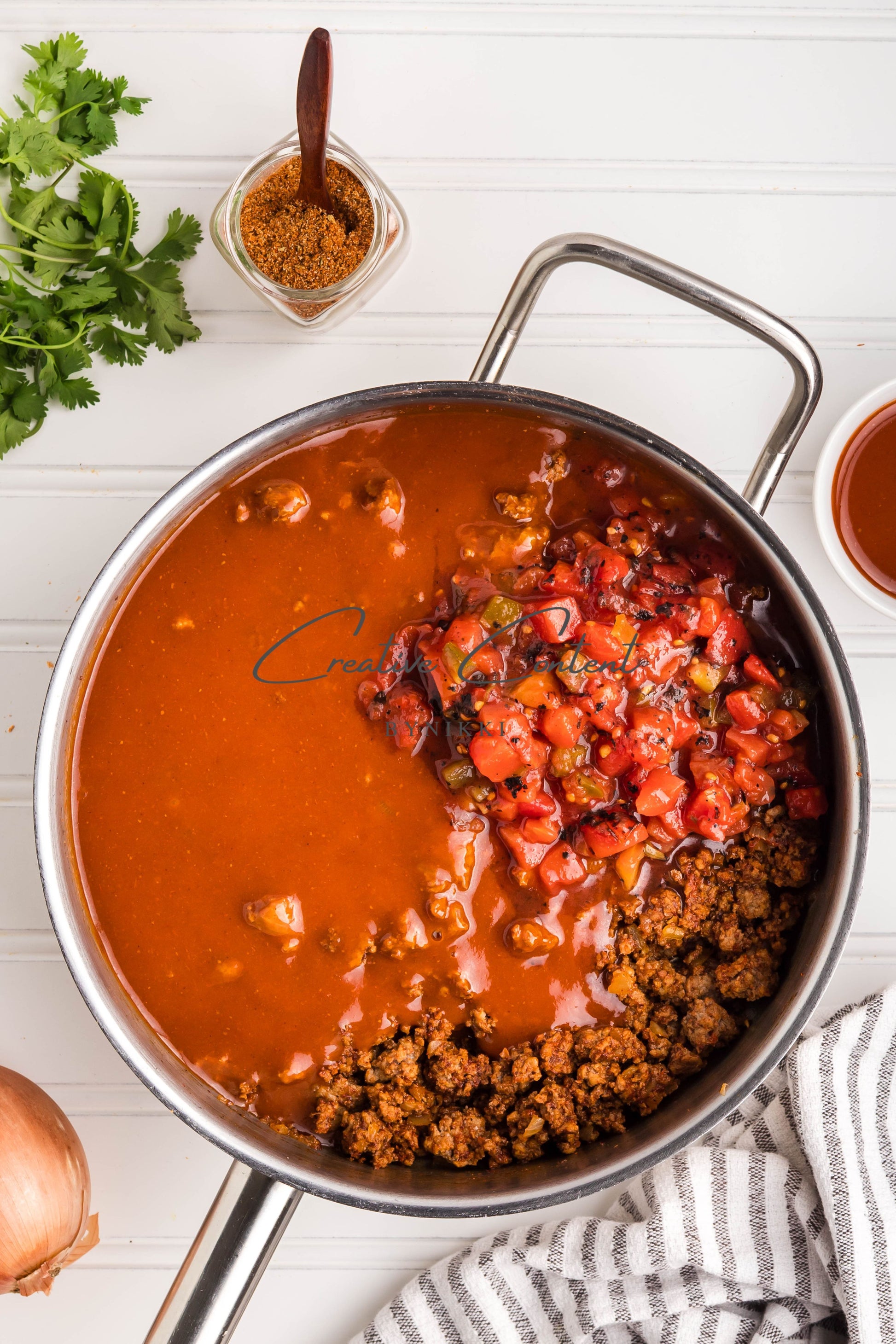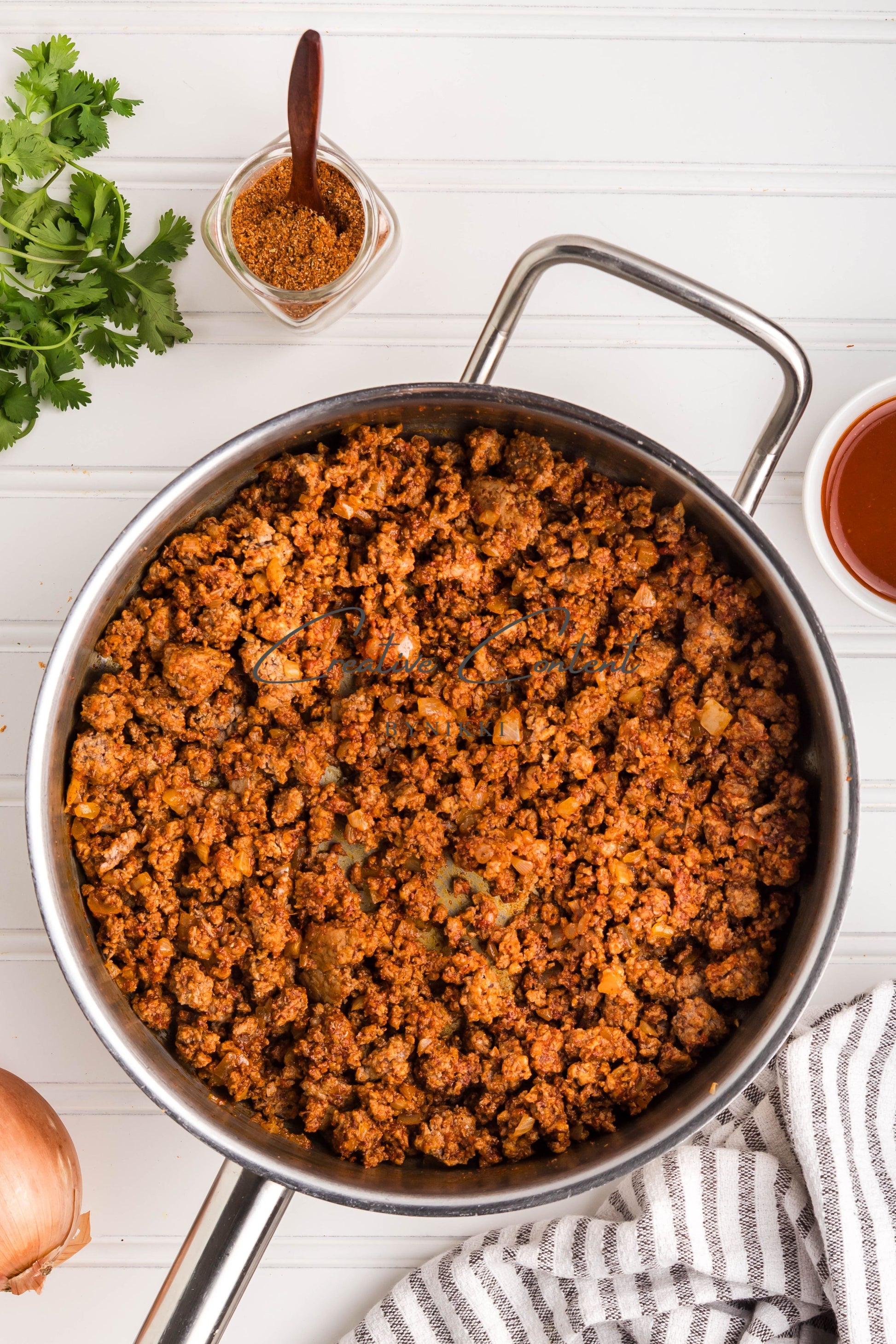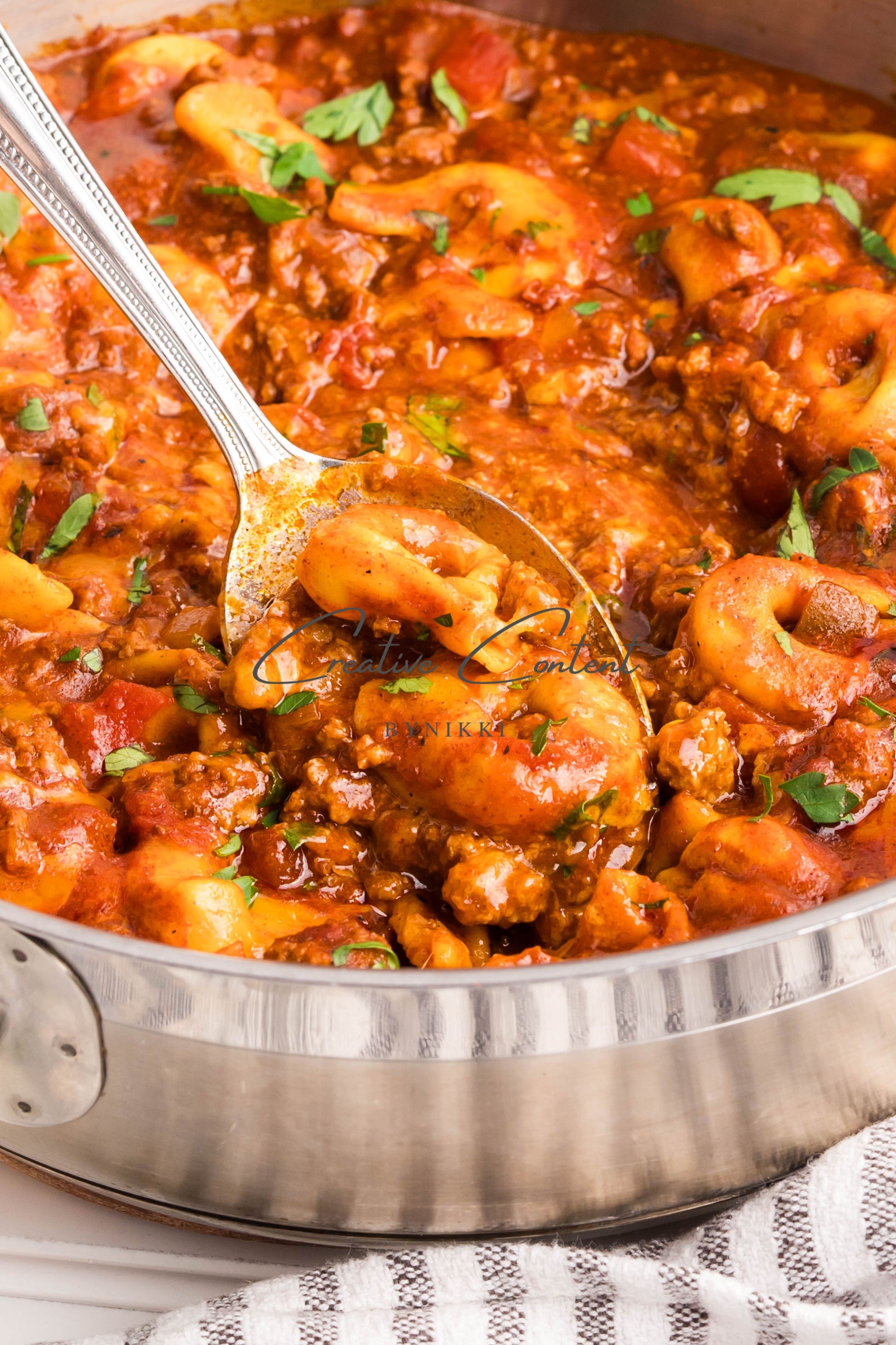 - Ingredients: Ground beef, yellow onion, tomato paste, low-sodium taco seasoning, red enchilada sauce, fire-roasted tomatoes, frozen cheese tortellini, shredded cheddar cheese, chopped cilantro