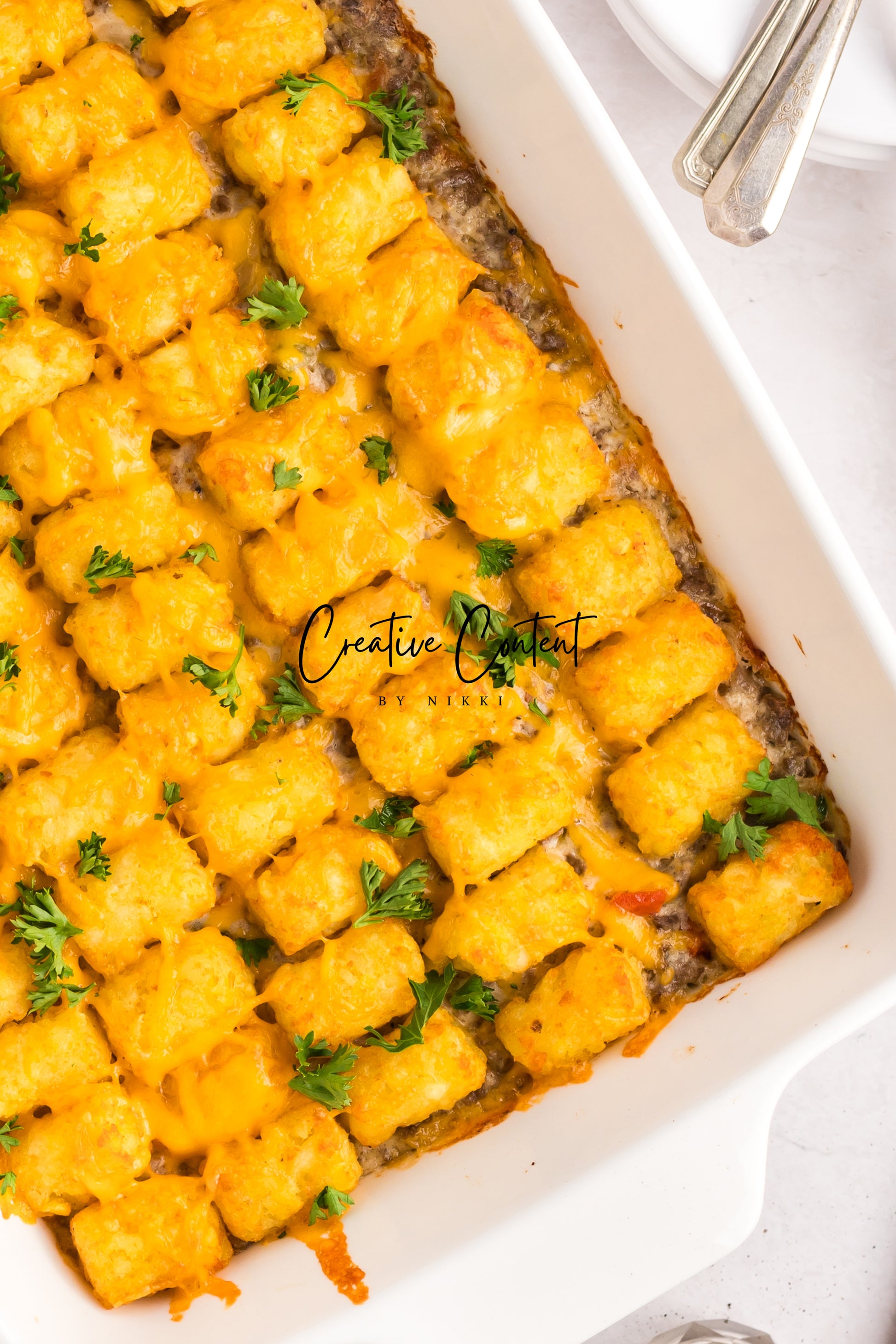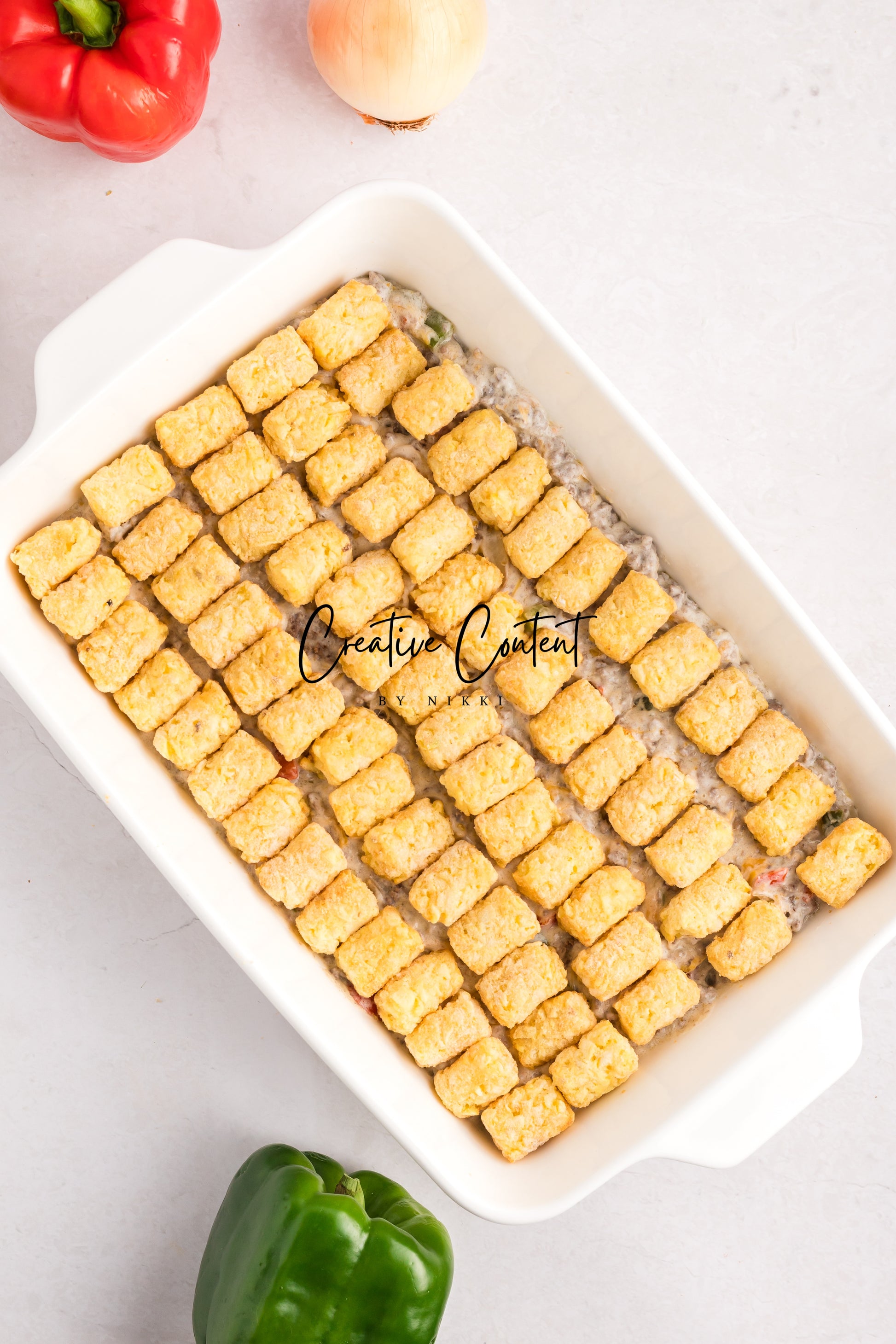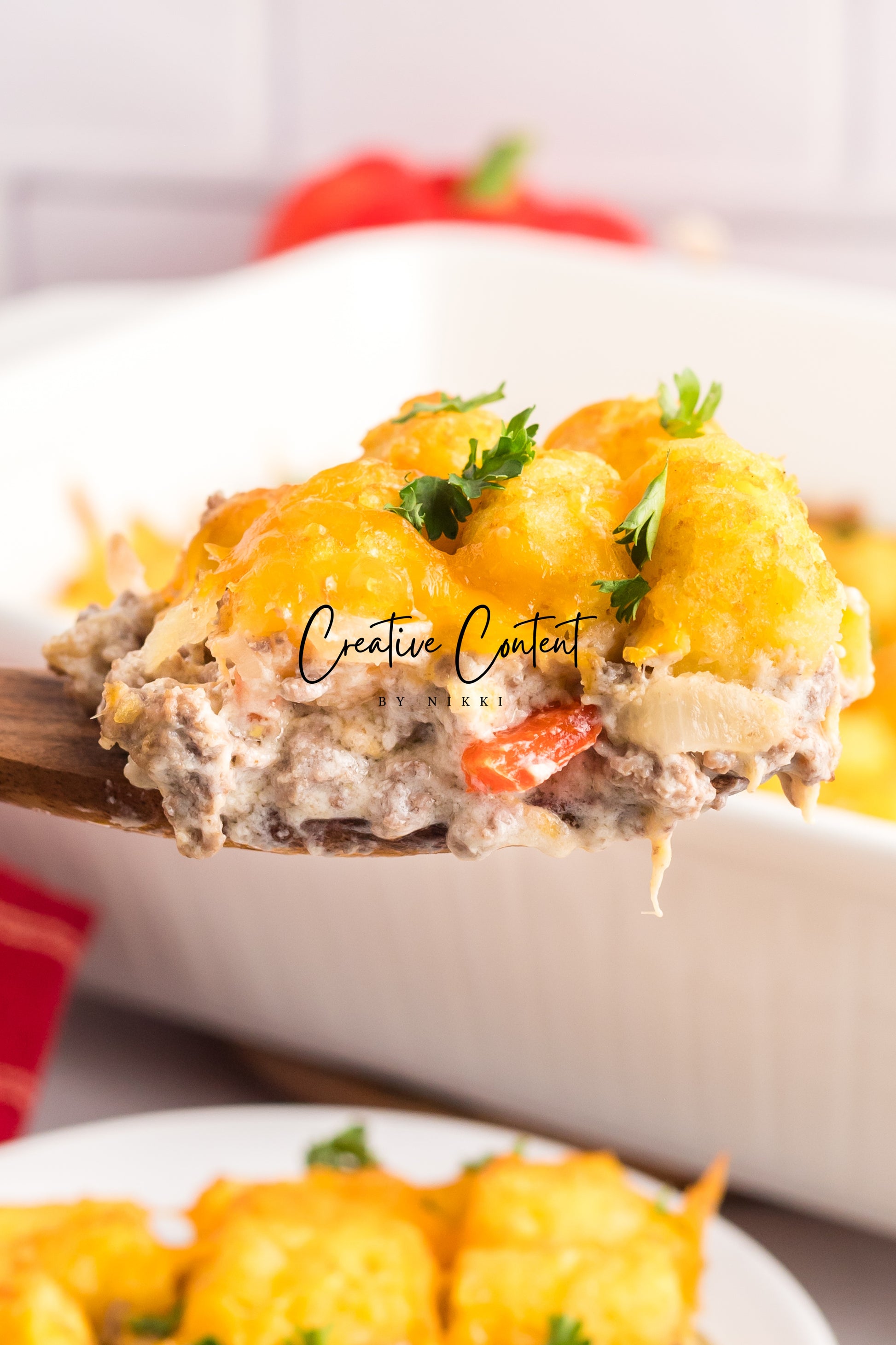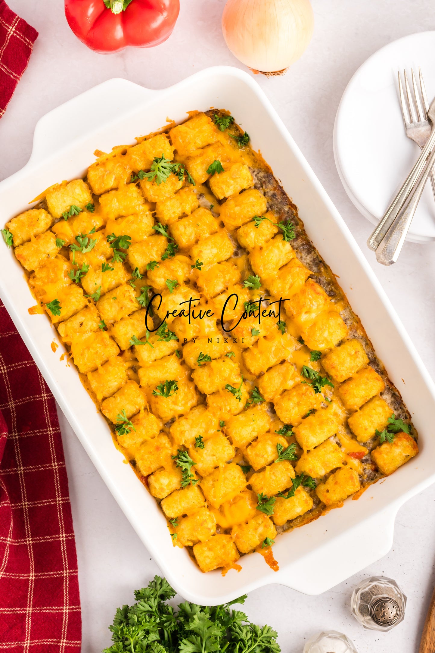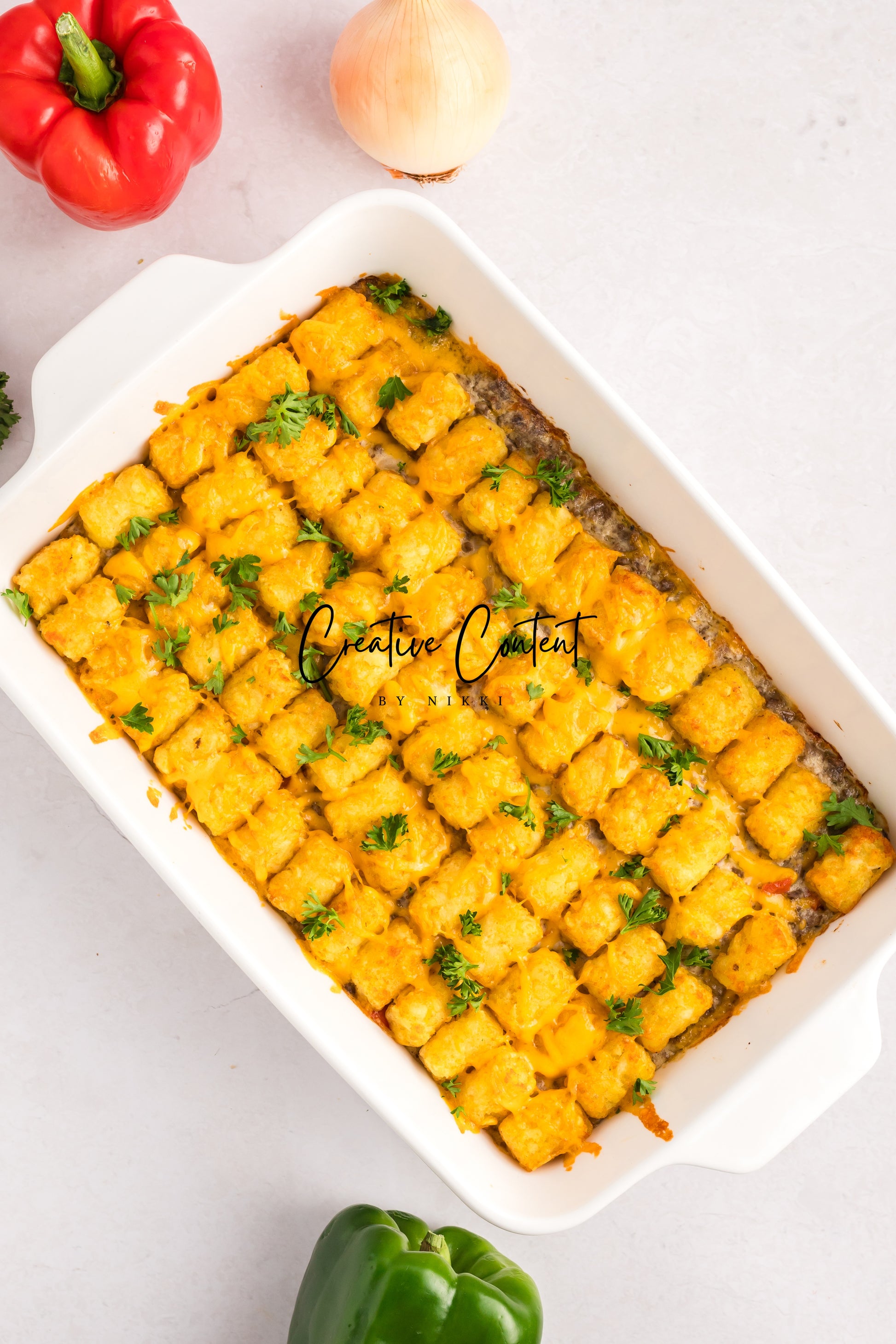 - Featured Ingredients; ground beef, bell peppers, yellow onion, garlic cloves, seasonings, butter, flour, milk, sour cream, cheddar cheese, tater tots, and parsley.