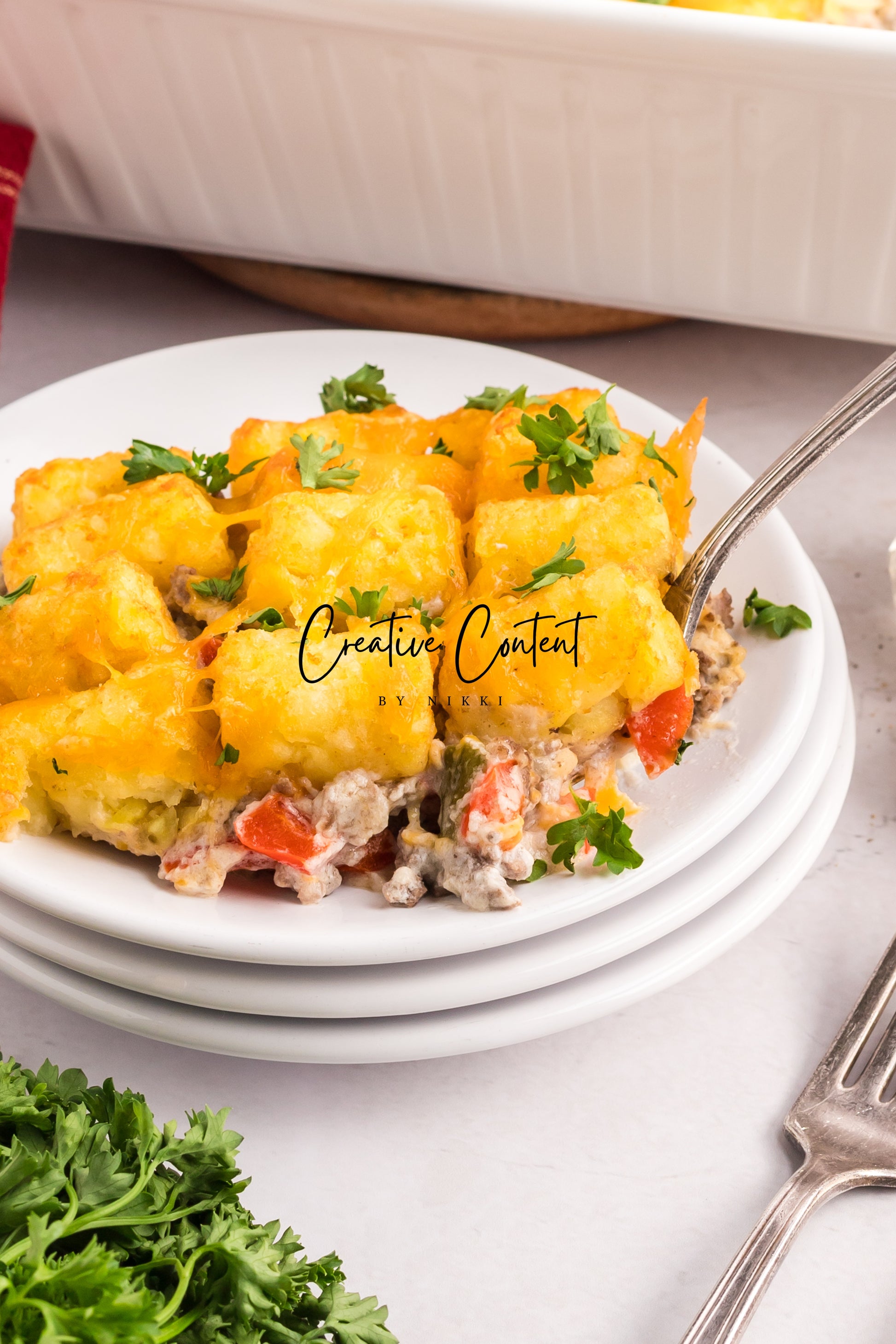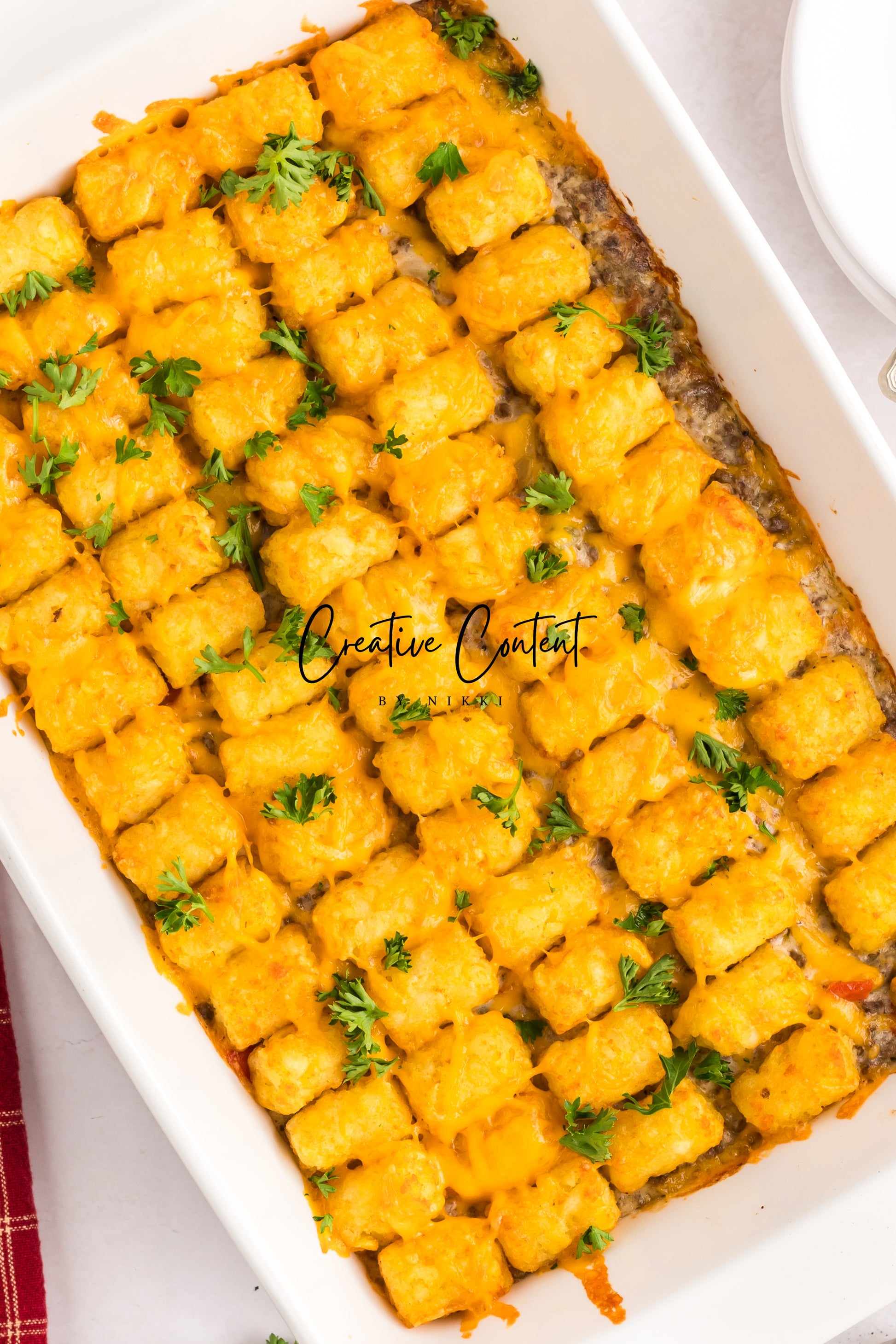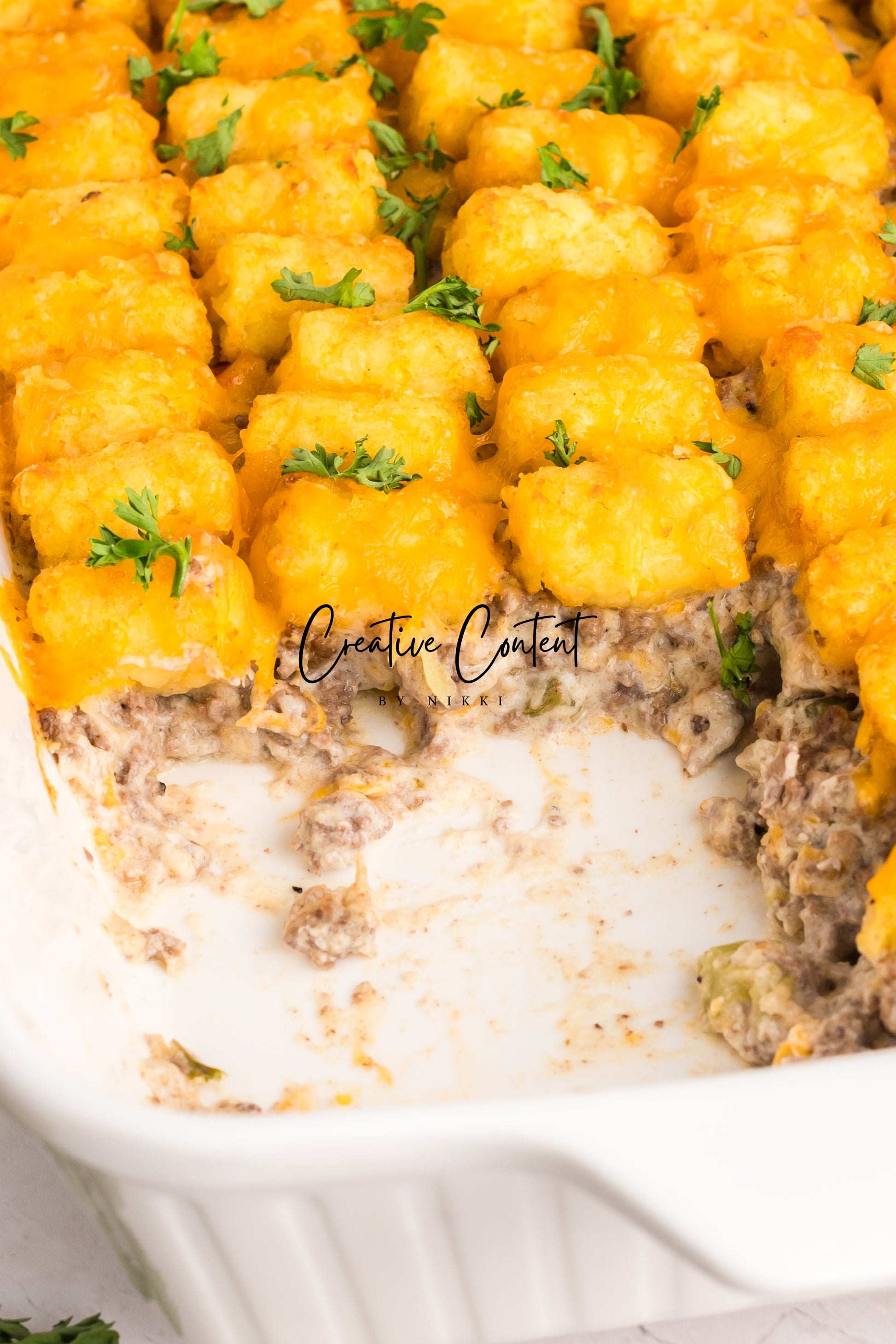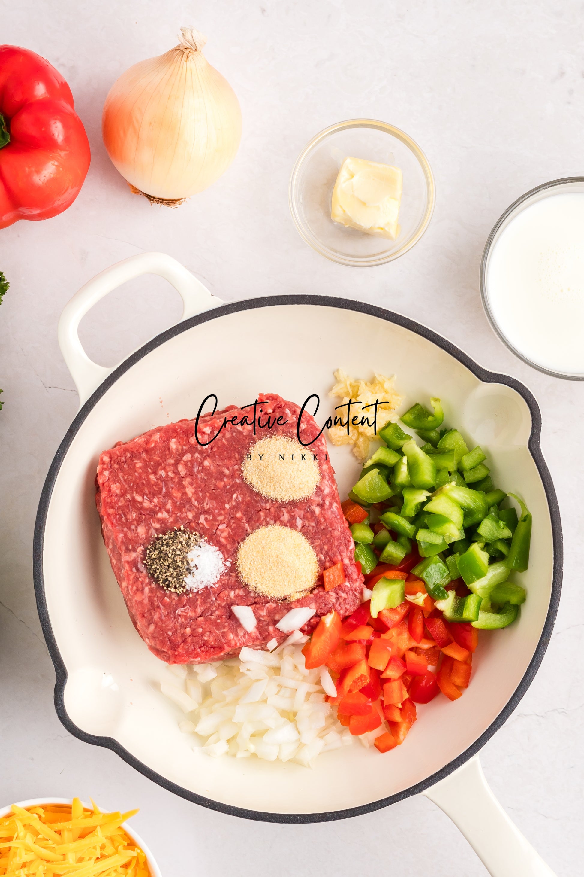 - Featured Ingredients; ground beef, bell peppers, yellow onion, garlic cloves, seasonings, butter, flour, milk, sour cream, cheddar cheese, tater tots, and parsley.