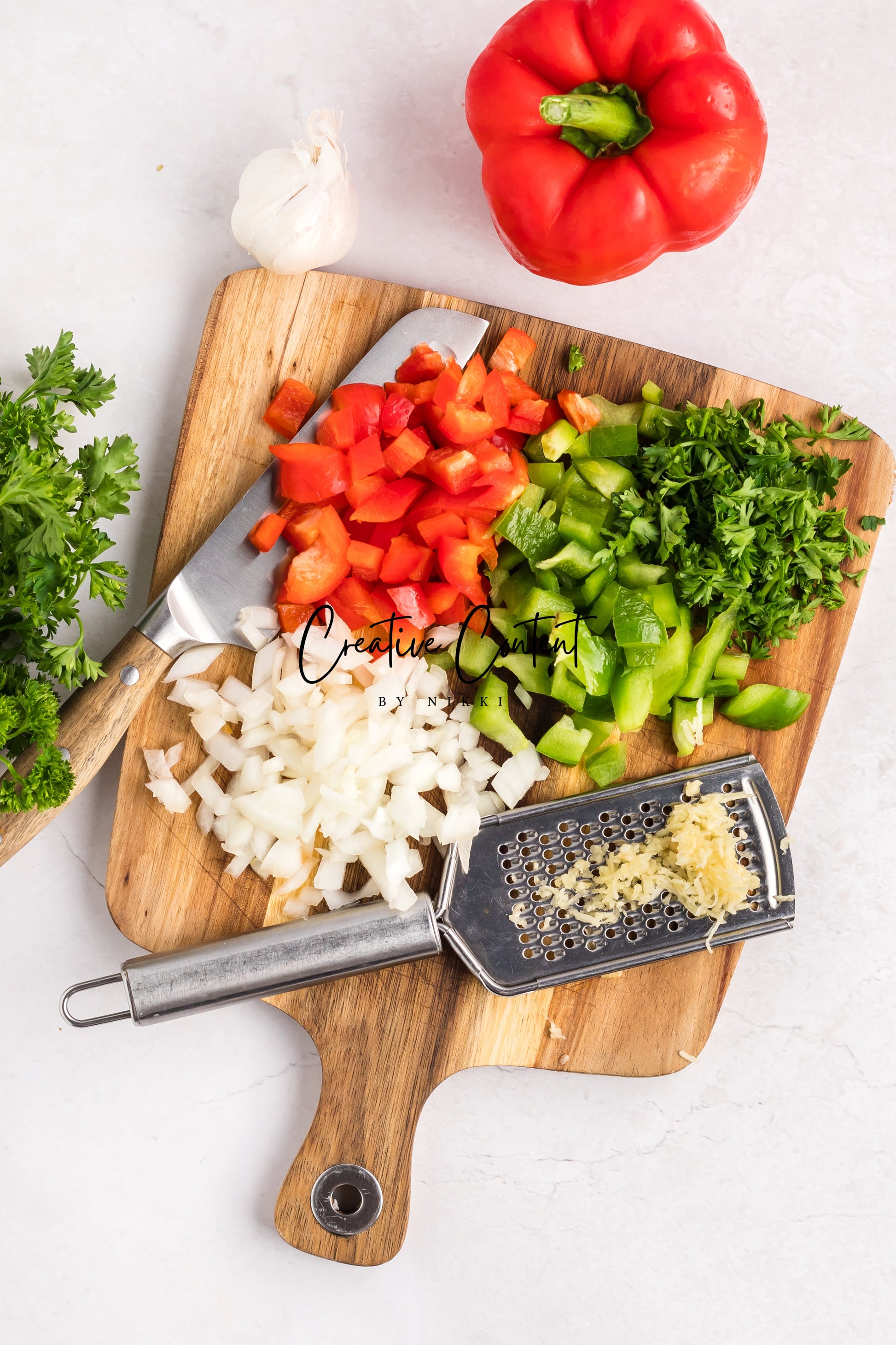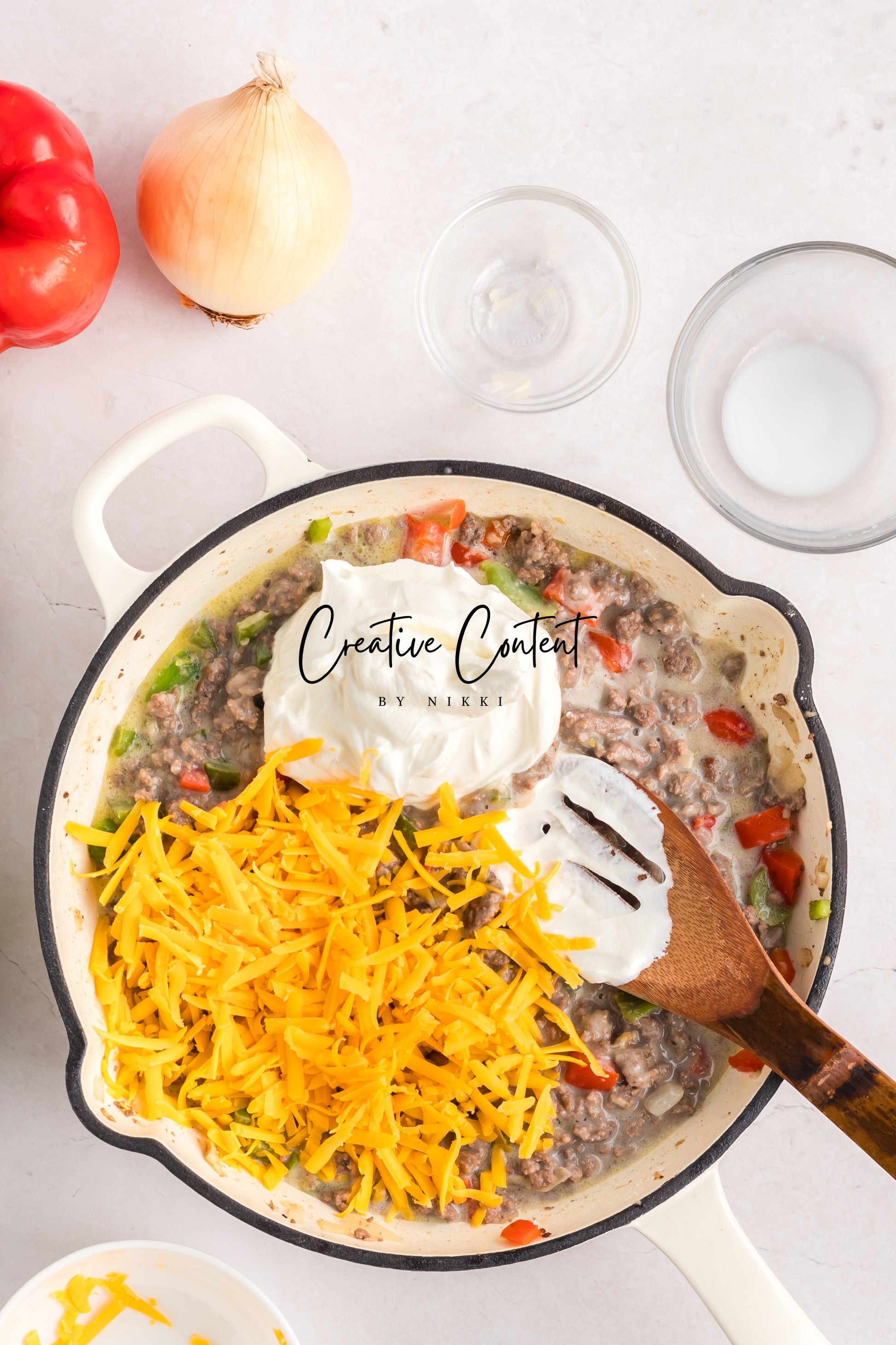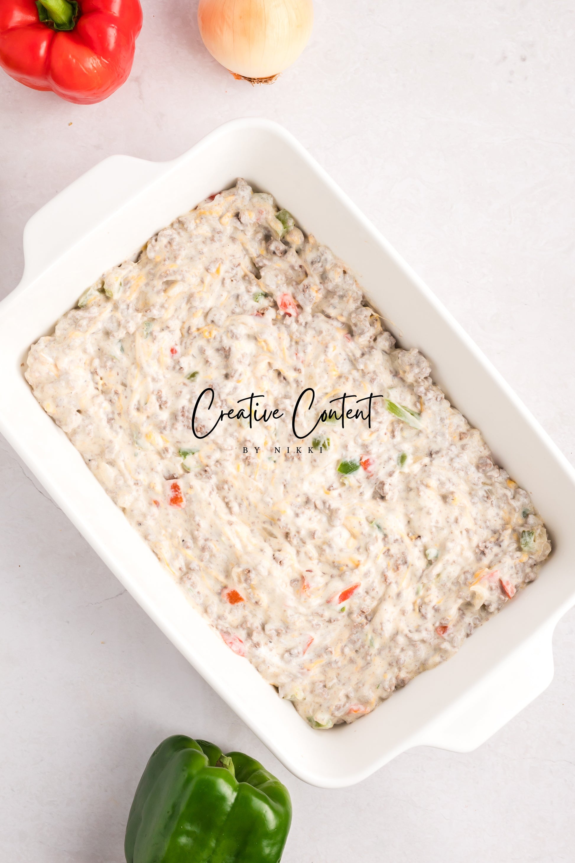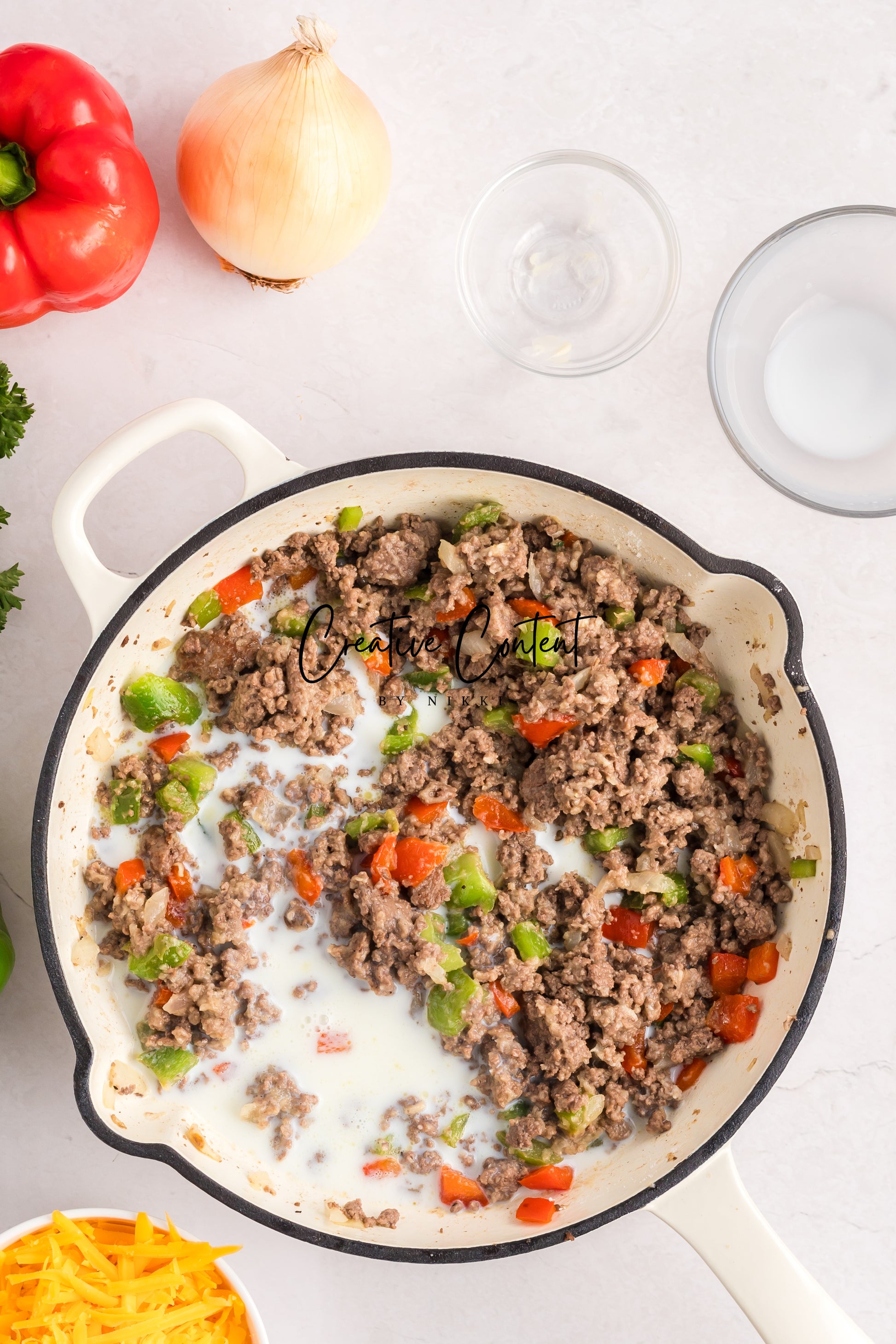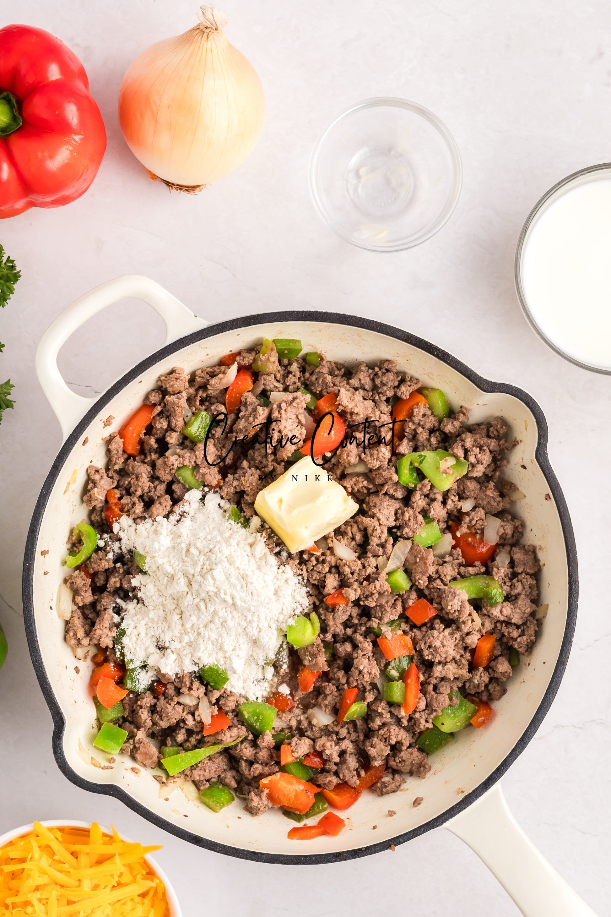 - Featured Ingredients; ground beef, bell peppers, yellow onion, garlic cloves, seasonings, butter, flour, milk, sour cream, cheddar cheese, tater tots, and parsley.