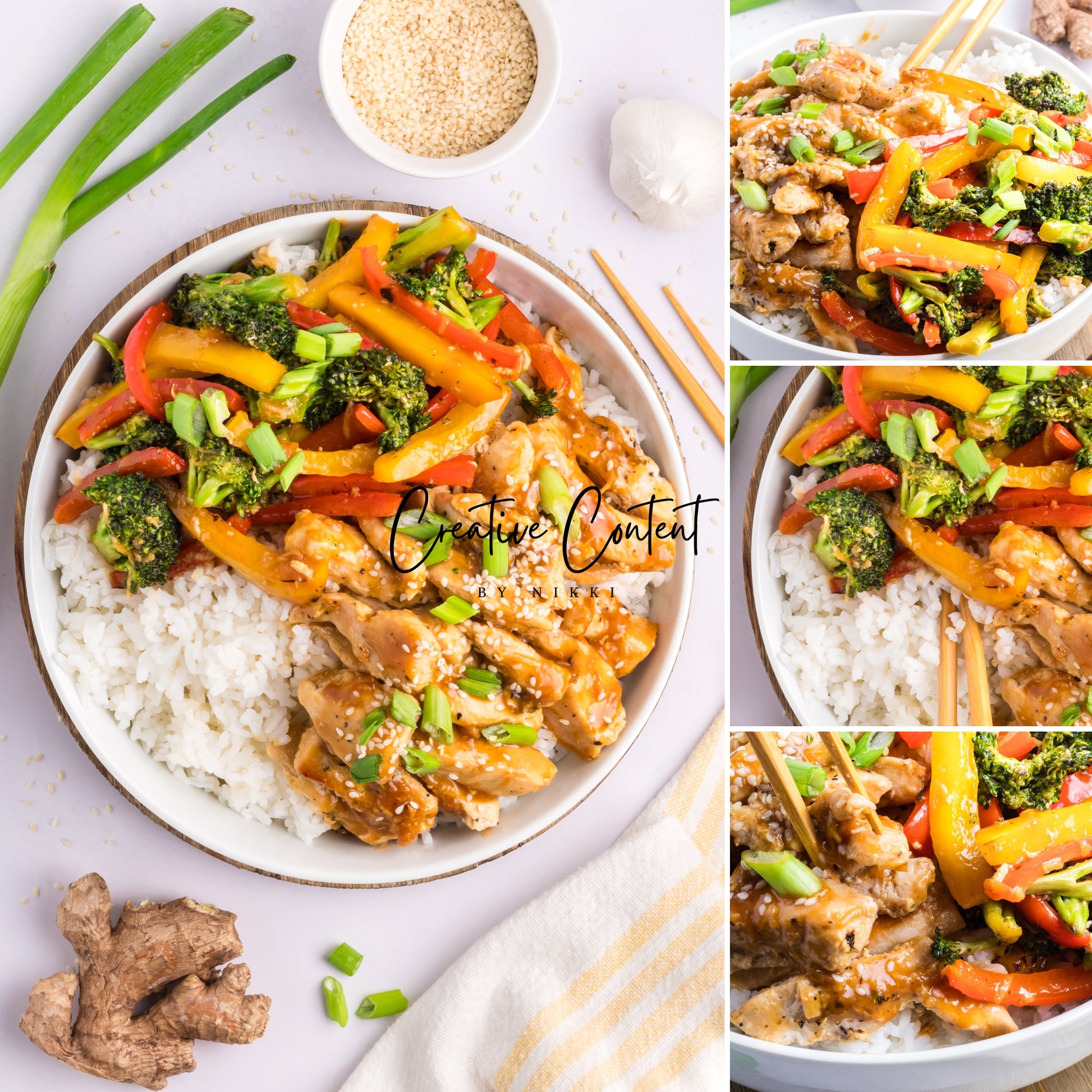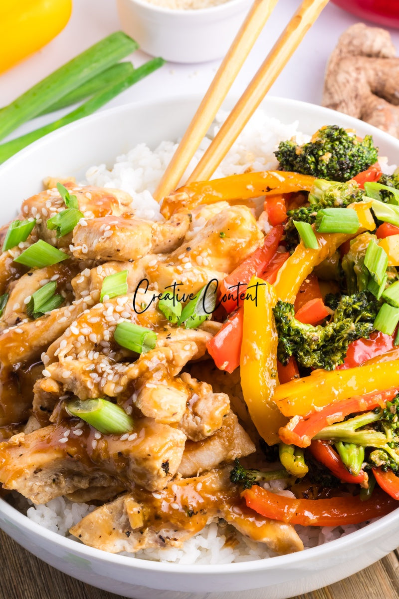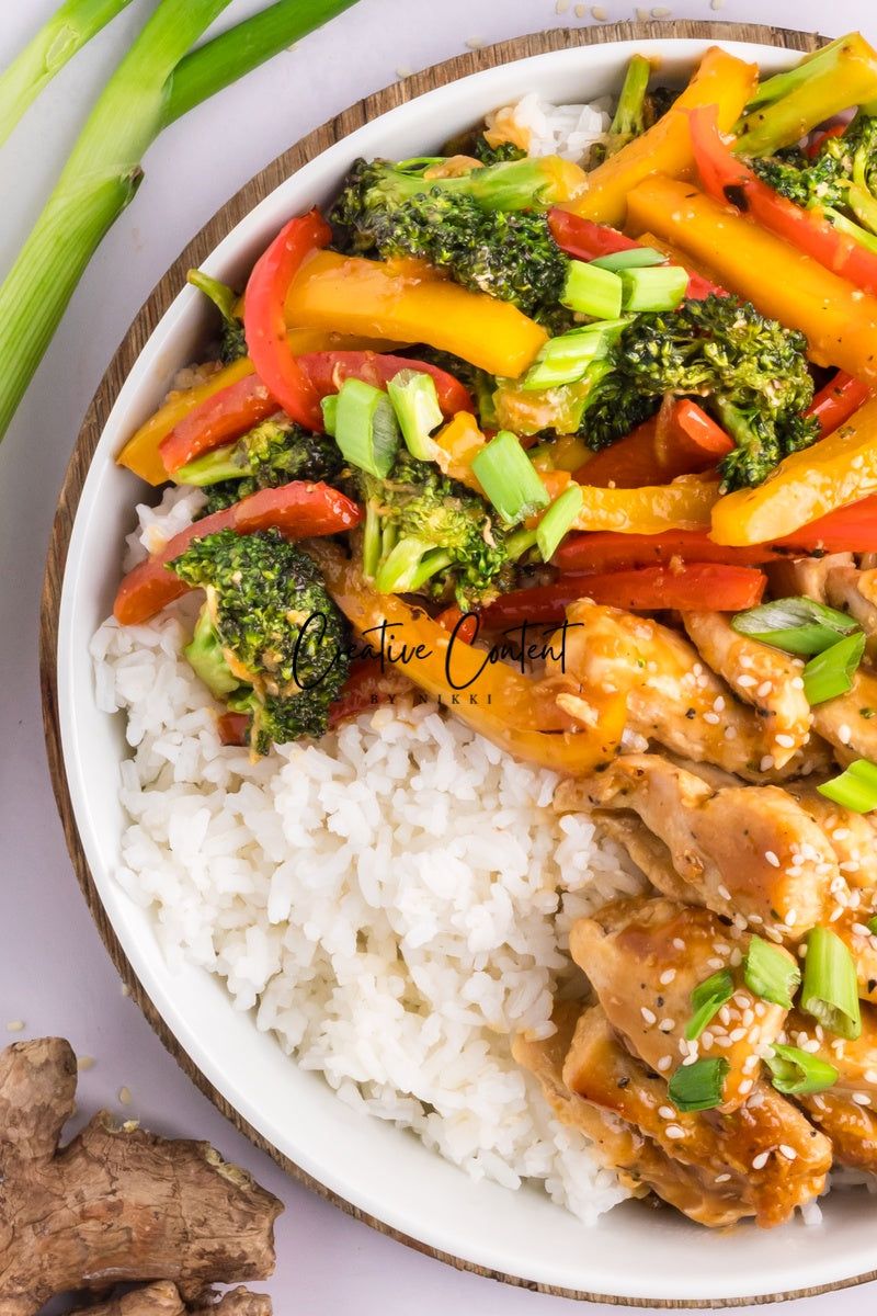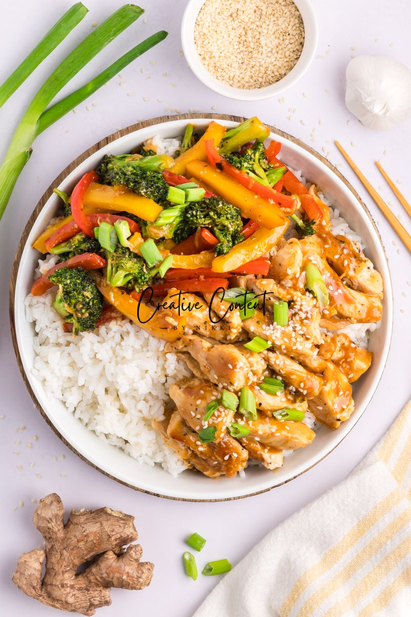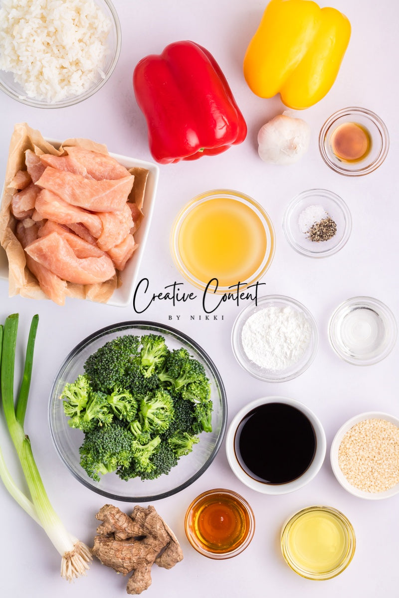 - Ingredients needed; rice, chicken stock, cornstarch, chicken breast or tenderloin, avocado oil, coarse kosher salt, black pepper, broccoli florets, red bell pepper, yellow bell pepper, garlic cloves, ginger, low-sodium soy sauce, honey, rice vinegar, toasted sesame oil, green onions, and sesame seeds.