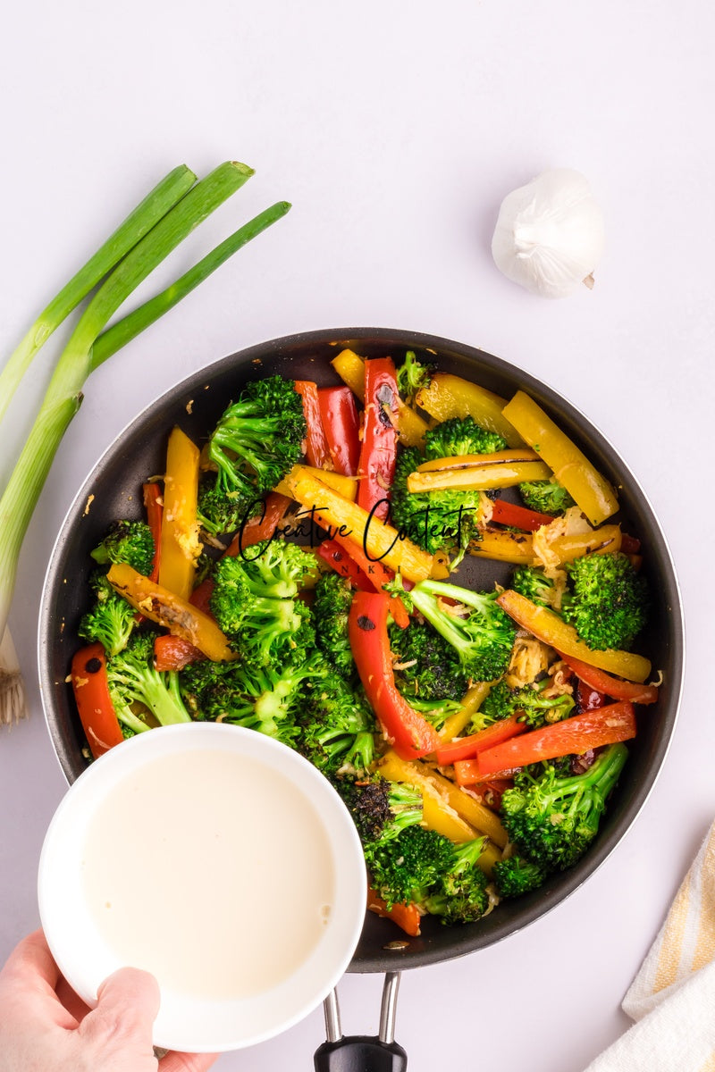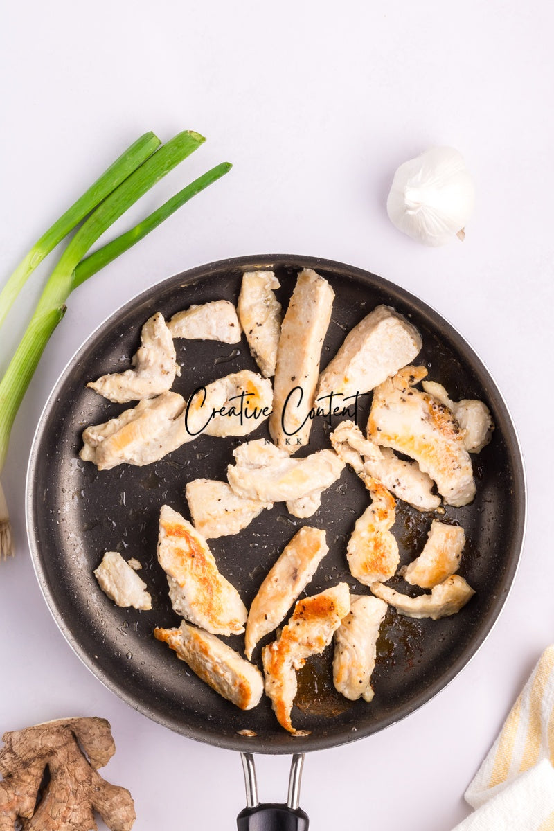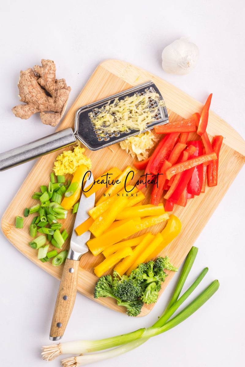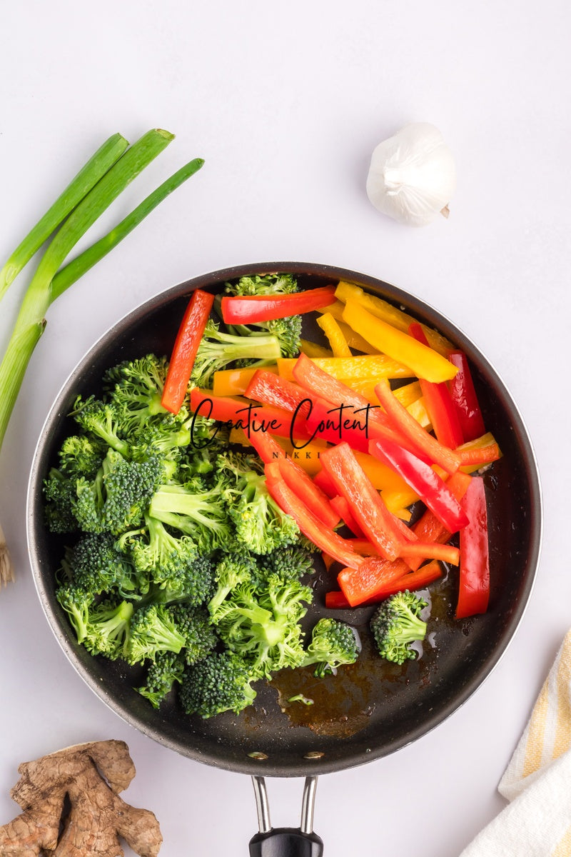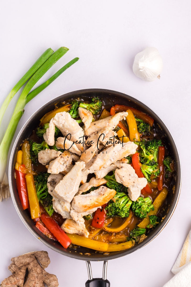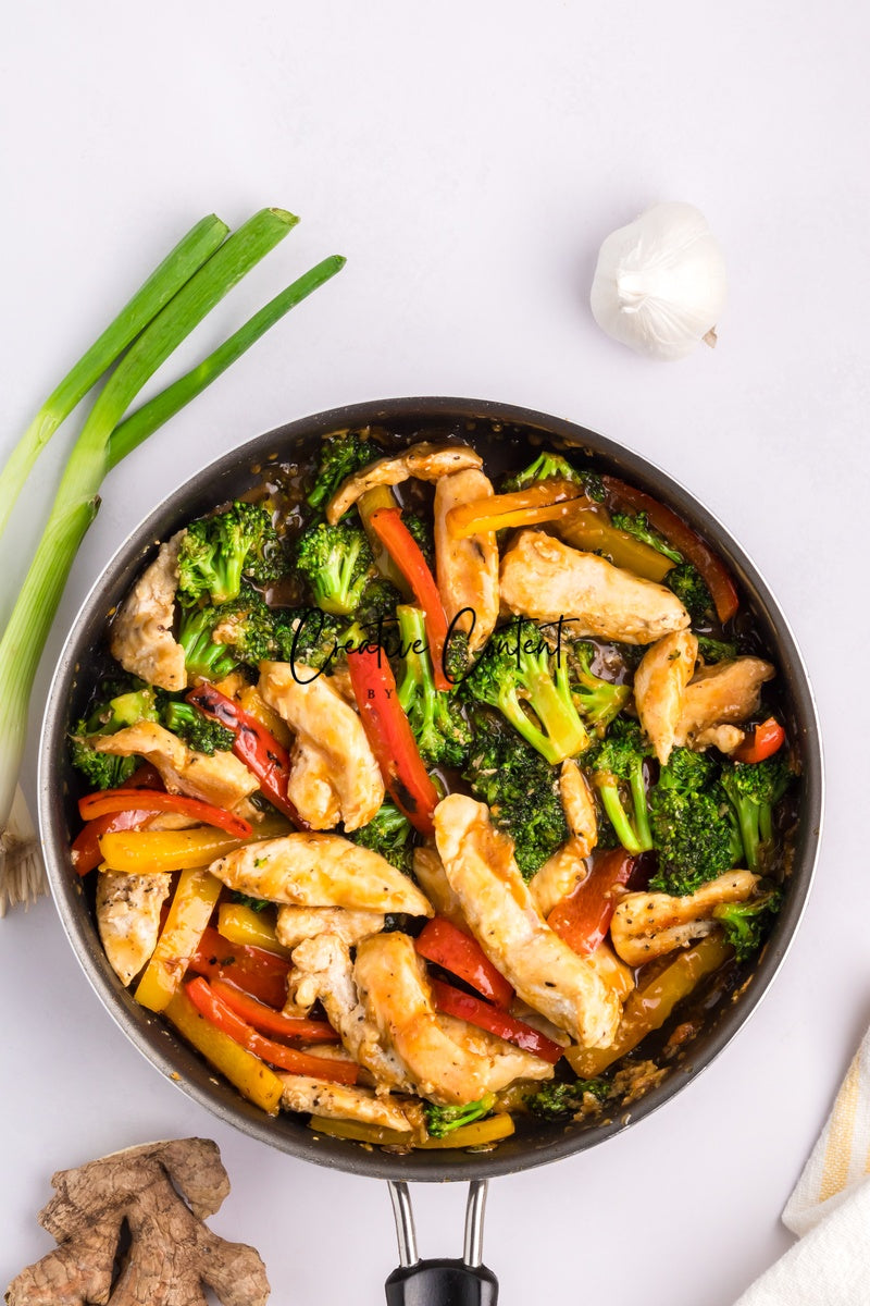 - Ingredients needed; rice, chicken stock, cornstarch, chicken breast or tenderloin, avocado oil, coarse kosher salt, black pepper, broccoli florets, red bell pepper, yellow bell pepper, garlic cloves, ginger, low-sodium soy sauce, honey, rice vinegar, toasted sesame oil, green onions, and sesame seeds.