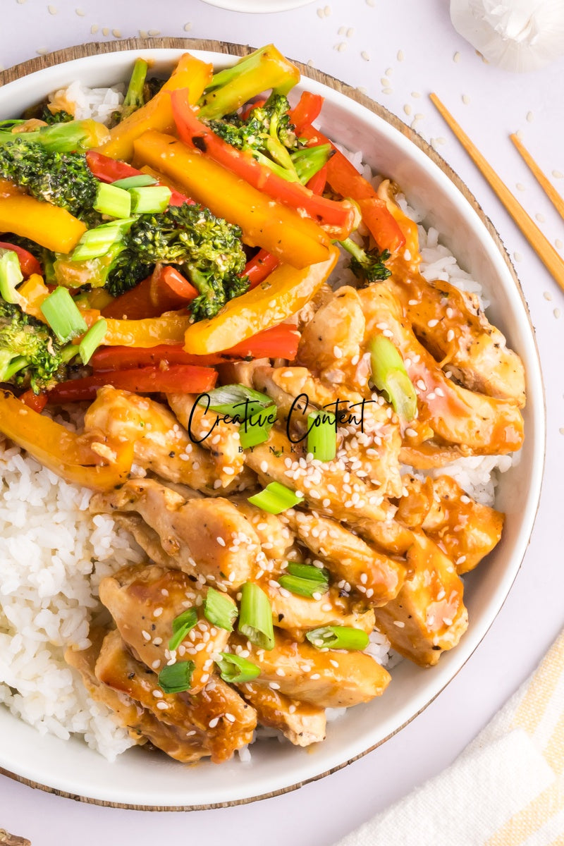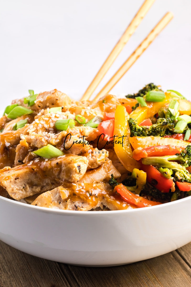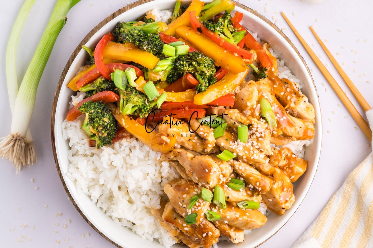 This teriyaki bowl recipe has so much robust flavor from the soy sauce and honey that coats the chicken, peppers, and broccoli florets. This is a great meal for a busy weeknight dinner or when you want to meal prep for lunches all week long. The Asian-infused flavors with the broccoli and bell peppers create a hearty dish that is healthy and satisfying.