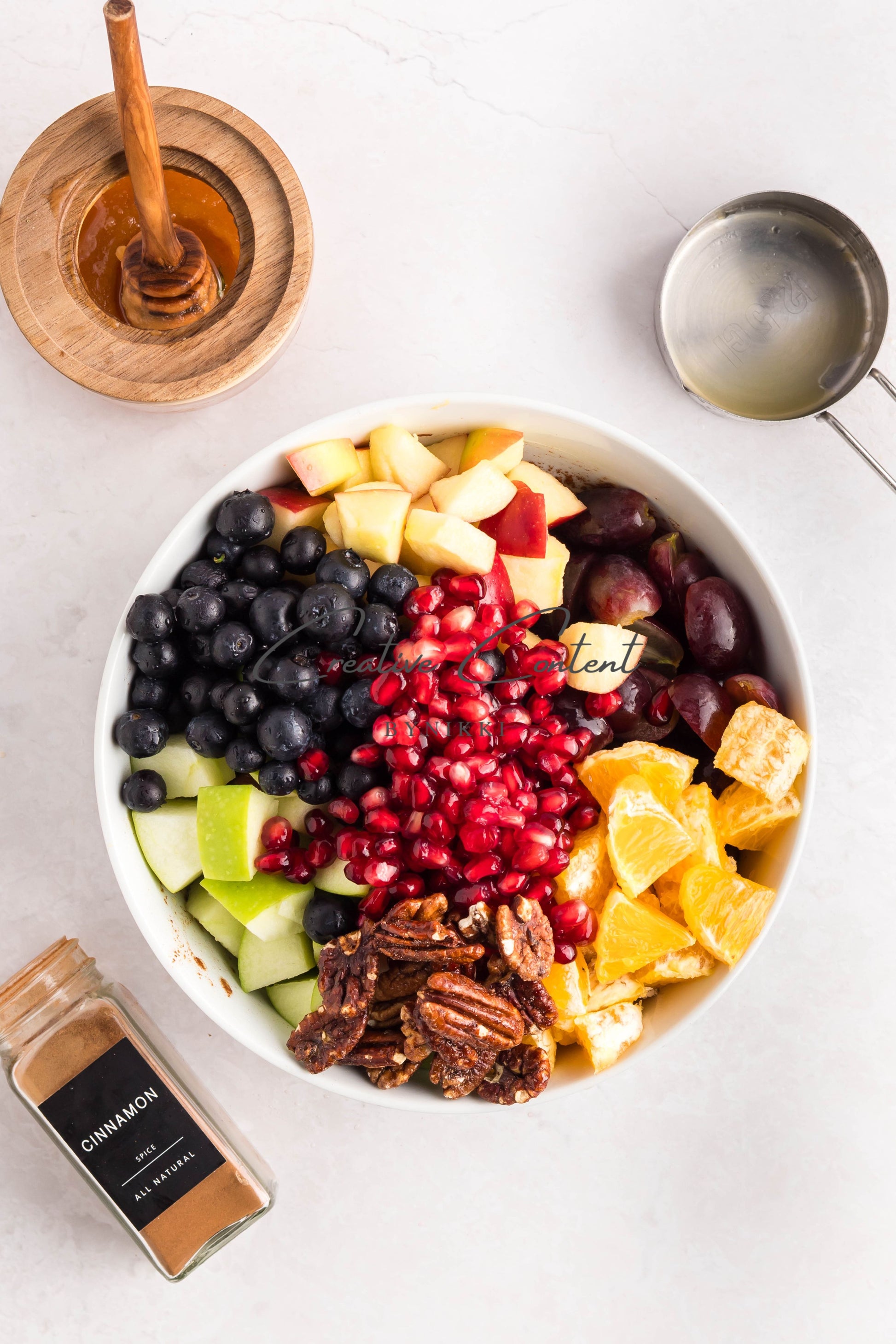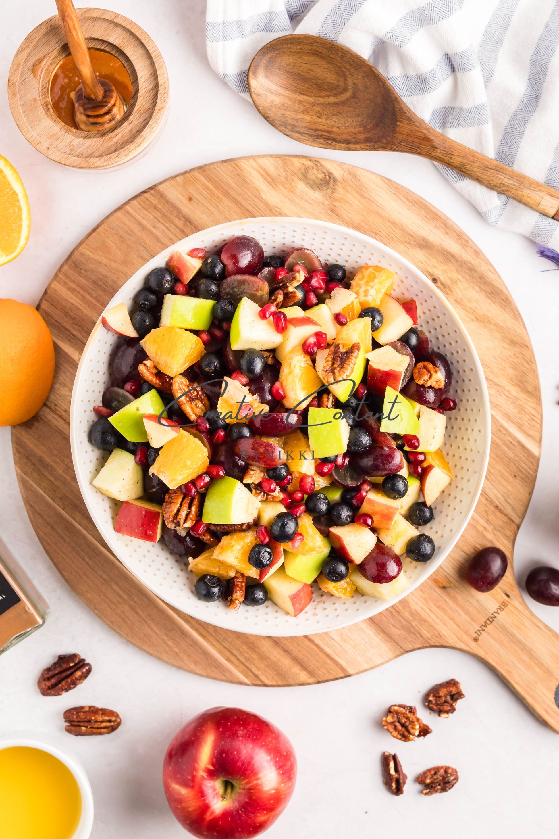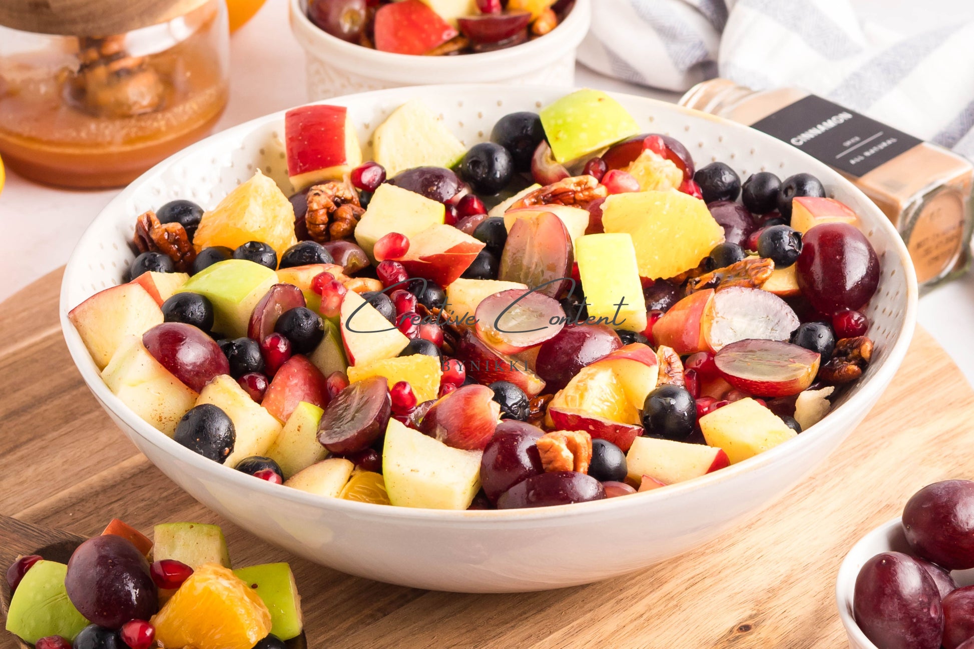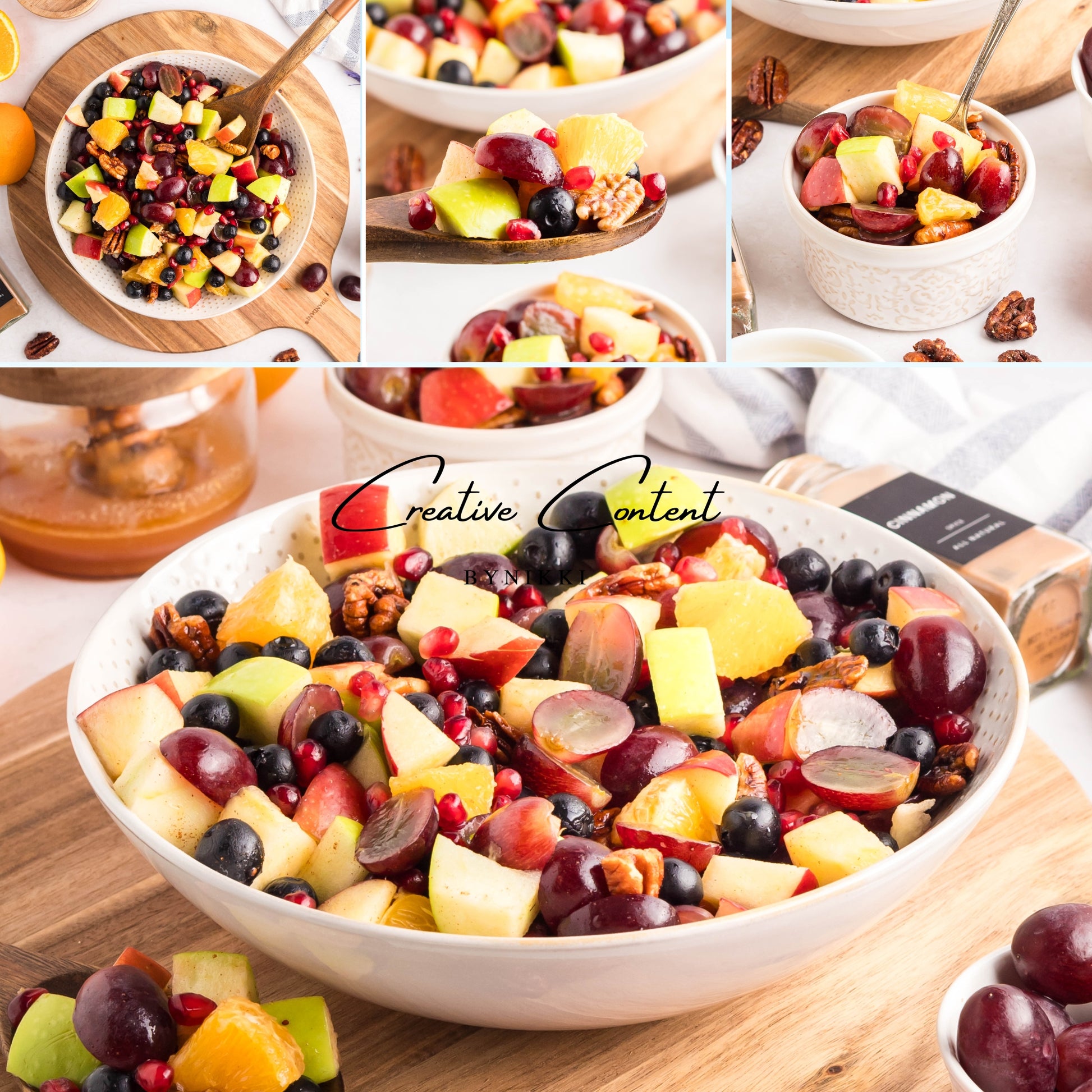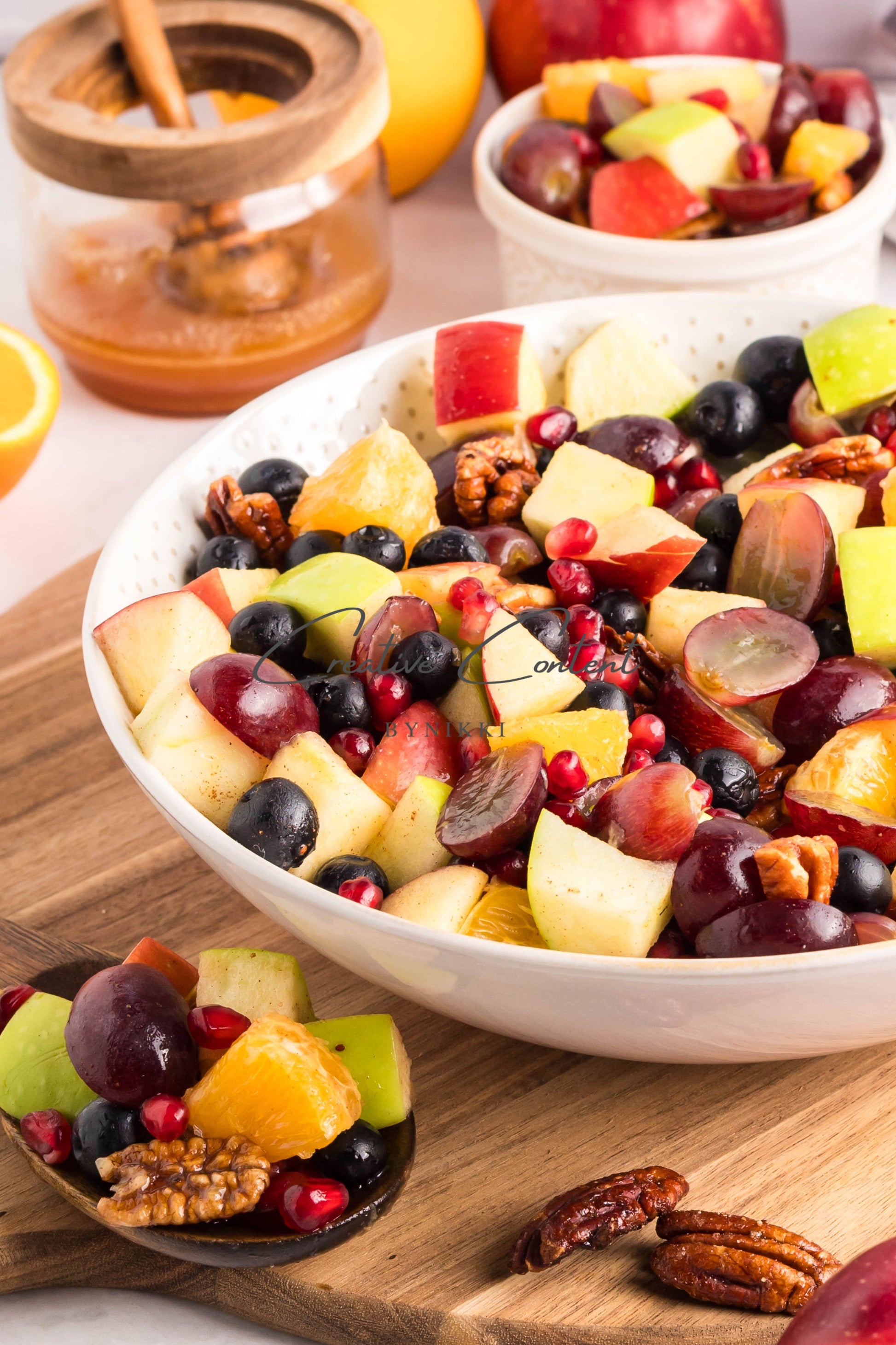 - Ingredients: grapes, orange, blueberries, red apple, green apple, pomegranate seeds, pecans, orange juice, honey, cinnamon