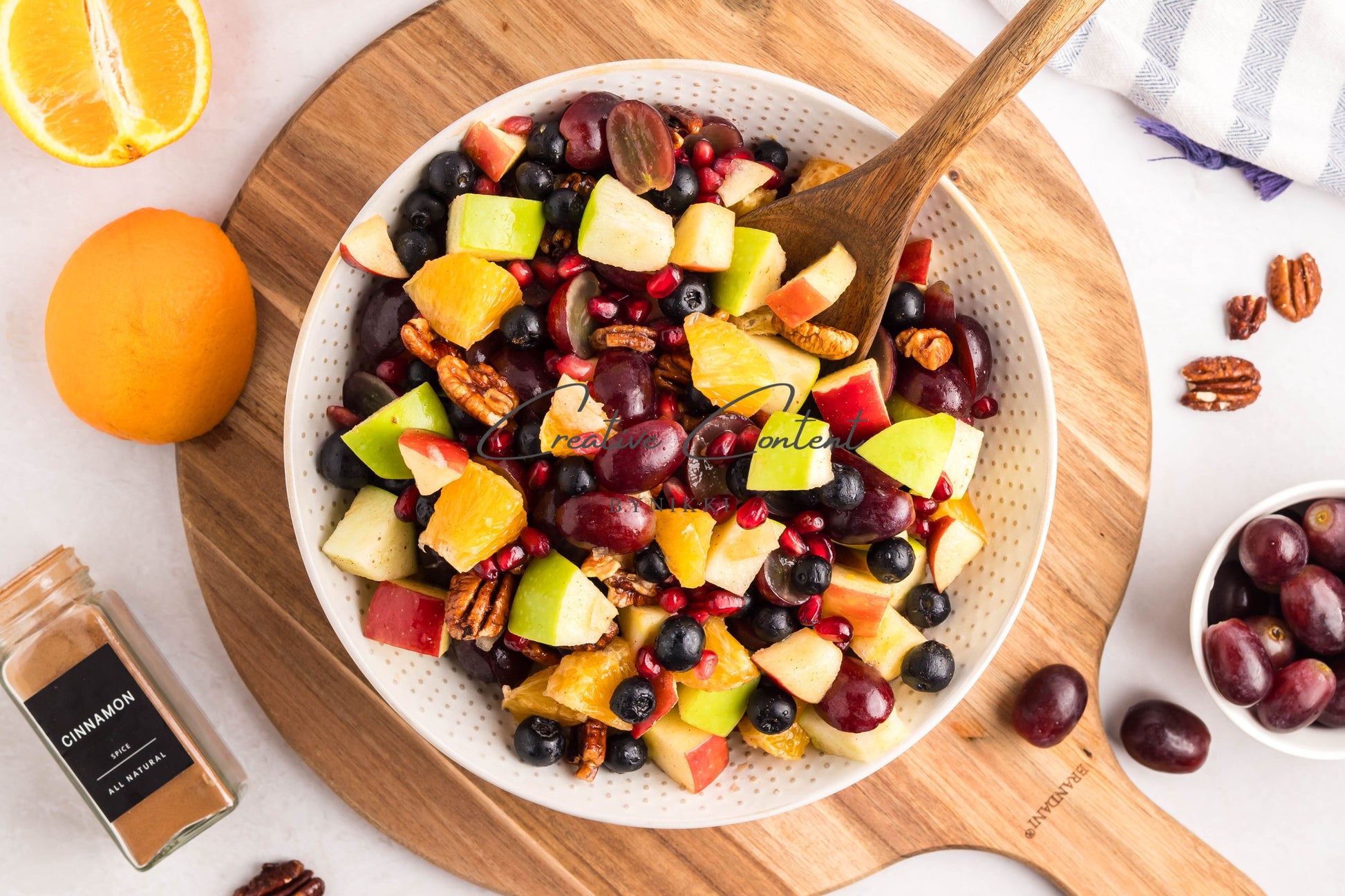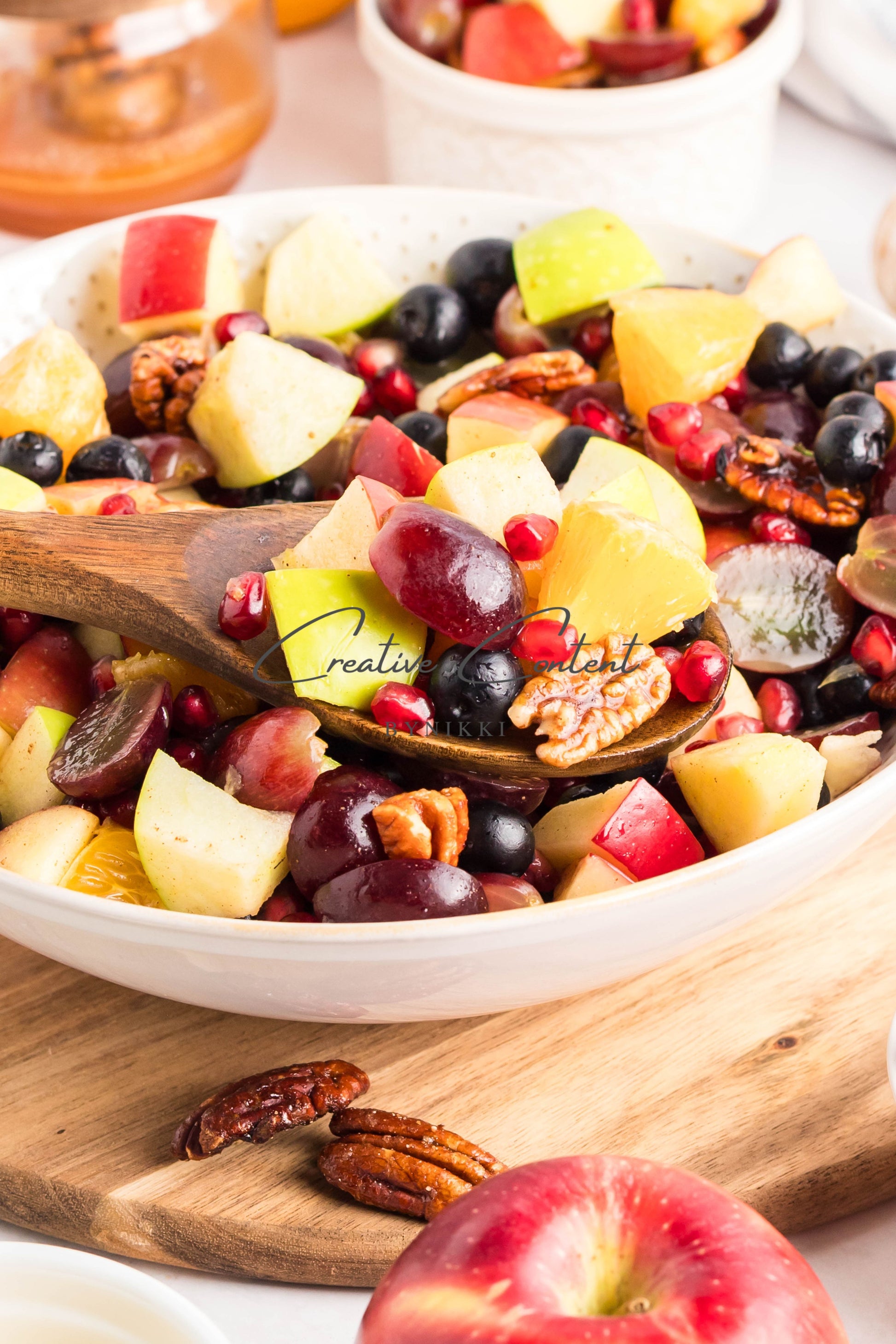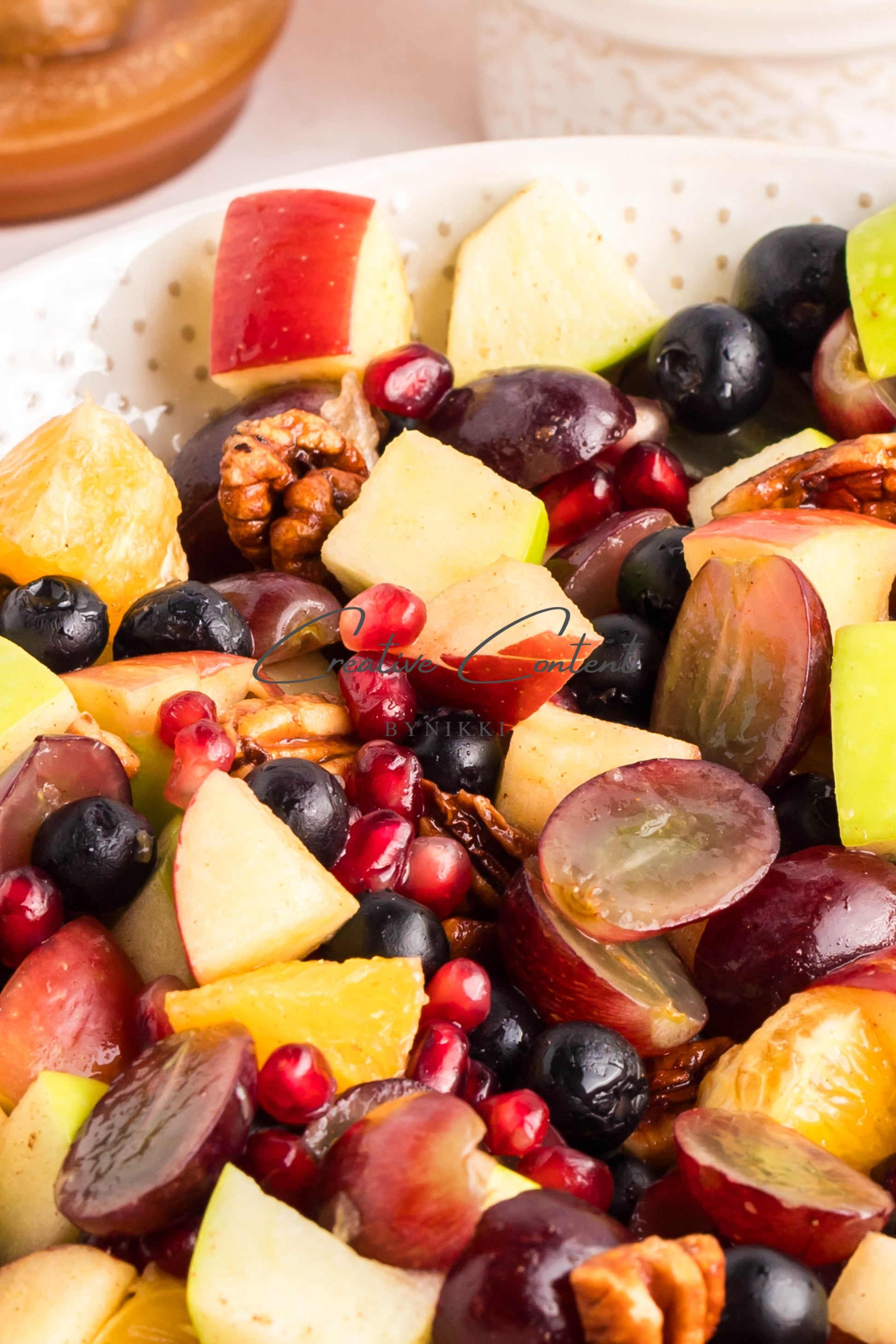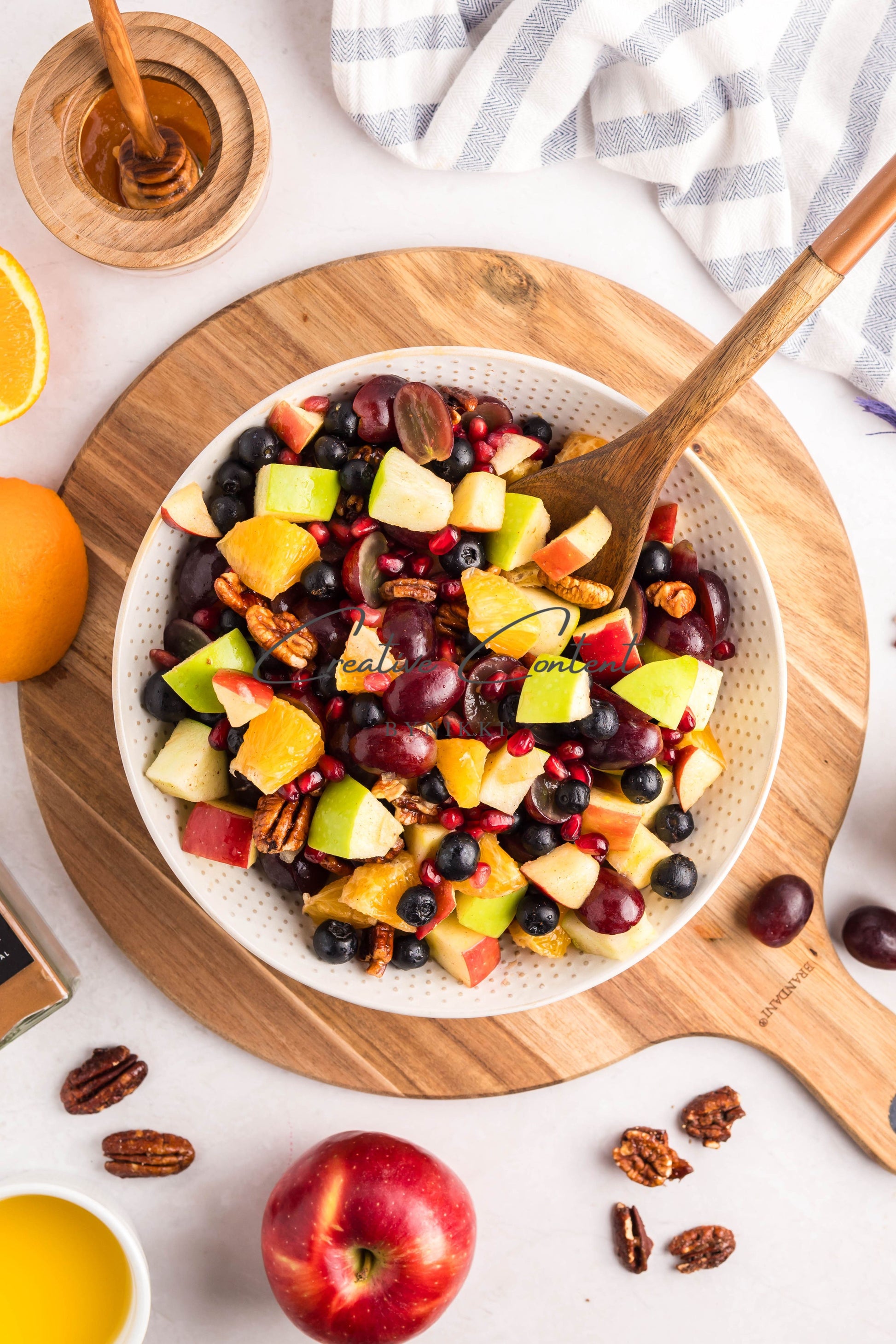 - Ingredients: grapes, orange, blueberries, red apple, green apple, pomegranate seeds, pecans, orange juice, honey, cinnamon