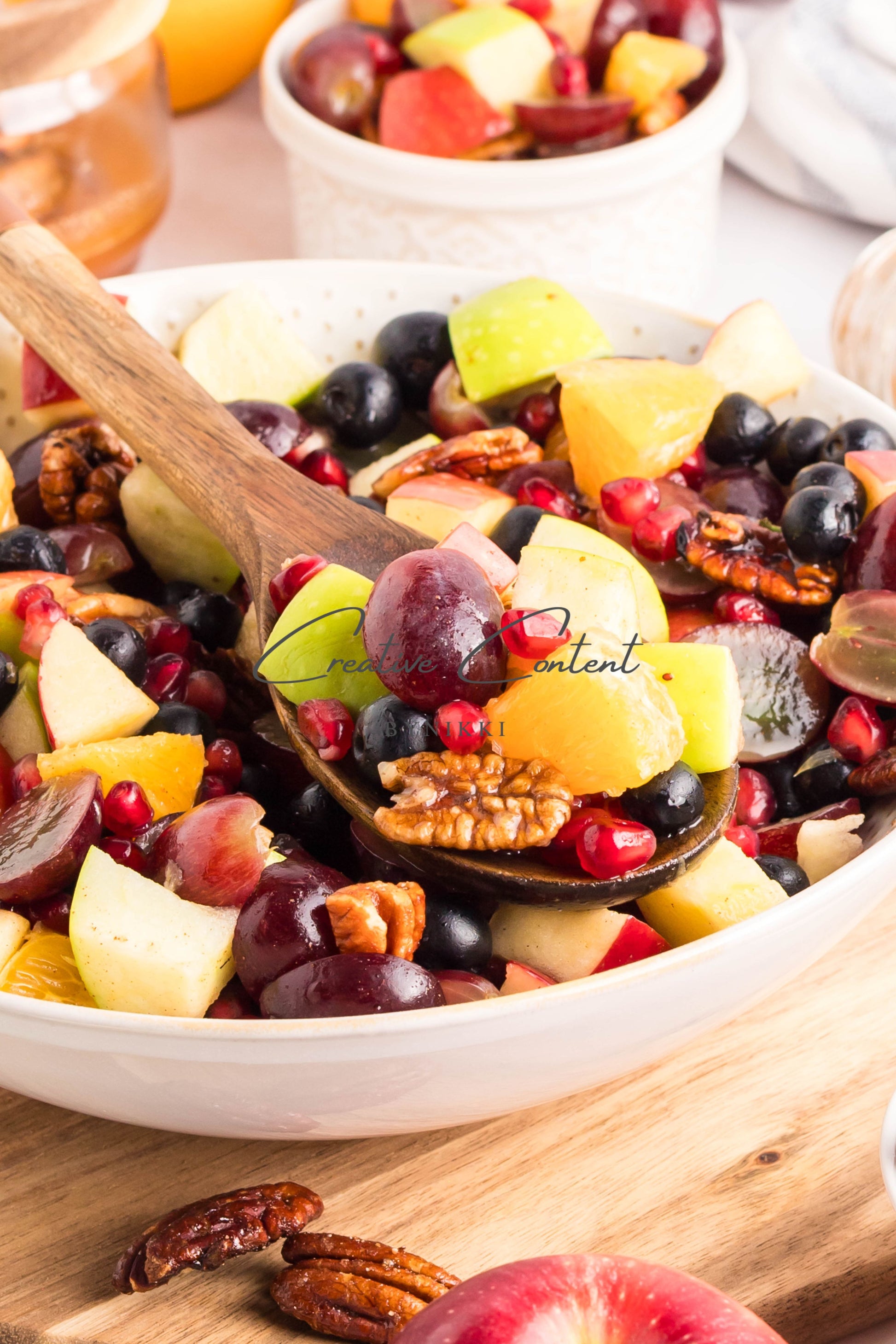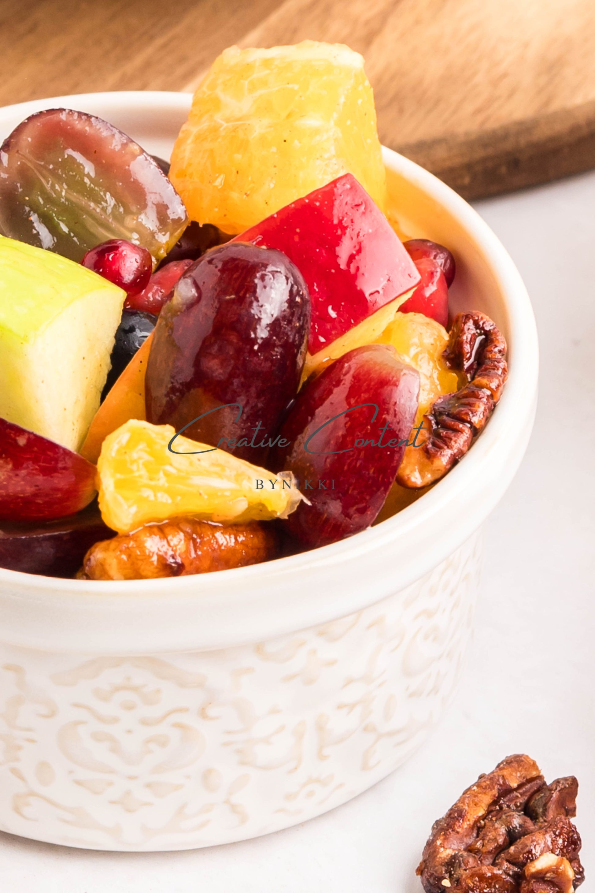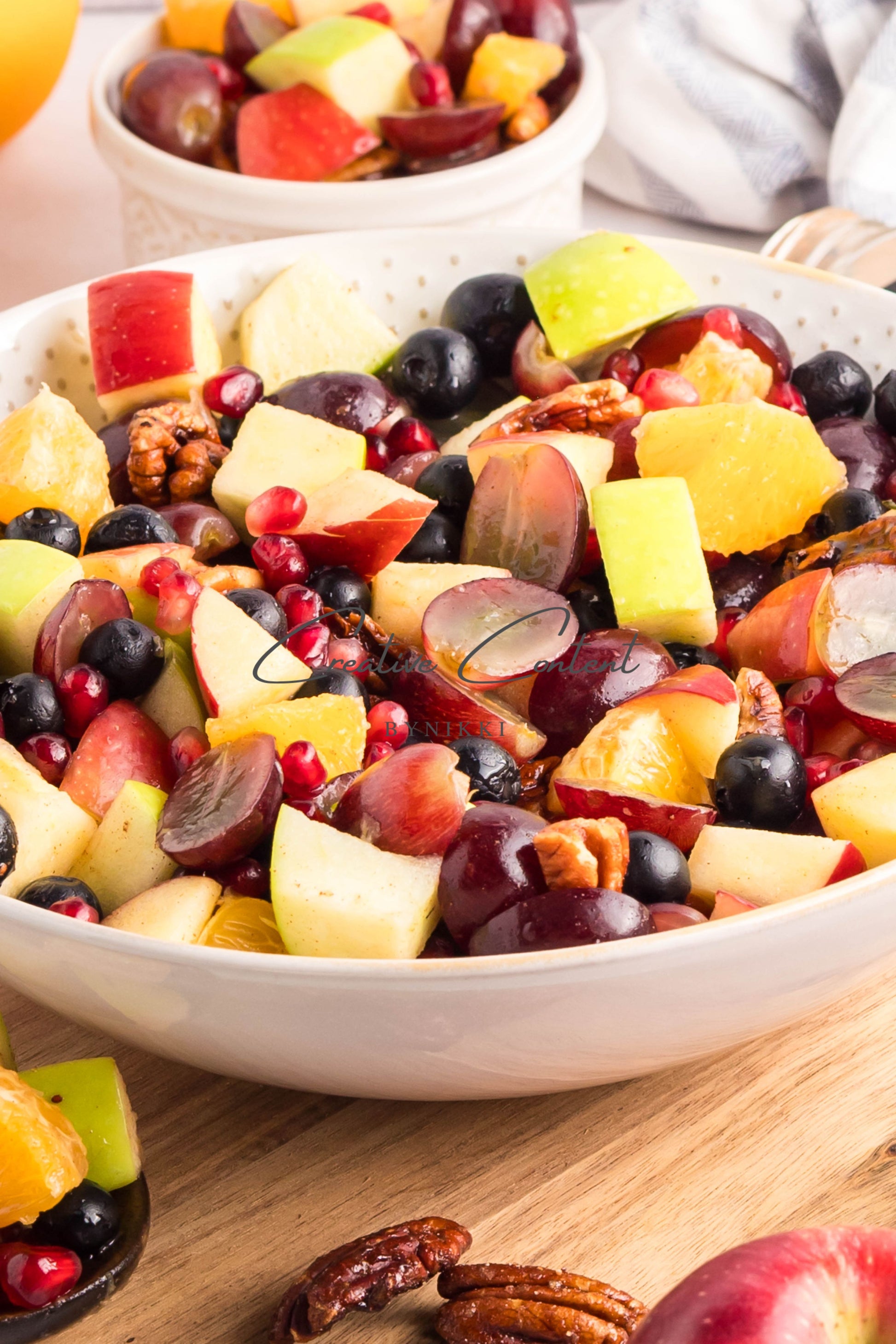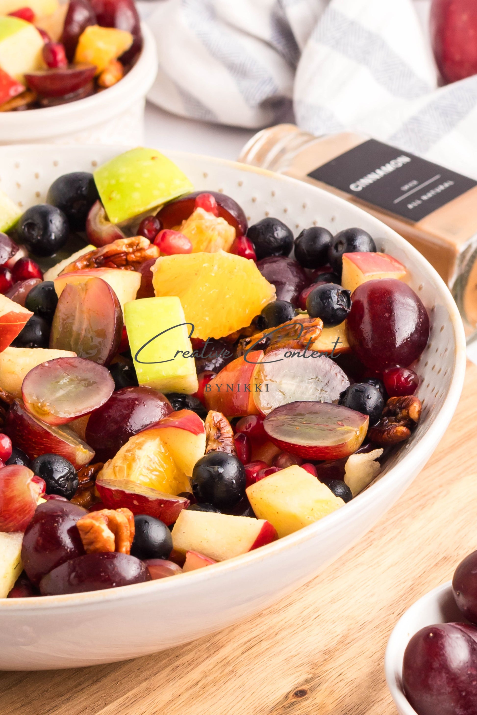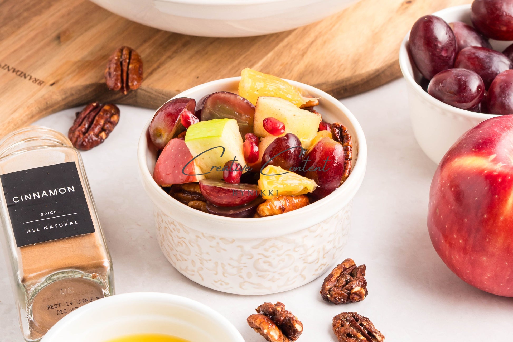 - Ingredients: grapes, orange, blueberries, red apple, green apple, pomegranate seeds, pecans, orange juice, honey, cinnamon
