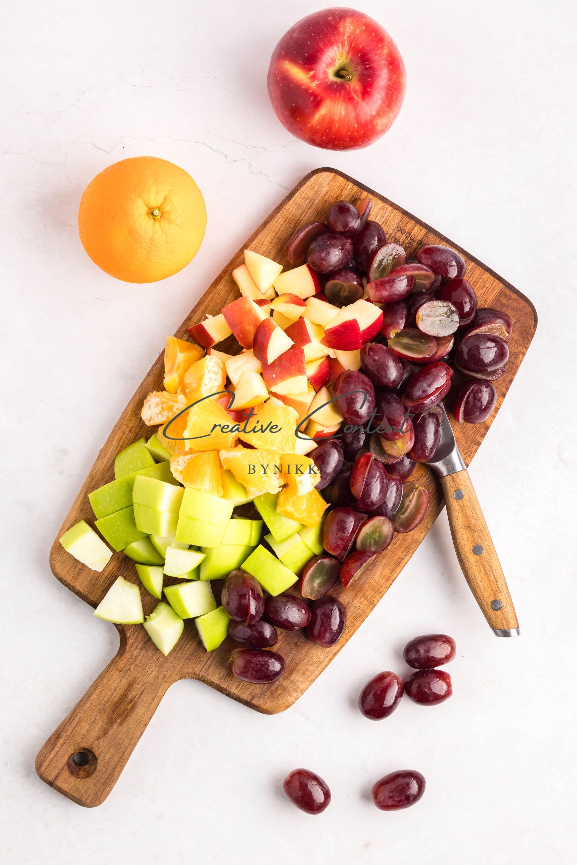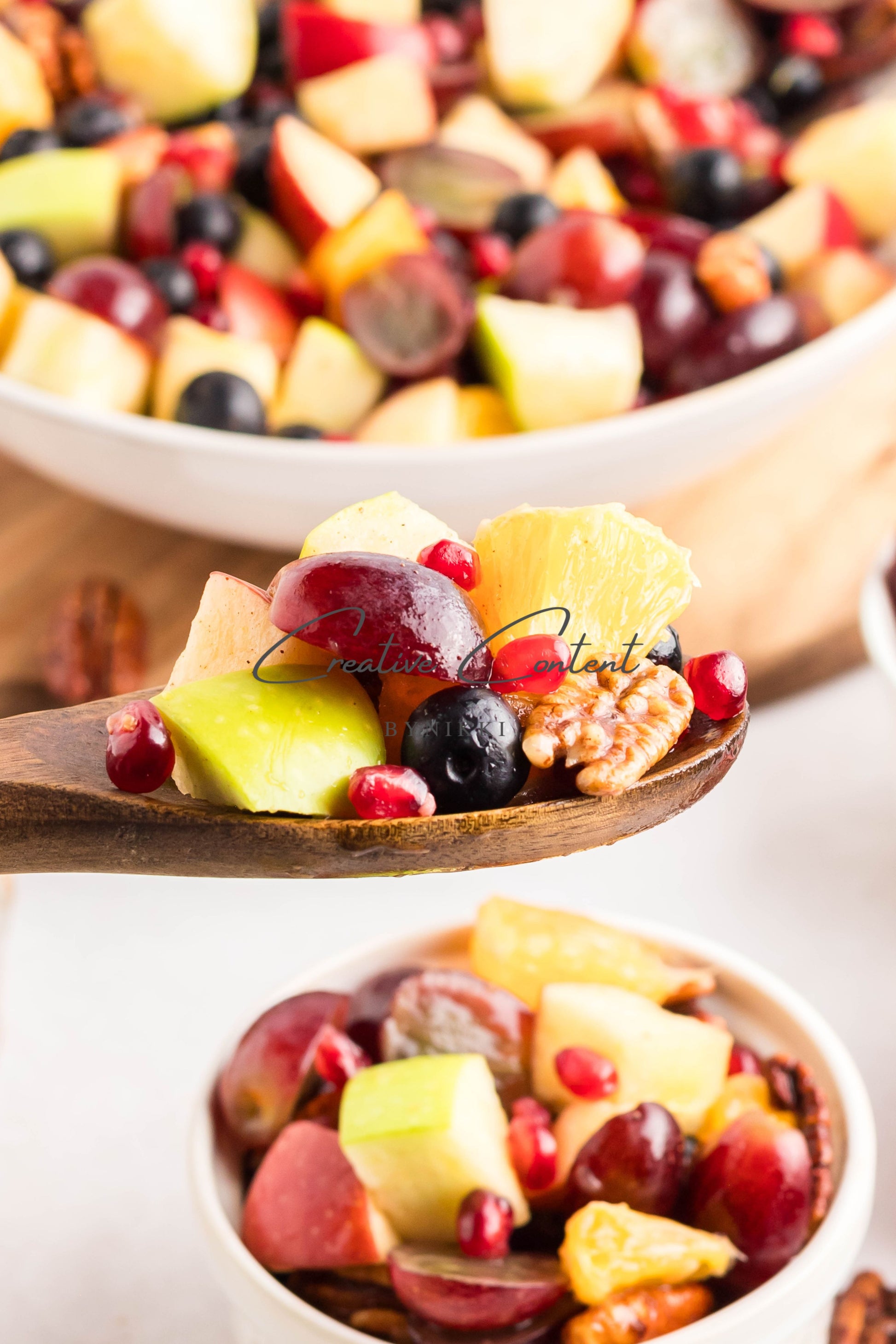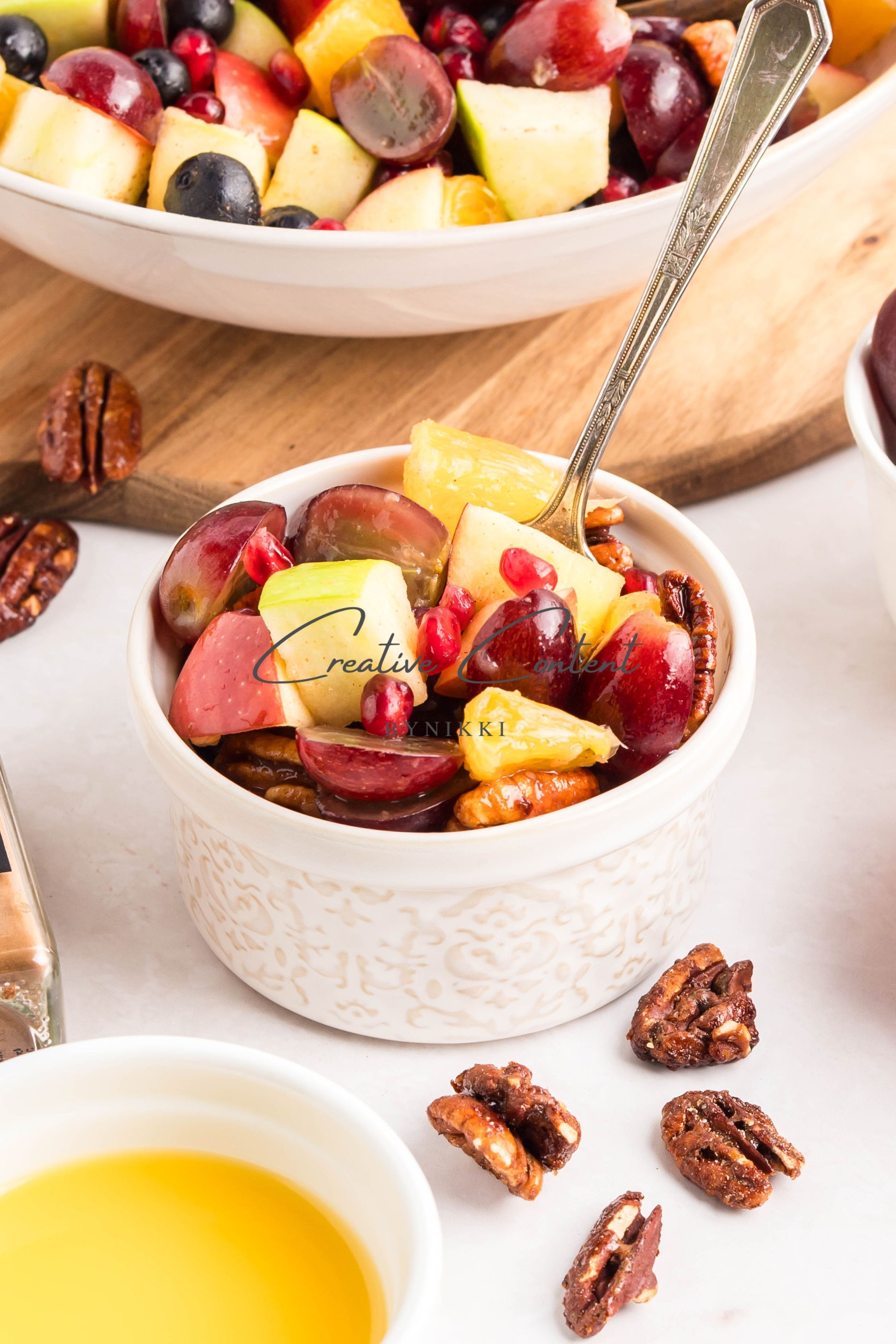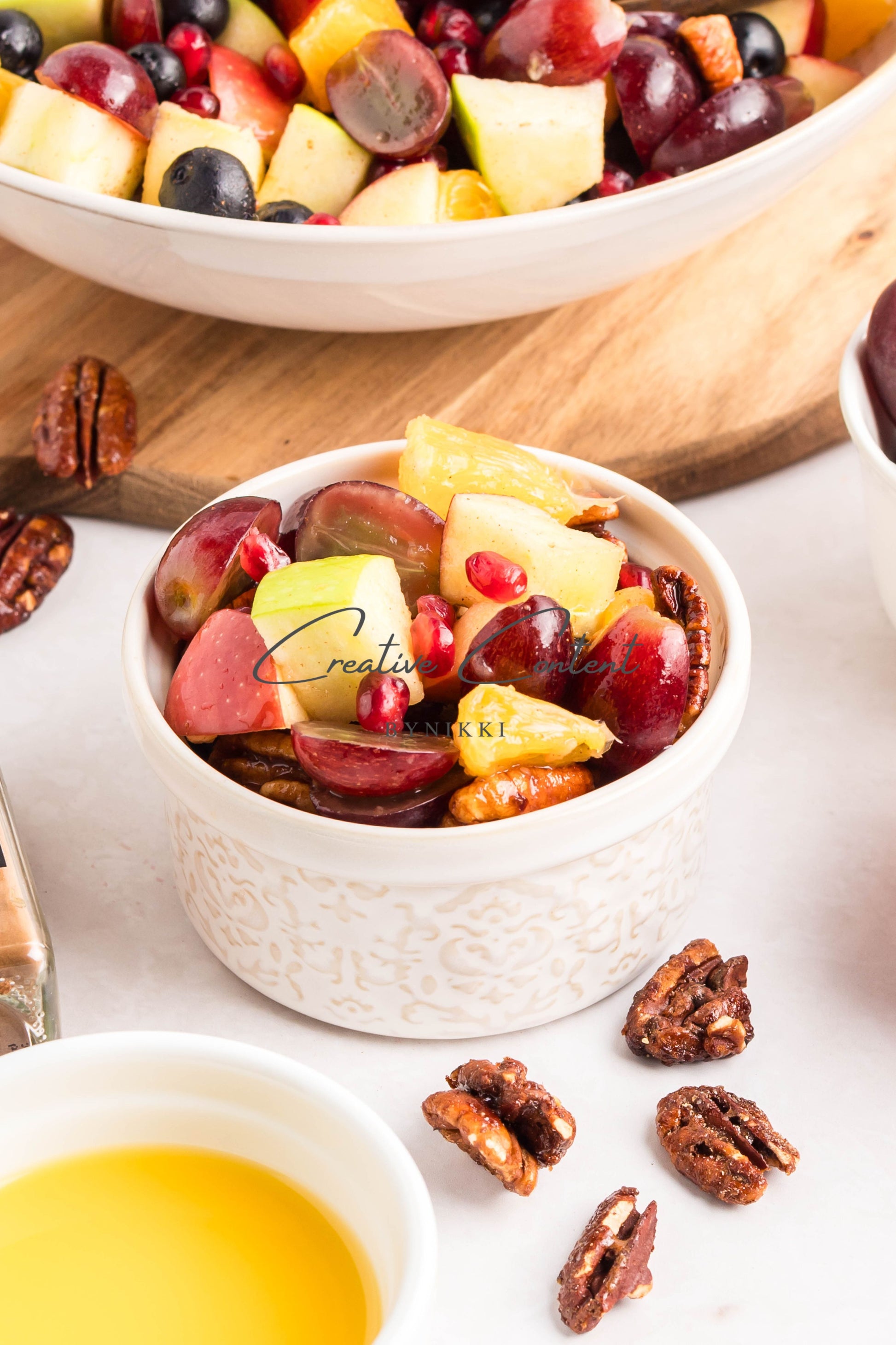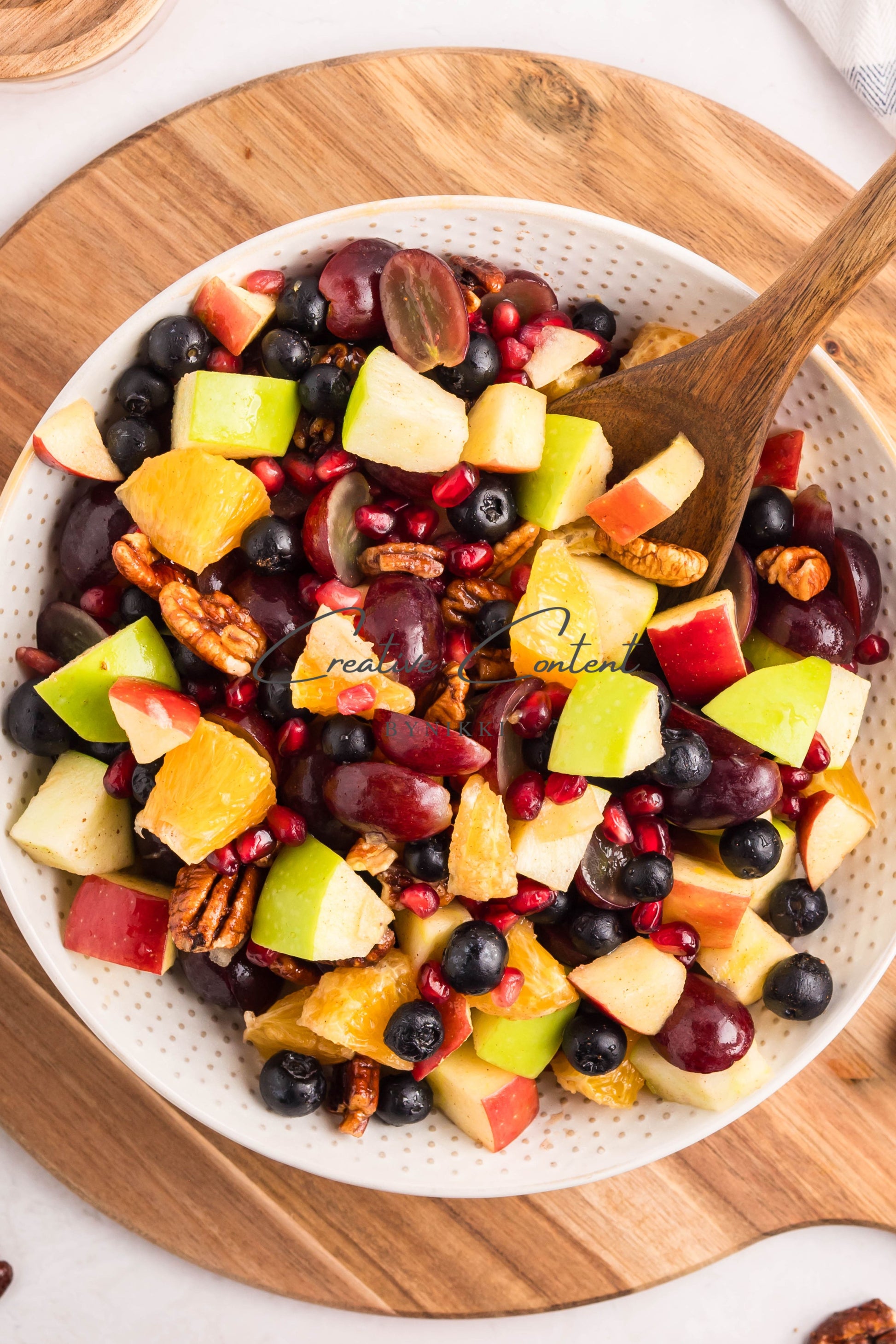 - Ingredients: grapes, orange, blueberries, red apple, green apple, pomegranate seeds, pecans, orange juice, honey, cinnamon