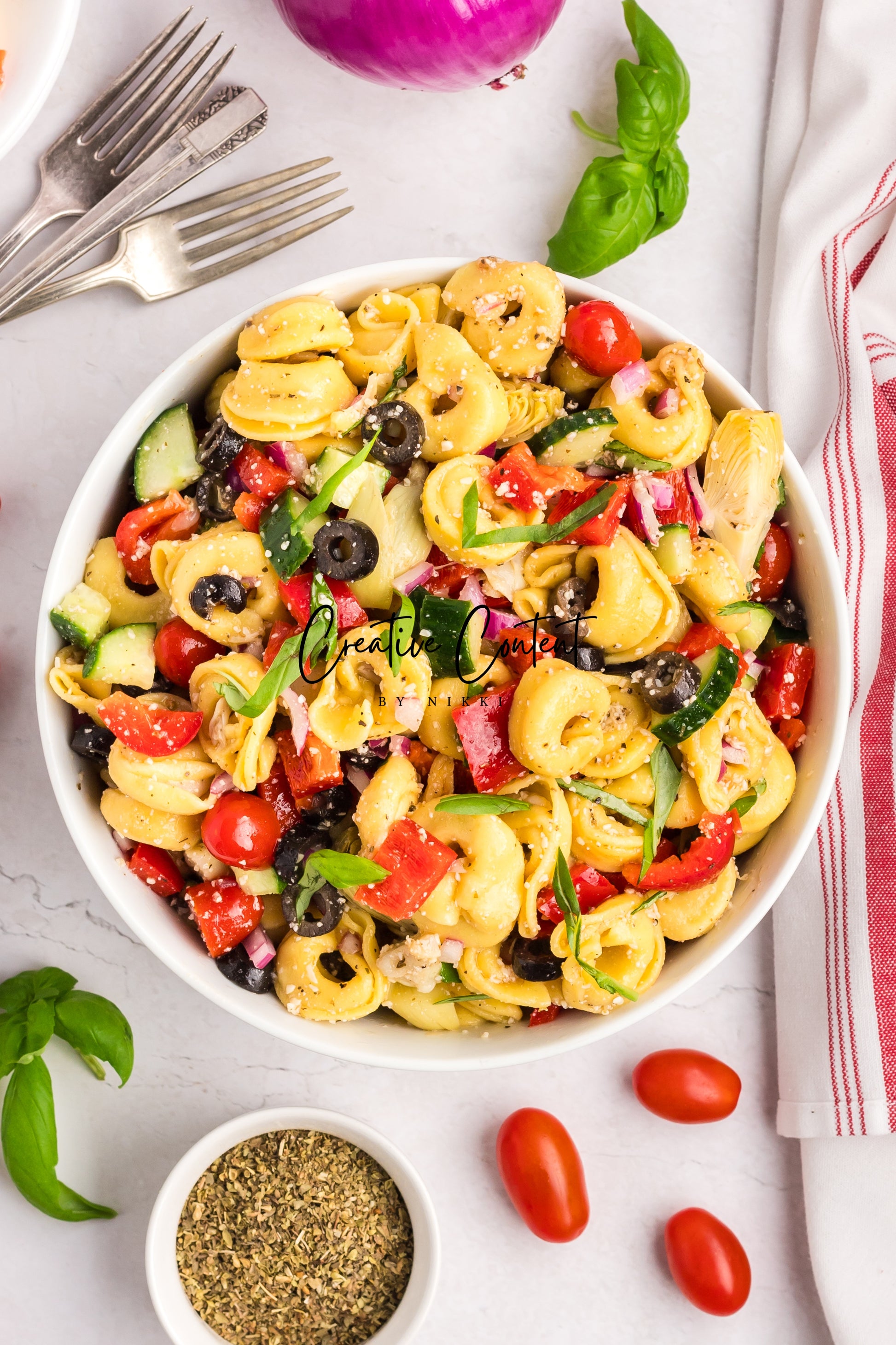 - Featured Ingredients; avocado oil, white wine vinegar, garlic clove, Dijon mustard, Italian seasoning, coarse kosher salt, black pepper, cheese tortellini pasta, cherry tomatoes, artichoke hearts, cucumber, red bell pepper, red onion, black olives, parmesan cheese, and basil.