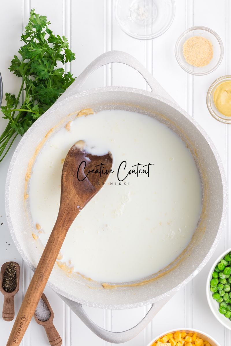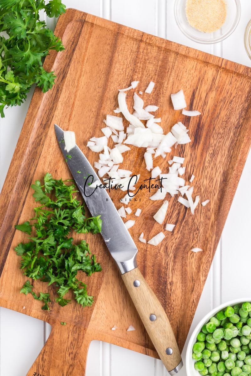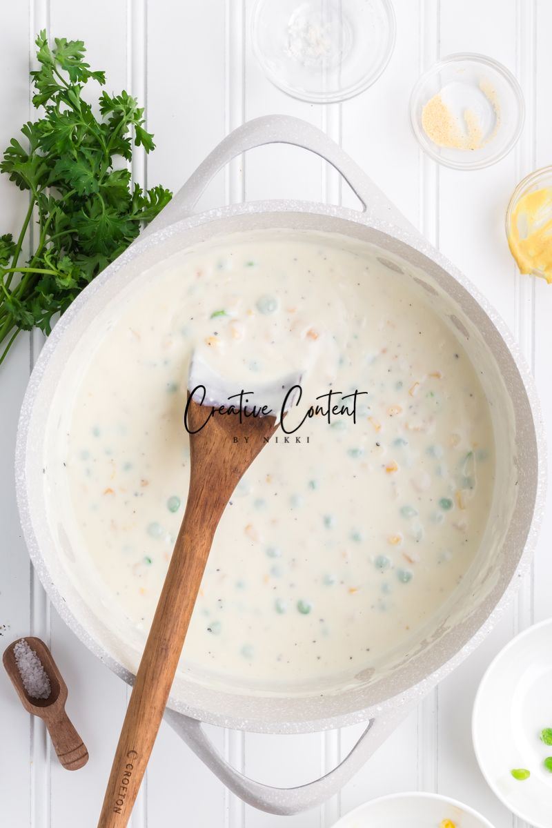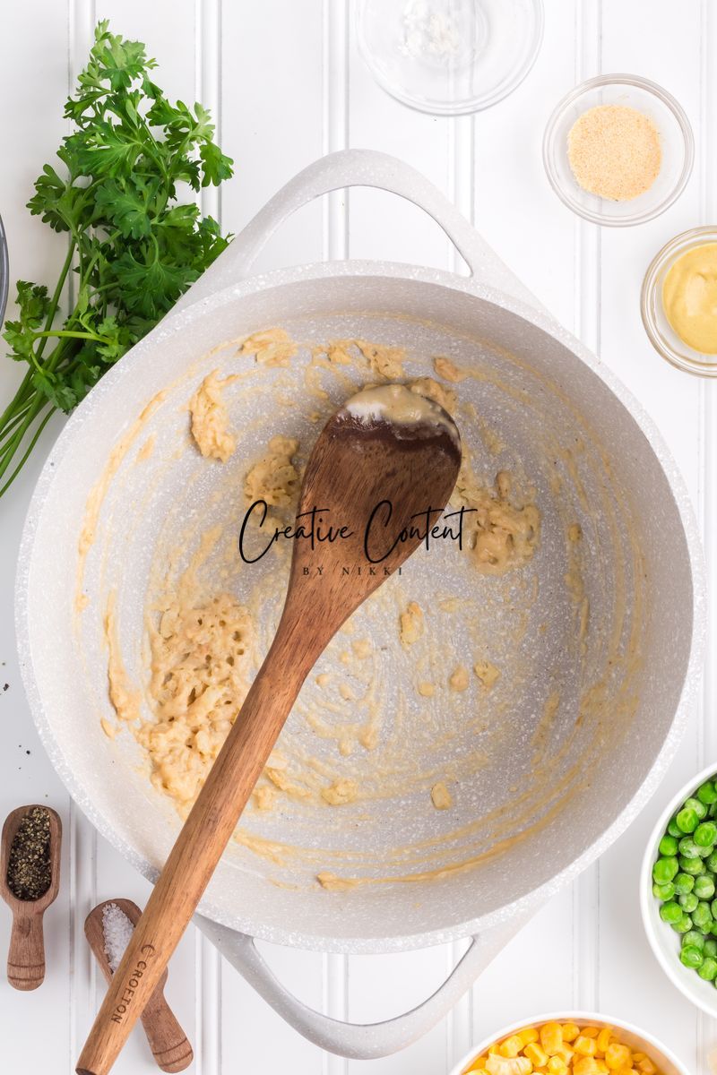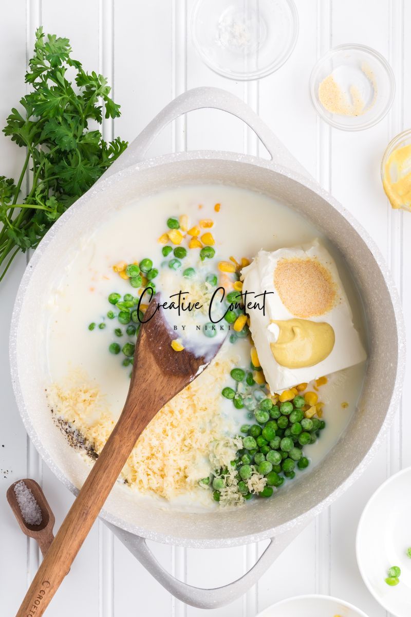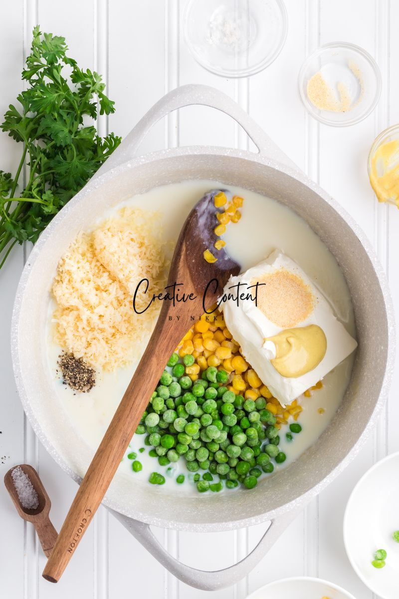 - Ingredients needed; egg noodles, yellow onion, unsalted butter, all-purpose flour, milk, corn, peas, cream cheese, parmesan cheese, Dijon mustard, garlic powder, black pepper, coarse kosher salt, tuna, and parsley.