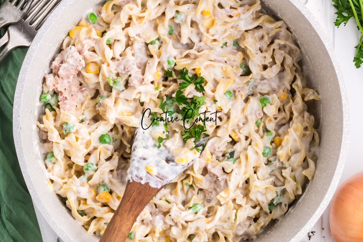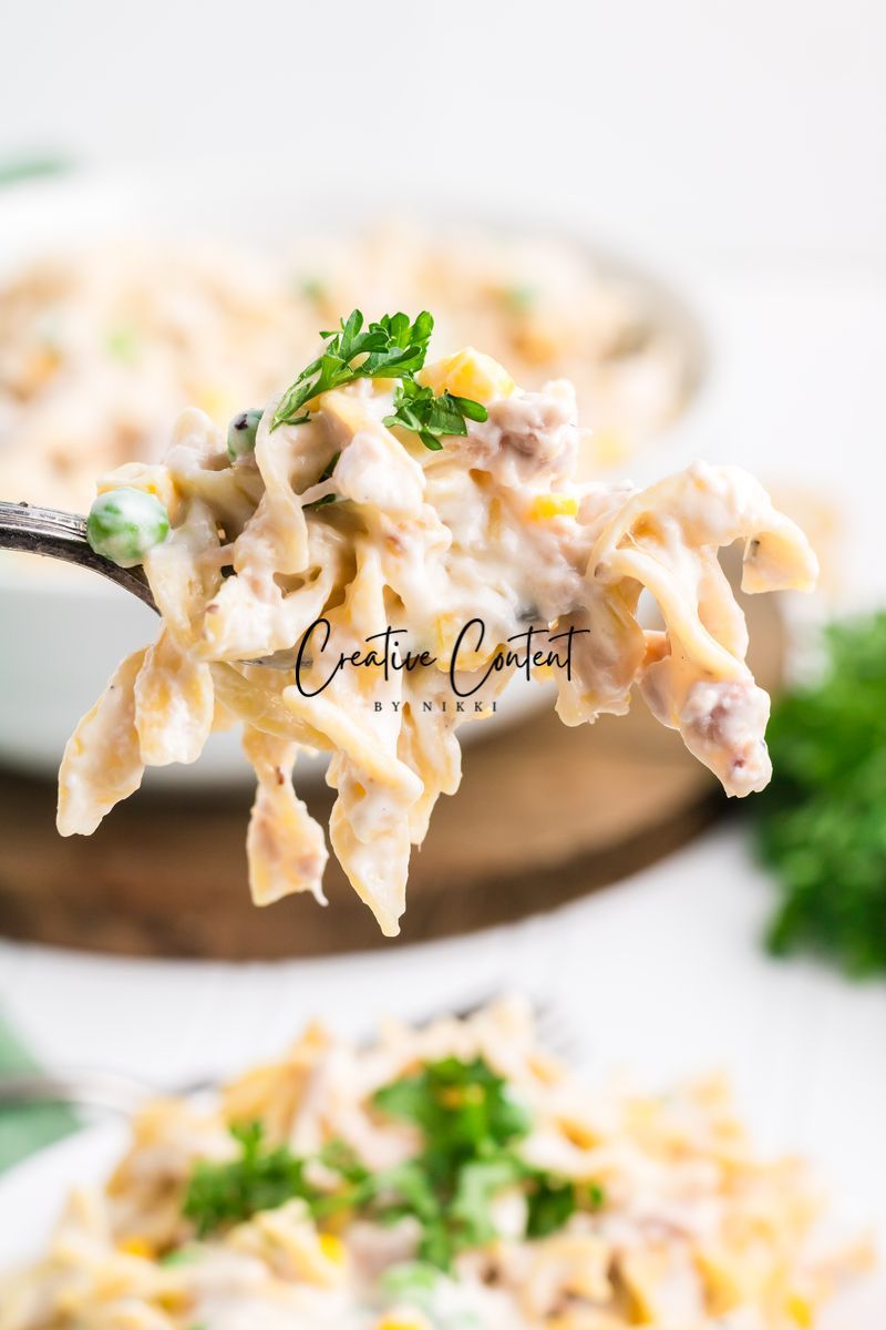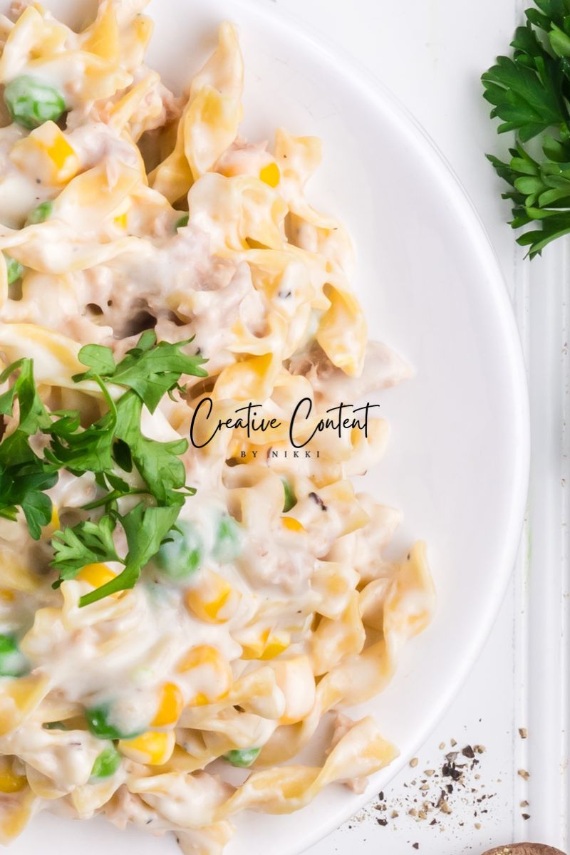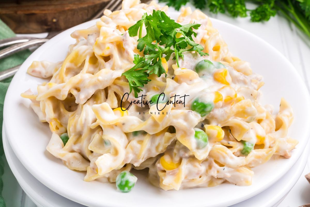 This creamy tuna helper is nostalgic like the old-school tuna helper, but made from scratch. This is a super easy dish to make and is ready in just 15 minutes. The twist of the corn and peas included make this dish hearty and one the whole family will love.