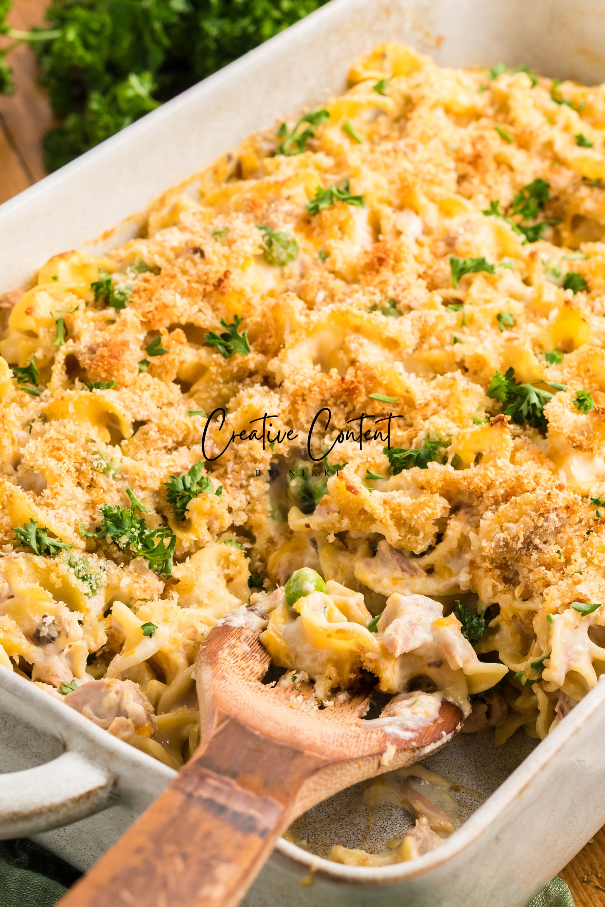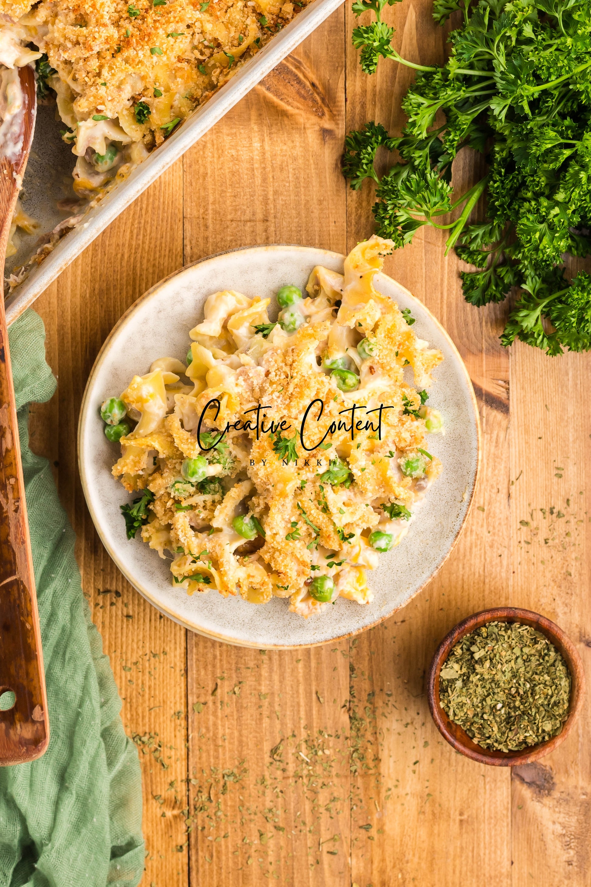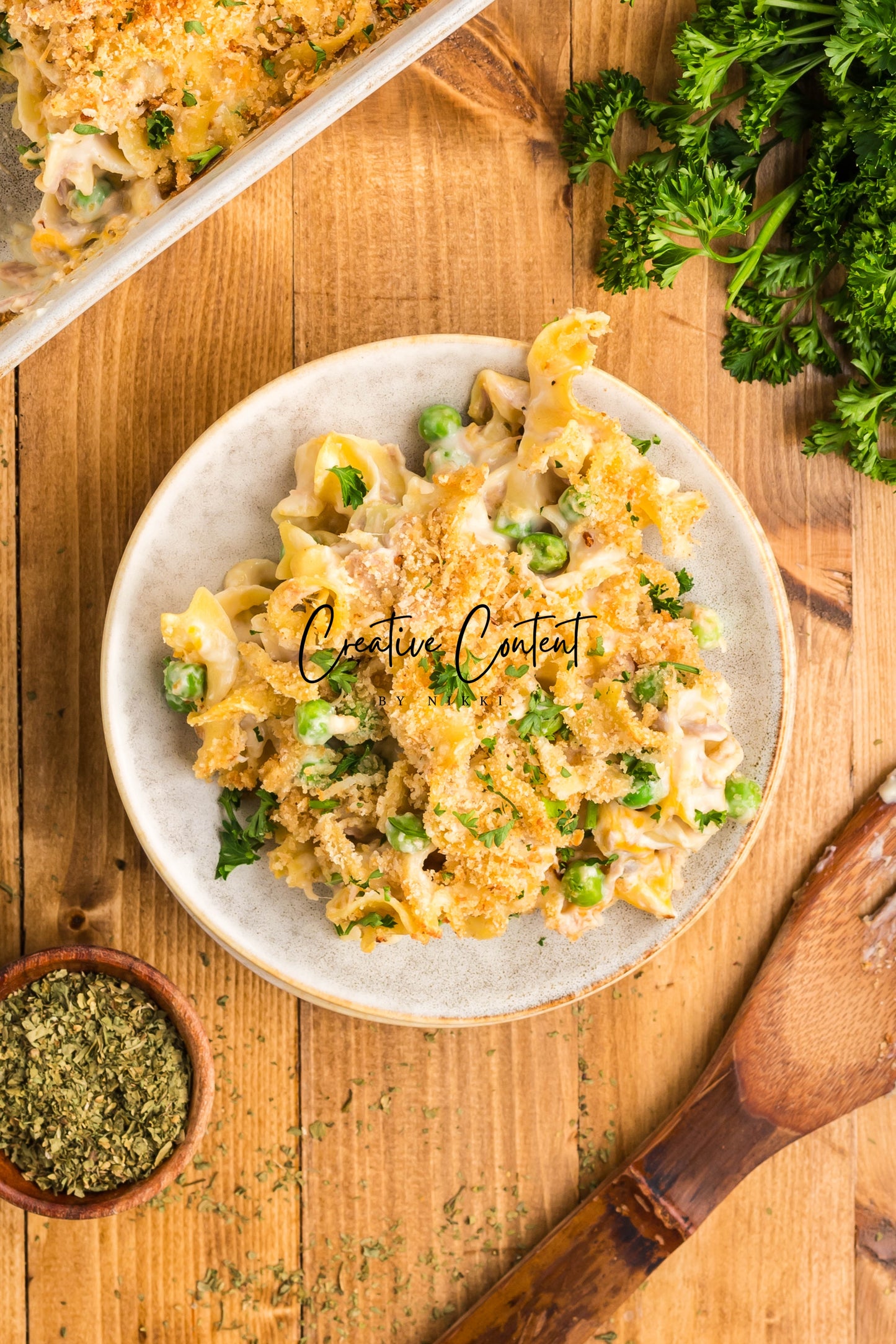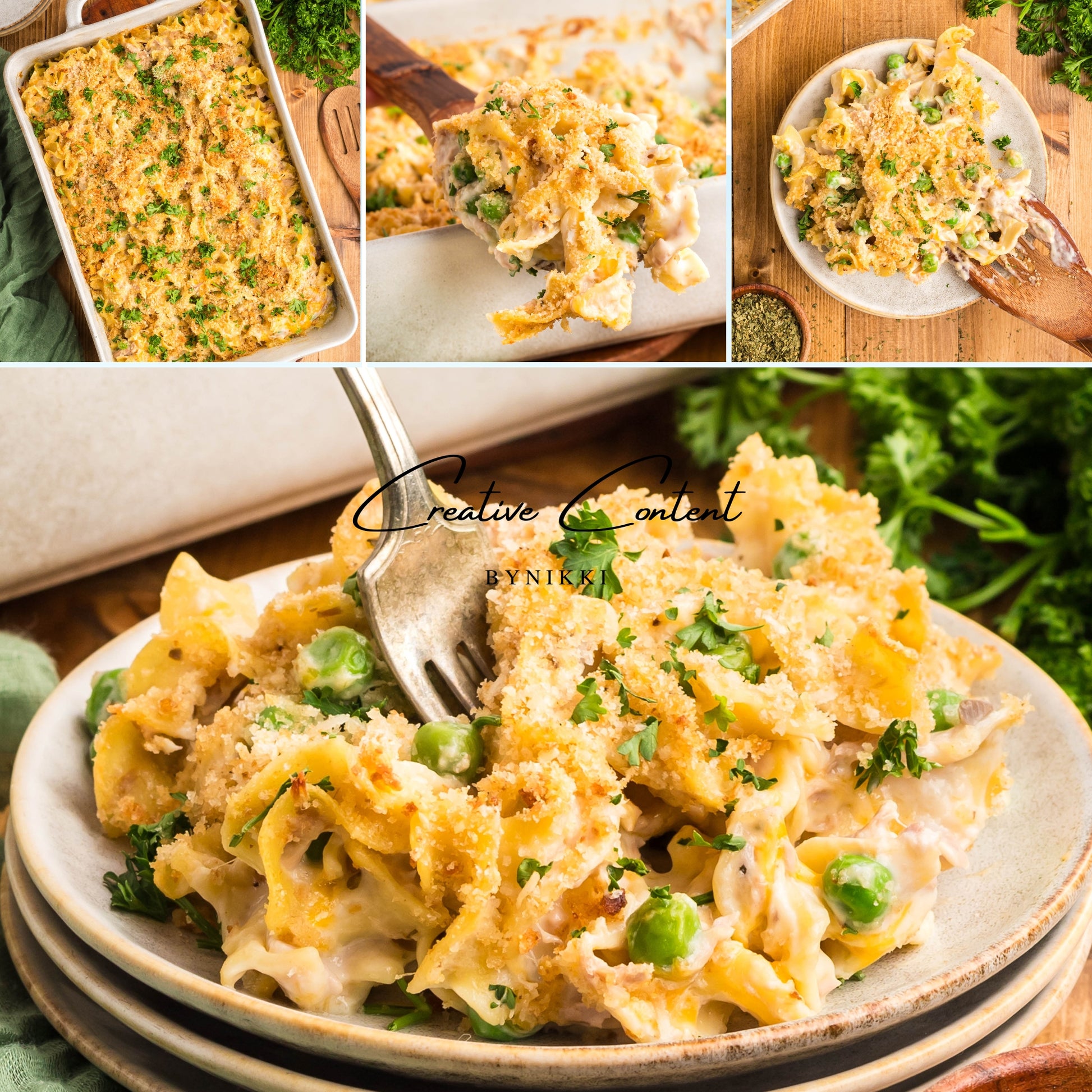- Ingredients: Breadcrumbs, parmesan cheese, butter, egg noodles, mushroom soup, chicken soup, tuna, milk, peas, cheddar cheese, sour cream, lemon juice, parsley, onion powder, garlic powder, pepper, salt, parsley.