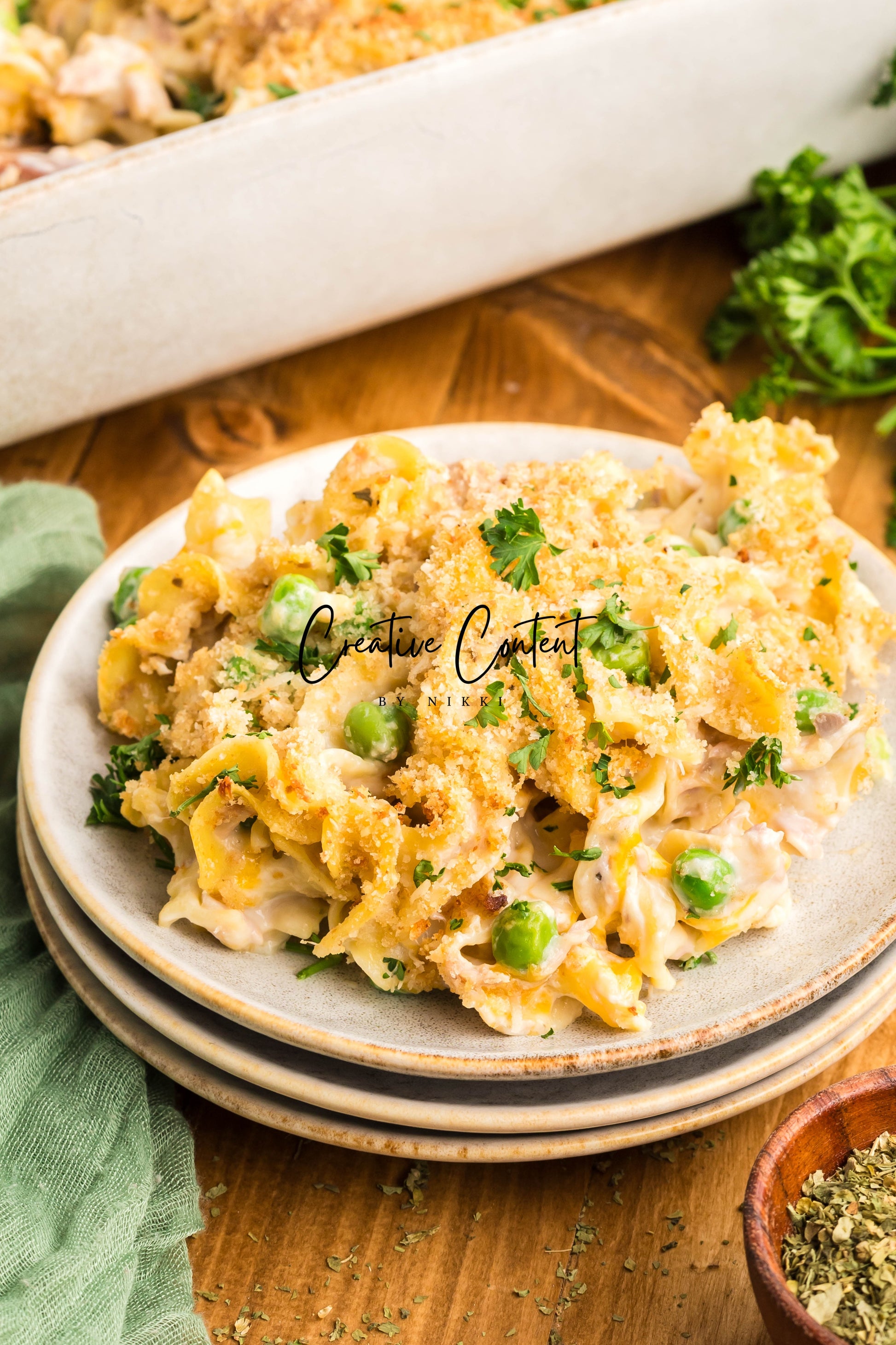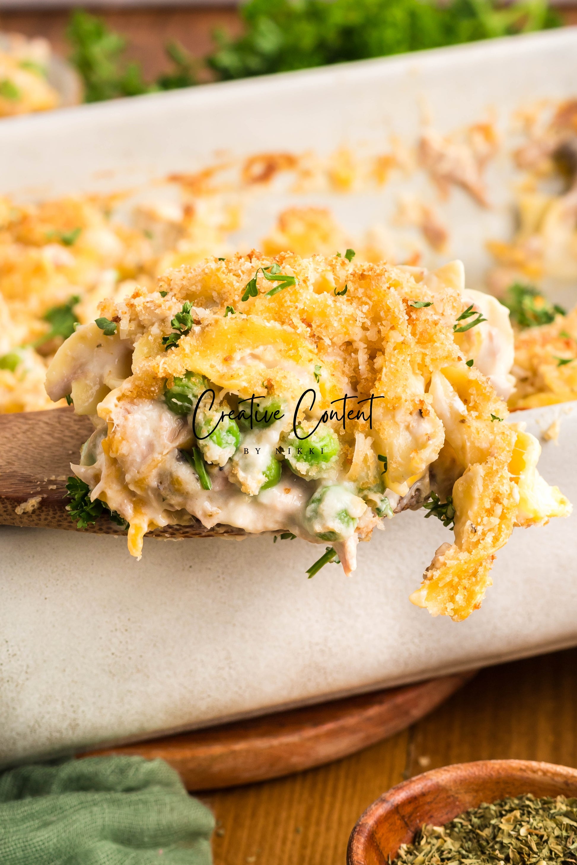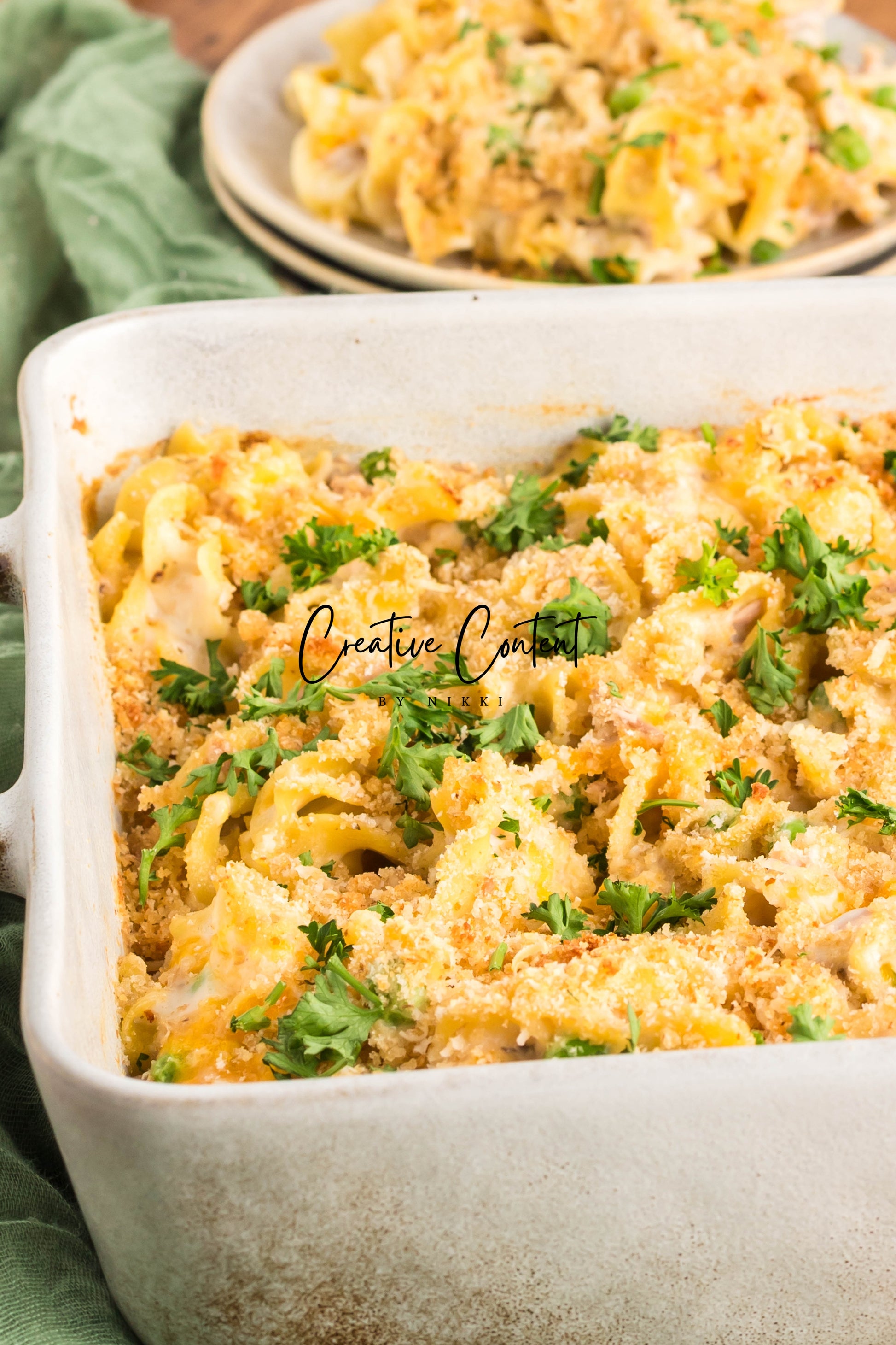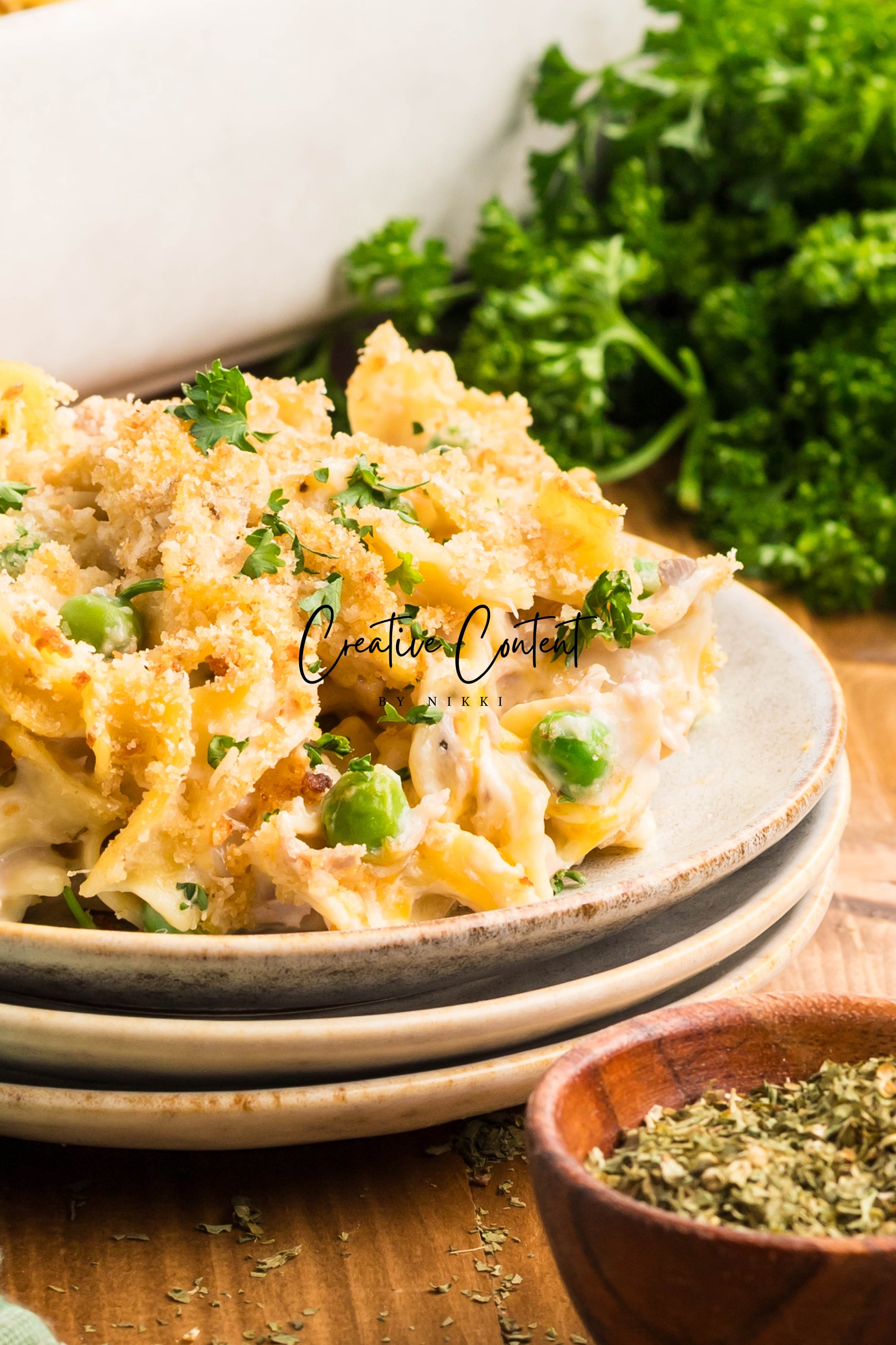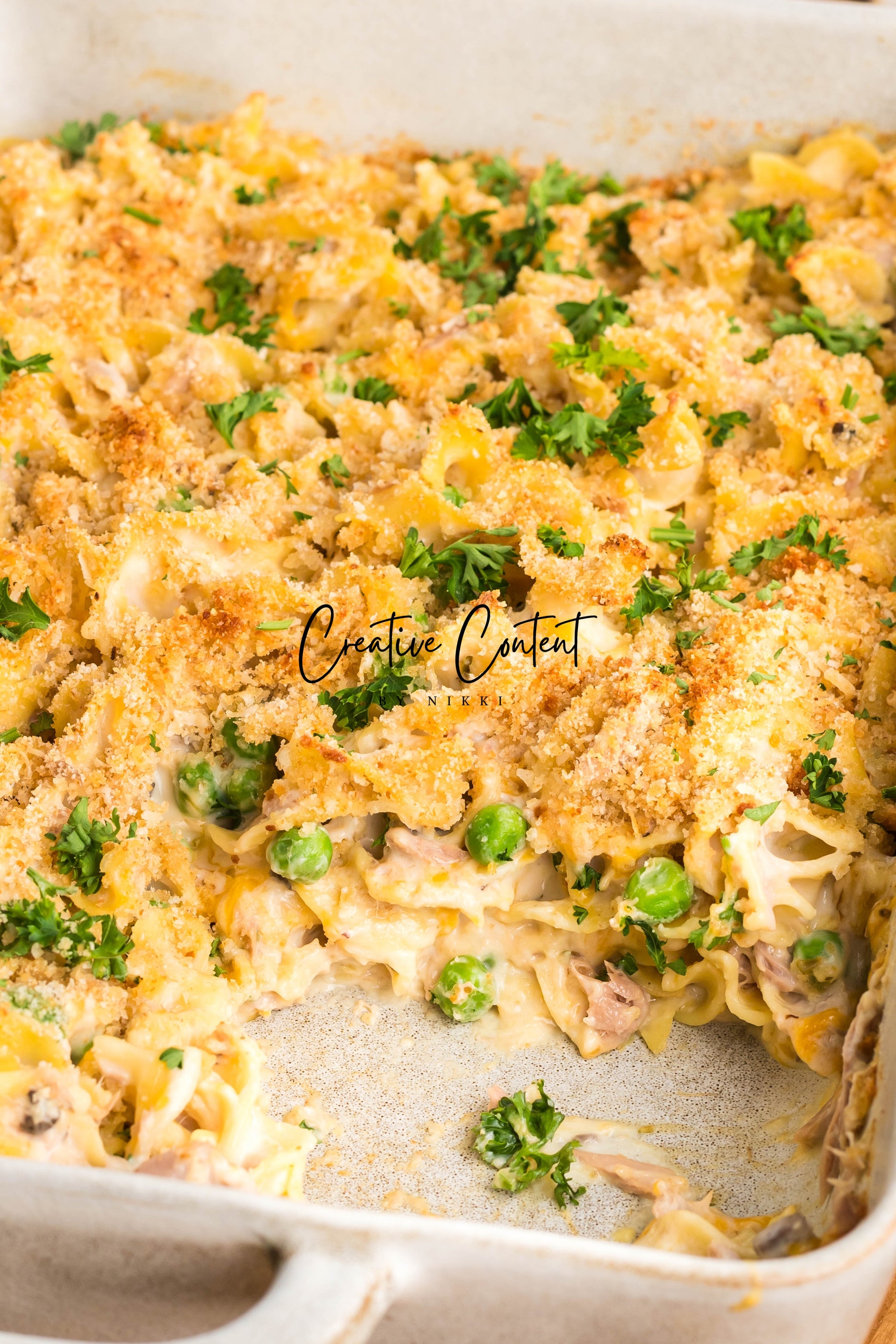 - Ingredients: Breadcrumbs, parmesan cheese, butter, egg noodles, mushroom soup, chicken soup, tuna, milk, peas, cheddar cheese, sour cream, lemon juice, parsley, onion powder, garlic powder, pepper, salt, parsley.