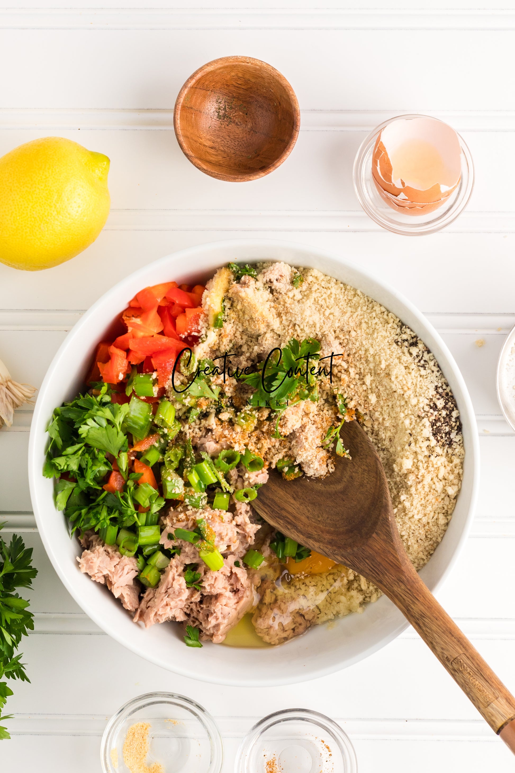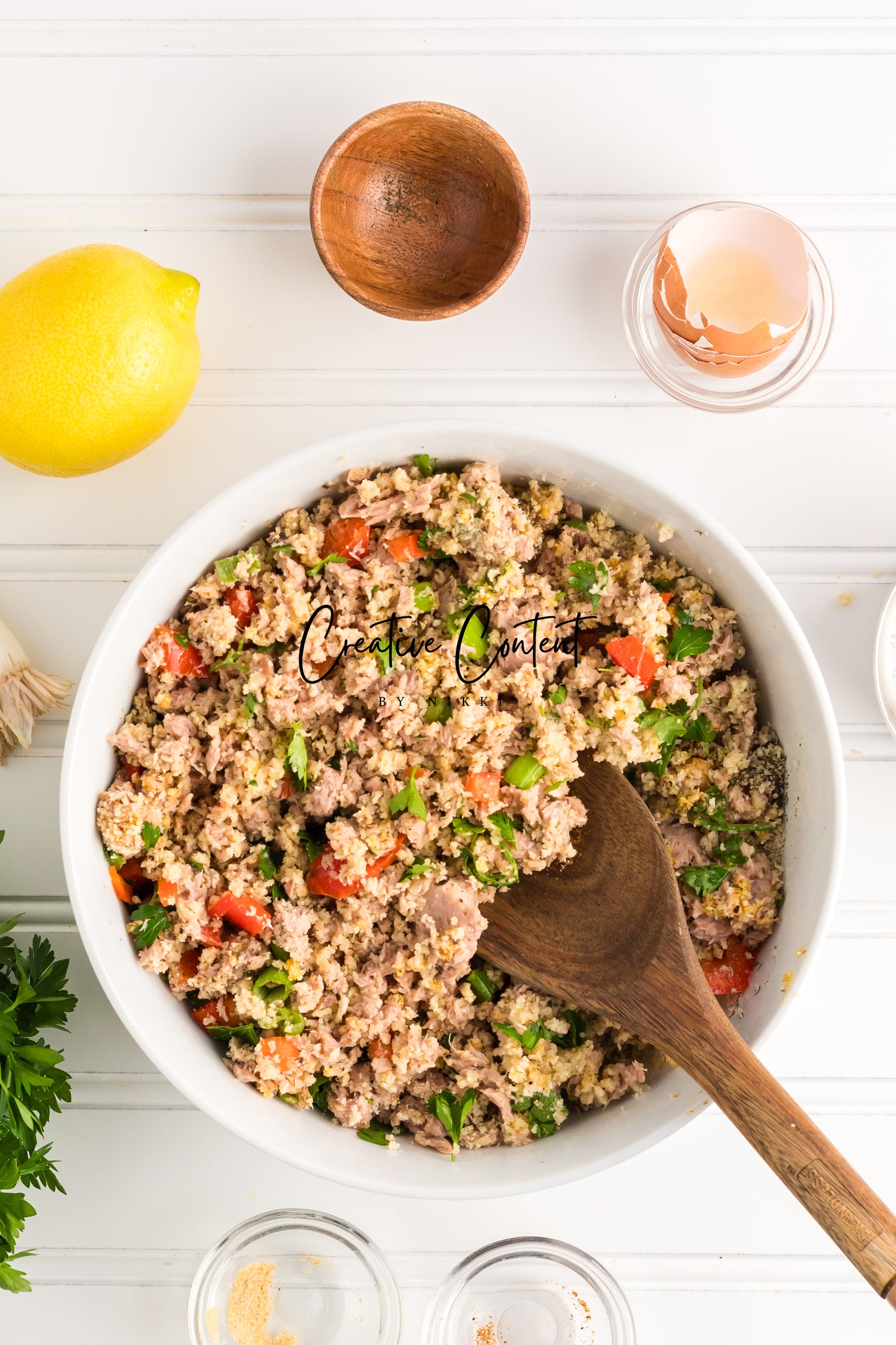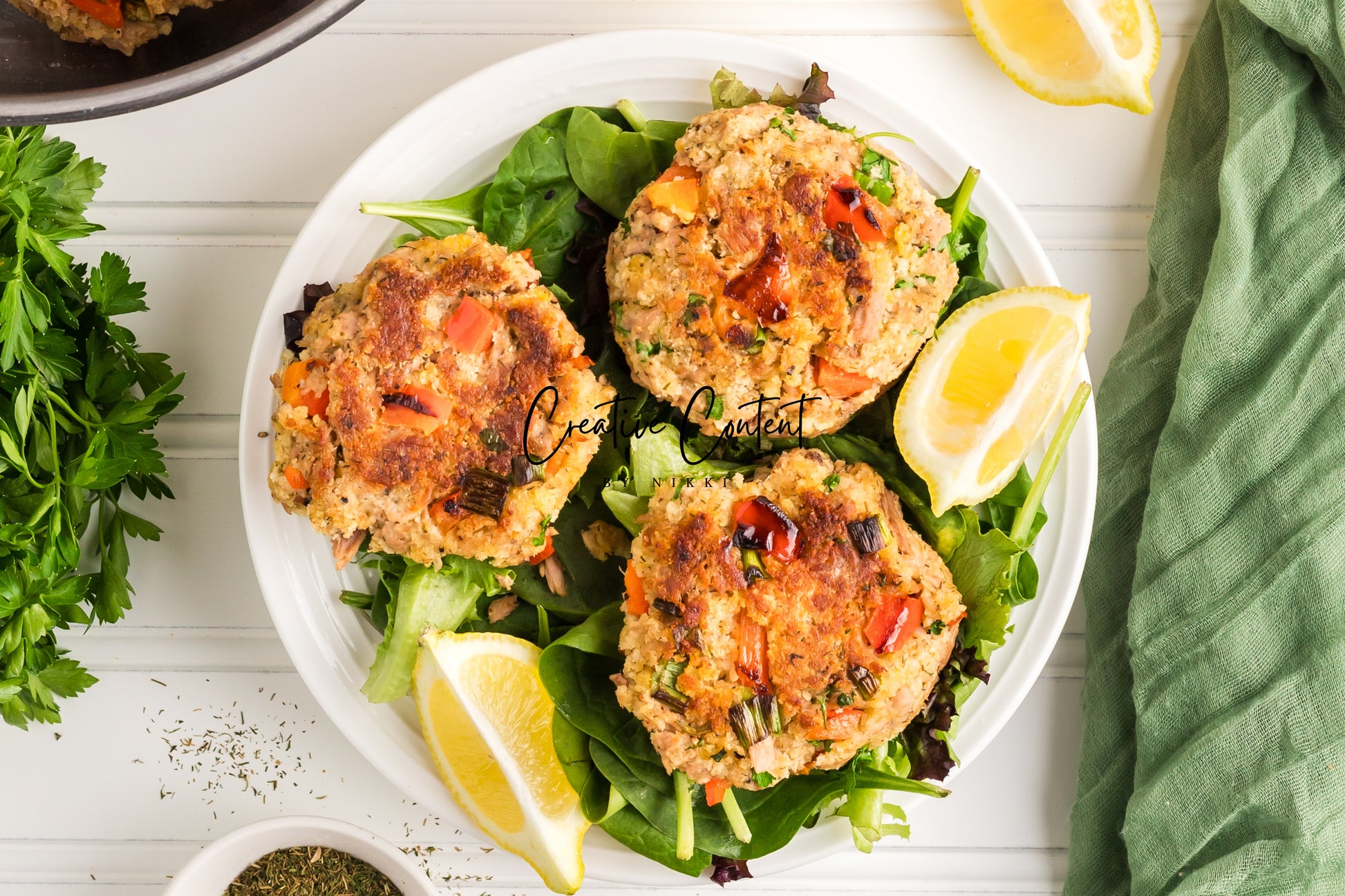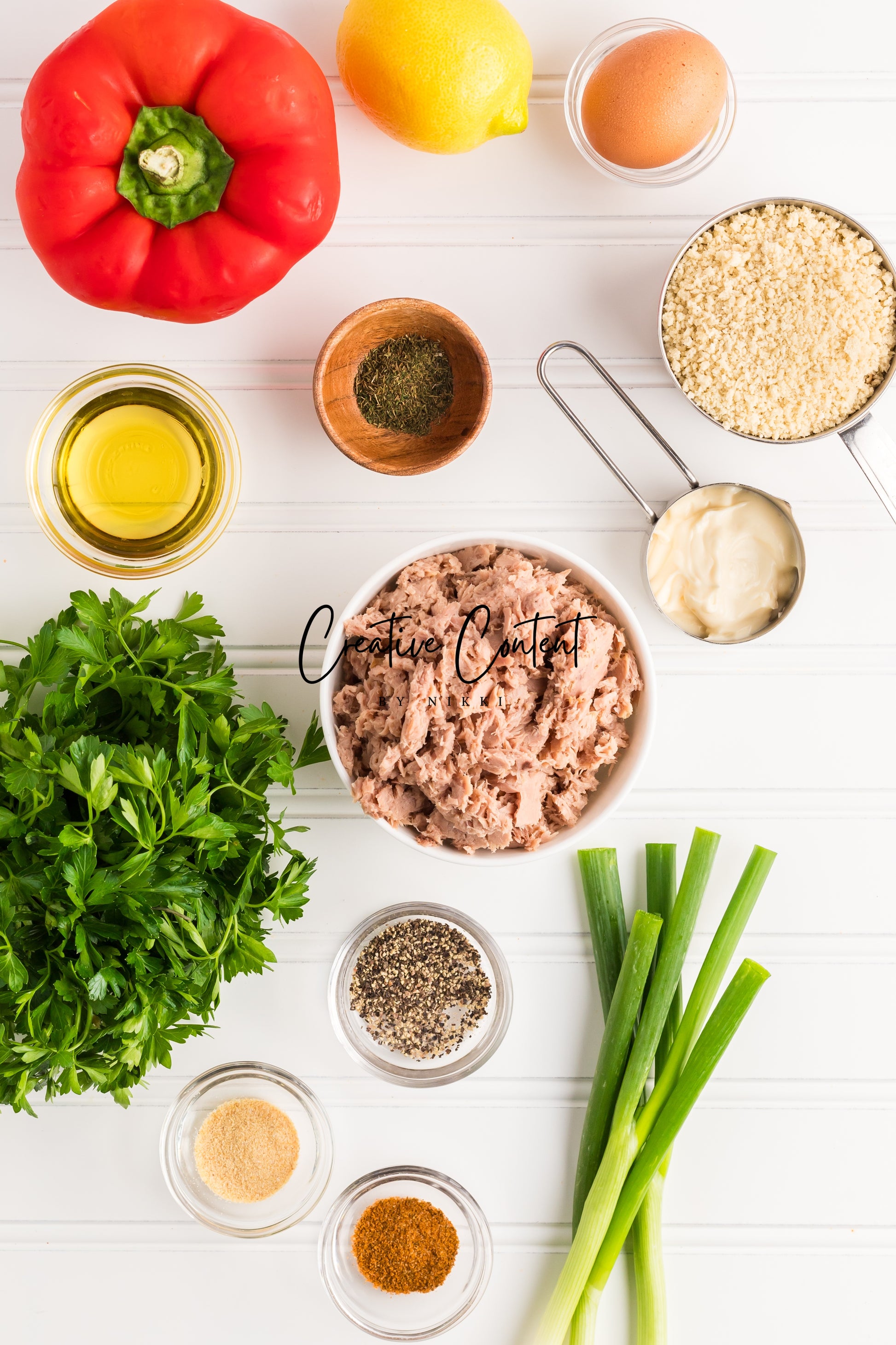 - Featured Ingredients; avocado oil, tuna, breadcrumbs, red bell peppers, mayonnaise, egg, parsley, lemon juice, old bay seasoning, garlic powder, dill weed, black pepper, and green onions.