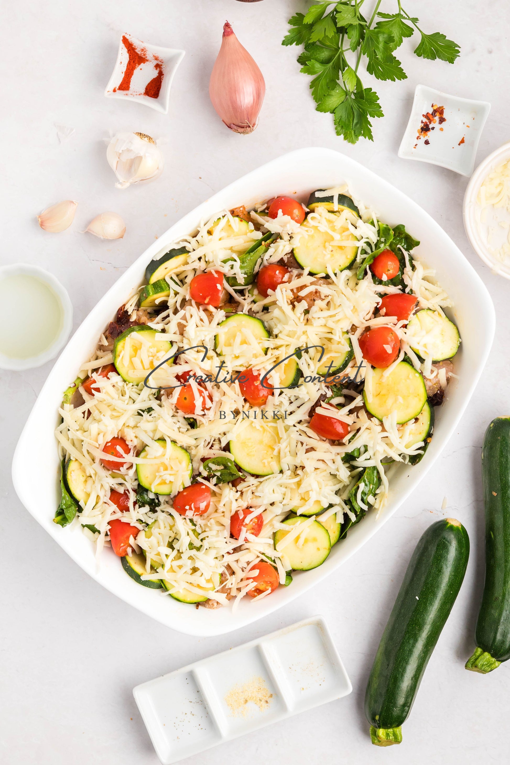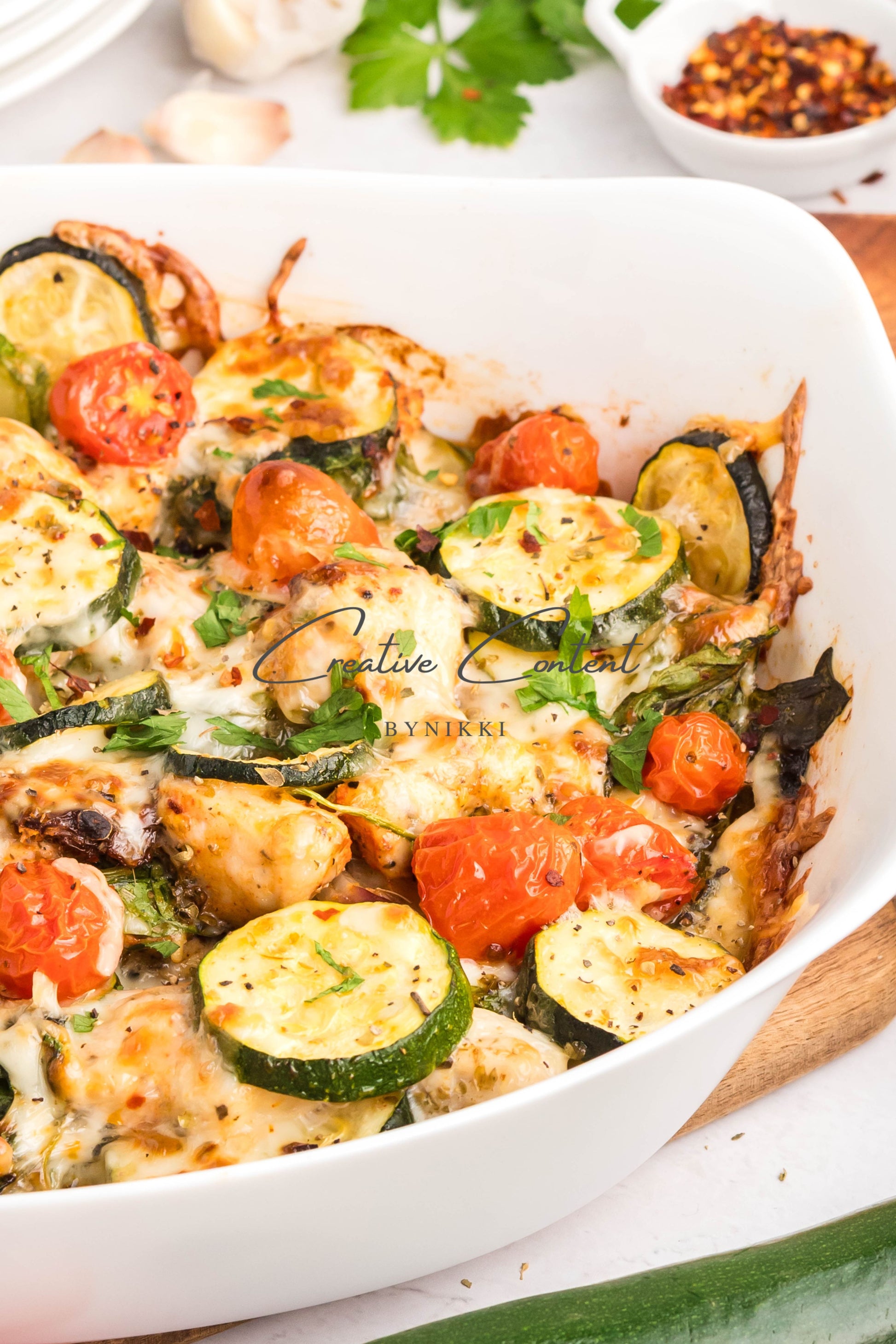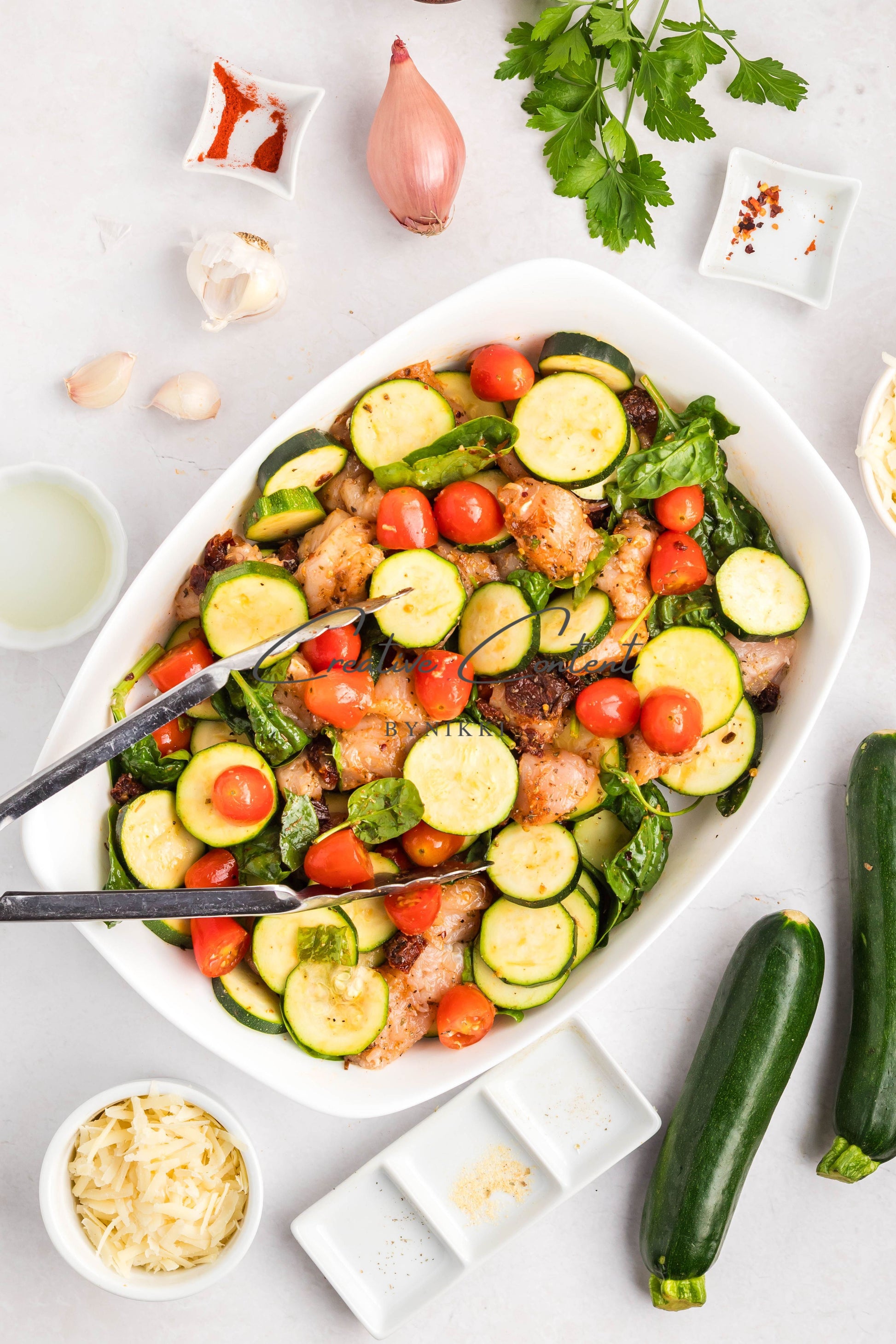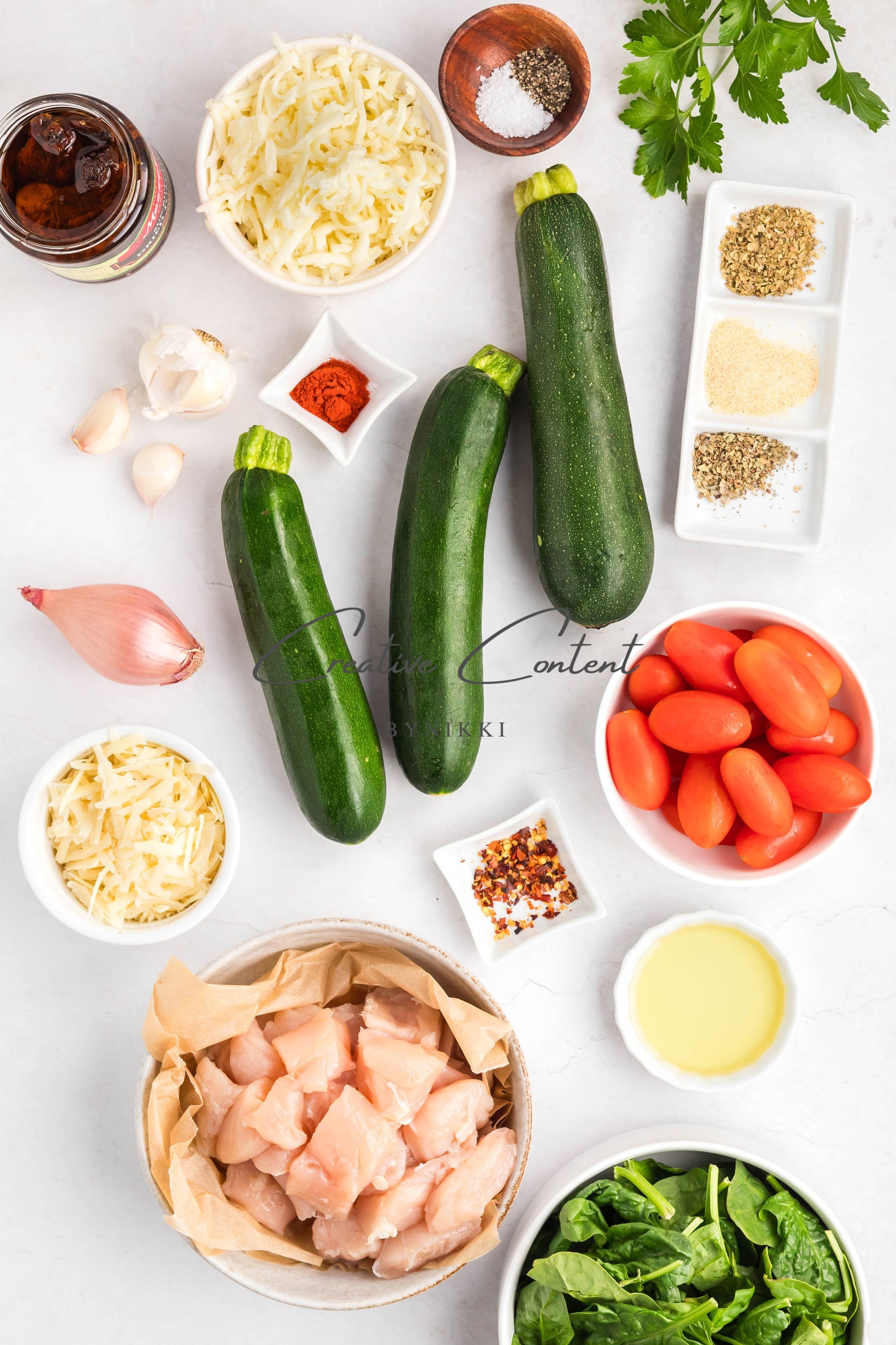 - Ingredients: chicken, zucchini, spinach, cherry tomatoes, sundried tomatoes, shallots, garlic, olive oil, oregano, basil, paprika, garlic powder, salt, black pepper, red pepper flakes, Parmesan cheese, mozzarella cheese, parsley