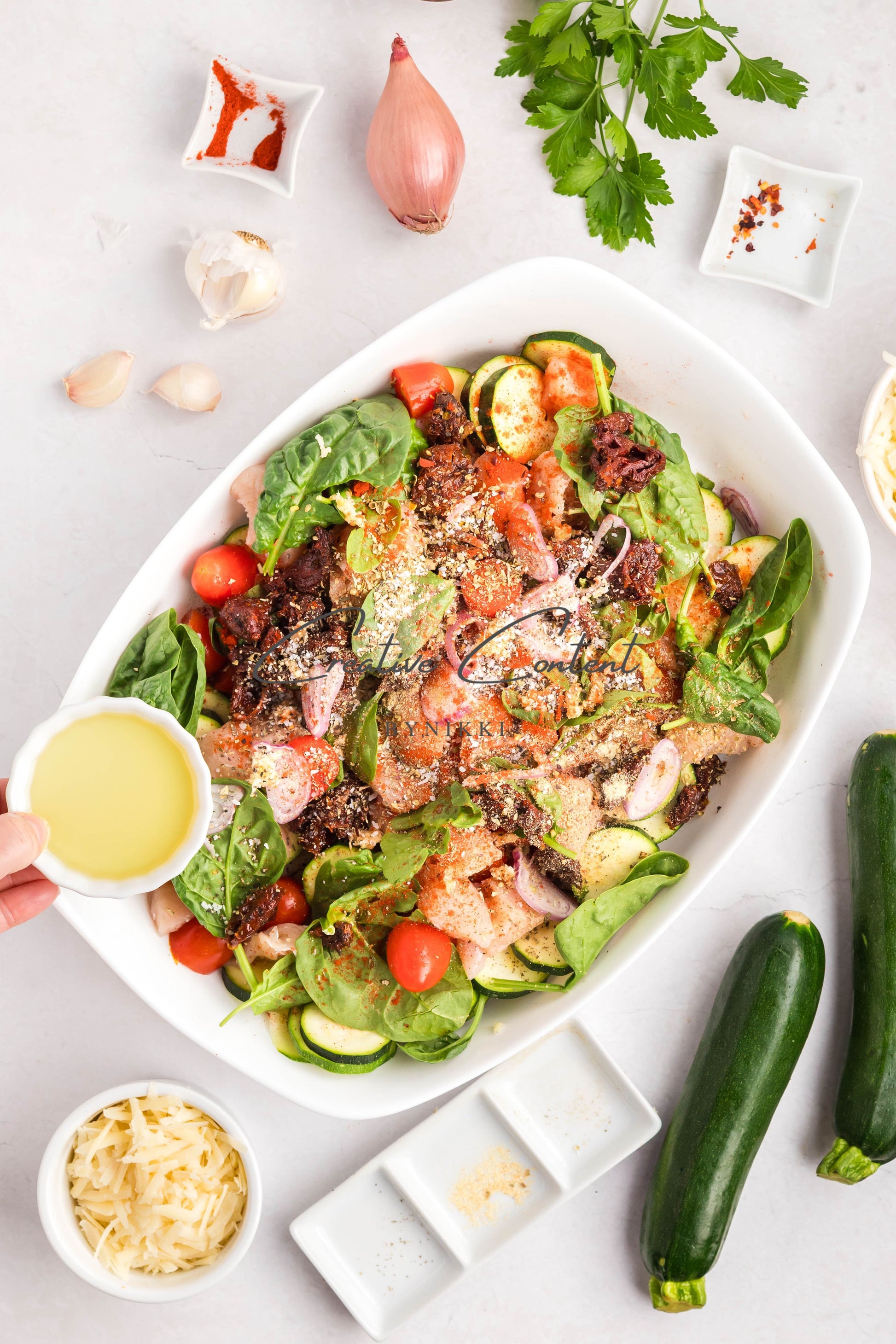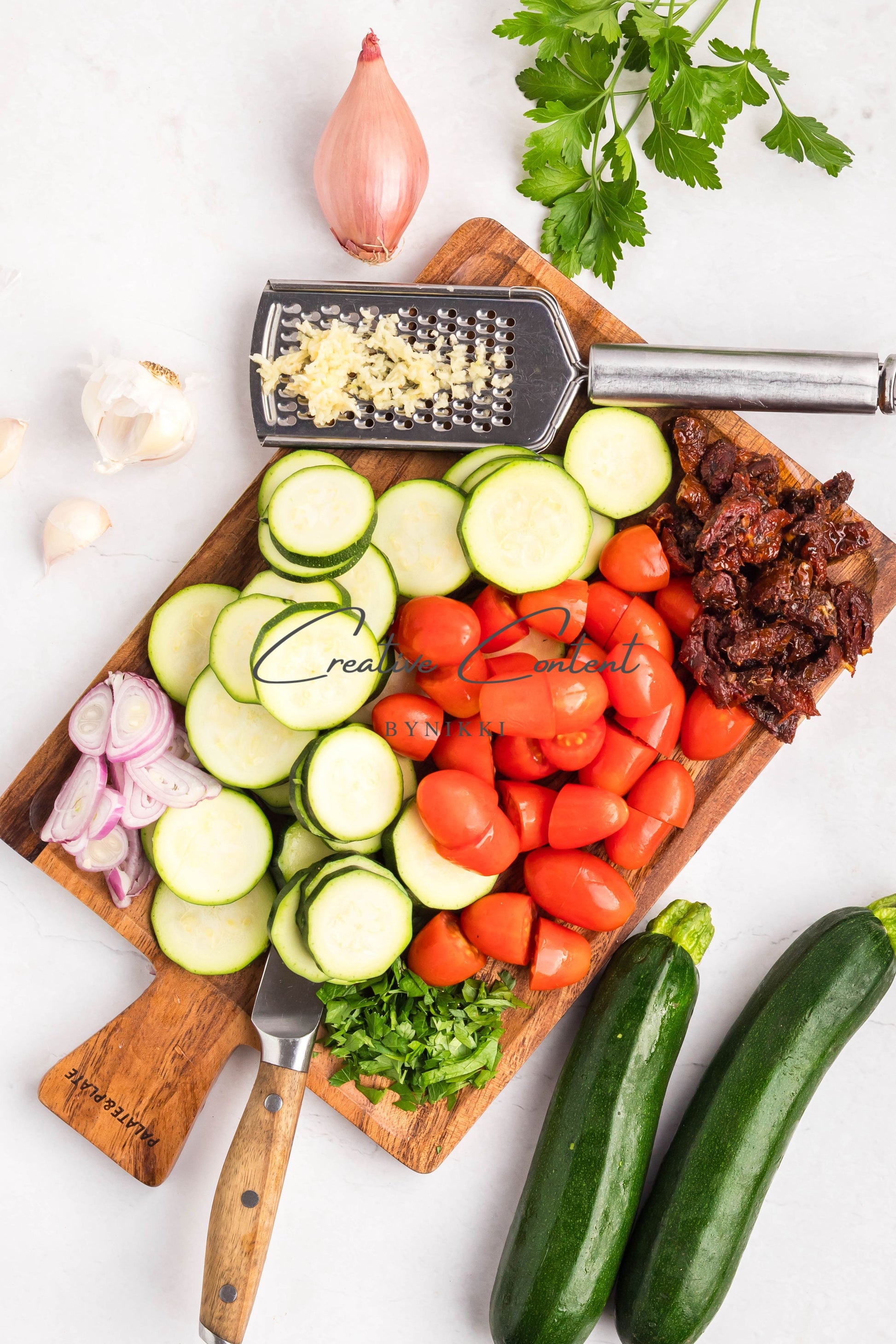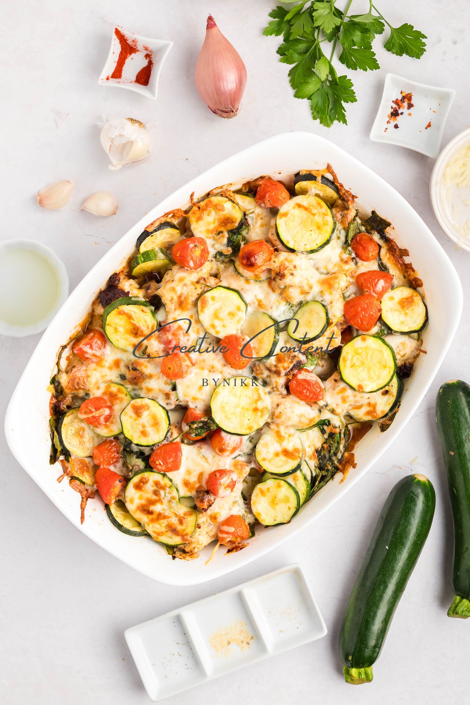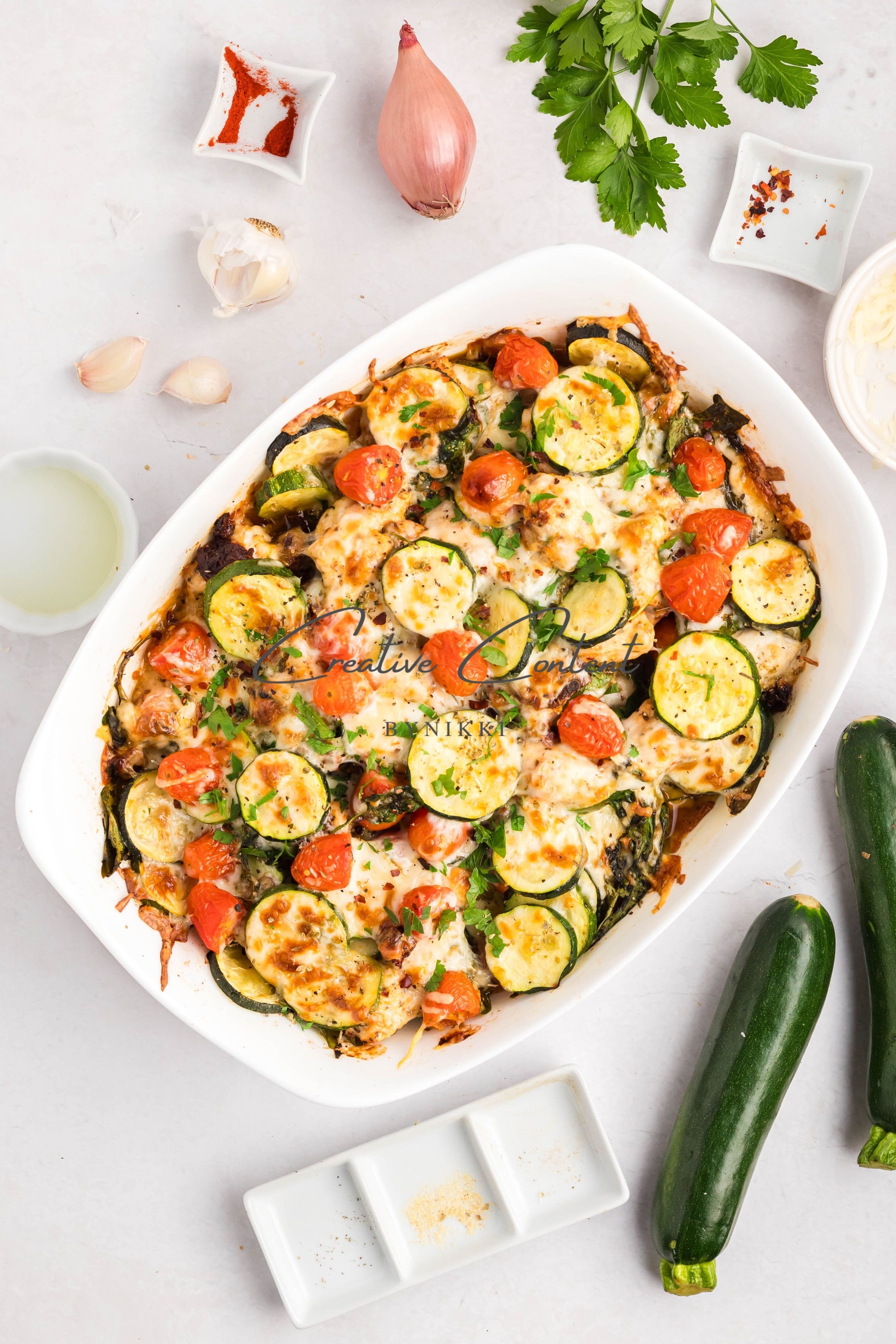 - Ingredients: chicken, zucchini, spinach, cherry tomatoes, sundried tomatoes, shallots, garlic, olive oil, oregano, basil, paprika, garlic powder, salt, black pepper, red pepper flakes, Parmesan cheese, mozzarella cheese, parsley