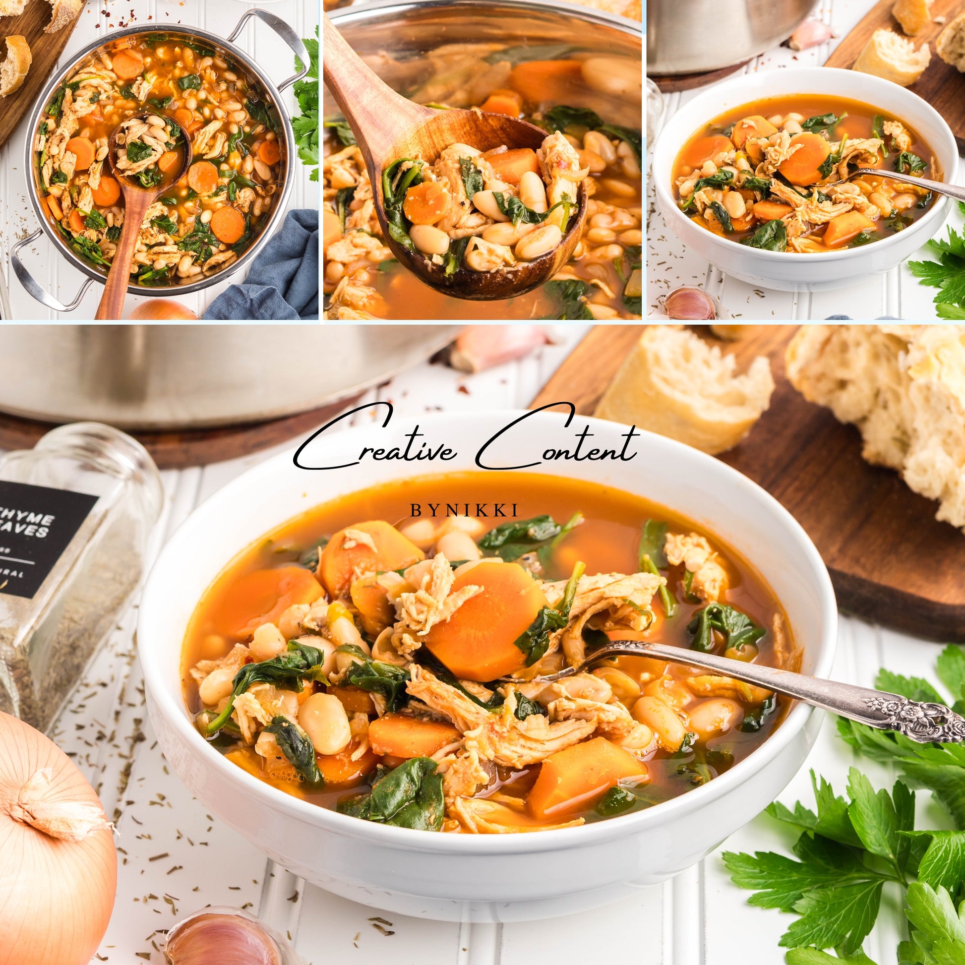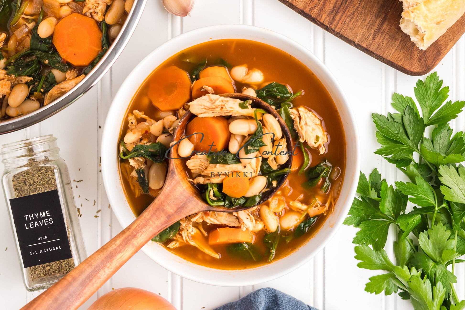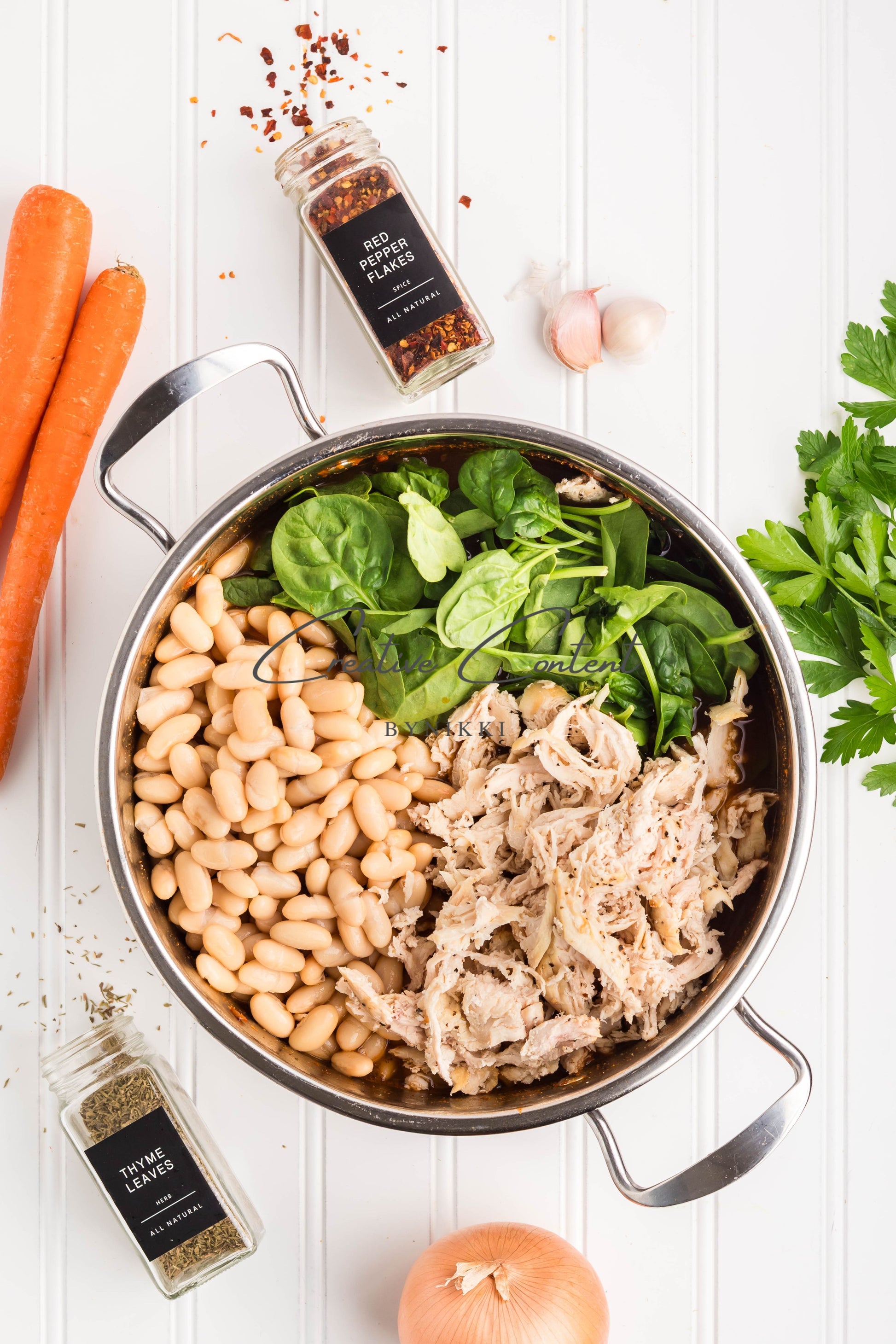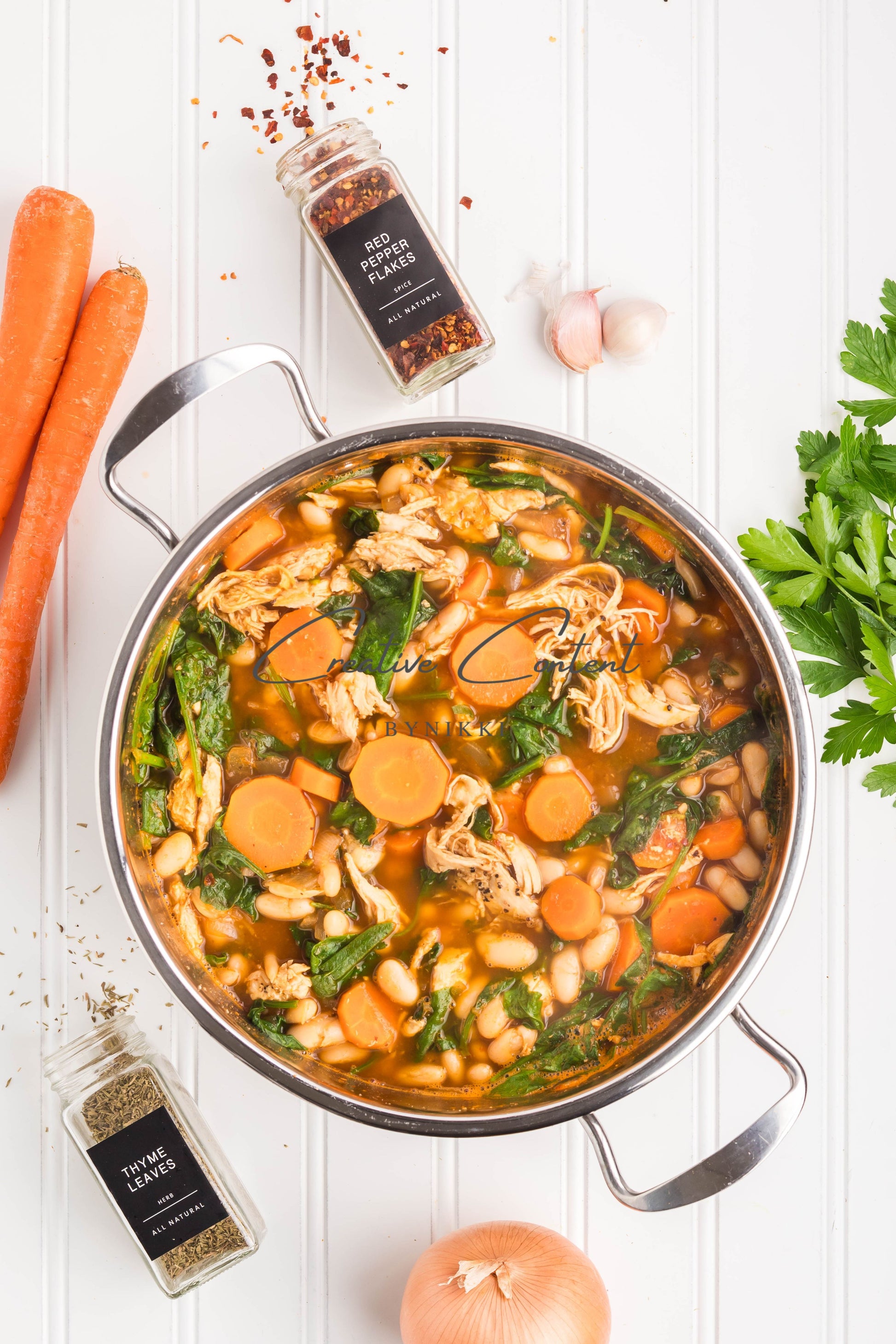 - Ingredients: avocado oil, onion, carrots, garlic, low-sodium chicken stock, fresh thyme leaves, chopped parsley, coarse kosher salt, black pepper, red pepper flakes, oregano, garlic powder, onion powder, cannellini beans, cooked chicken, spinach, parsley