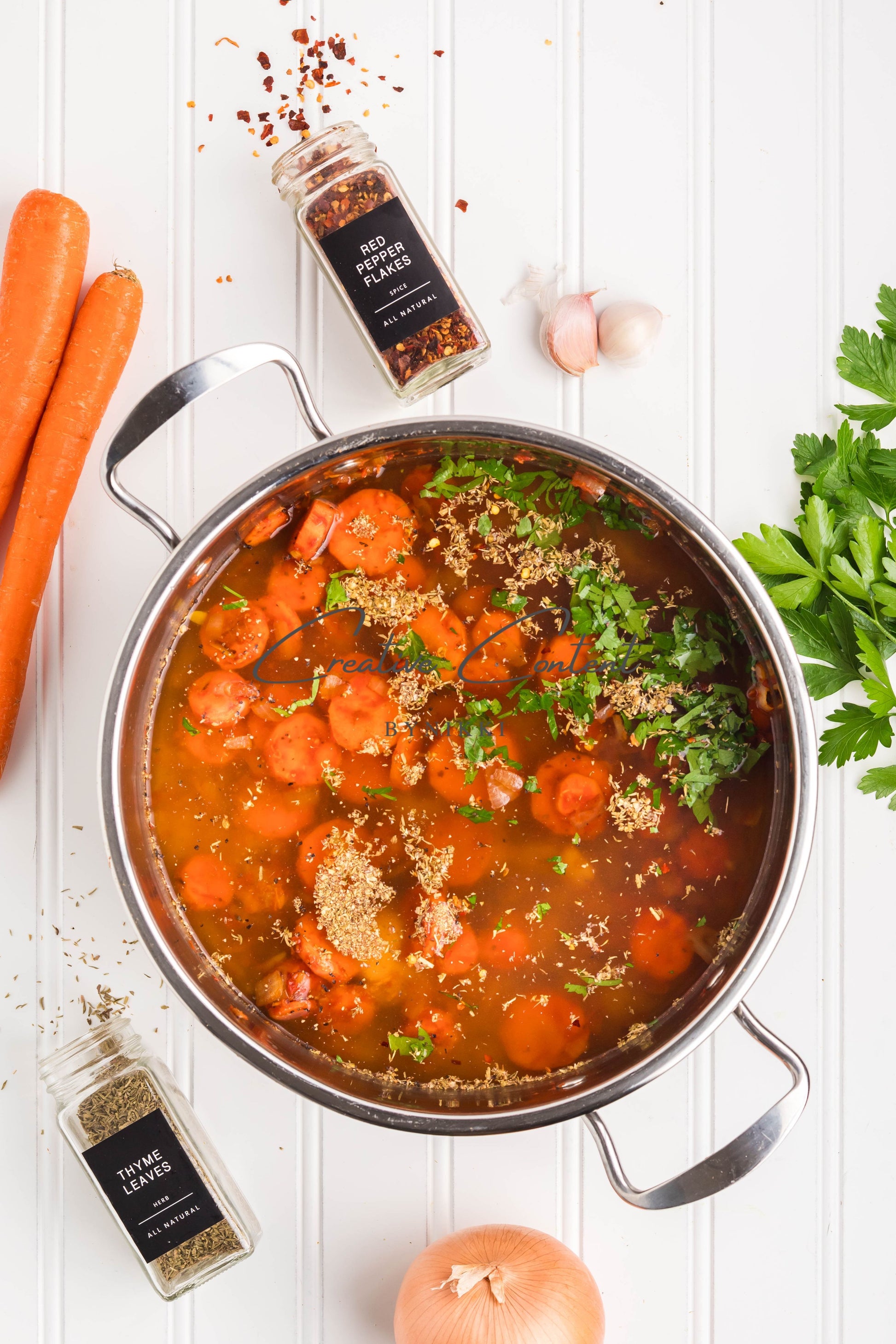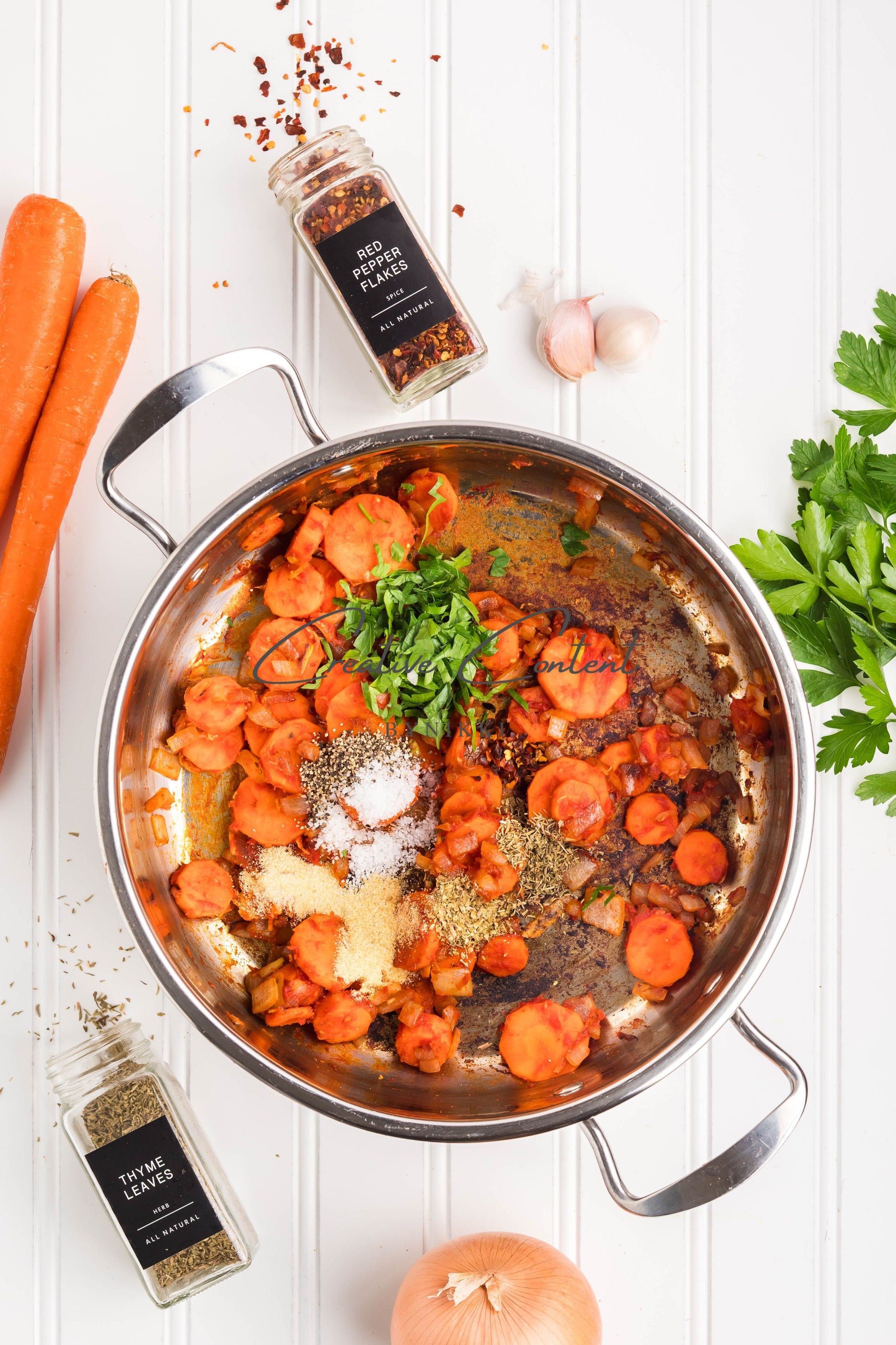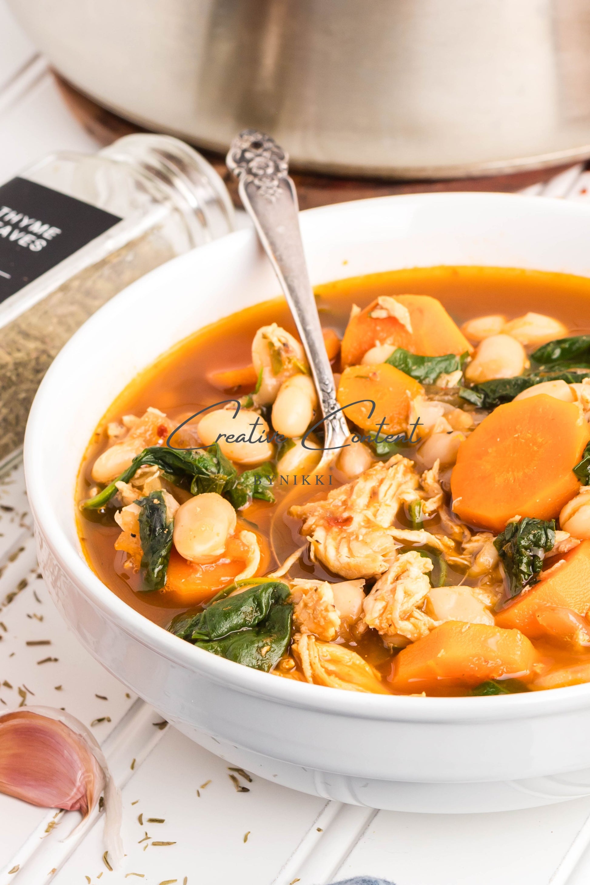 - Ingredients: avocado oil, onion, carrots, garlic, low-sodium chicken stock, fresh thyme leaves, chopped parsley, coarse kosher salt, black pepper, red pepper flakes, oregano, garlic powder, onion powder, cannellini beans, cooked chicken, spinach, parsley