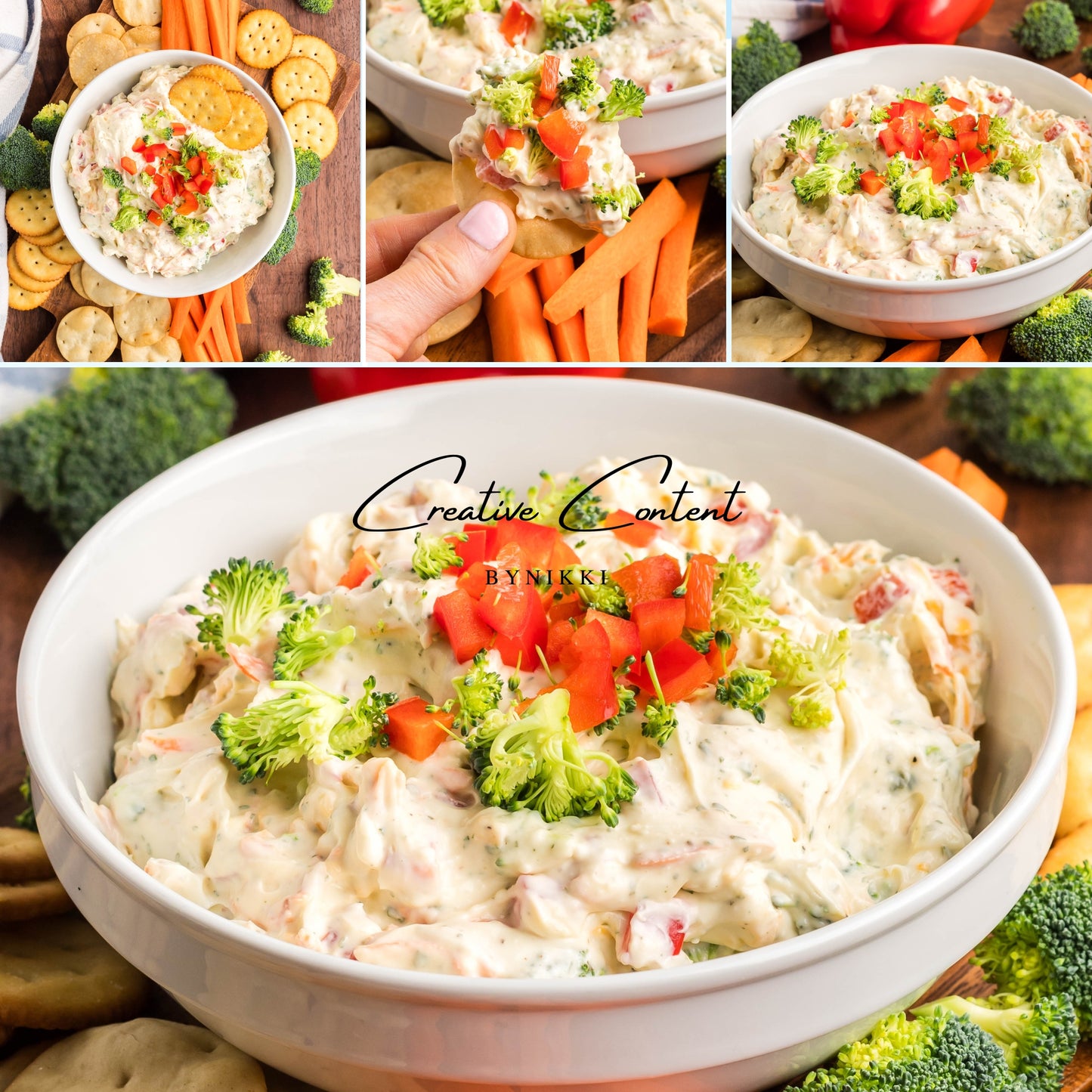- Ingredients: cream cheese, sour cream, mayonnaise, ranch seasoning mix, shredded cheddar cheese, finely chopped red bell pepper, finely chopped broccoli, shredded carrots
