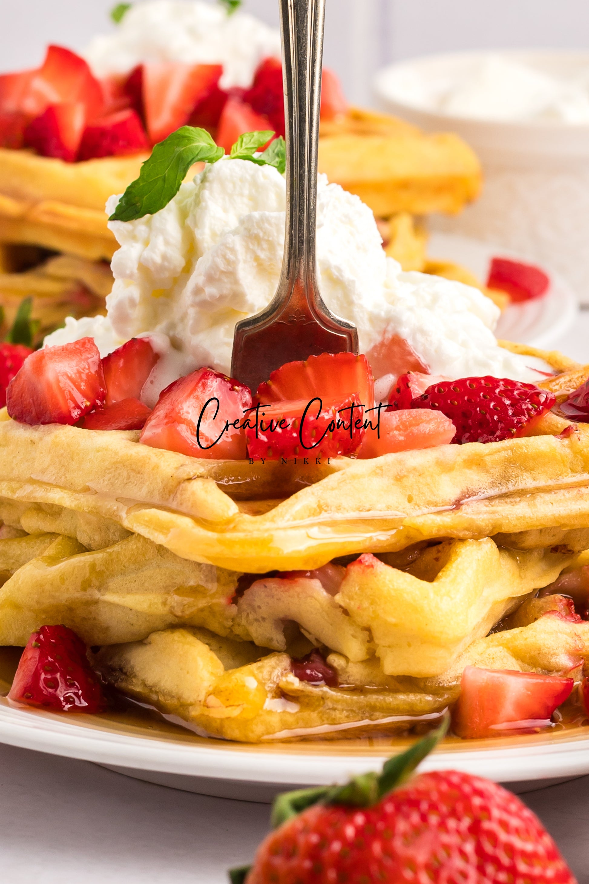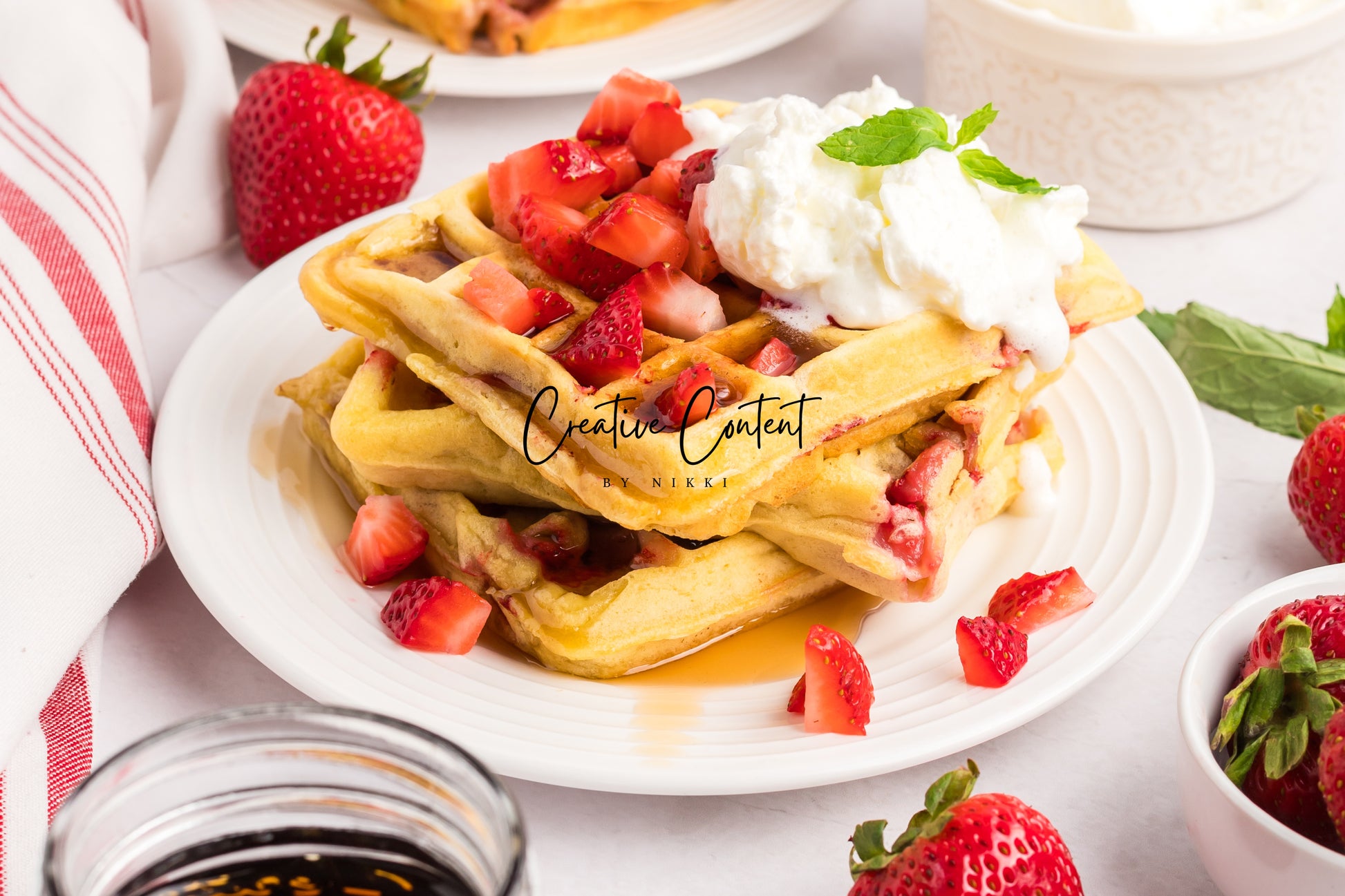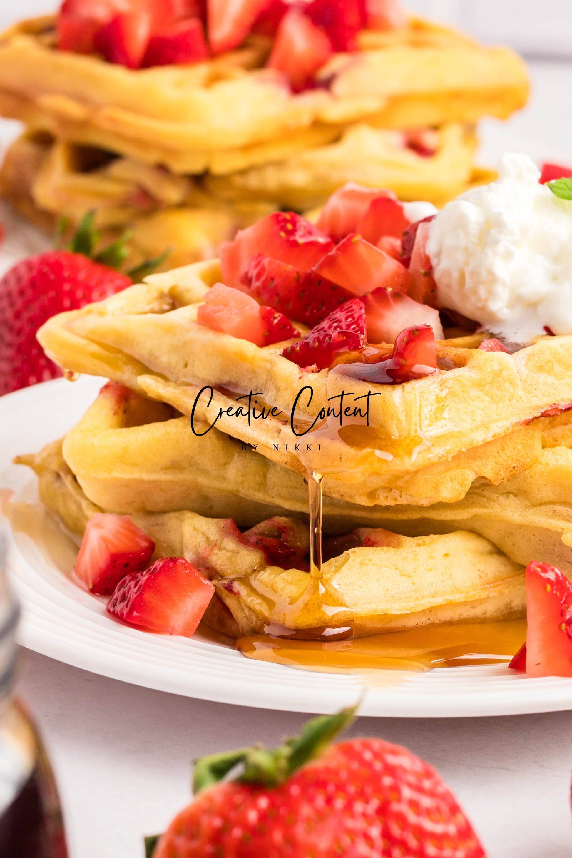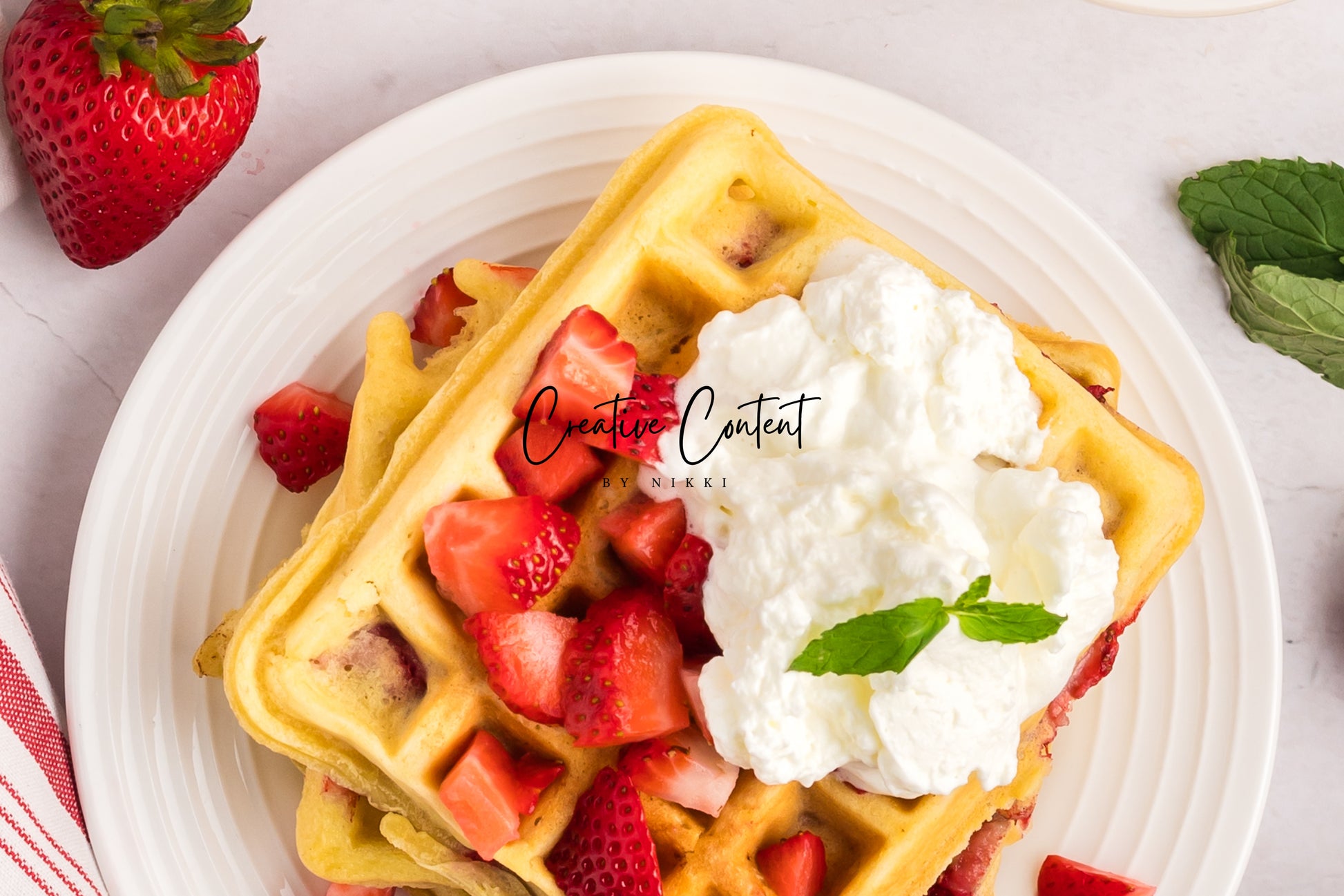 This recipe for waffles with strawberries is loaded with sweet strawberries. The golden waffles are crunchy on the outside and soft and pillowy on the inside. This is a great waffle for your next brunch.