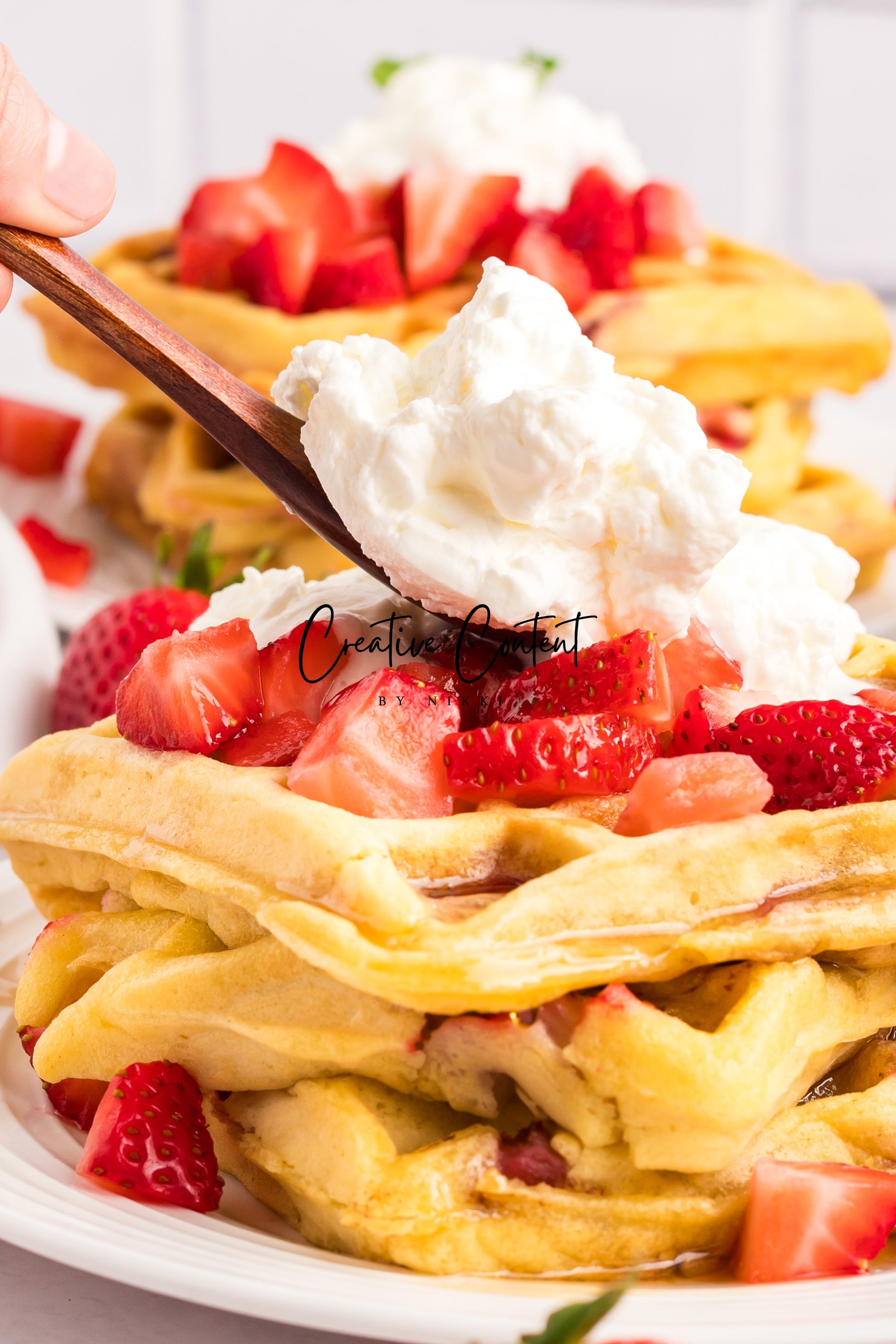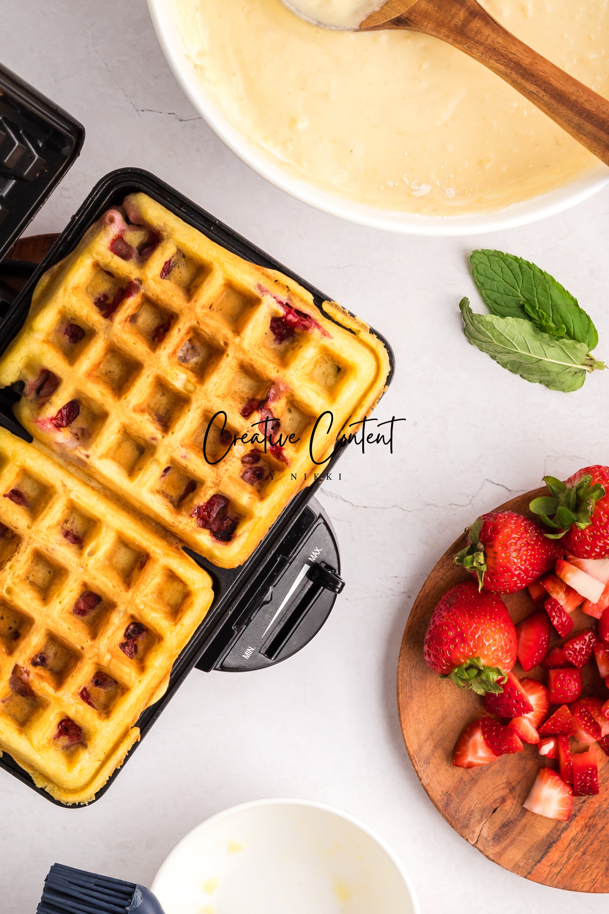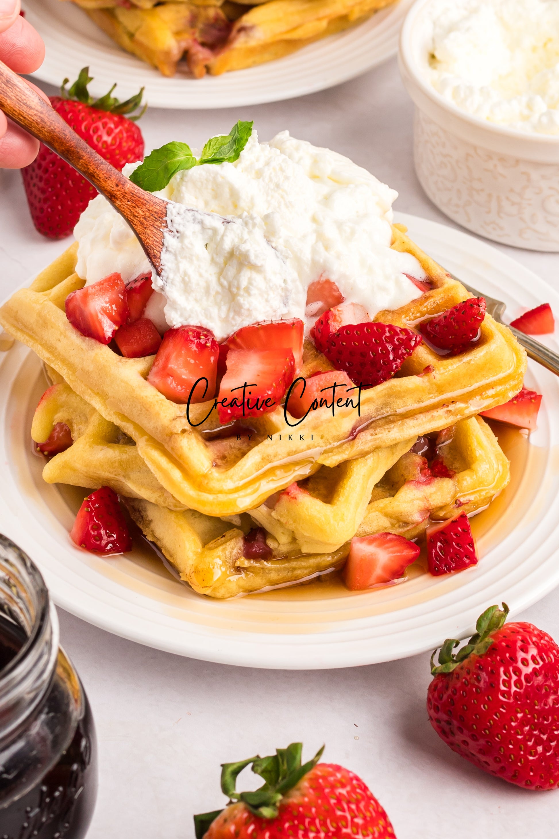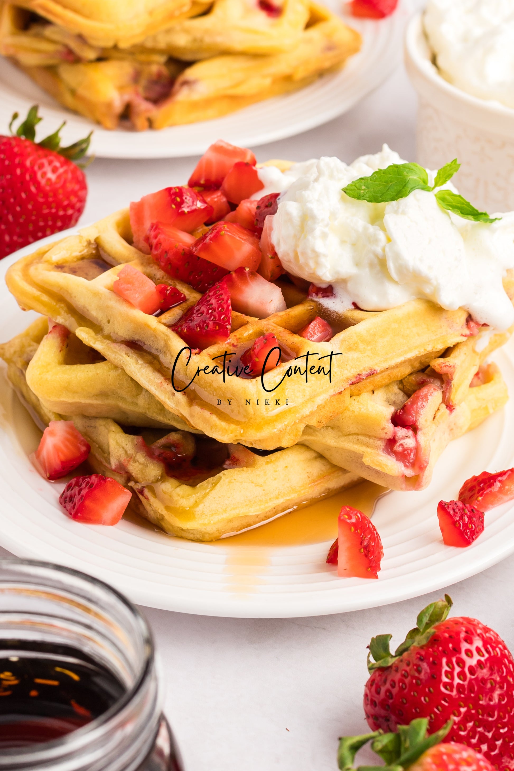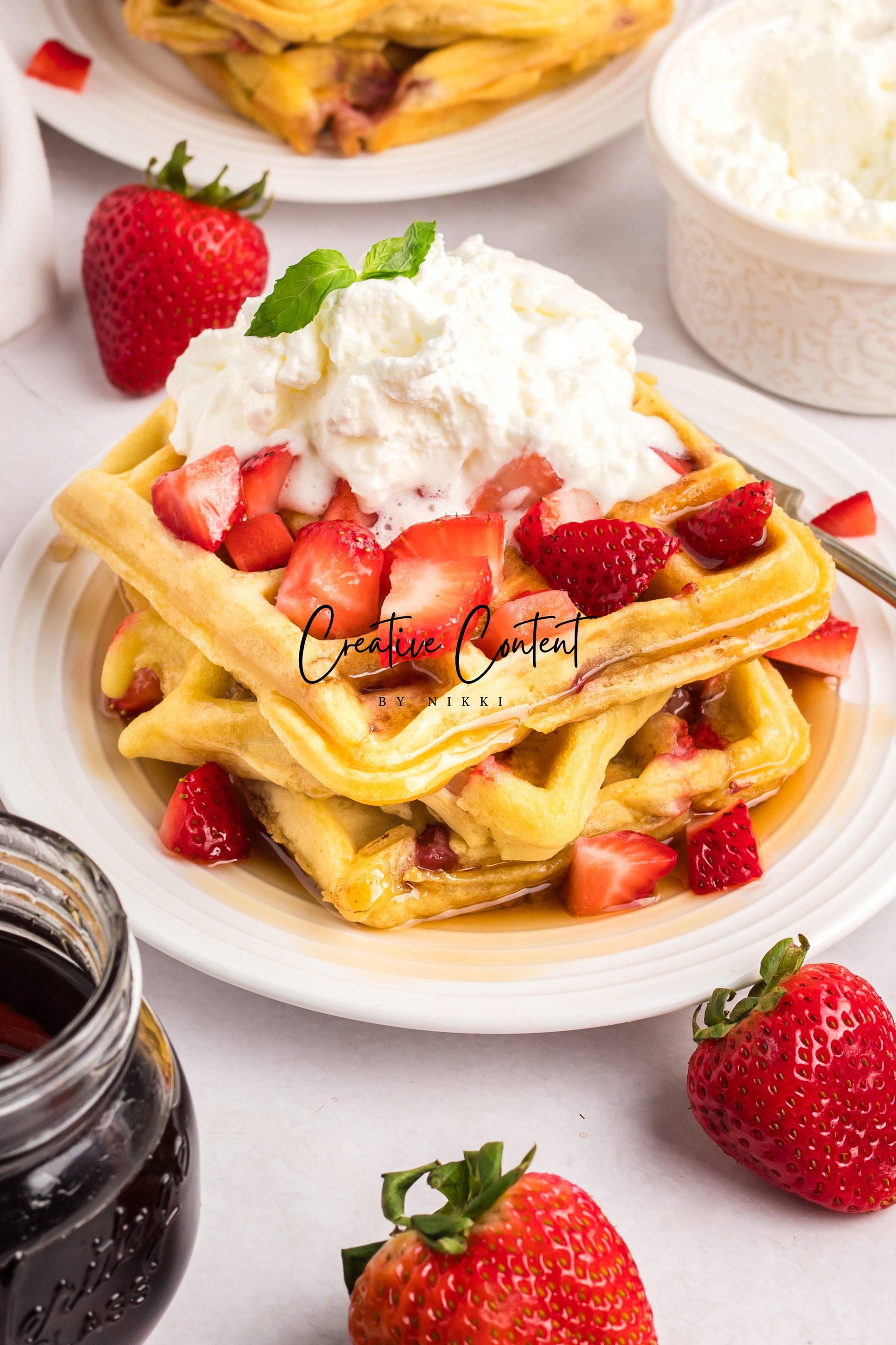 This recipe for waffles with strawberries is loaded with sweet strawberries. The golden waffles are crunchy on the outside and soft and pillowy on the inside. This is a great waffle for your next brunch.