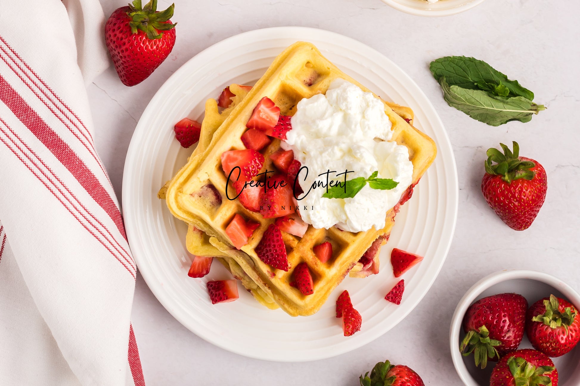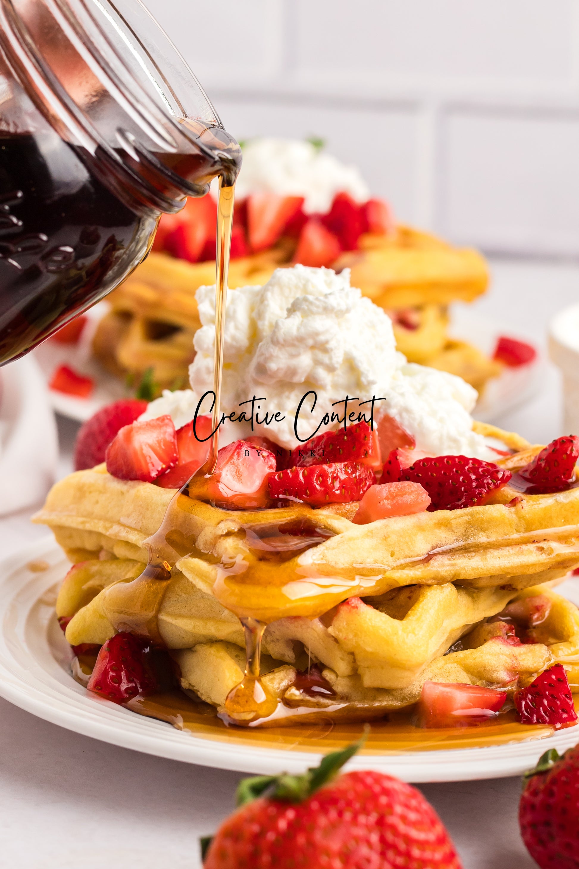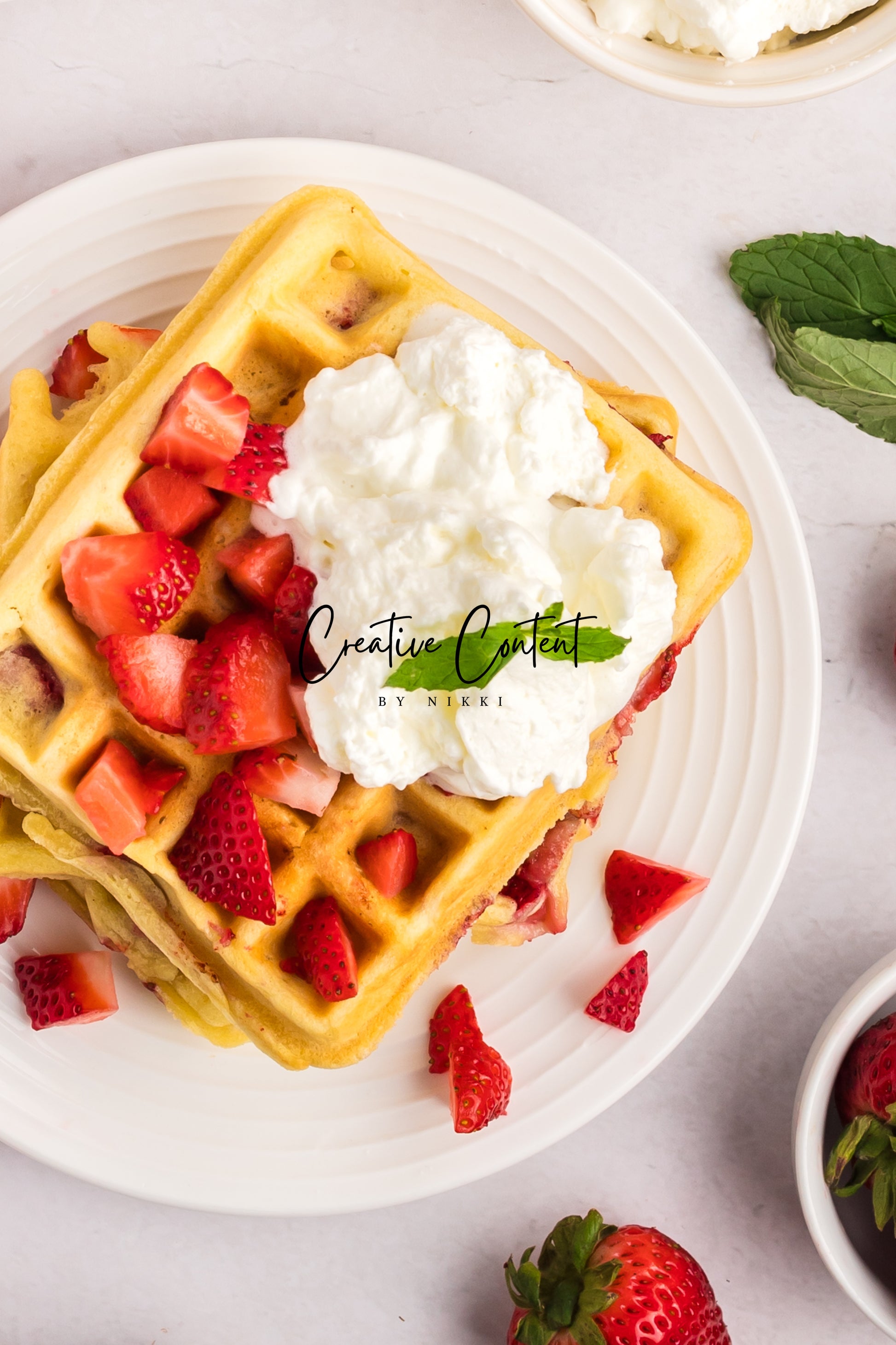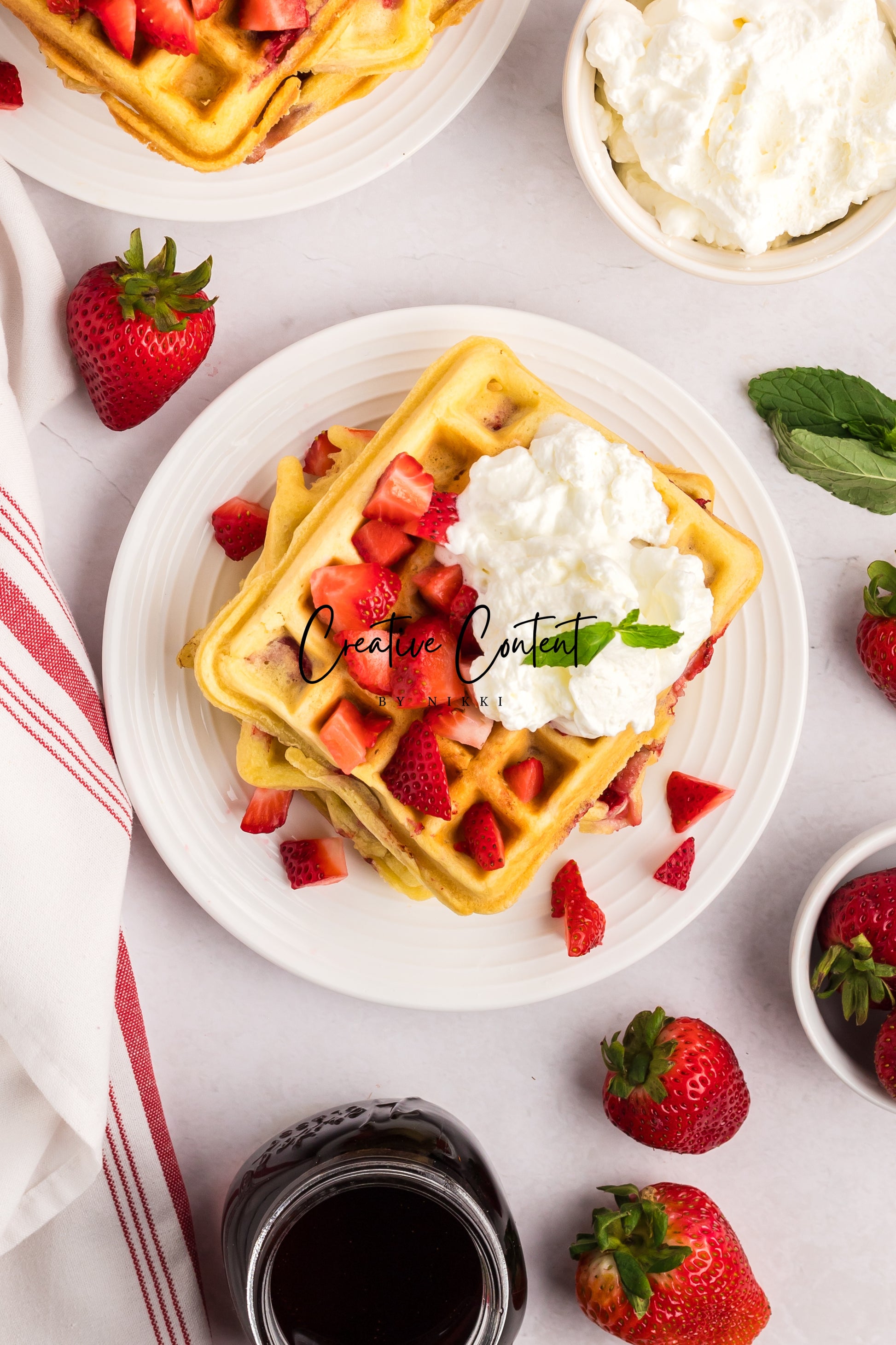 This recipe for waffles with strawberries is loaded with sweet strawberries. The golden waffles are crunchy on the outside and soft and pillowy on the inside. This is a great waffle for your next brunch.