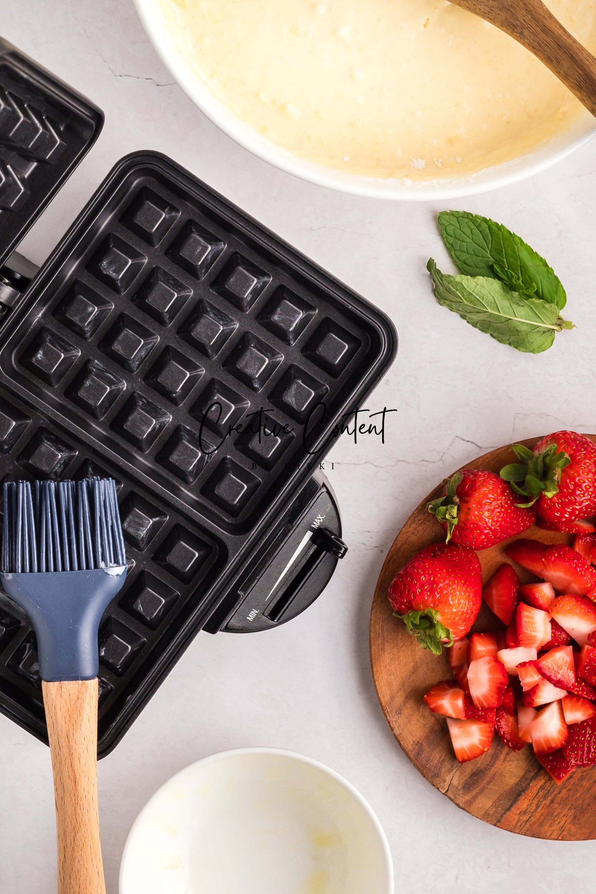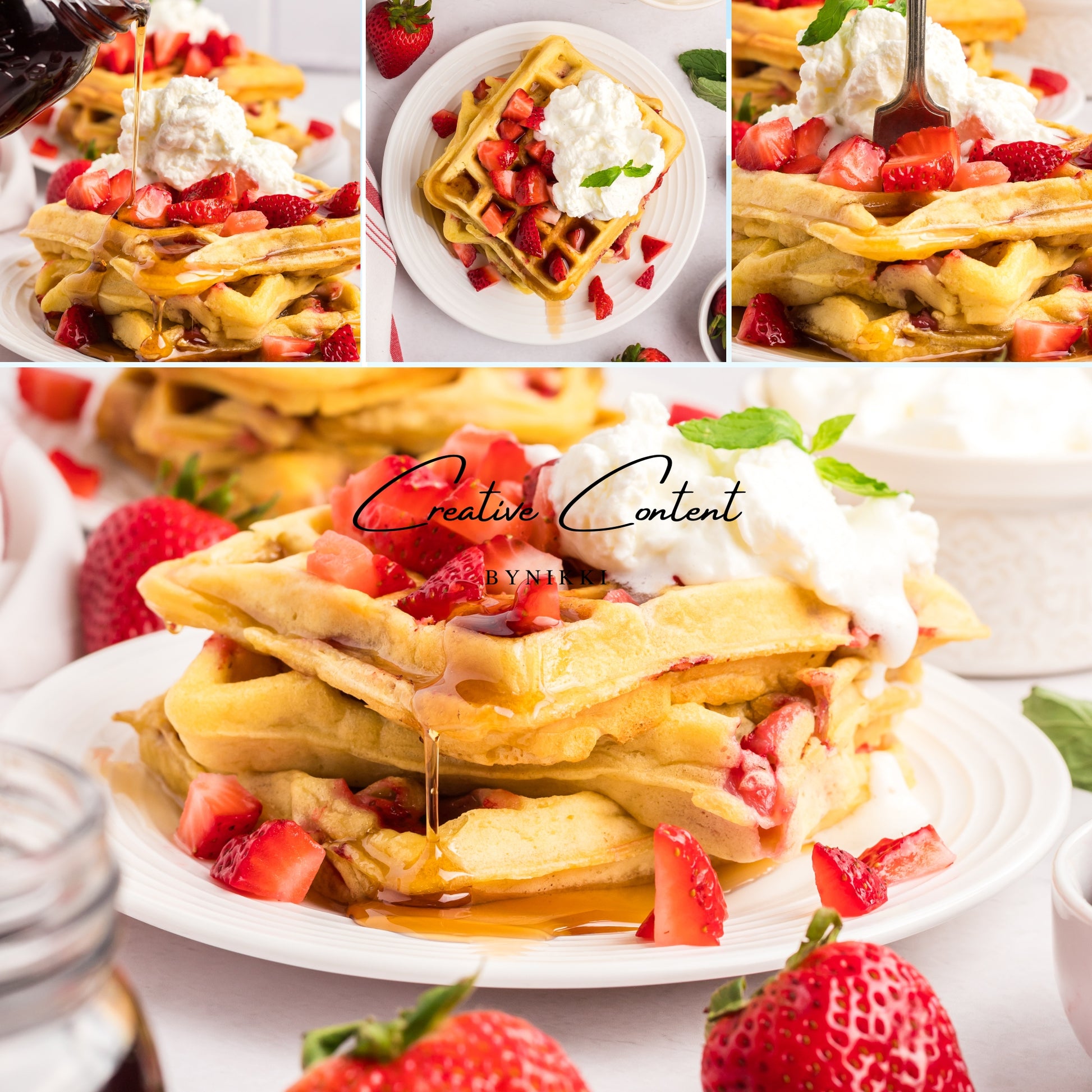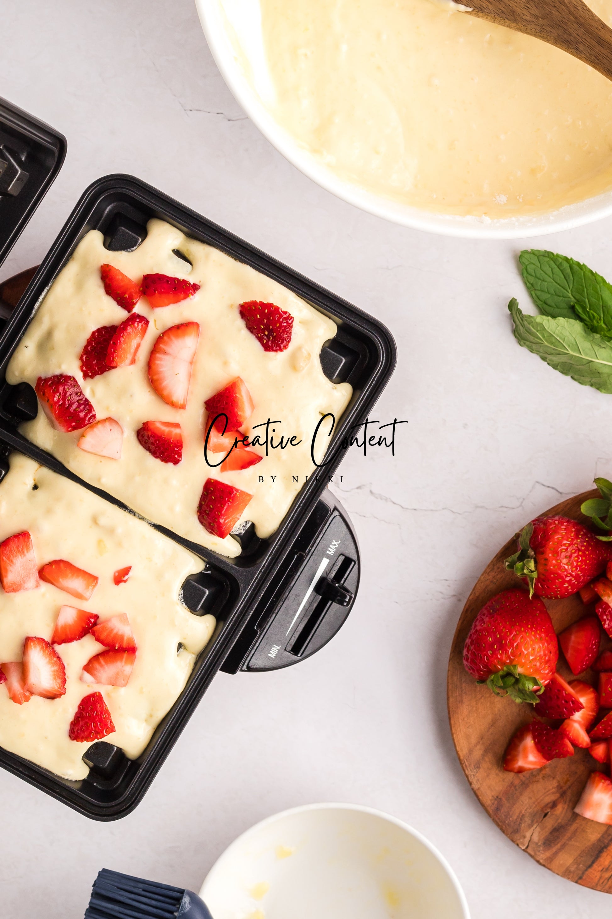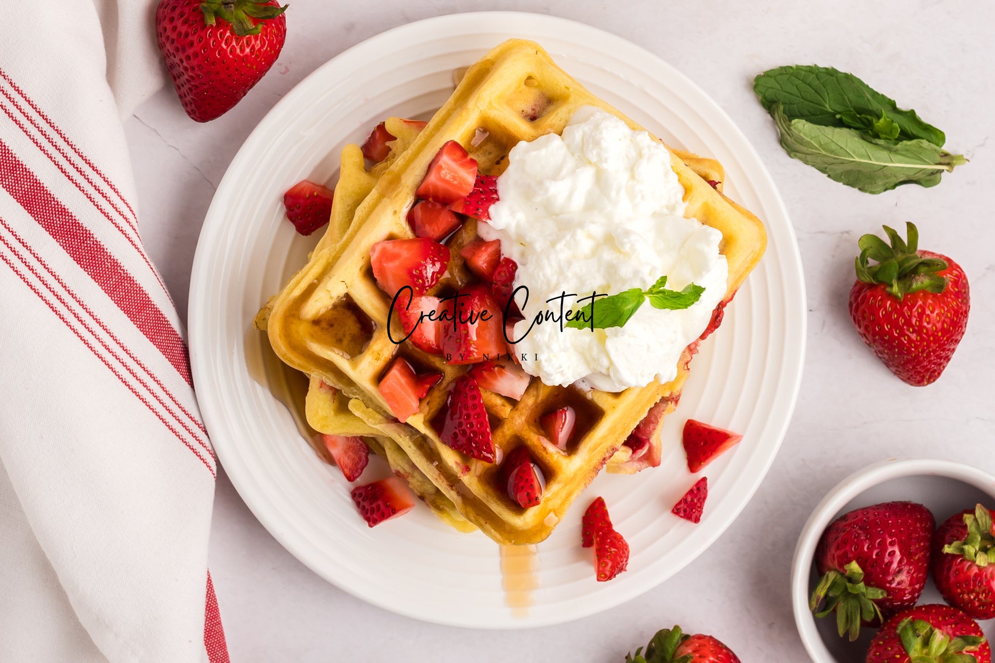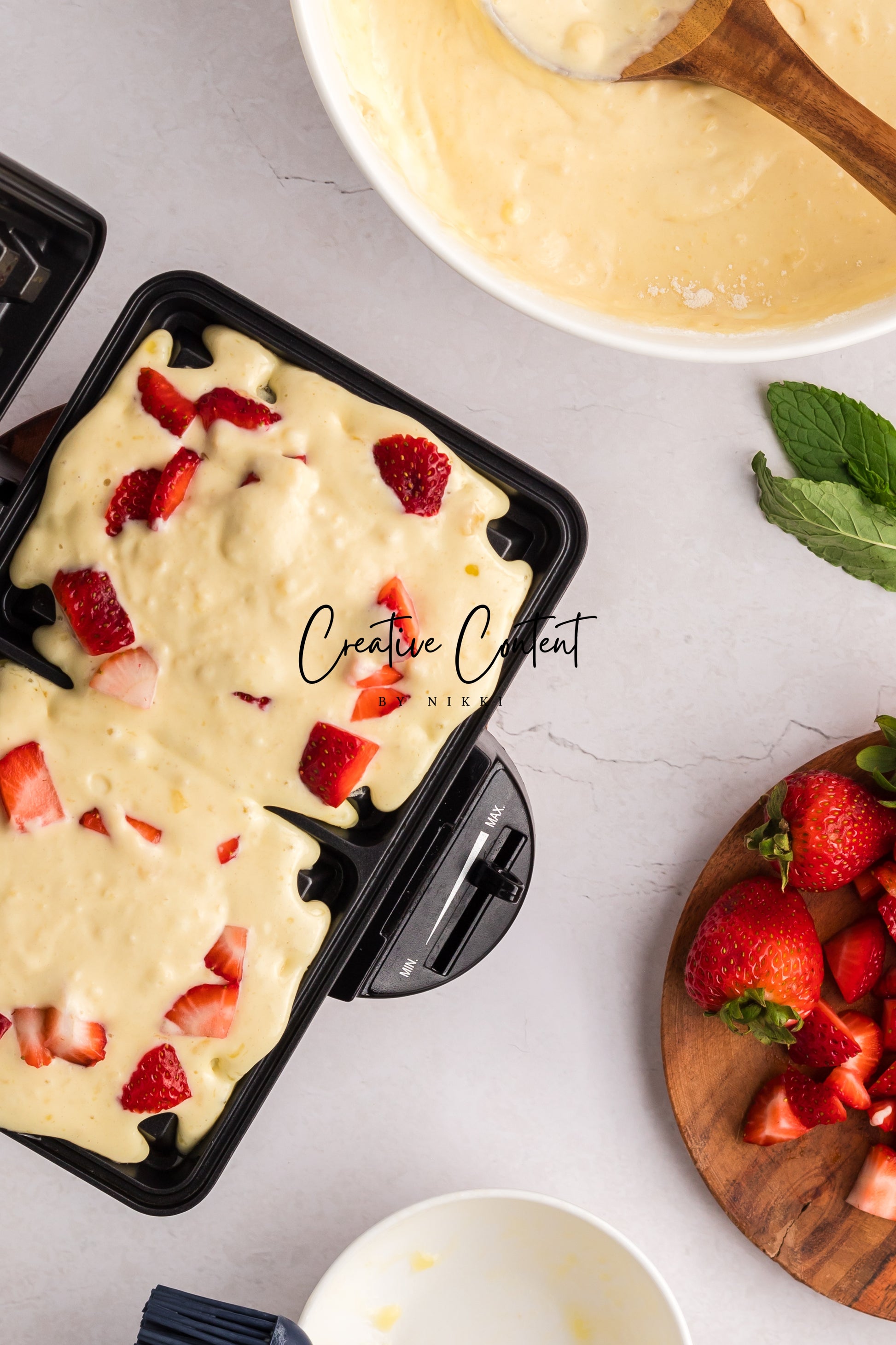 This recipe for waffles with strawberries is loaded with sweet strawberries. The golden waffles are crunchy on the outside and soft and pillowy on the inside. This is a great waffle for your next brunch.