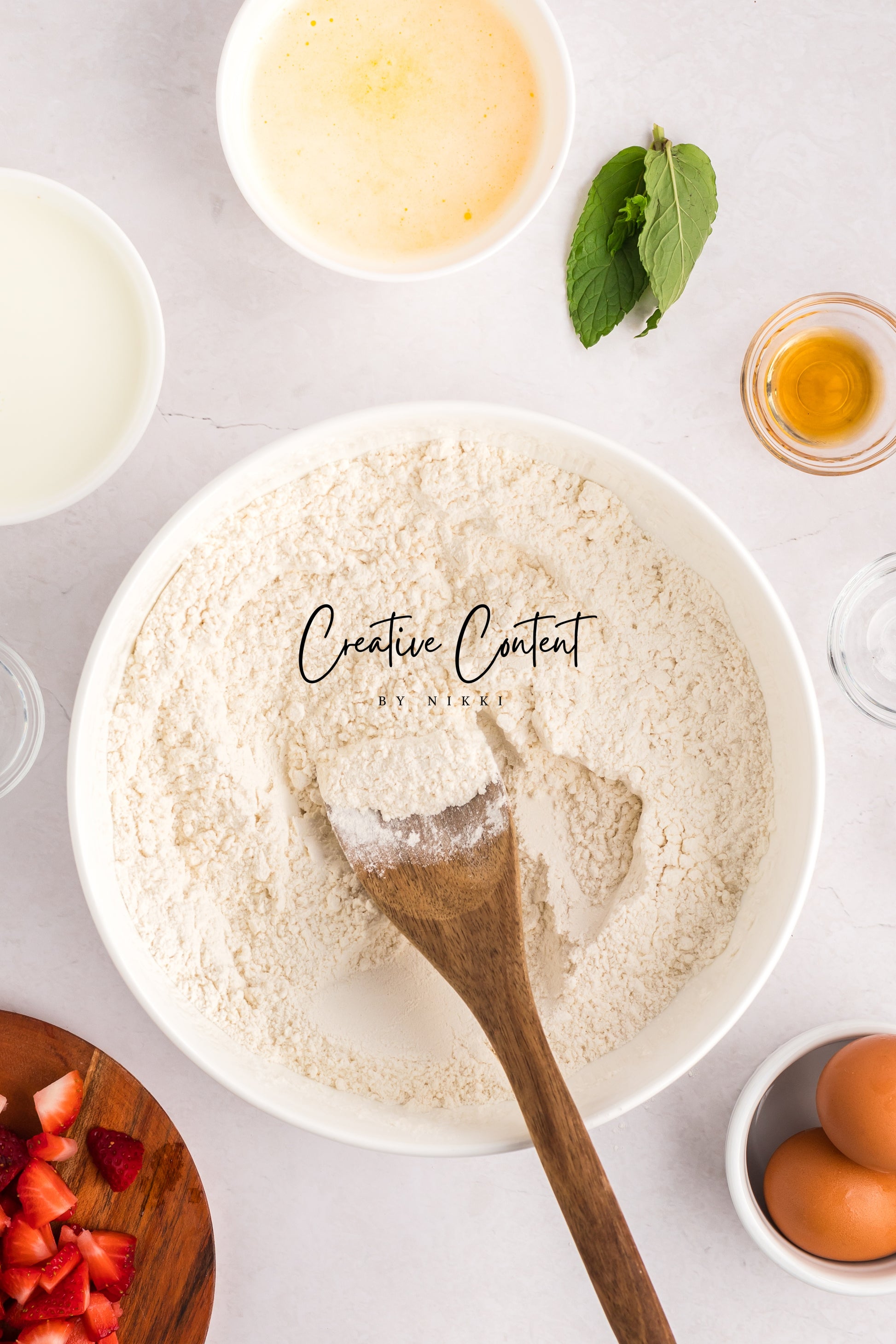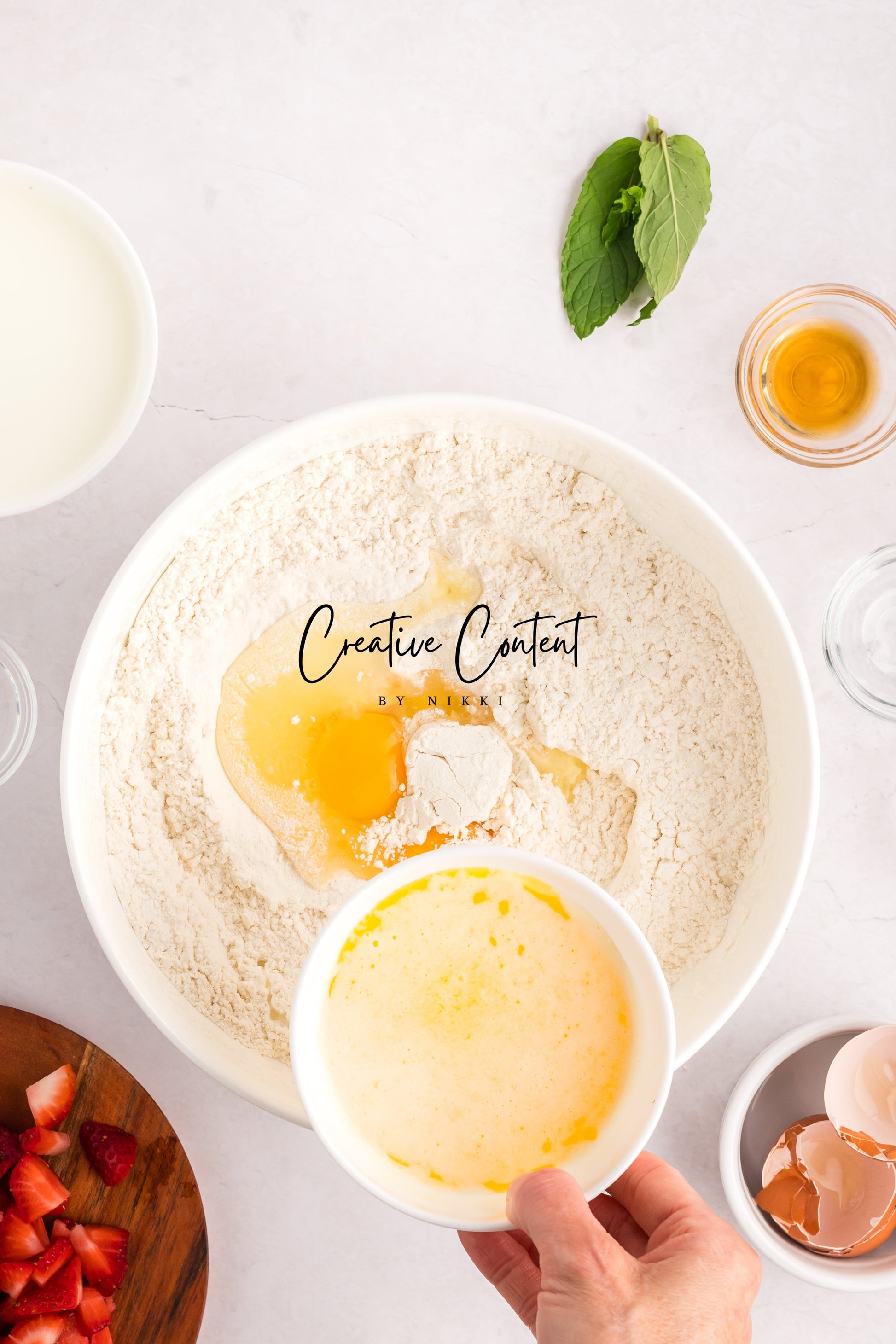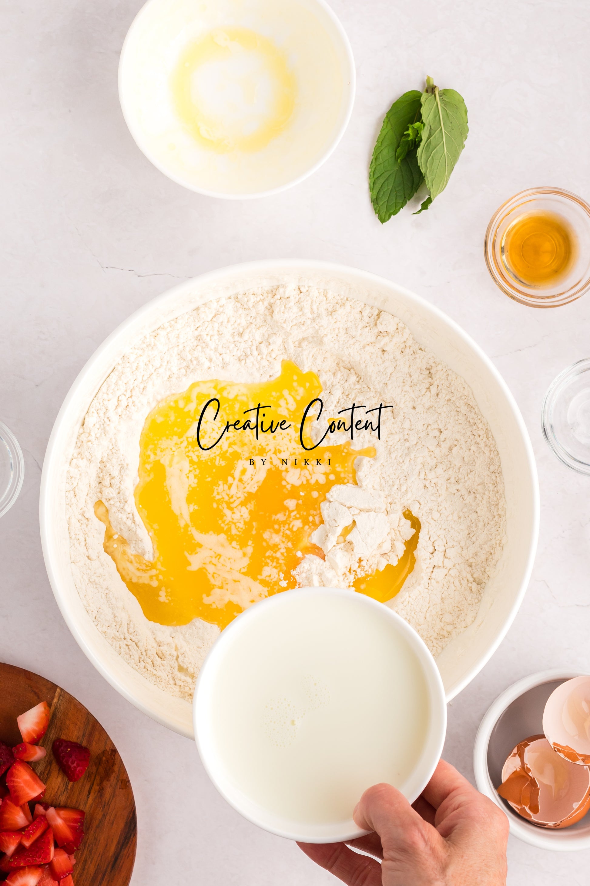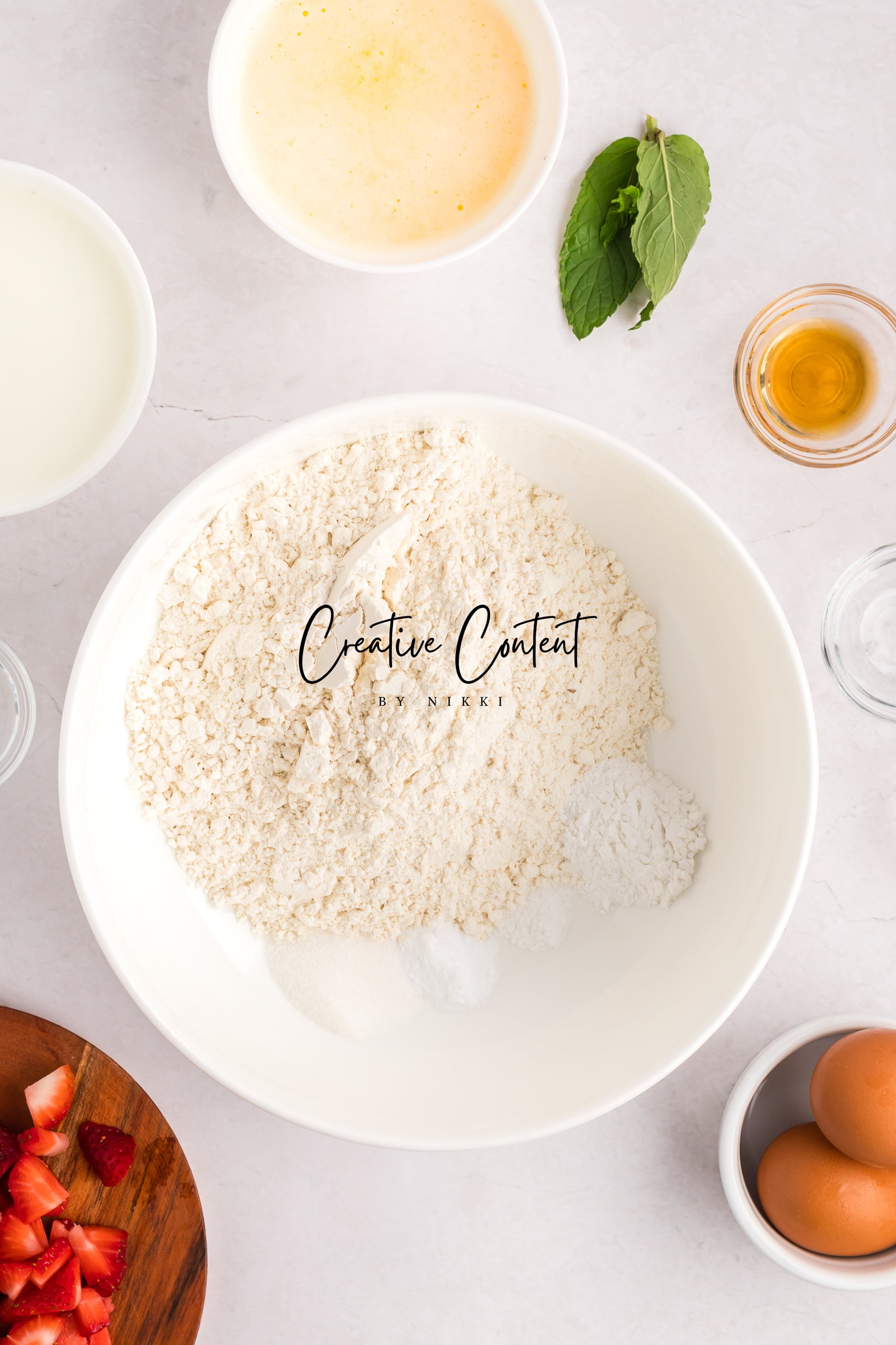 - Featured Ingredients; all-purpose flour, baking powder, baking soda, coarse kosher salt, whole milk, eggs, unsalted butter, honey, vanilla extract, strawberries, whipped cream, and mint.