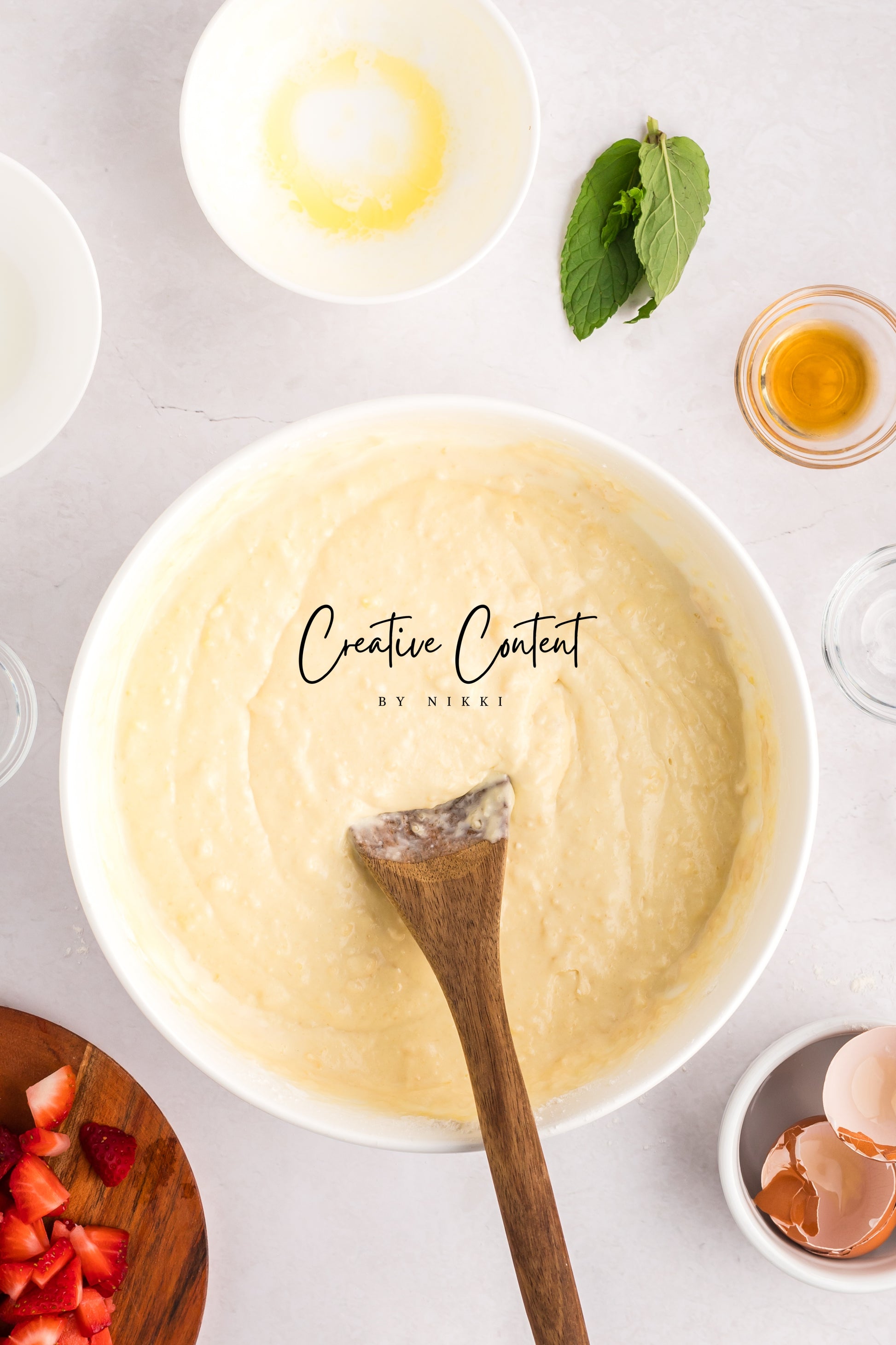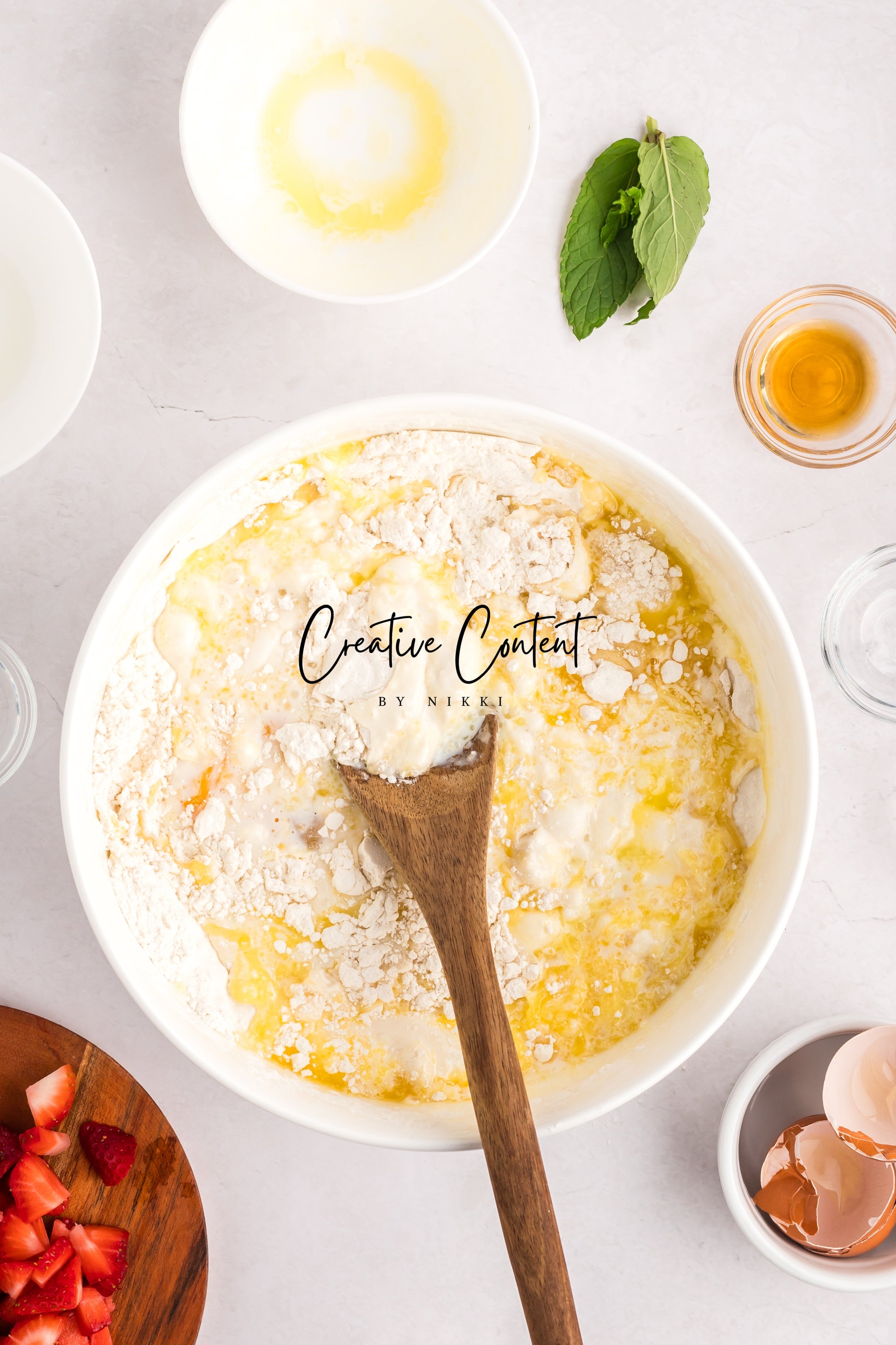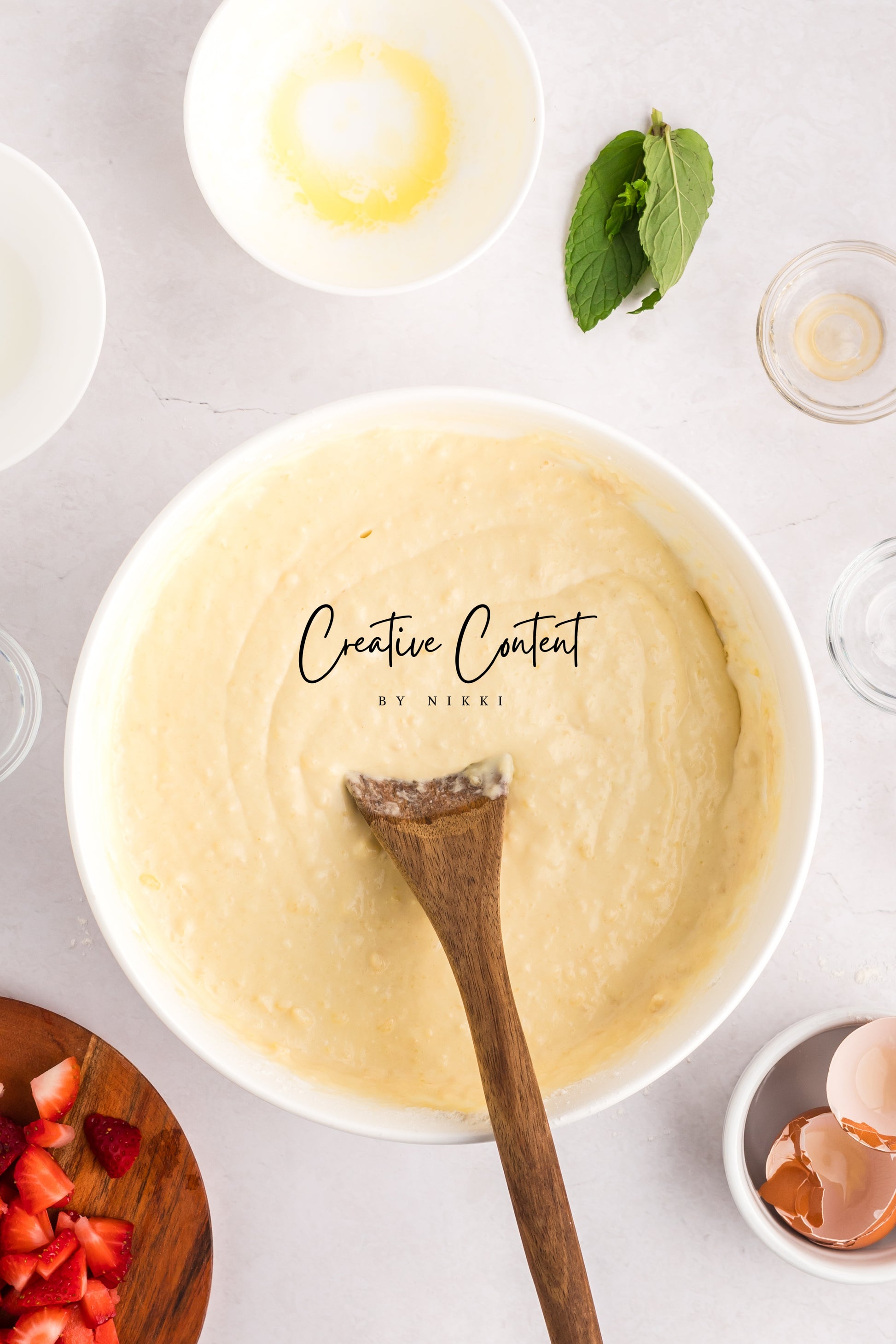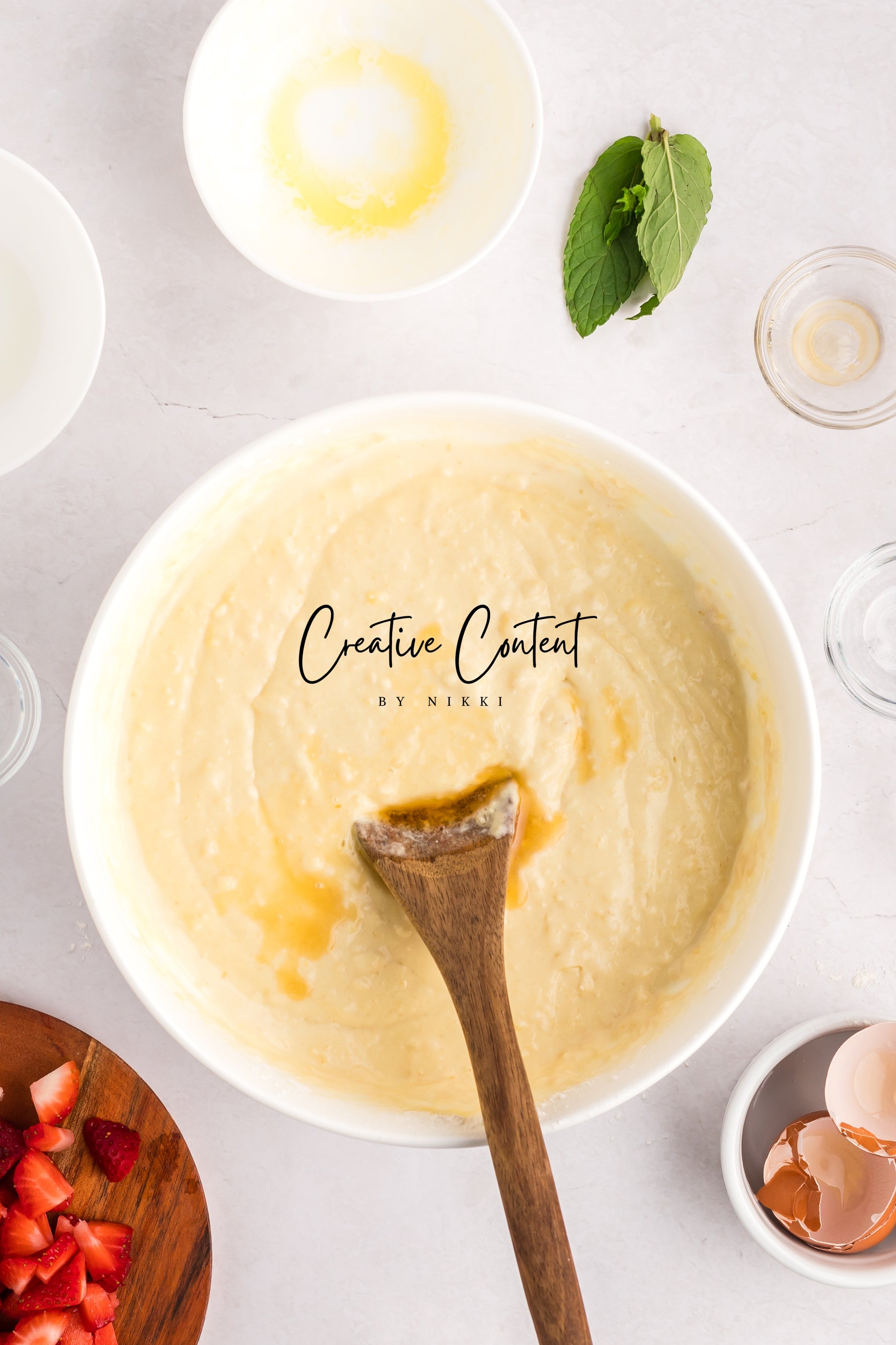 - Featured Ingredients; all-purpose flour, baking powder, baking soda, coarse kosher salt, whole milk, eggs, unsalted butter, honey, vanilla extract, strawberries, whipped cream, and mint.
