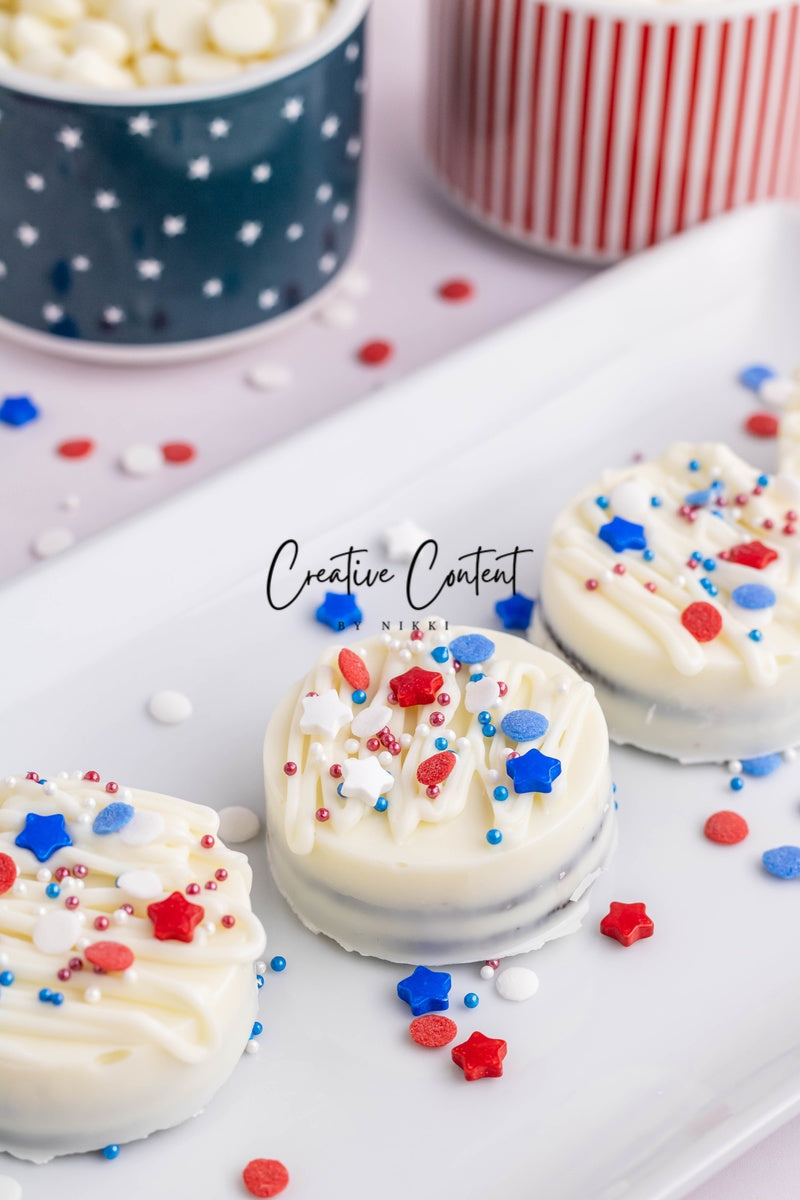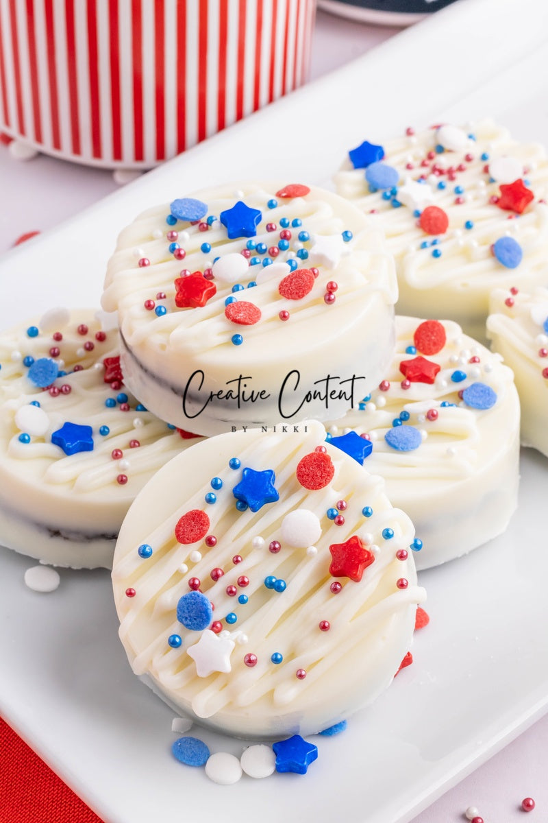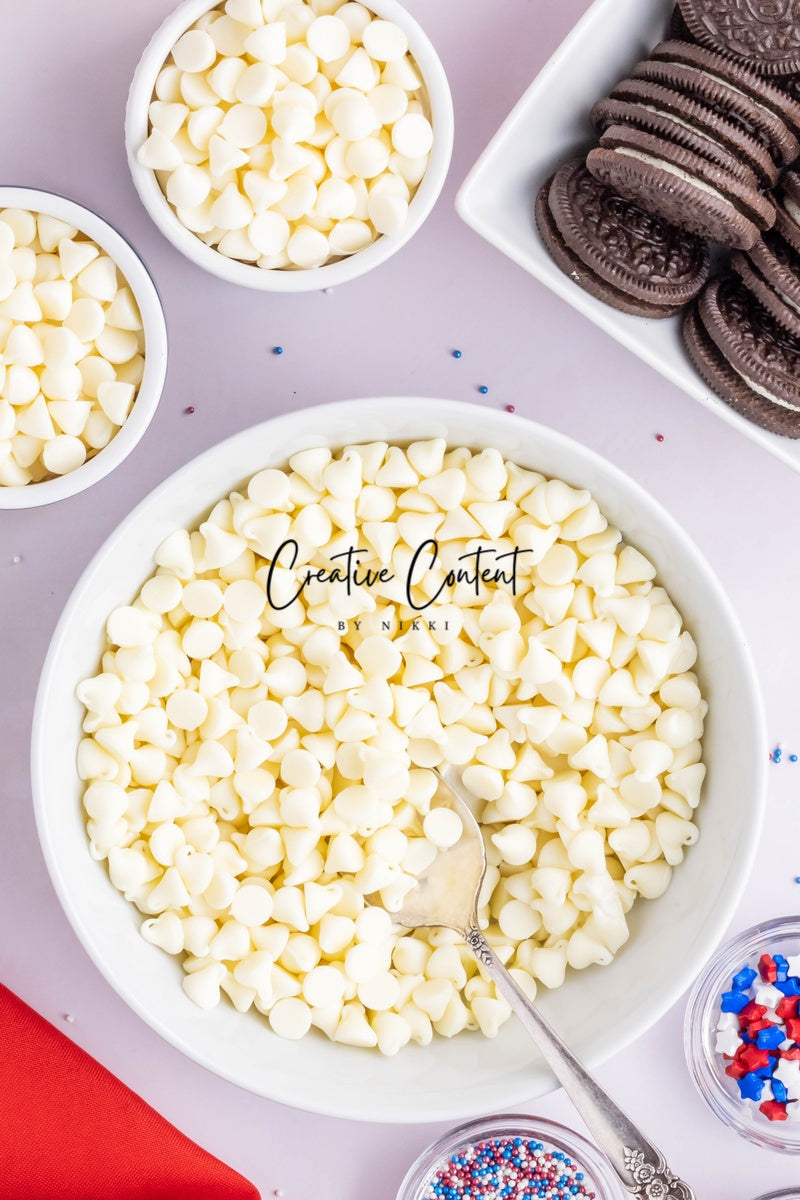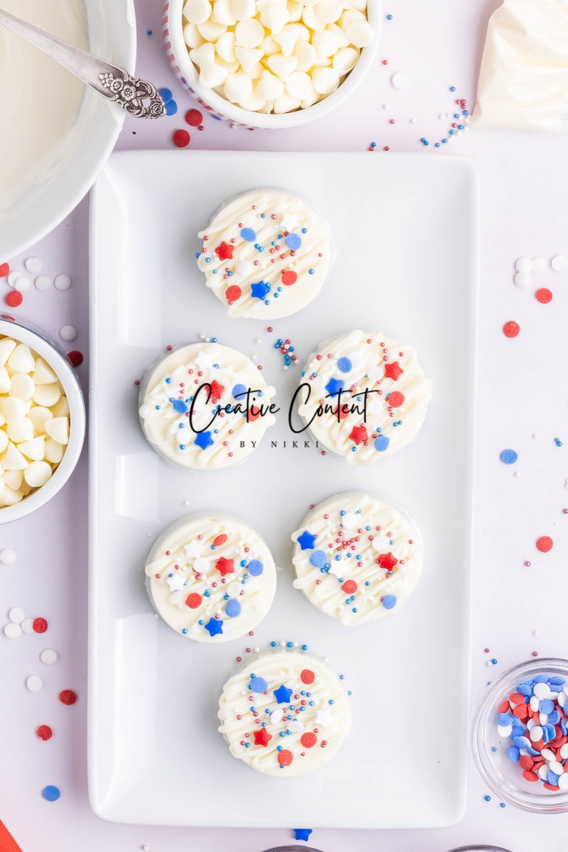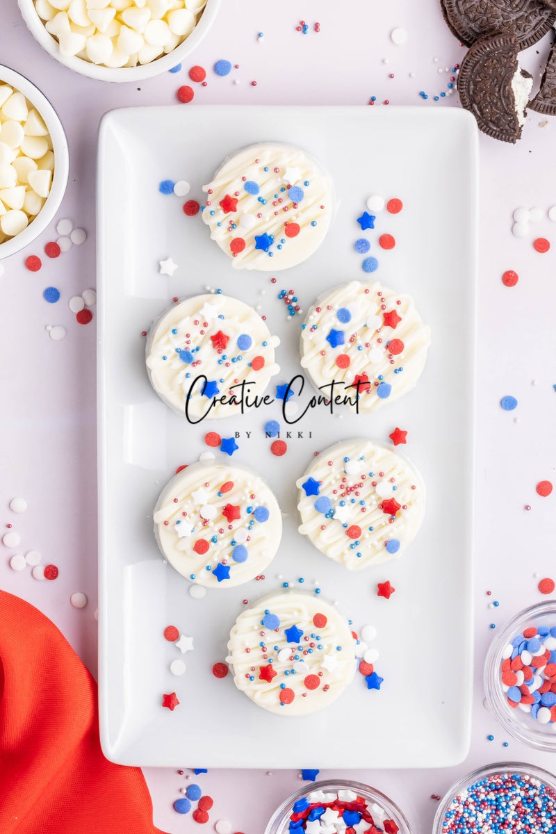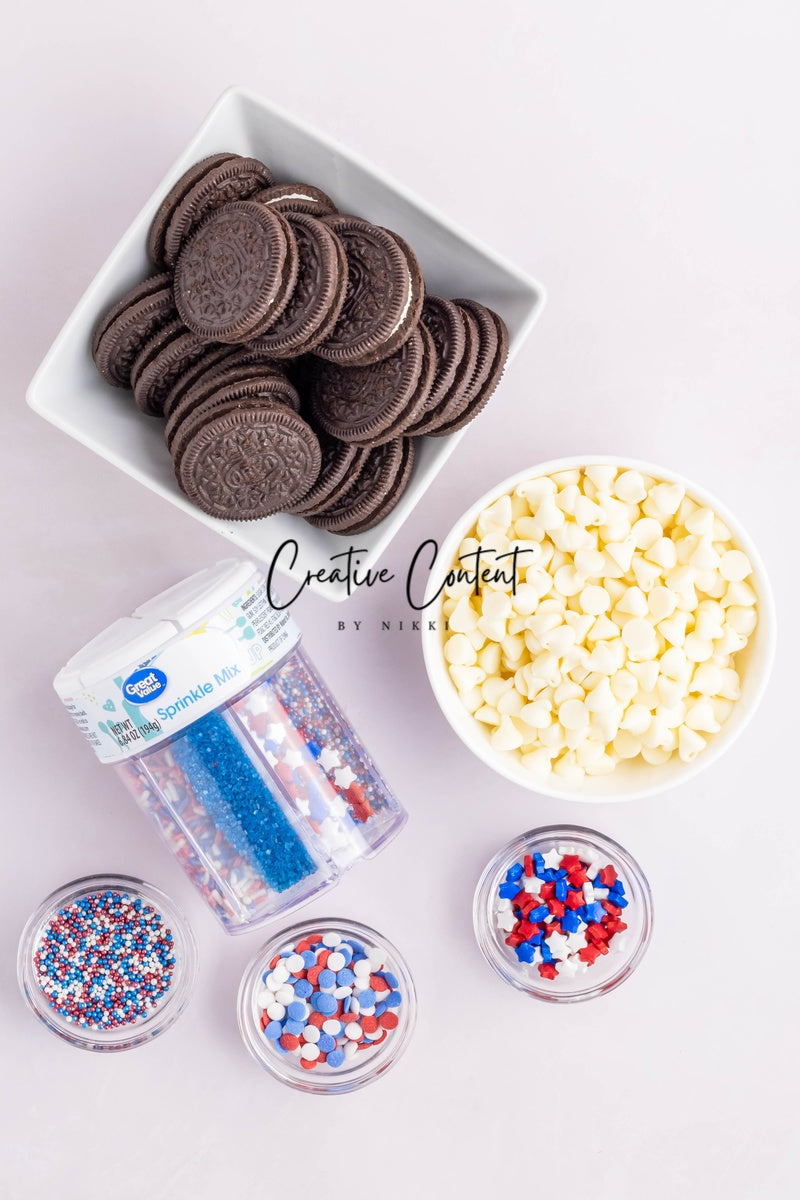 - Ingredients needed: Oreos, white chocolate, and red, white, and blue sprinkles.