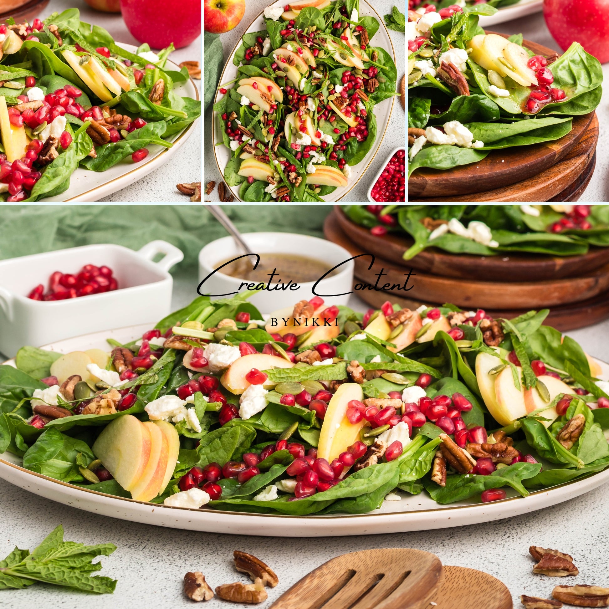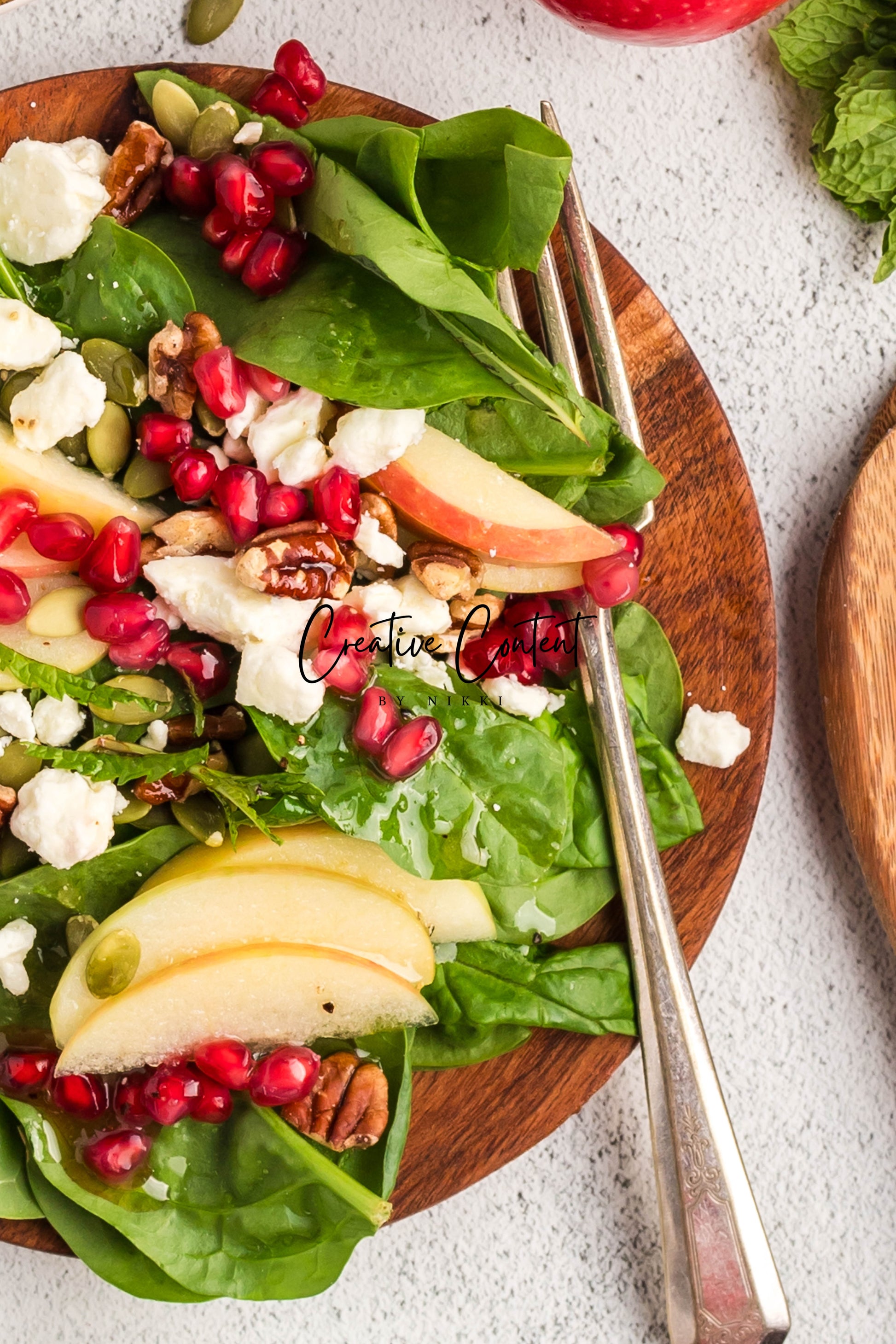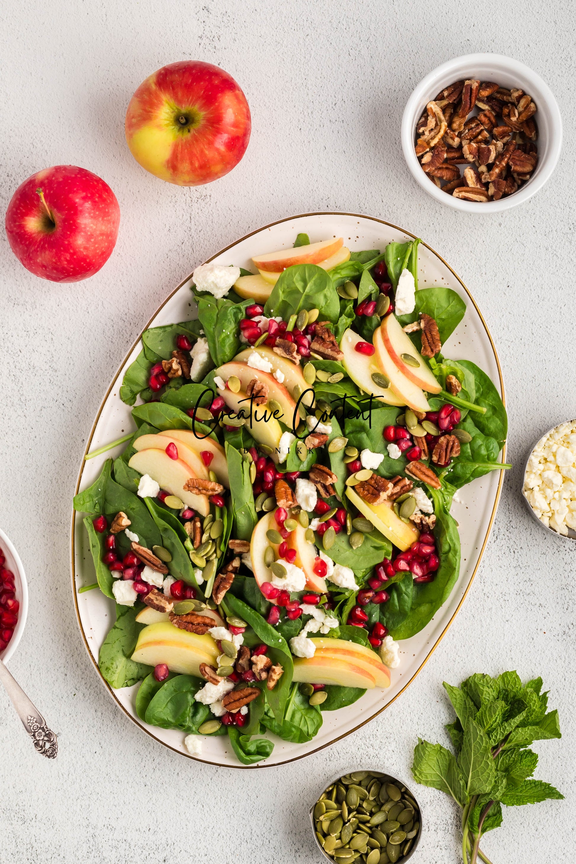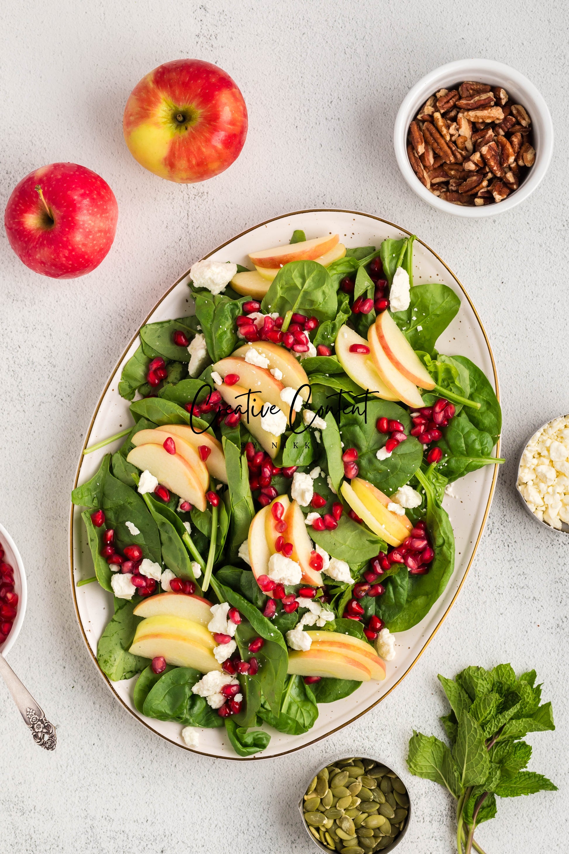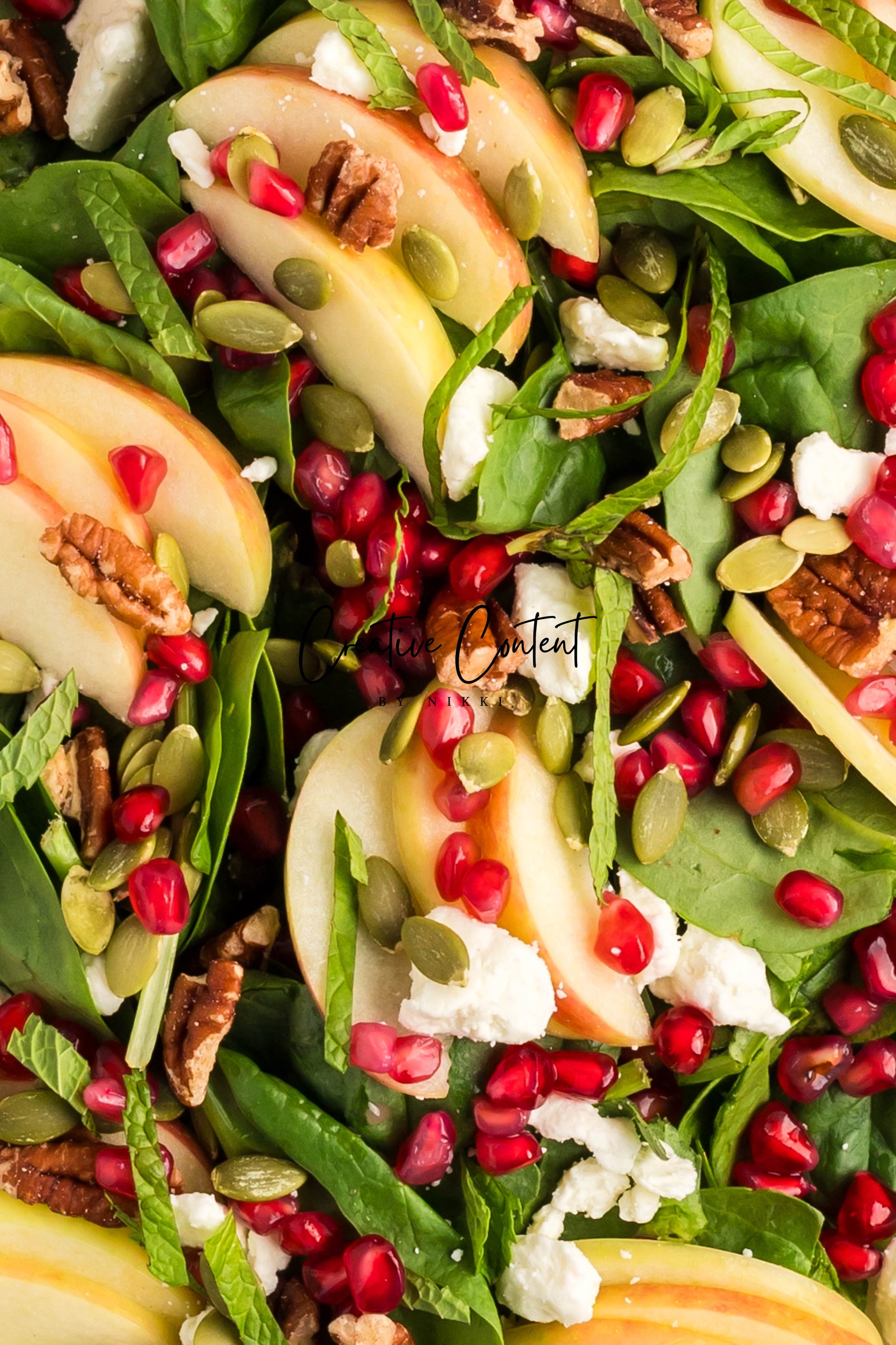 - Featured Ingredients: spinach, apple, feta cheese, pecans, pomegranate seeds, pumpkin seeds, mint, avocado oil, vinegar, honey, salt, and pepper.