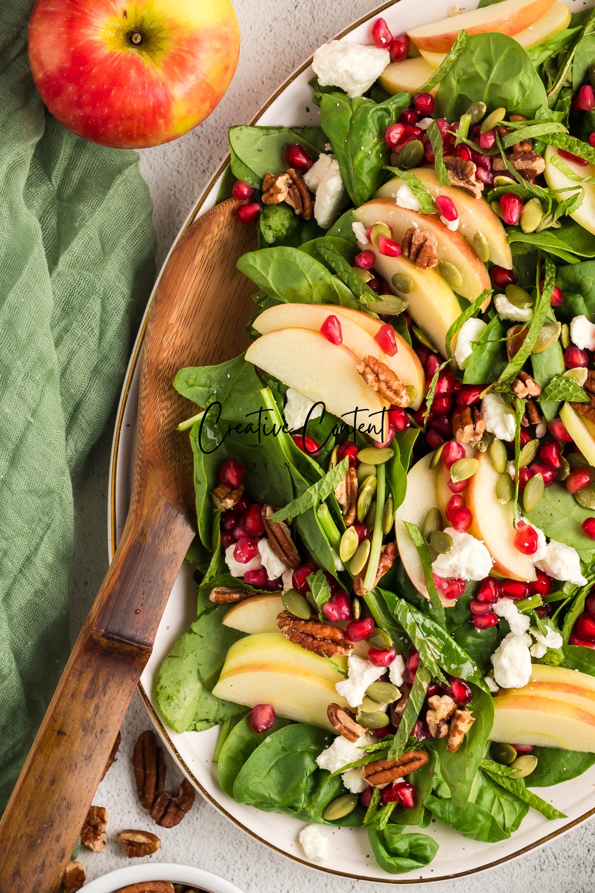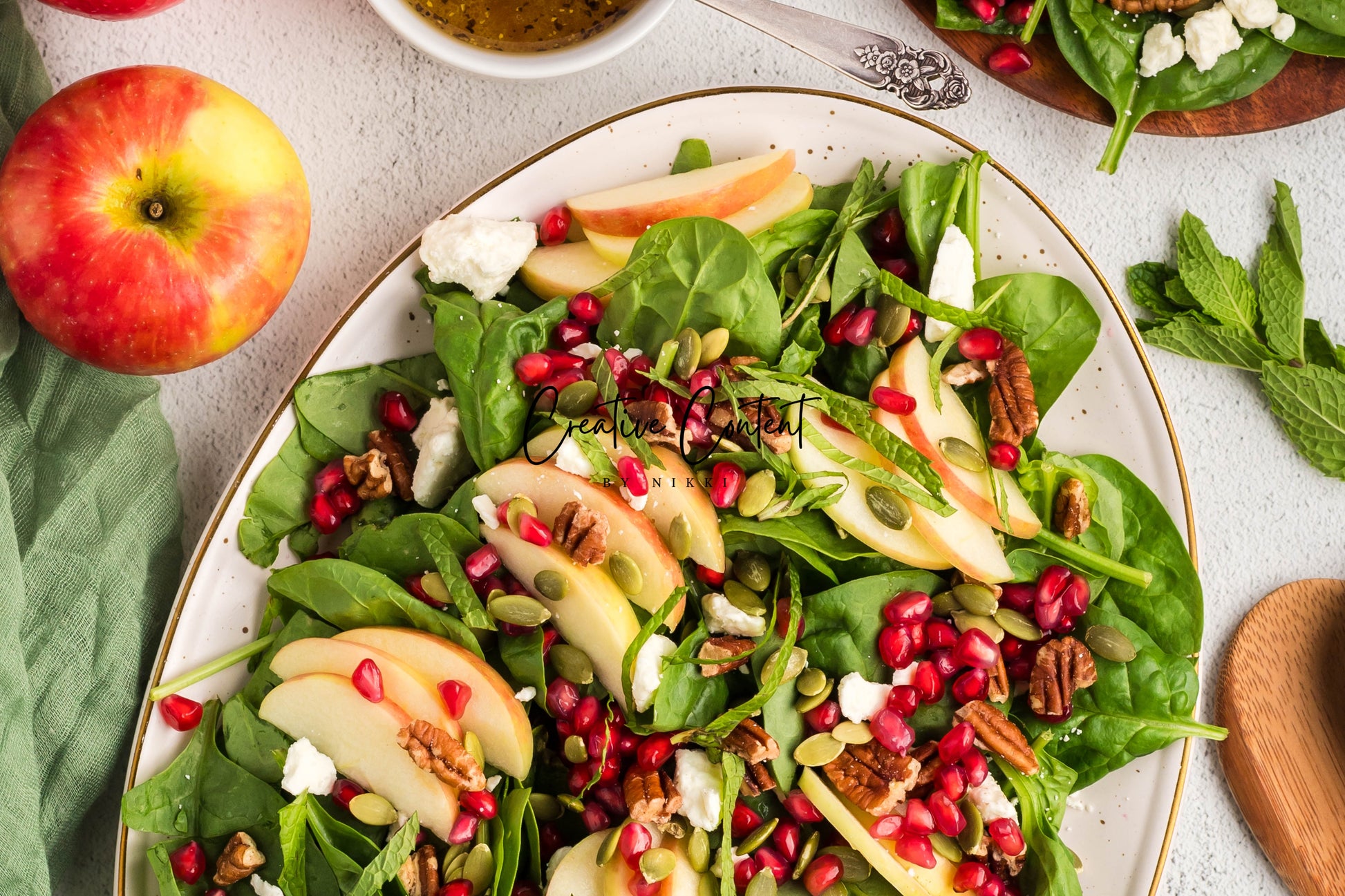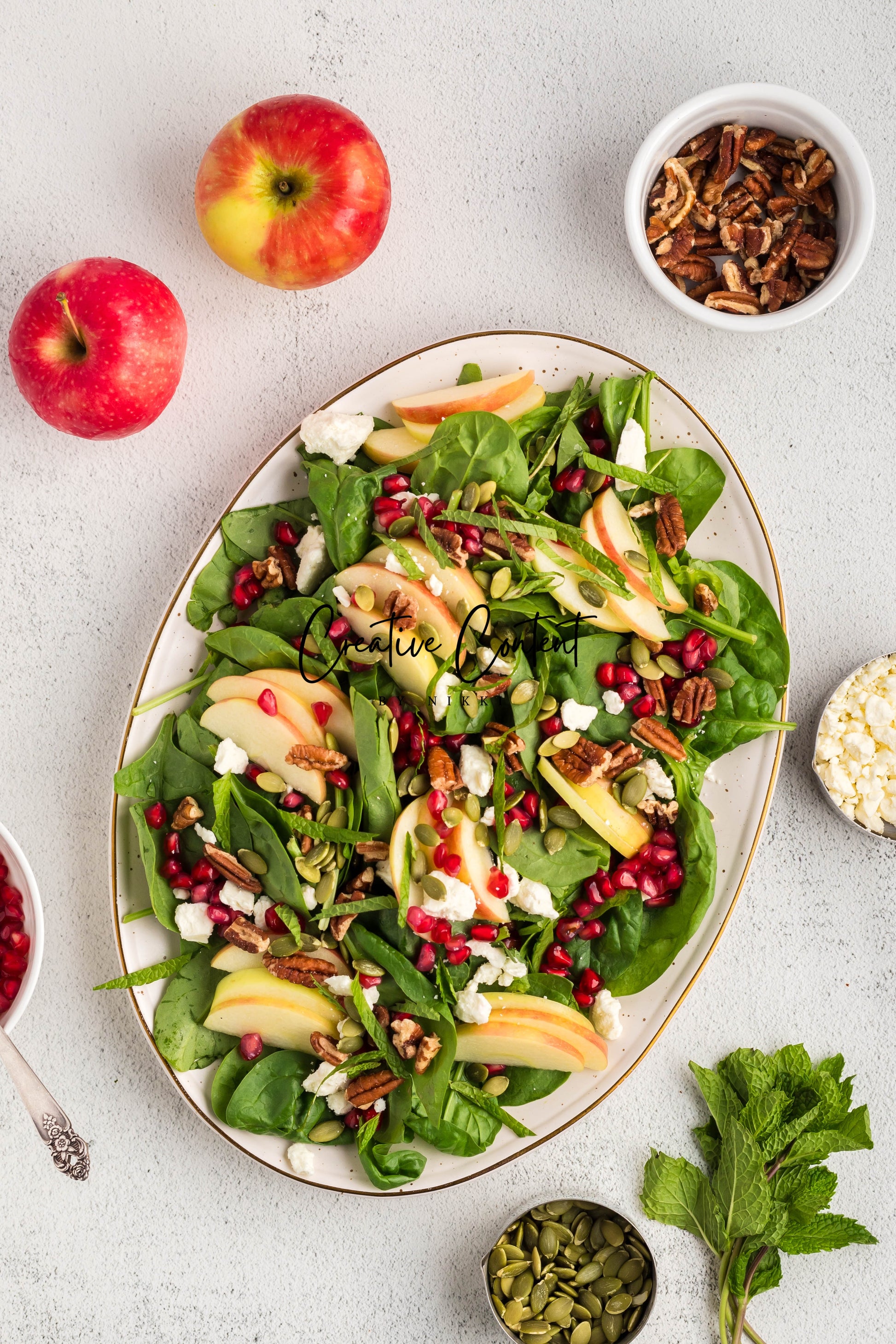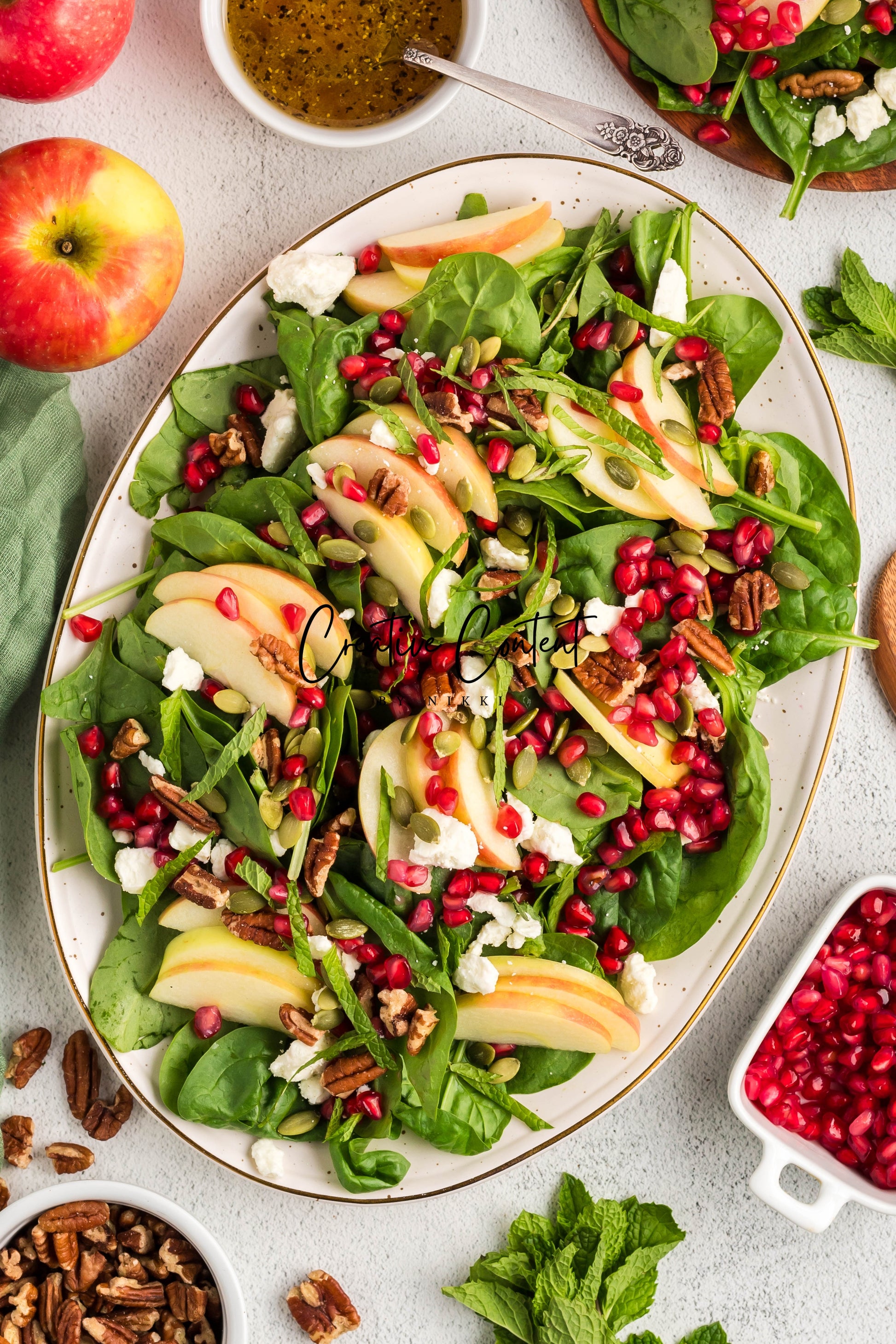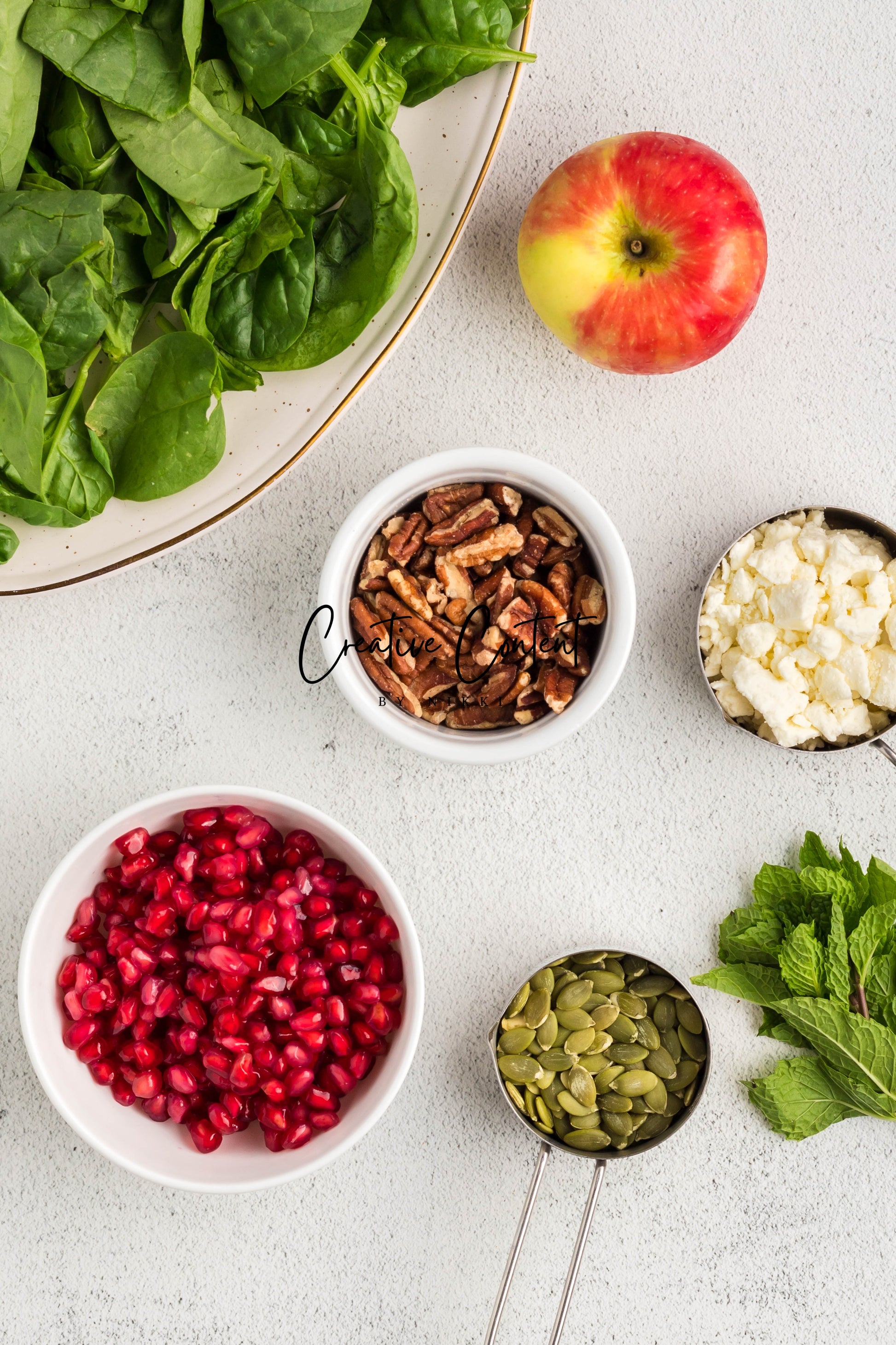 - Featured Ingredients: spinach, apple, feta cheese, pecans, pomegranate seeds, pumpkin seeds, mint, avocado oil, vinegar, honey, salt, and pepper.