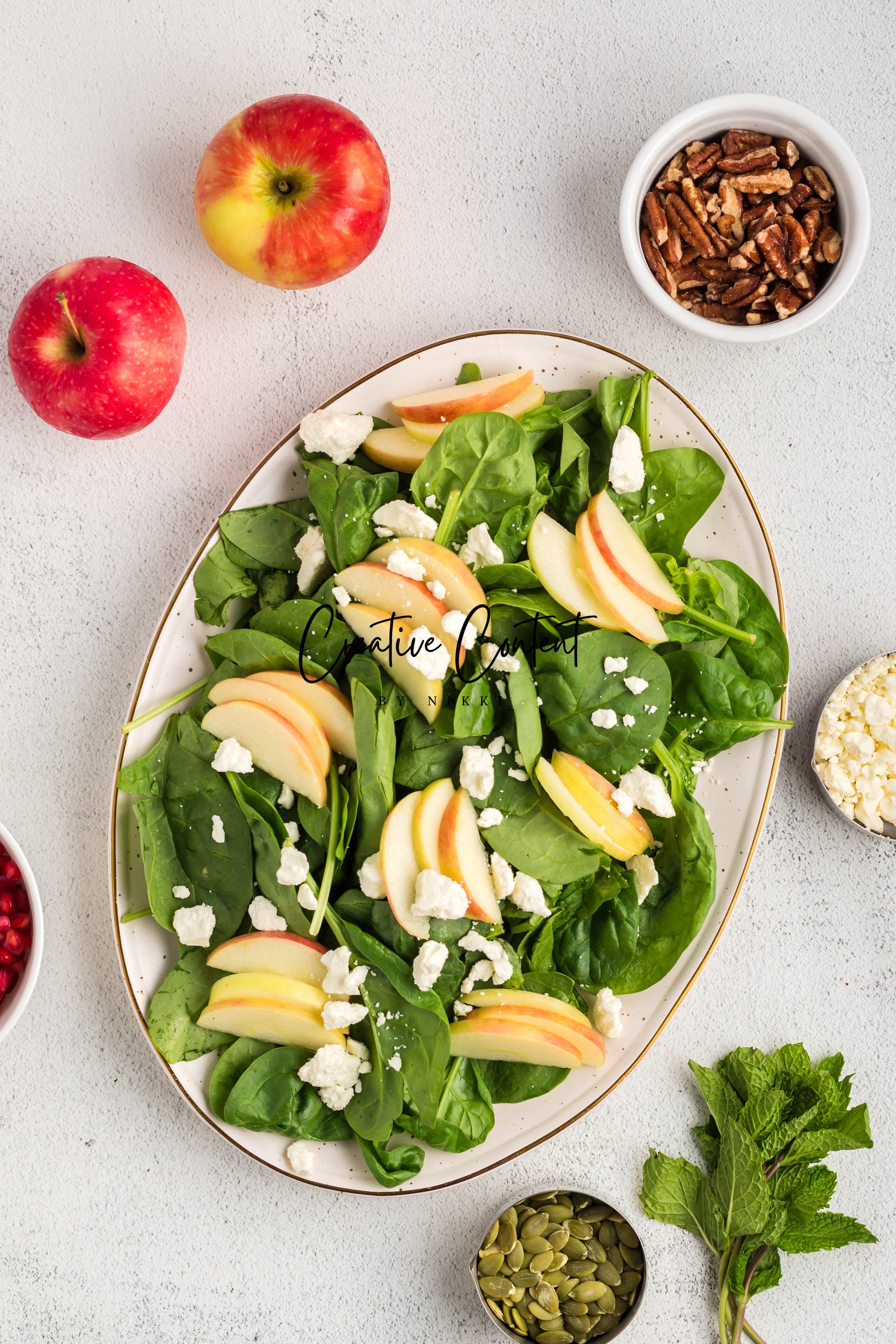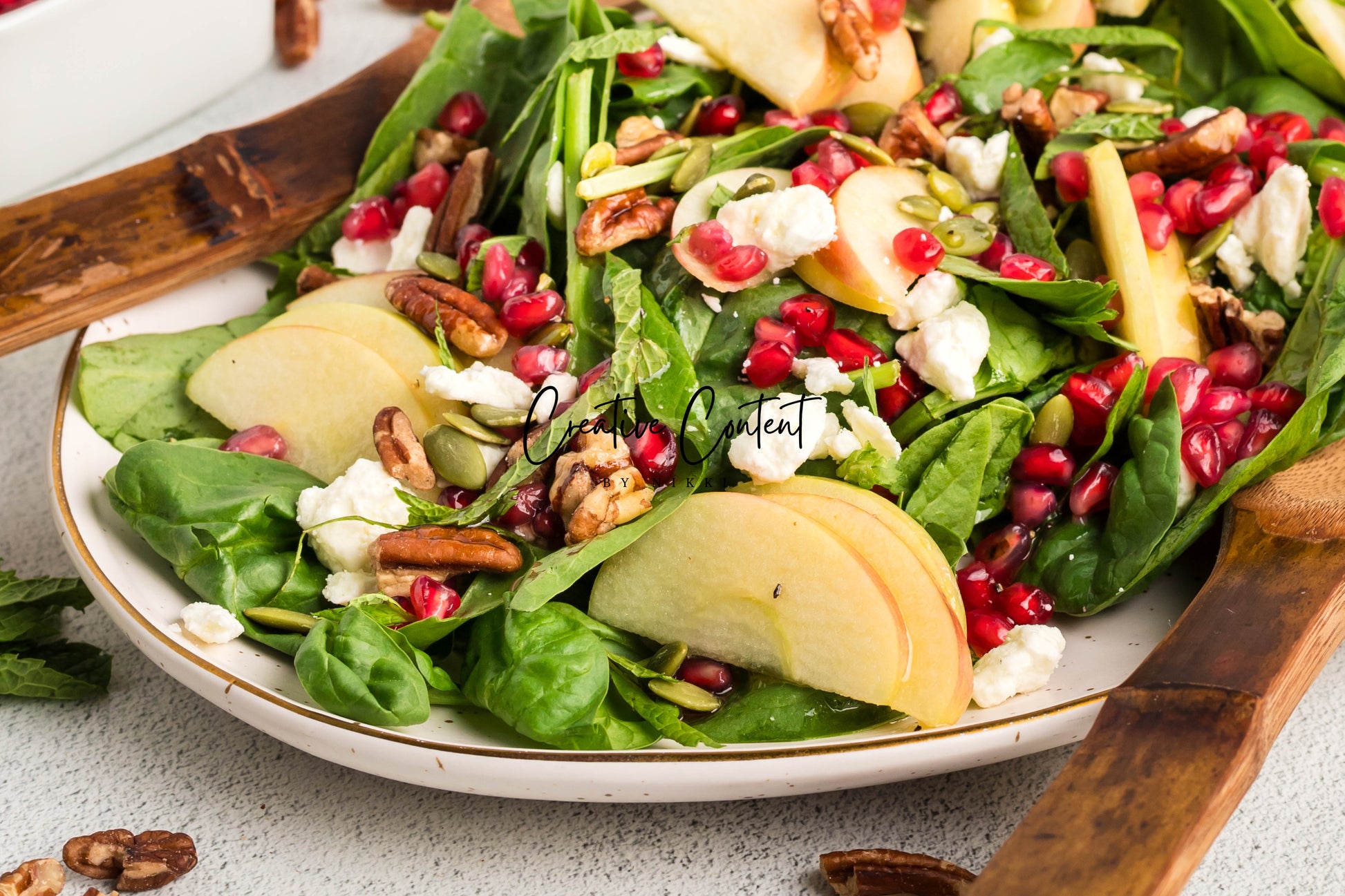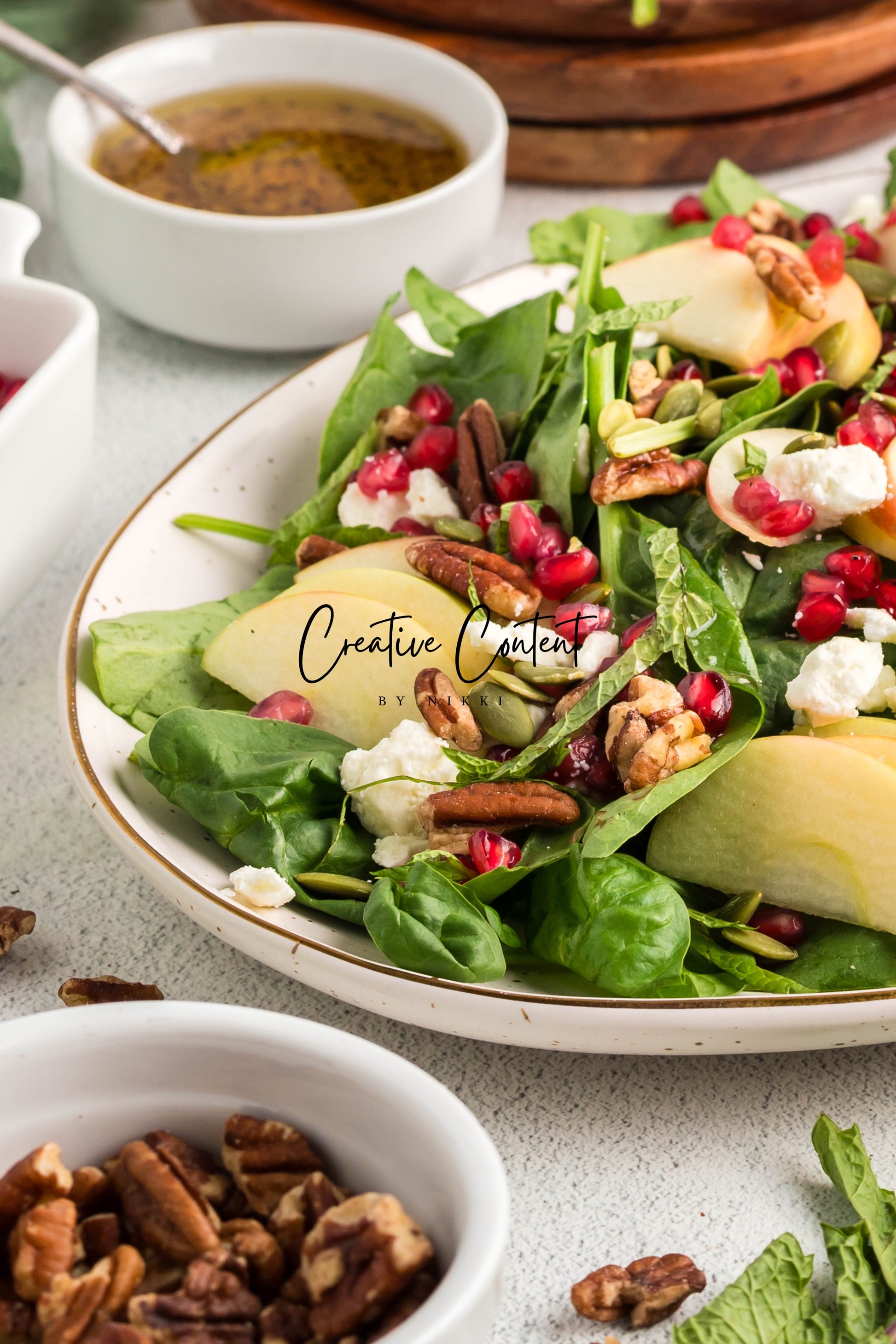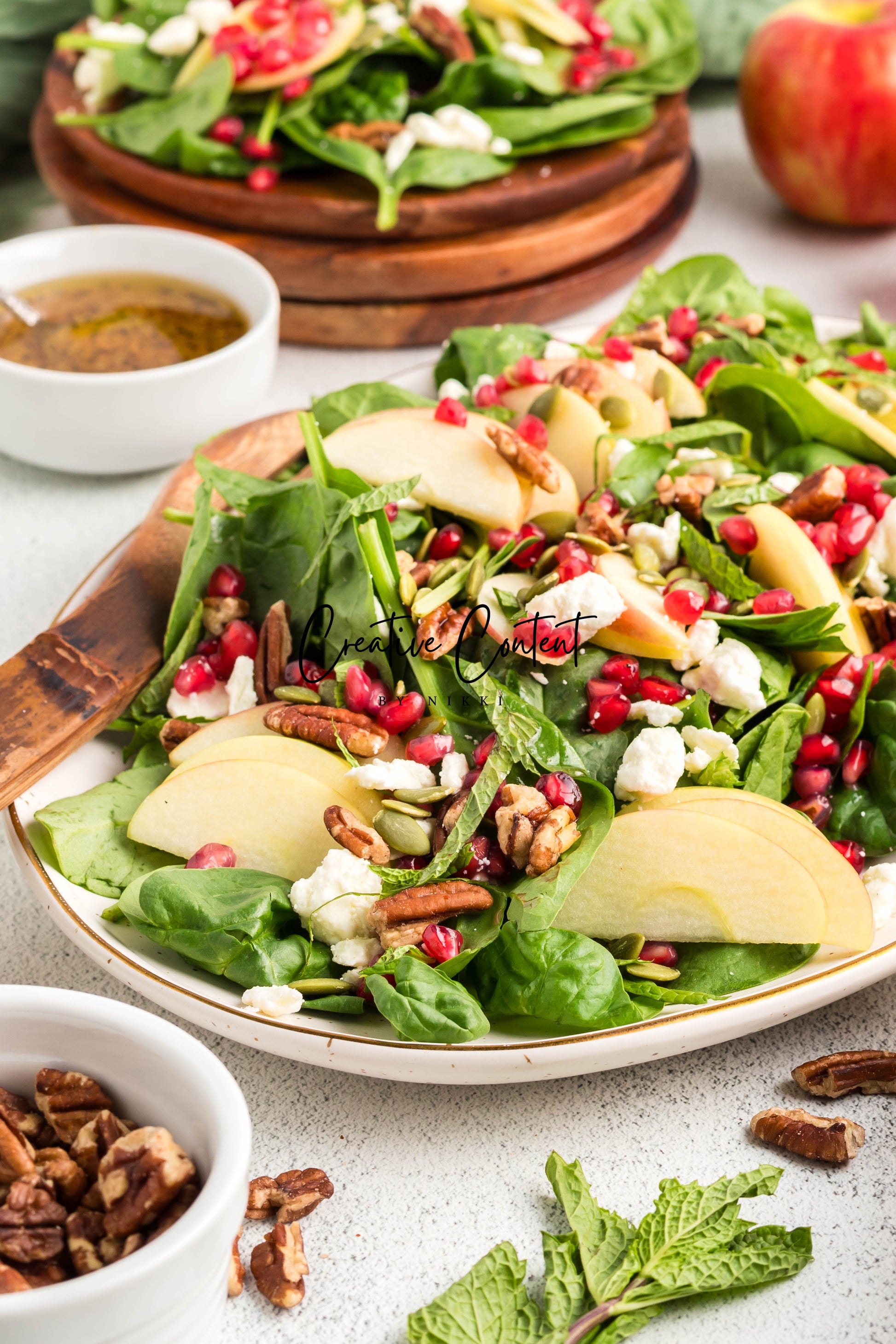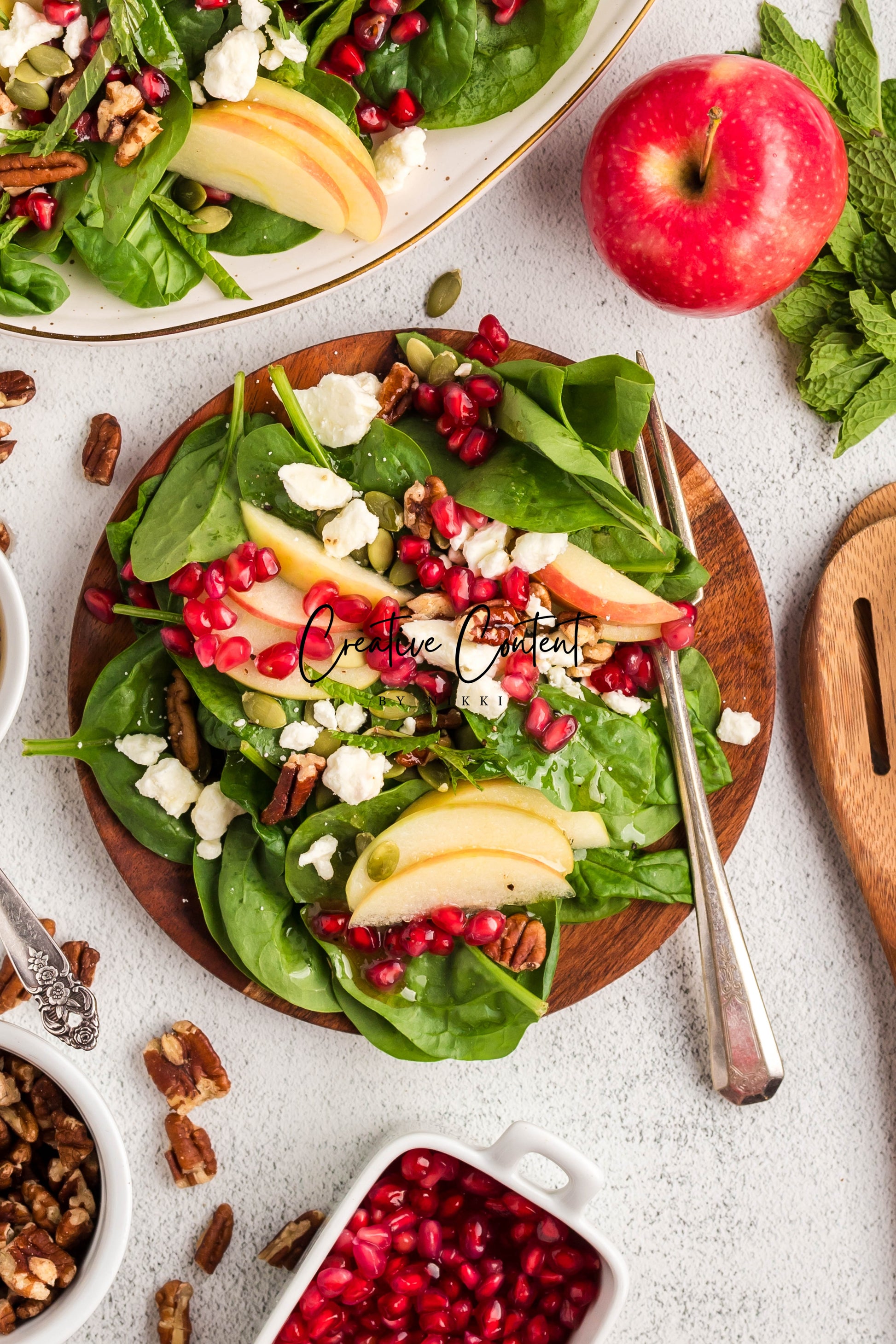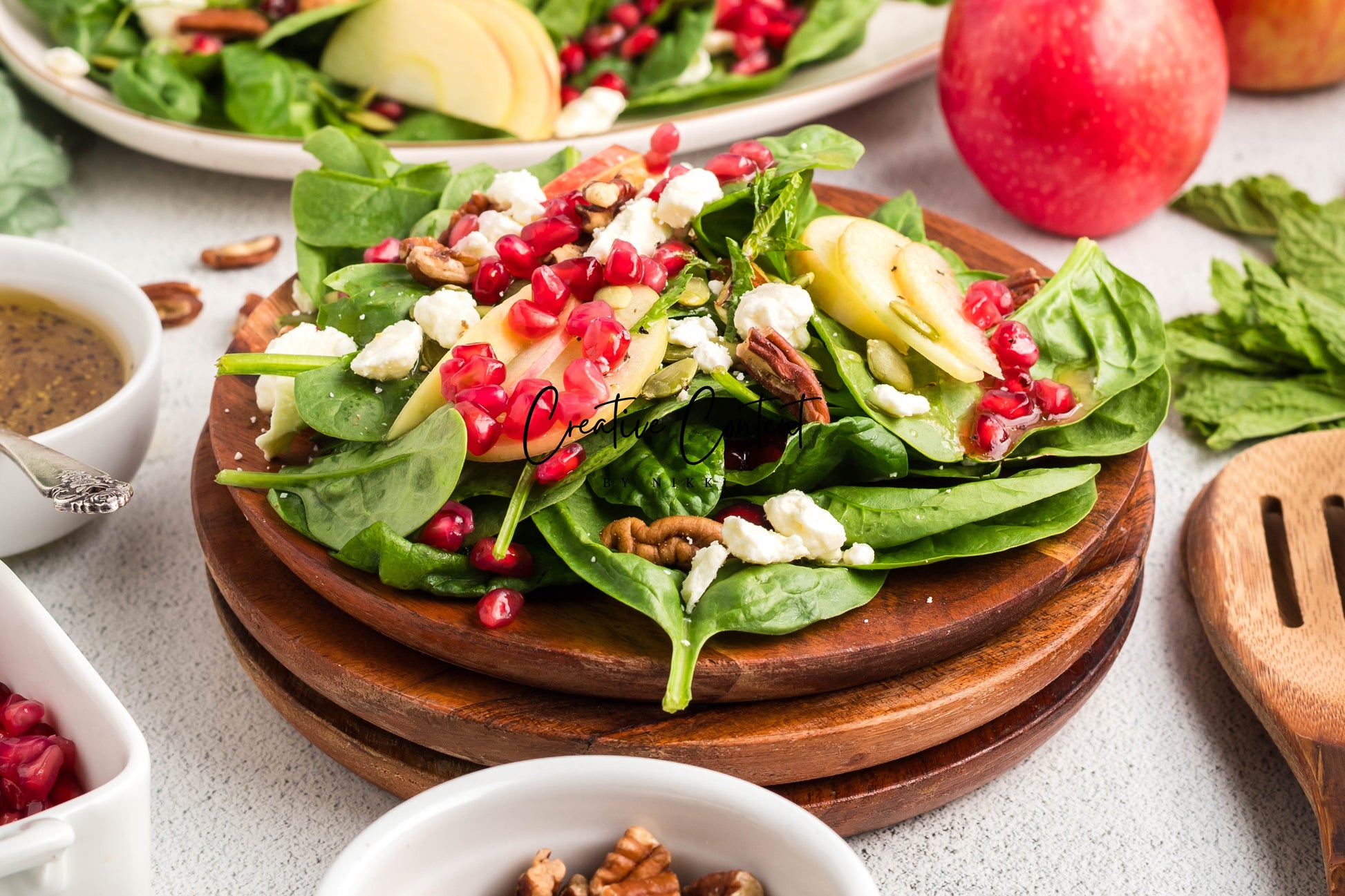 - Featured Ingredients: spinach, apple, feta cheese, pecans, pomegranate seeds, pumpkin seeds, mint, avocado oil, vinegar, honey, salt, and pepper.