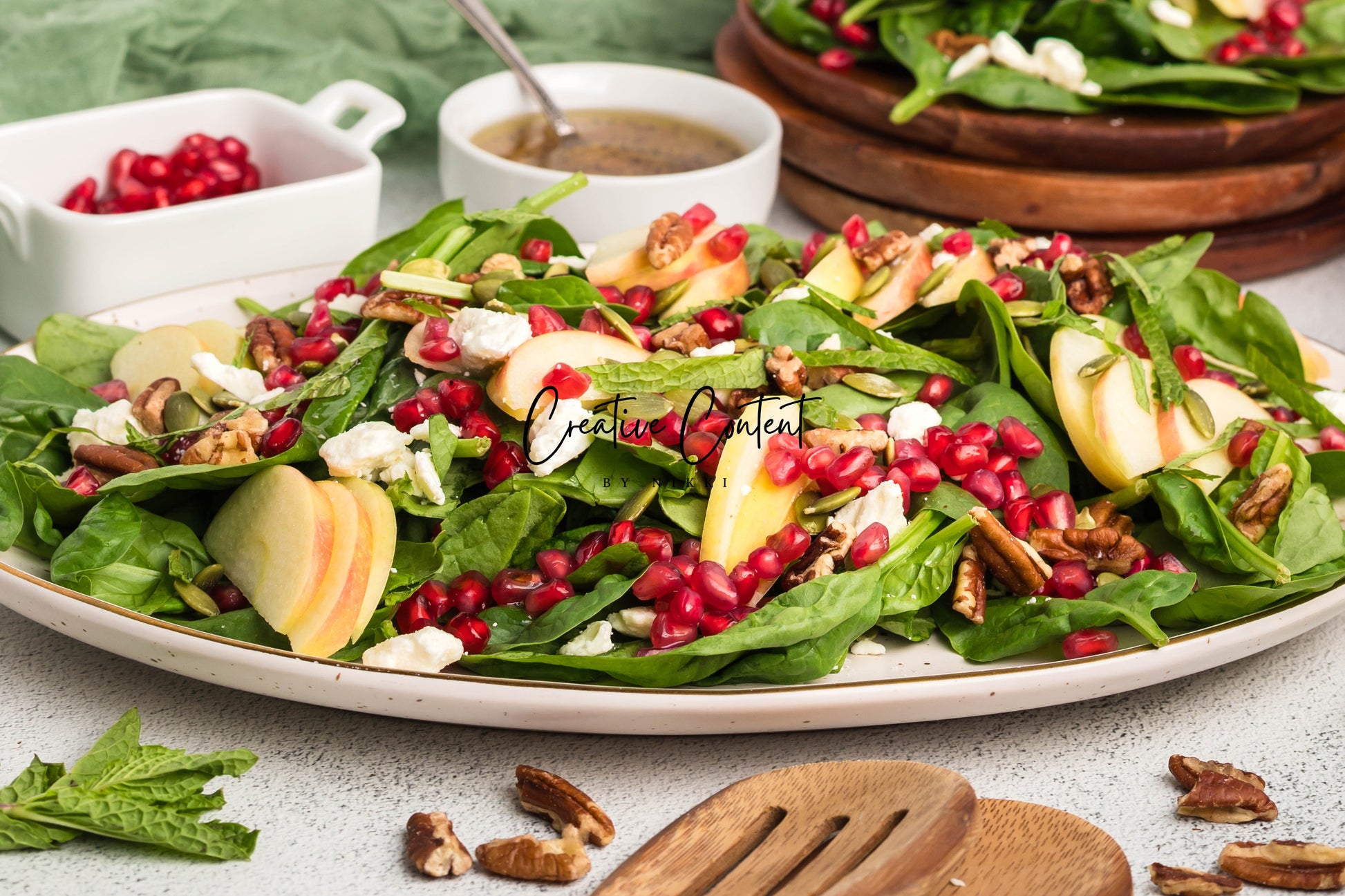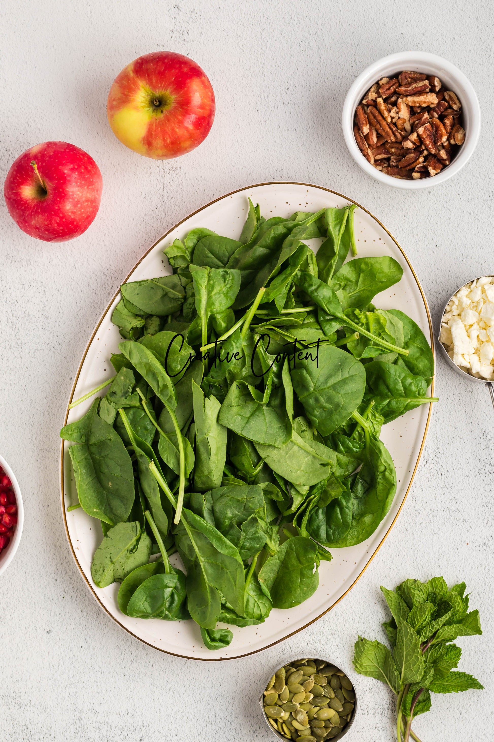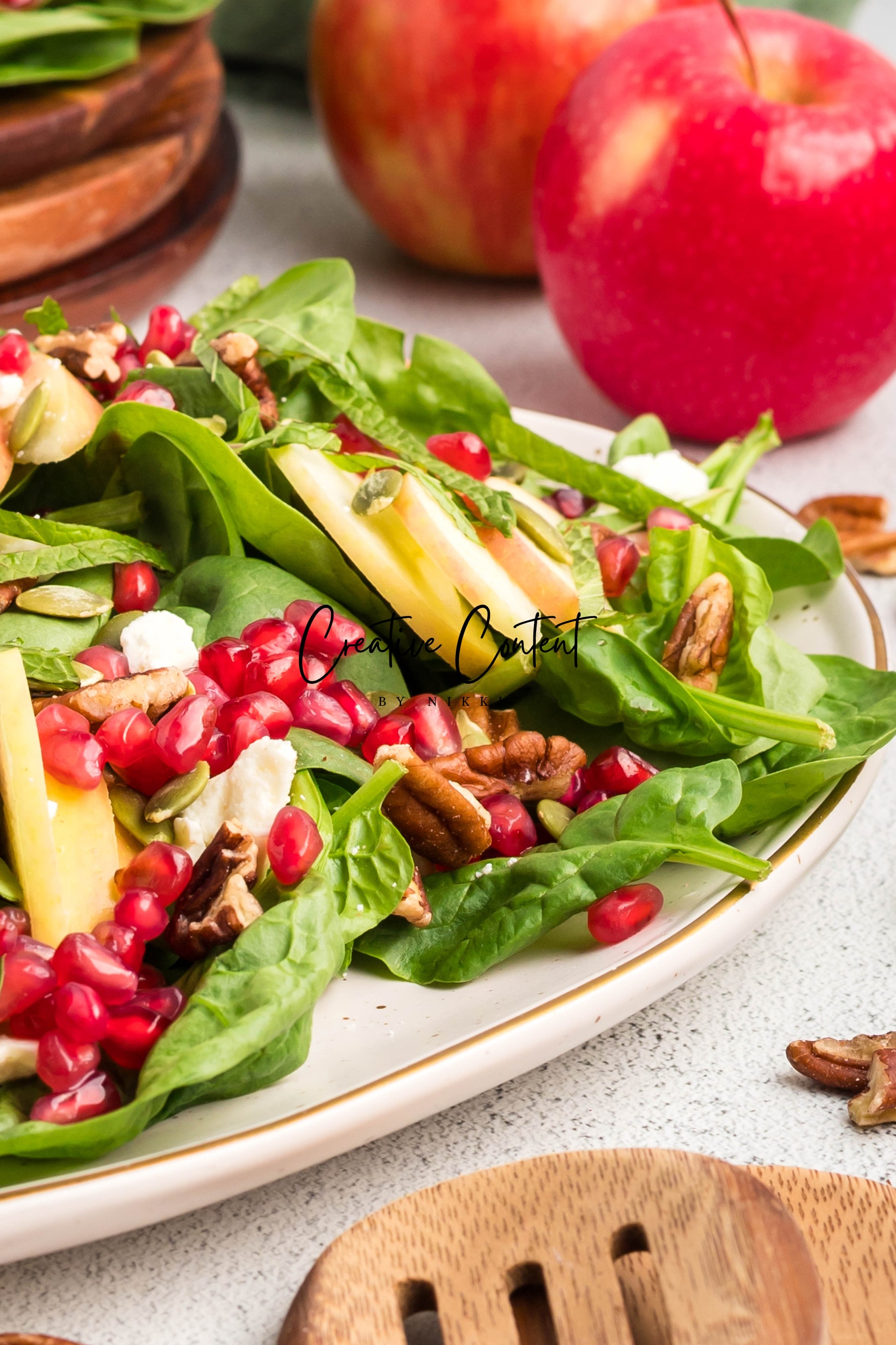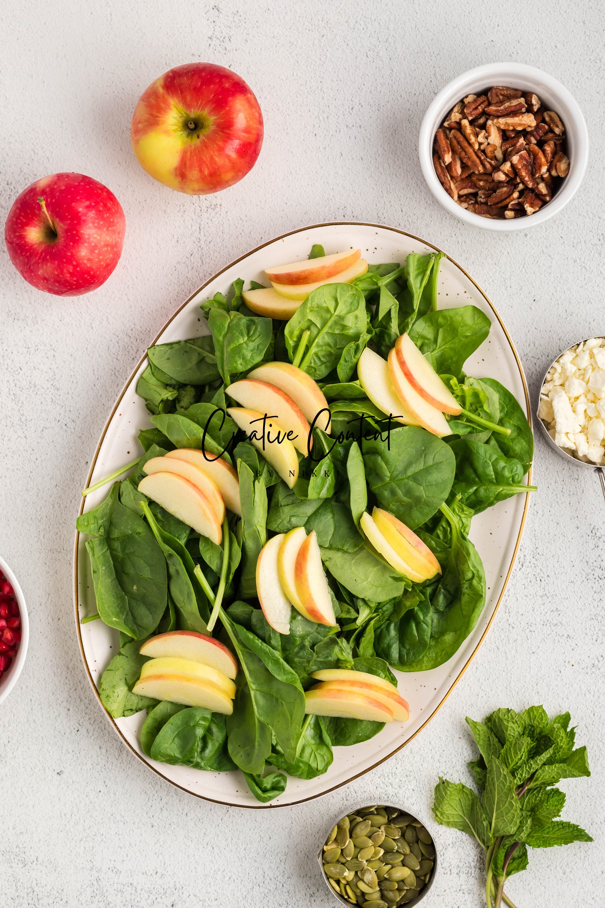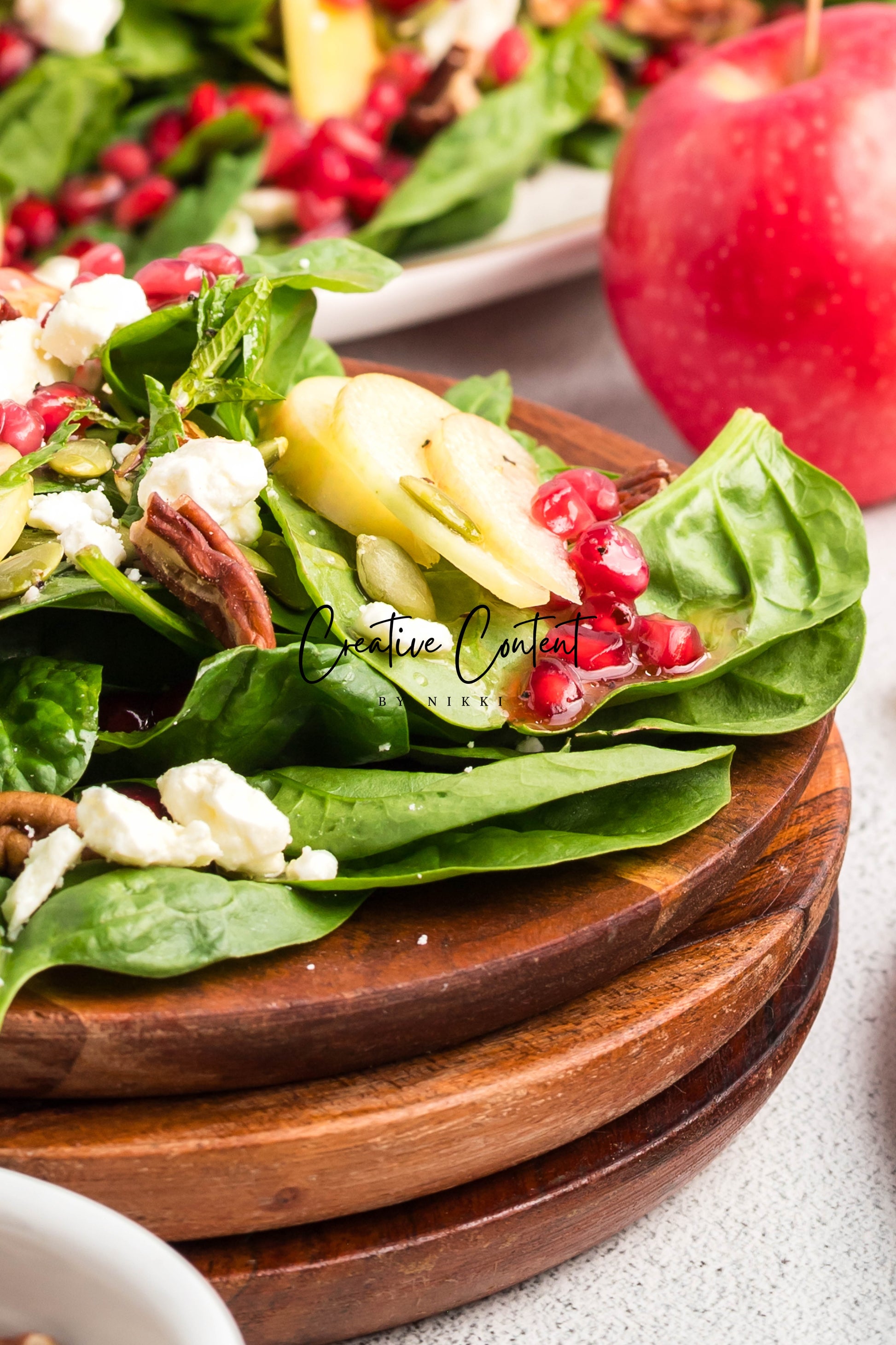 - Featured Ingredients: spinach, apple, feta cheese, pecans, pomegranate seeds, pumpkin seeds, mint, avocado oil, vinegar, honey, salt, and pepper.