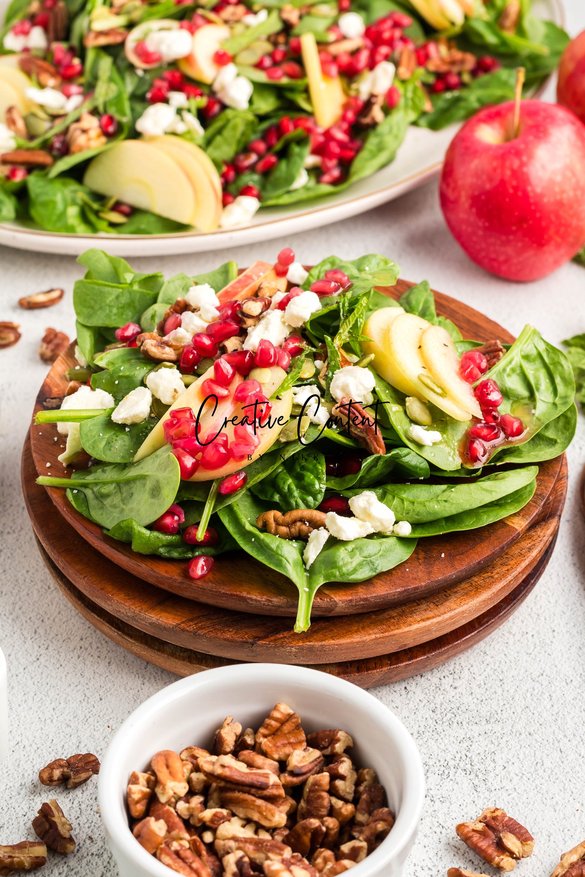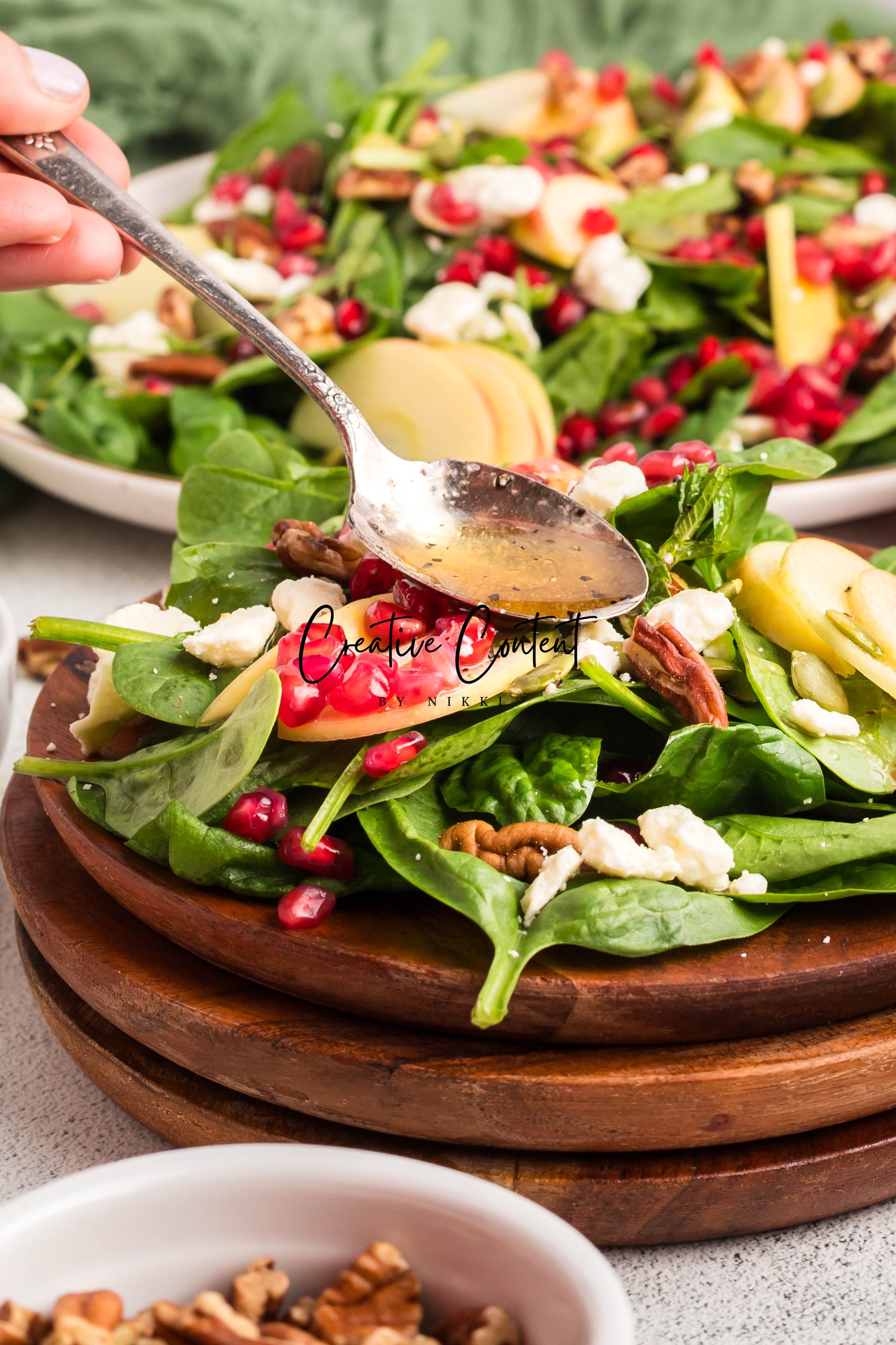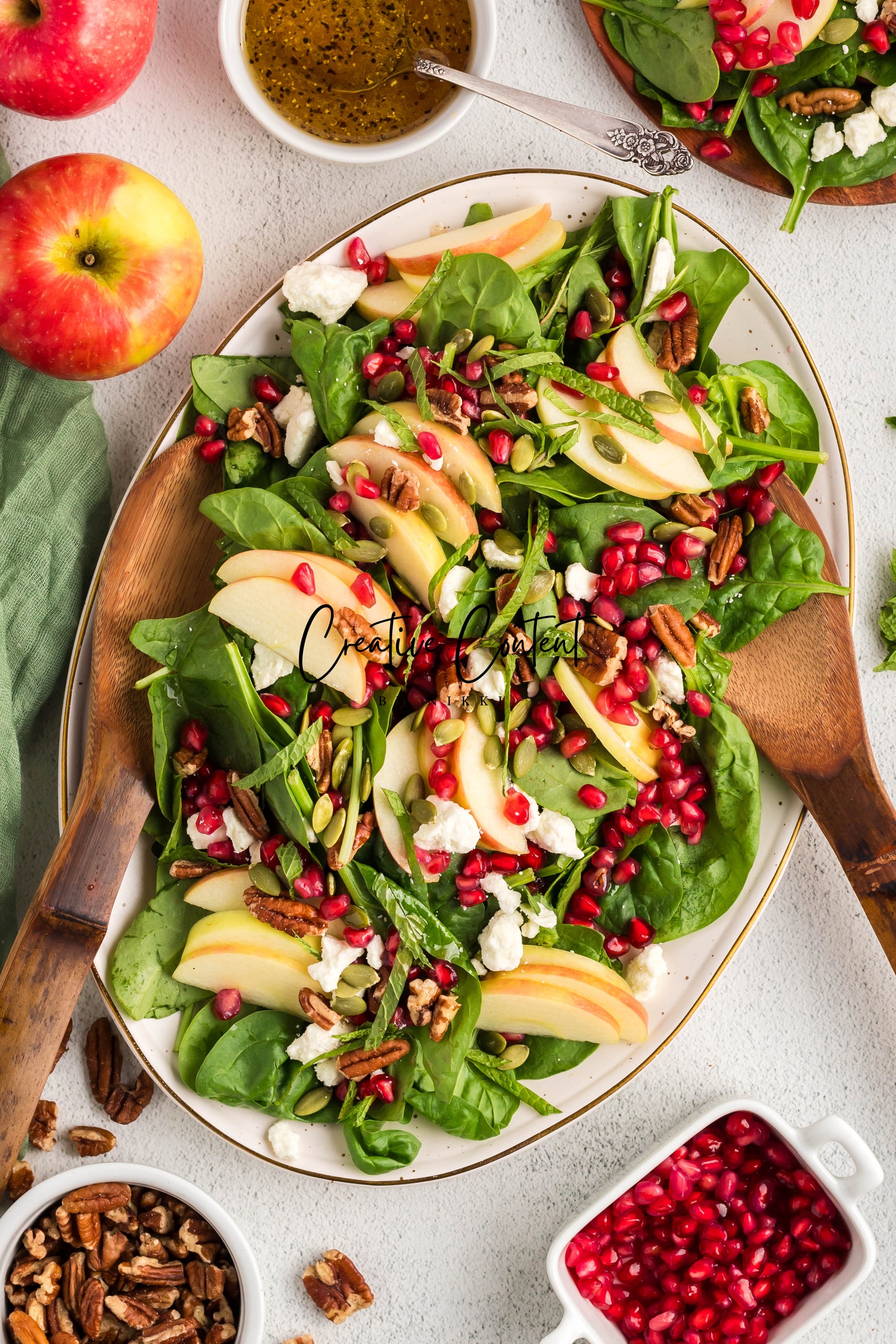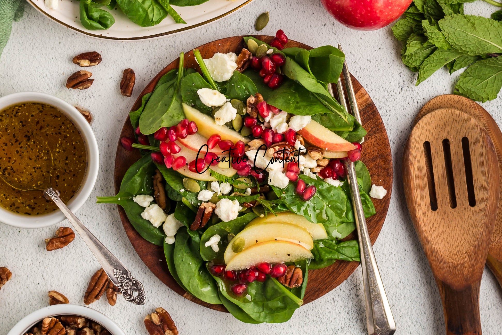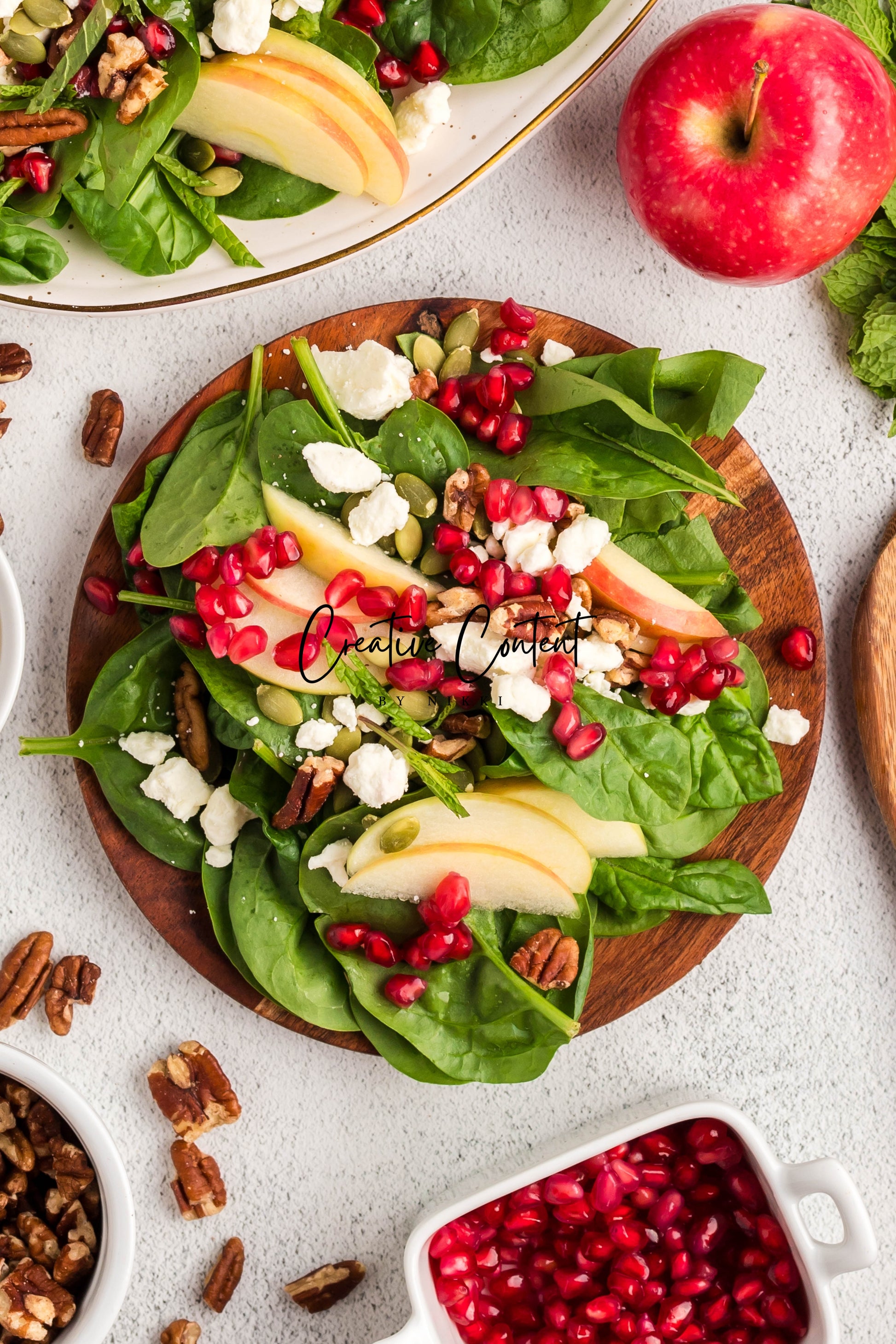 - Featured Ingredients: spinach, apple, feta cheese, pecans, pomegranate seeds, pumpkin seeds, mint, avocado oil, vinegar, honey, salt, and pepper.